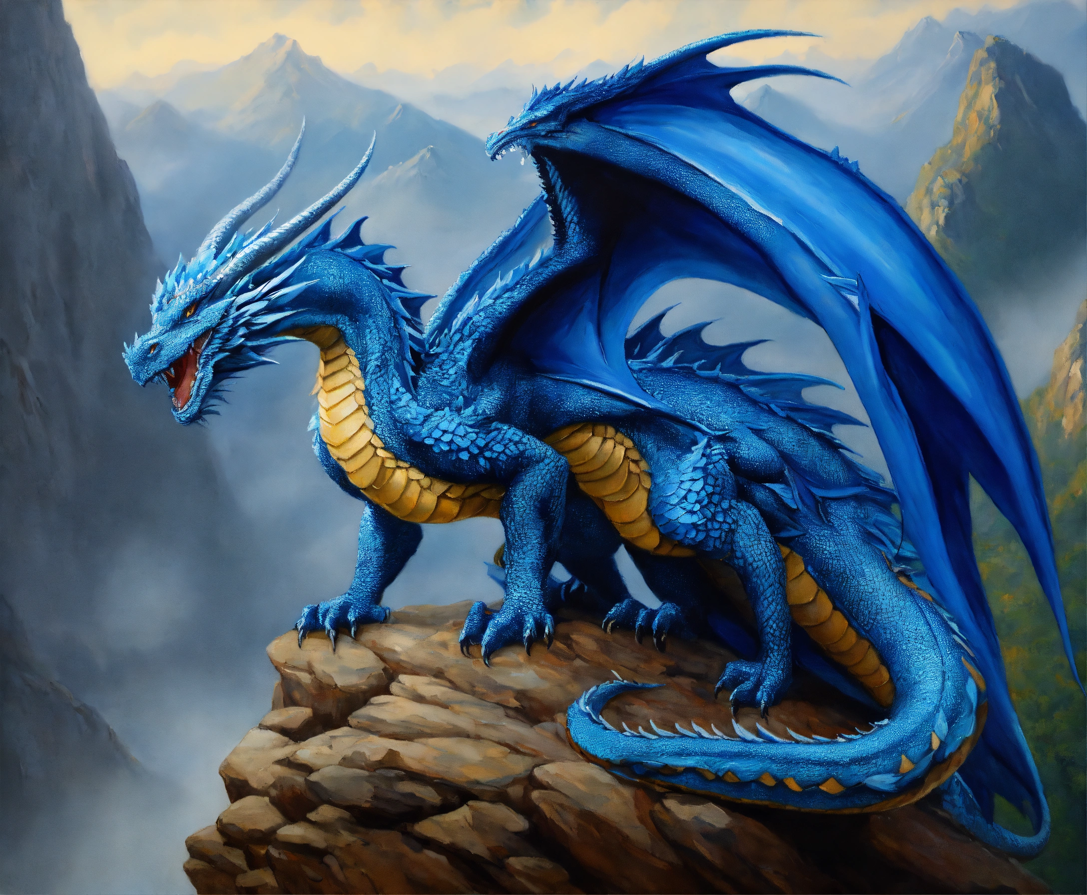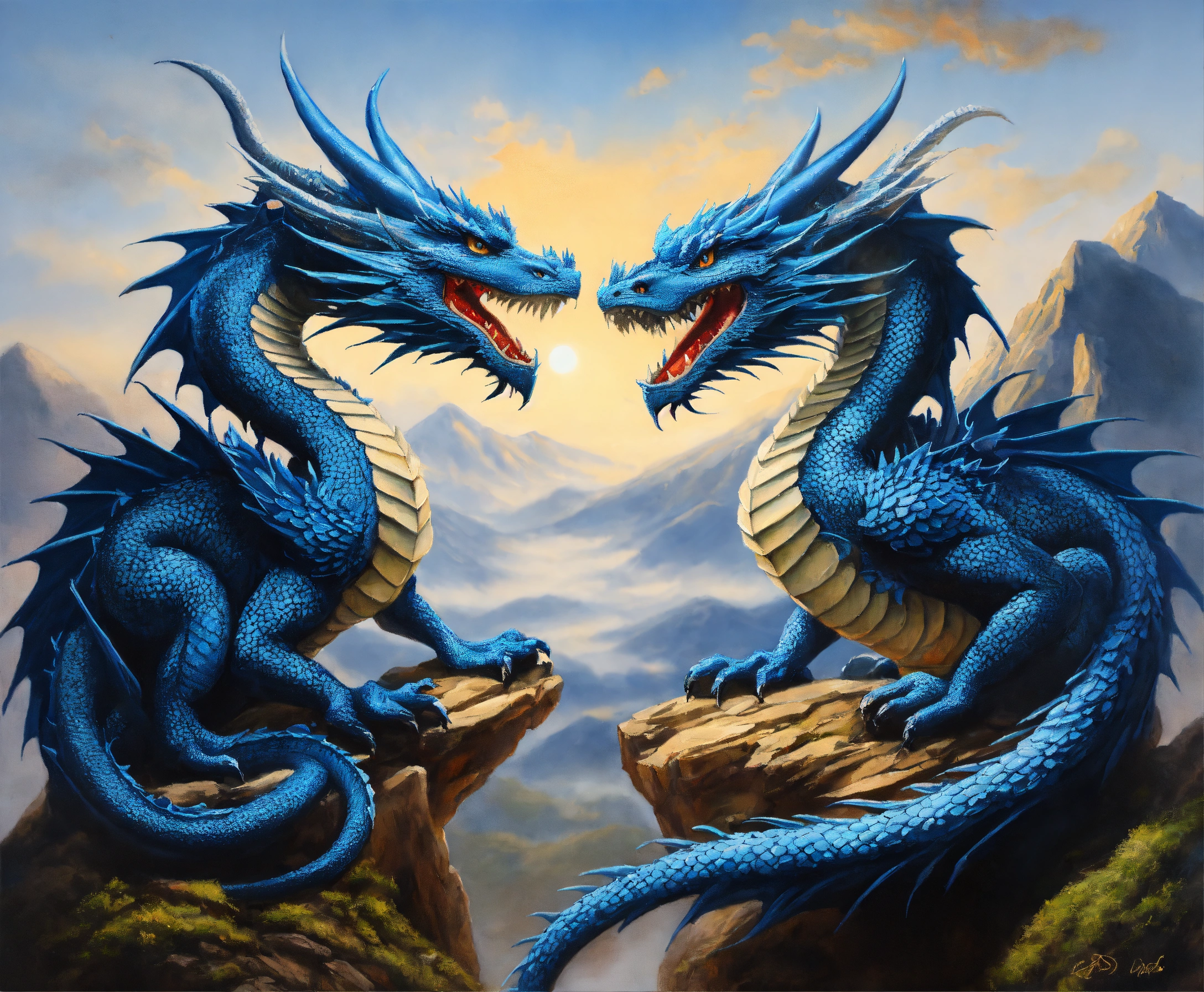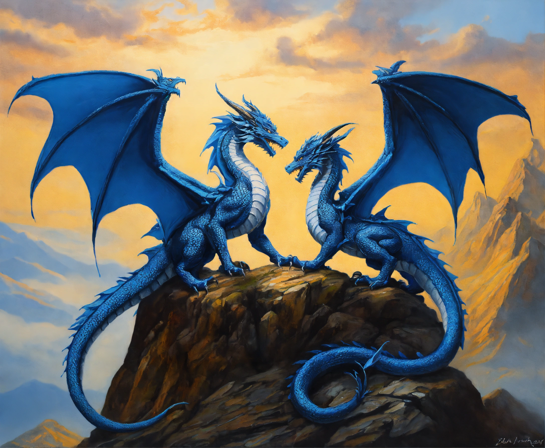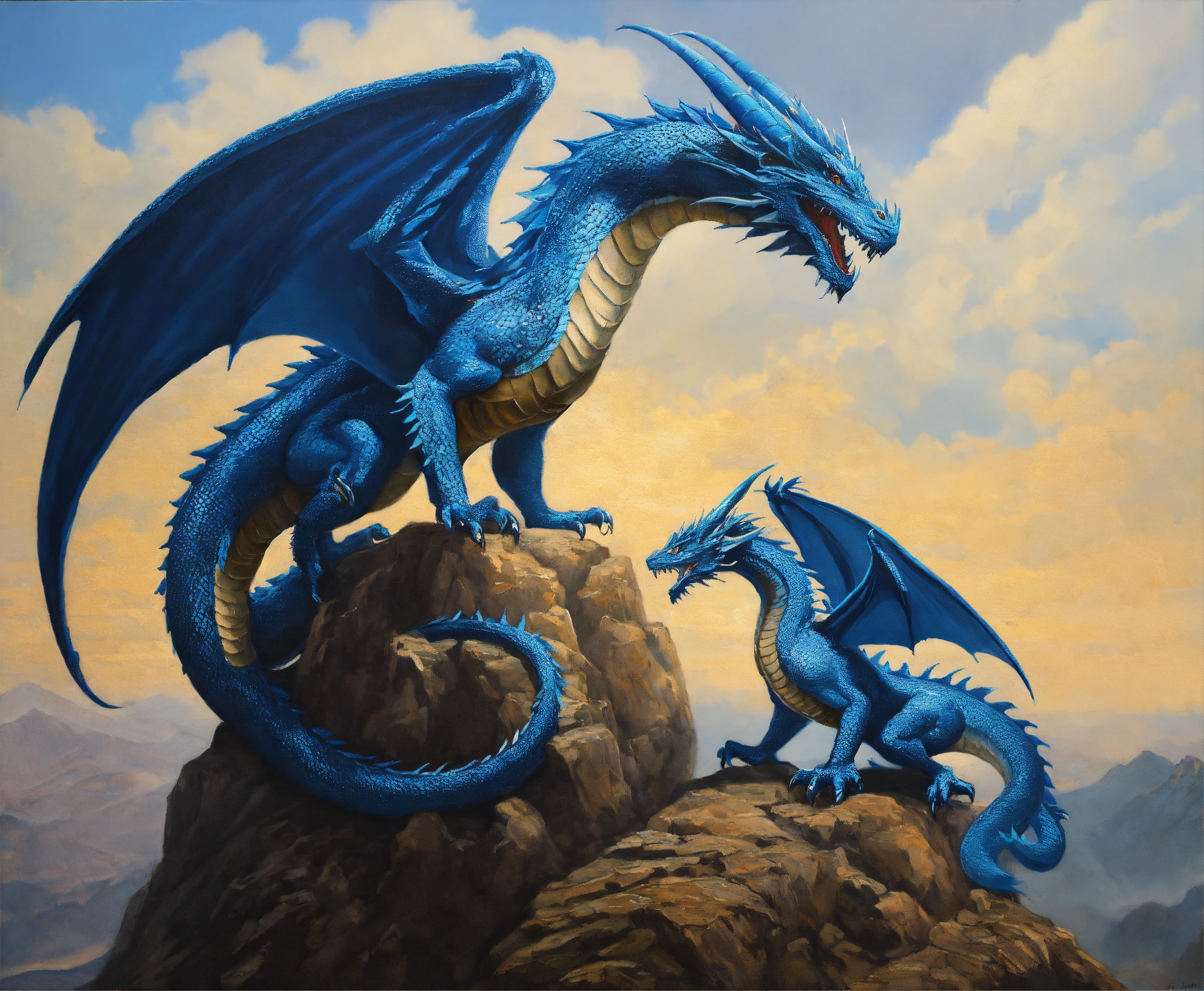 Oil painting of two blue dragons touching each other on top of a high mountain, one of the dragons is much bigger than the other dragon, ultra detailled, ultra realistic