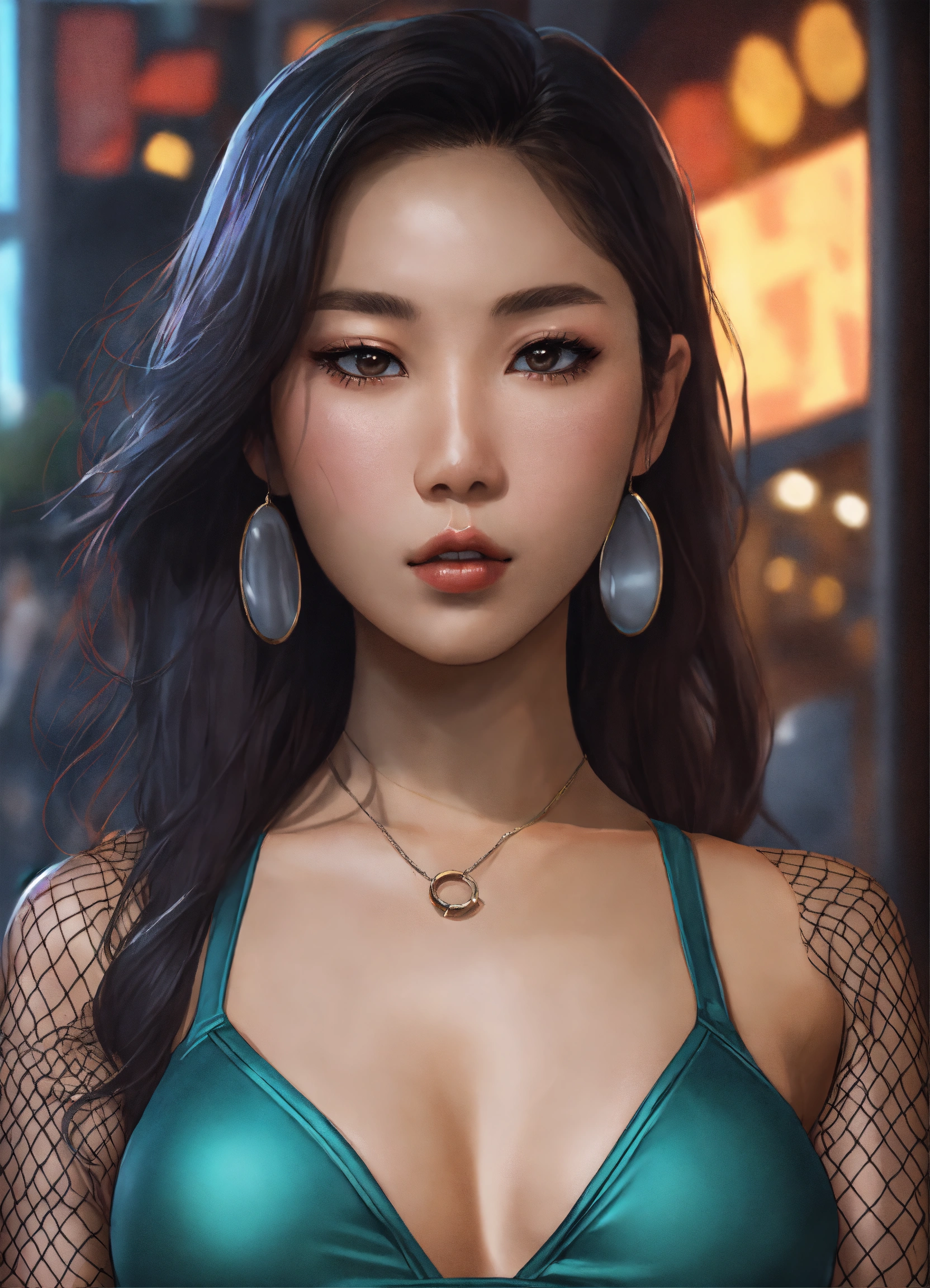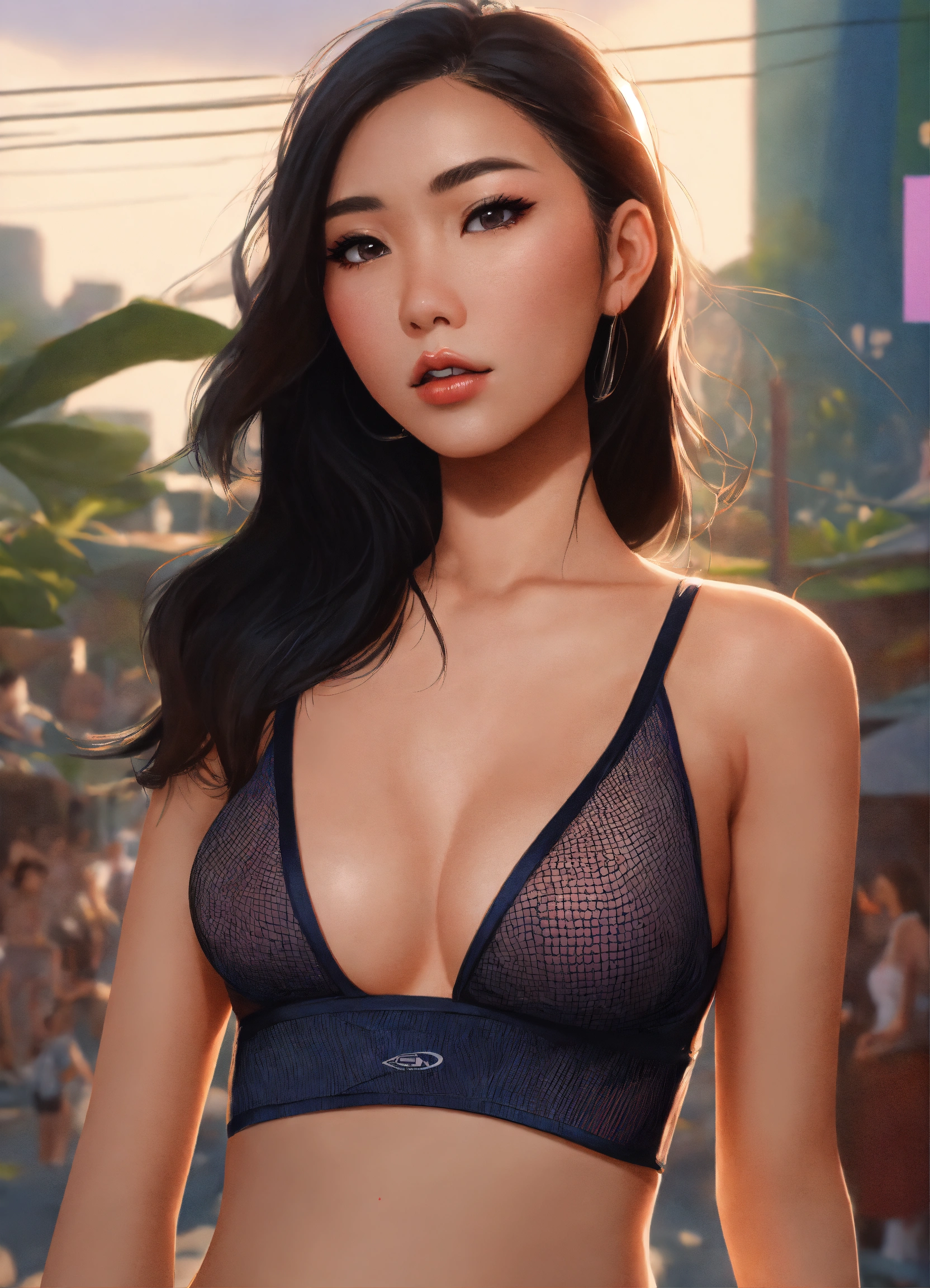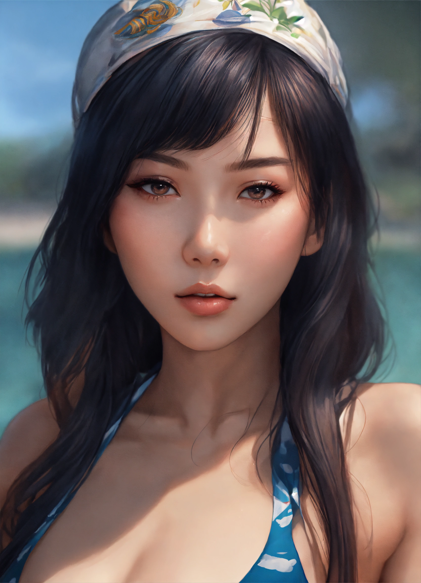 Asian woman, beauty, big jugs, aesthetic, beautiful, fishnet thin swimsuit, cartoonish realistic style with hyperrealistic face, modern, in the style of lexica aperture v2
