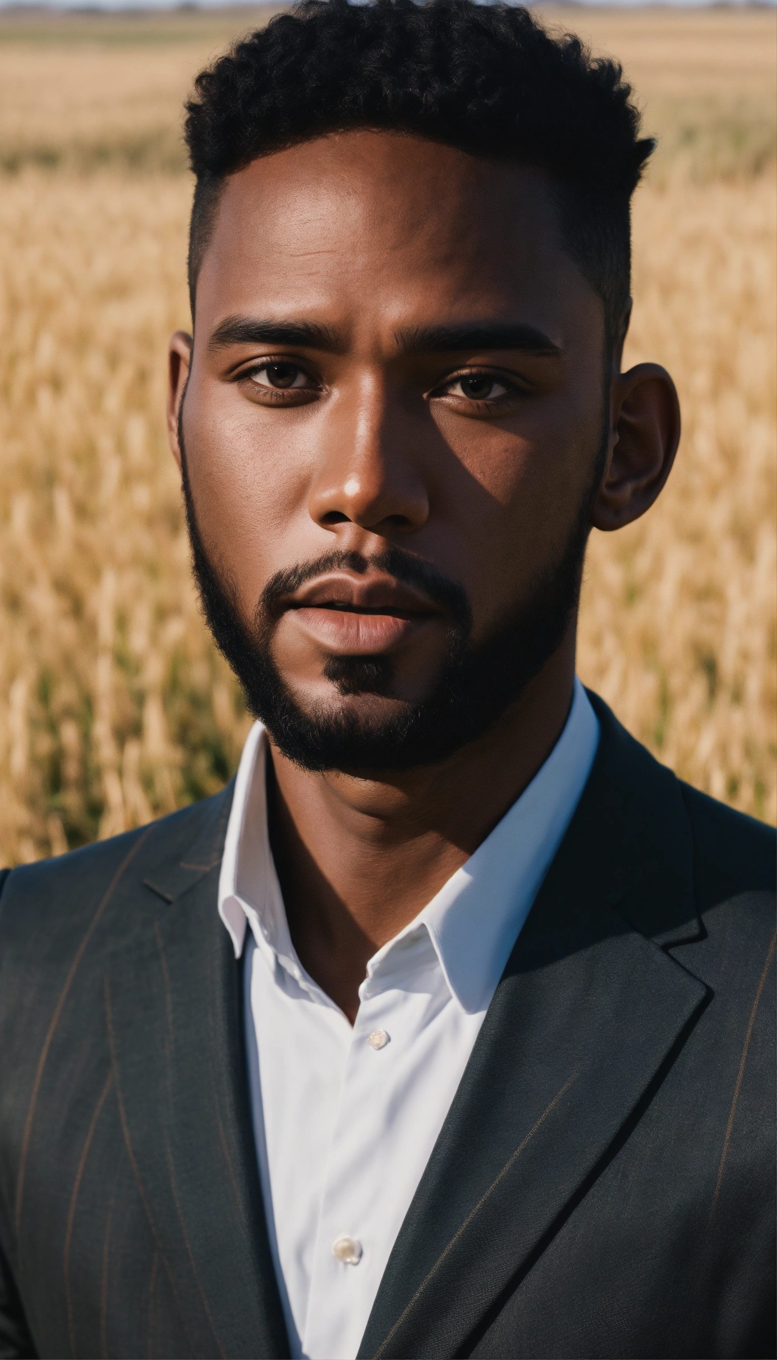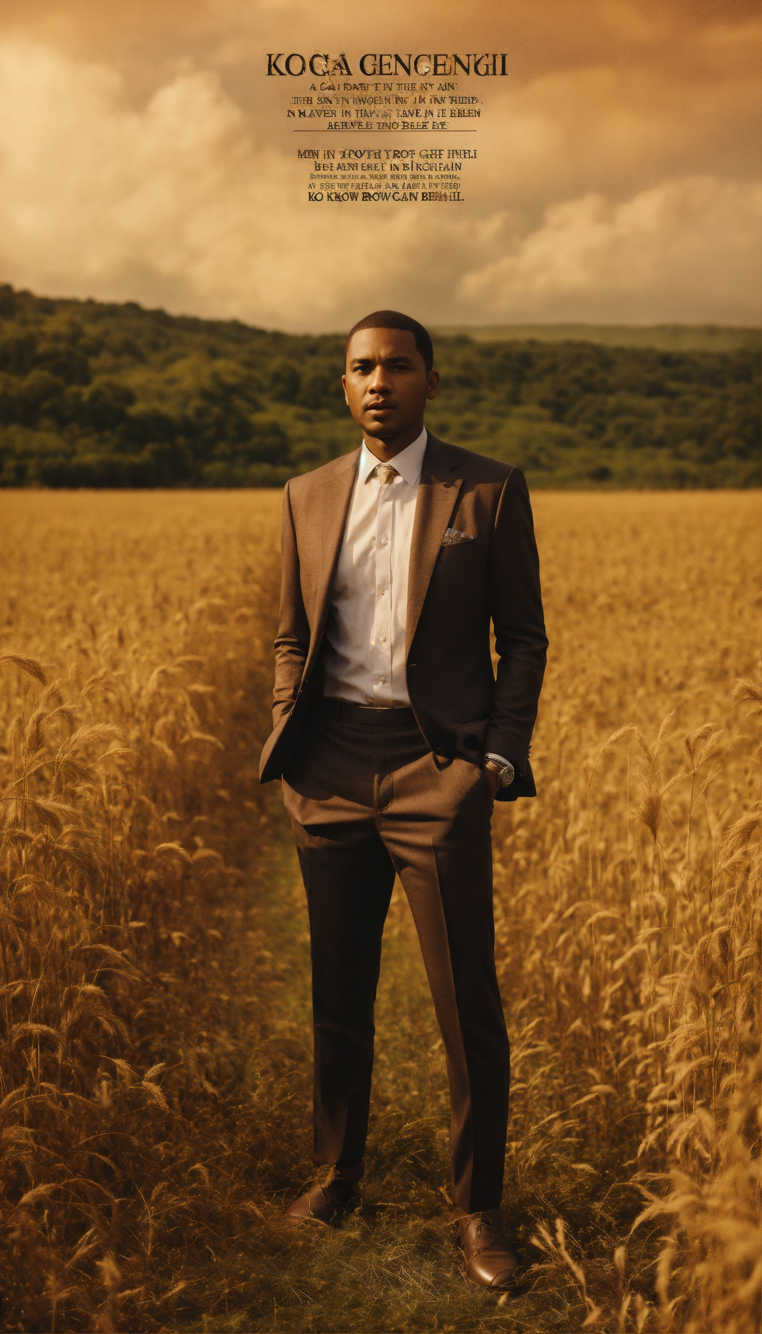 A man in a suit standing in a field, an album cover, by kogan gengei, meme format, ( brown skin ), with subtitles, kuntilanak