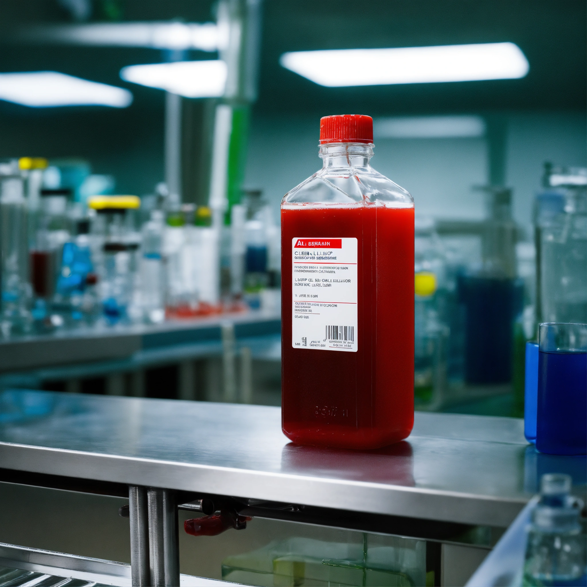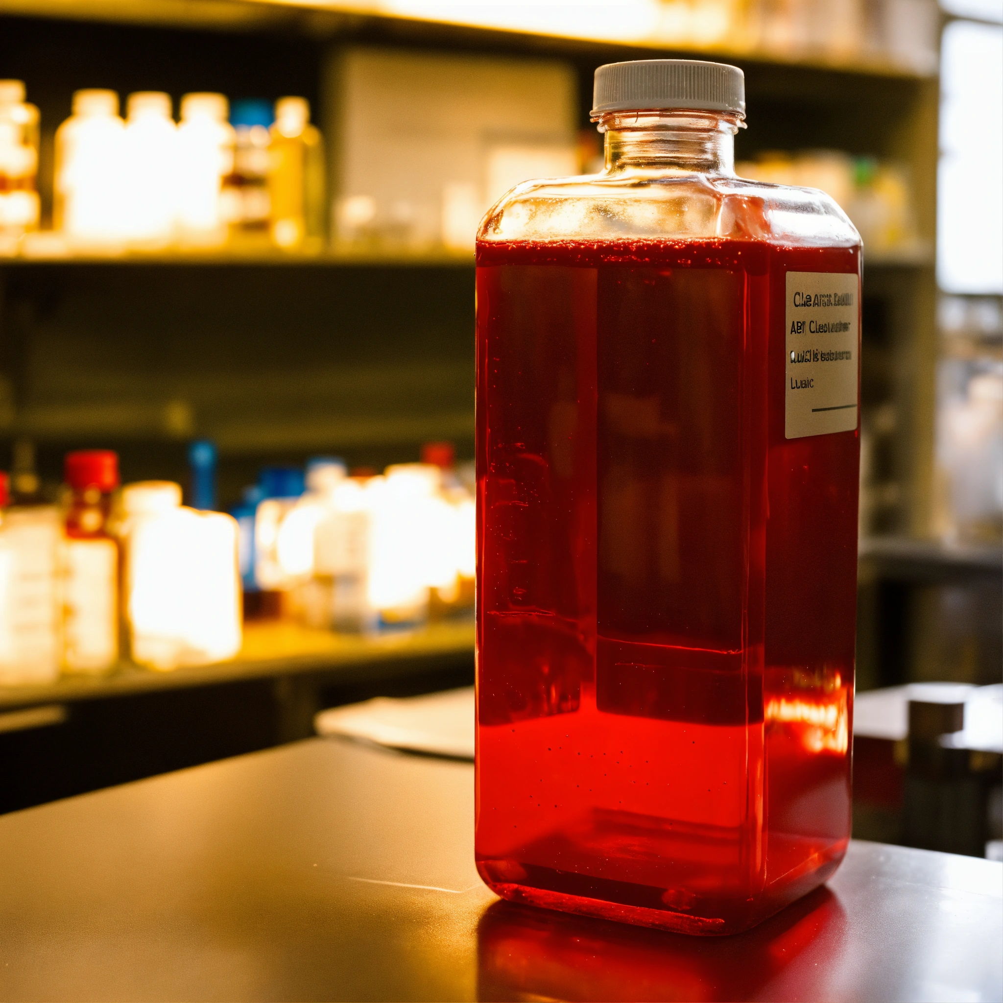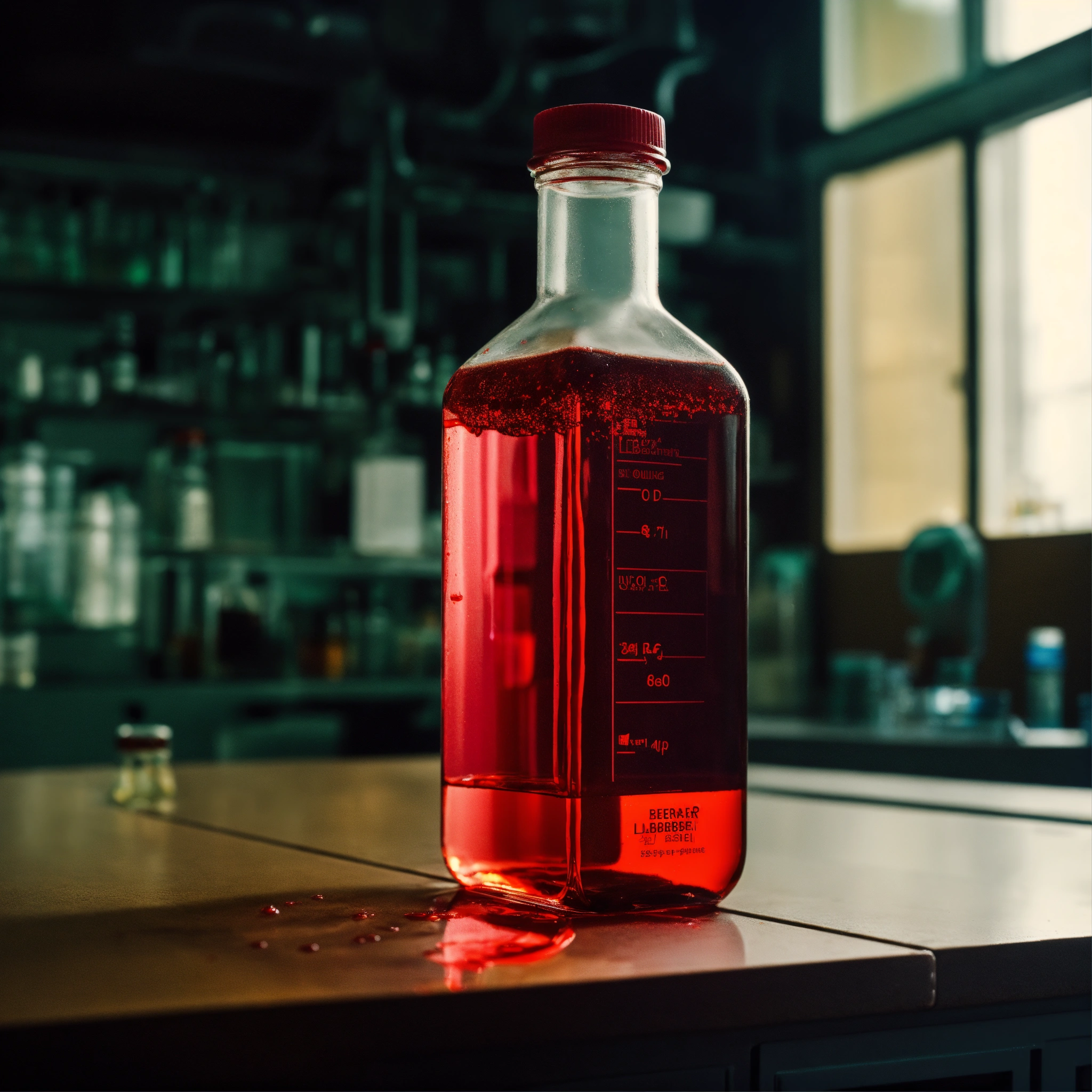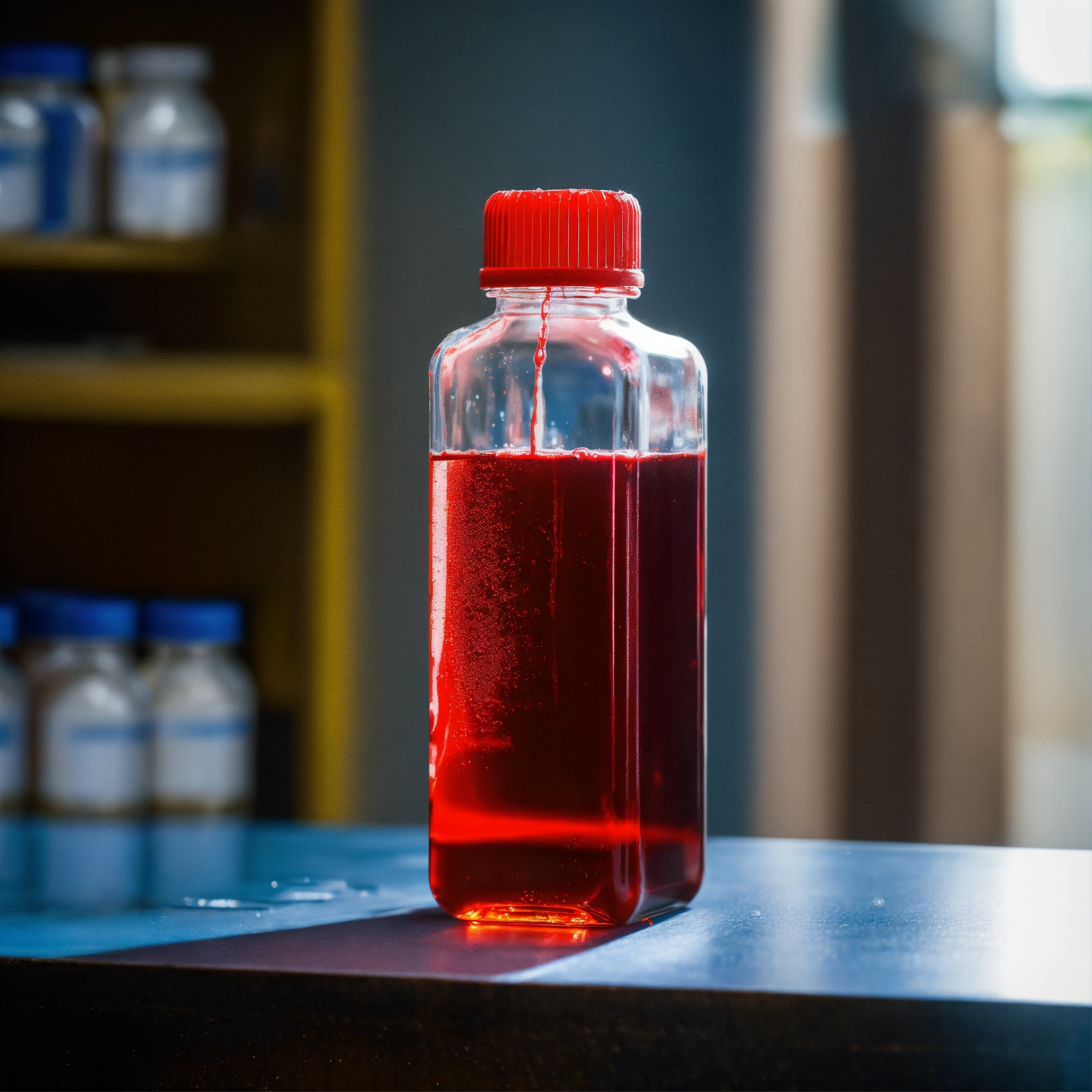 A rectangular plastic bottle with a clear red liquid inside in a laboratory environment
