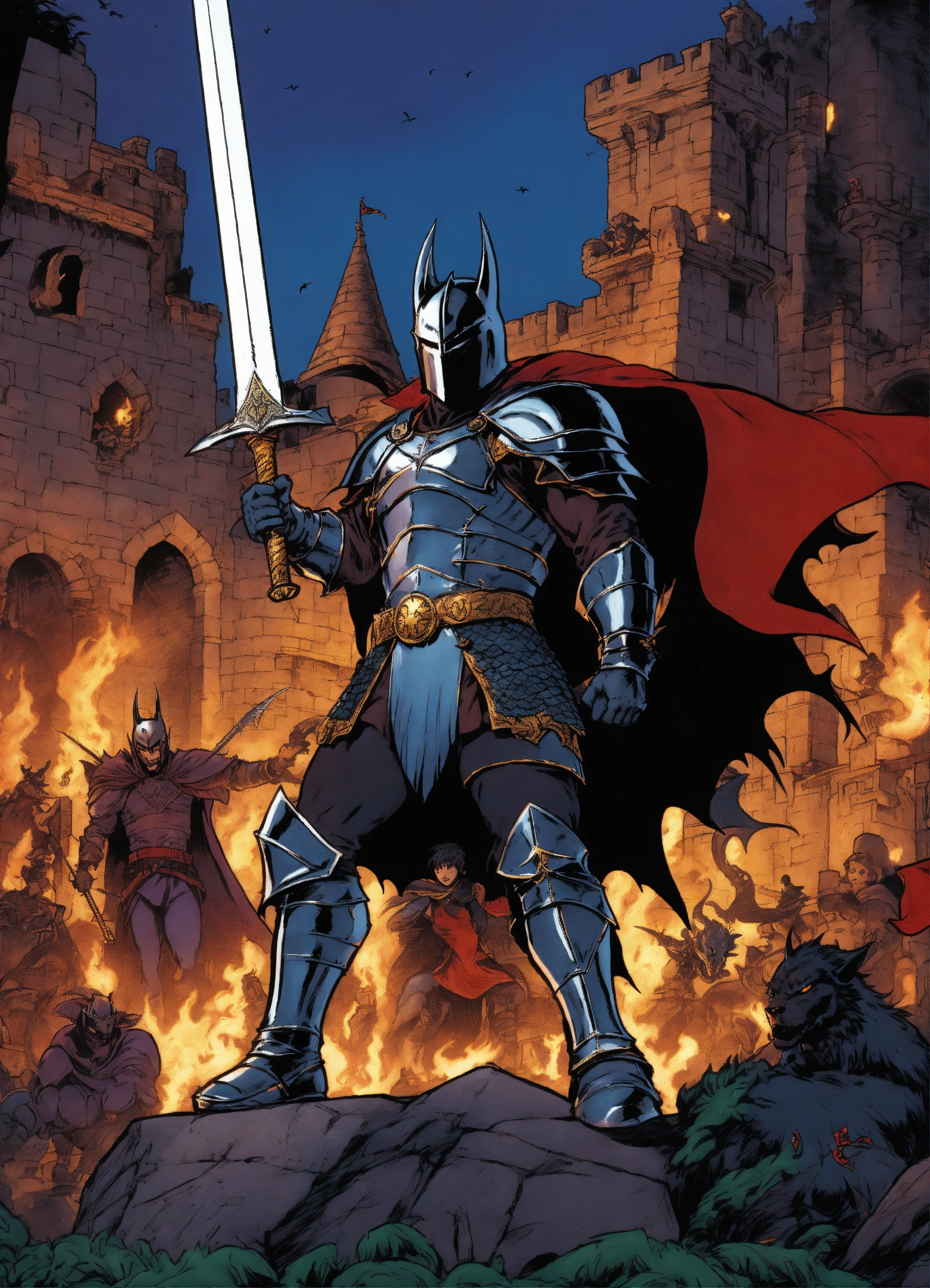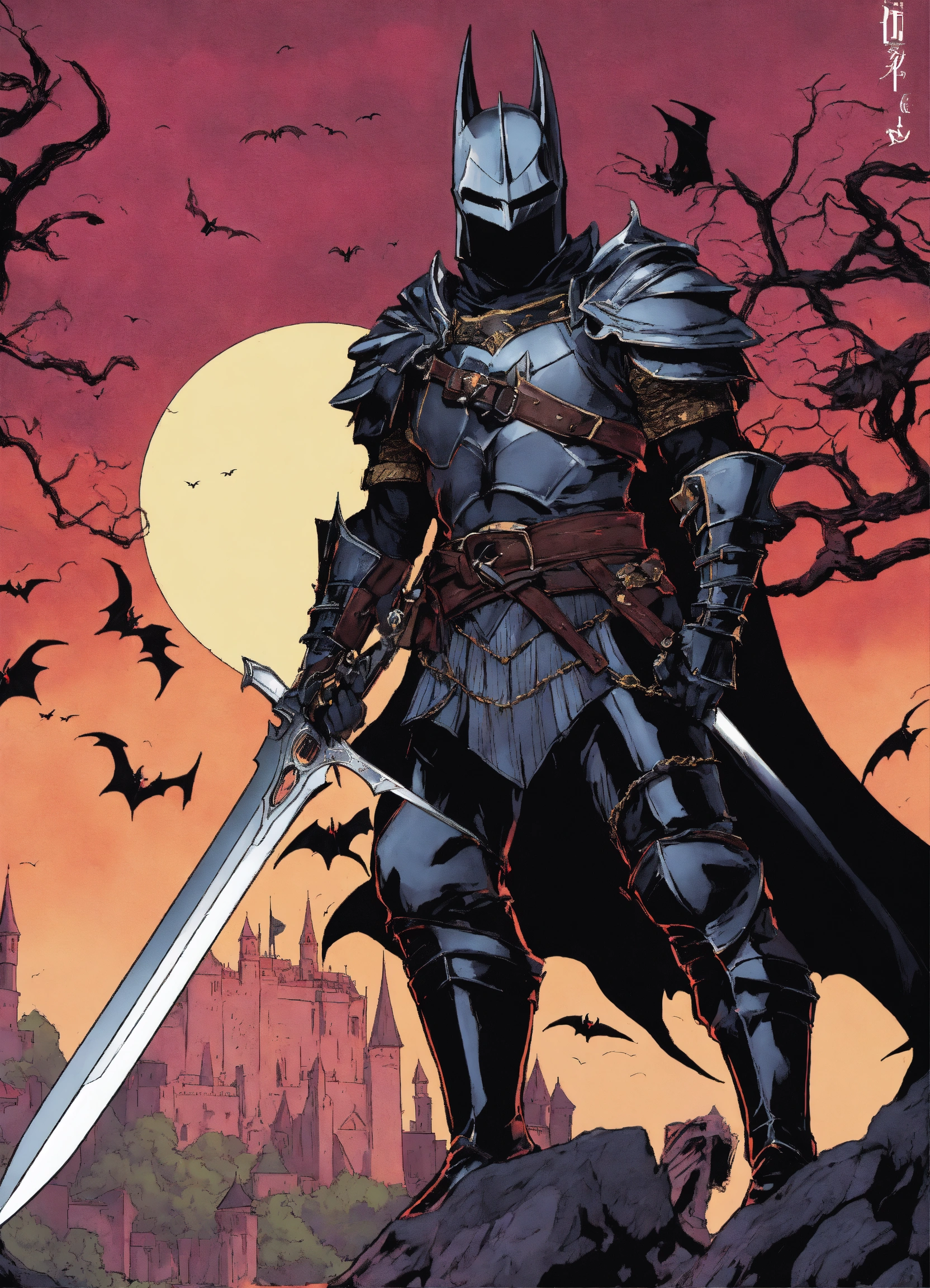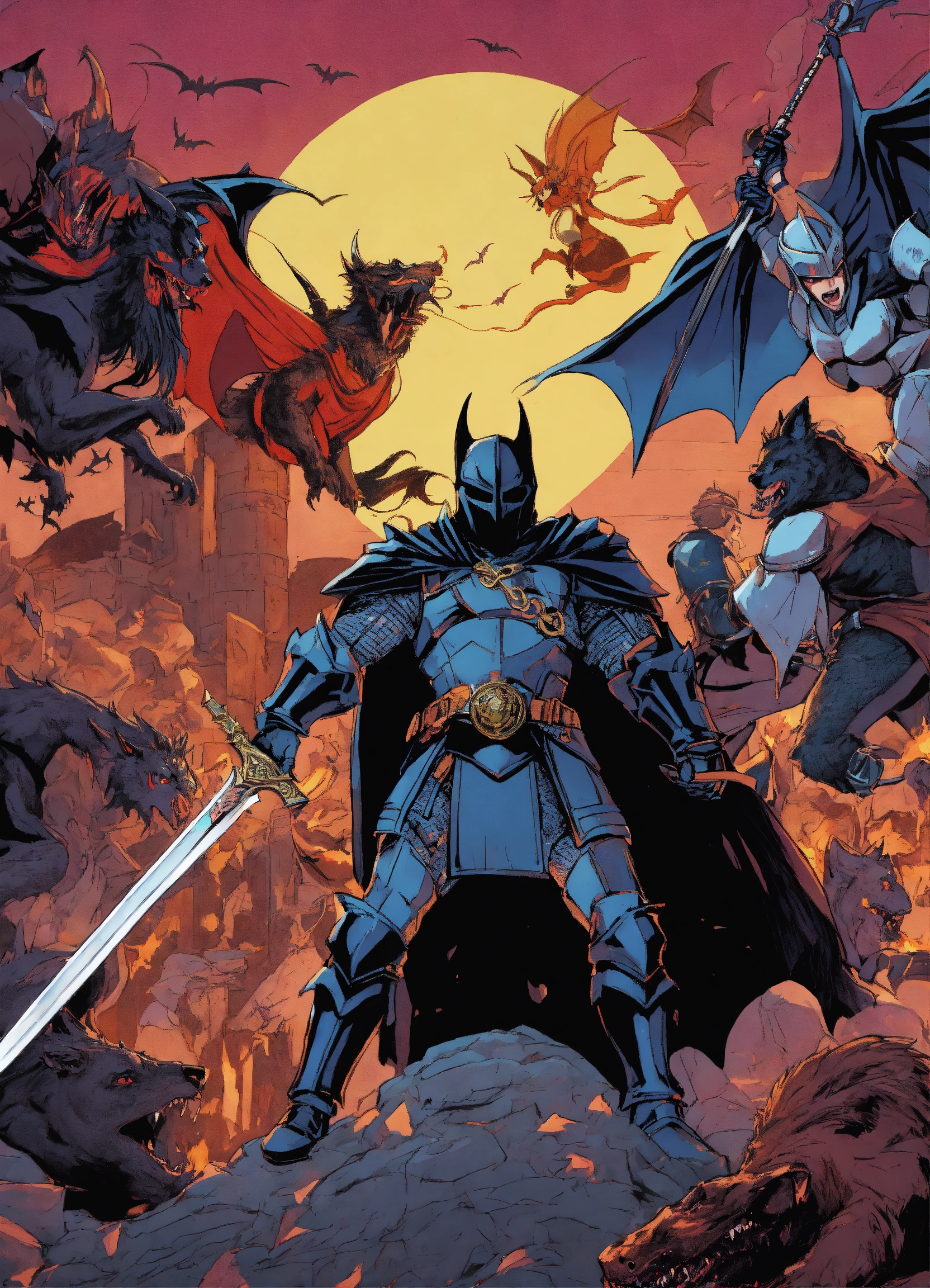 80s anime style black characters black dark knight with enchanted evil dark sword fighting dragons and other knights and vampires and werewolves in a medieval setting comic covers with no ears on helmet