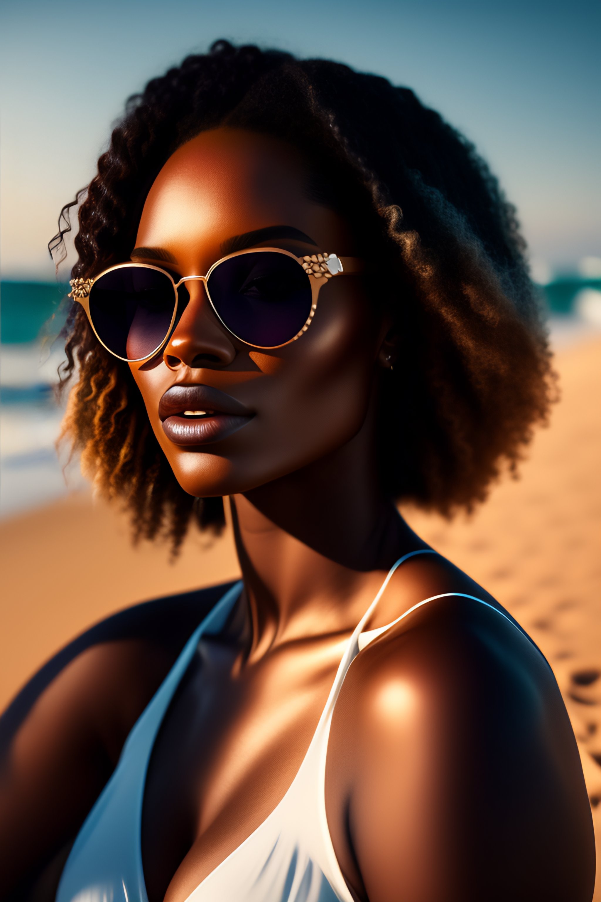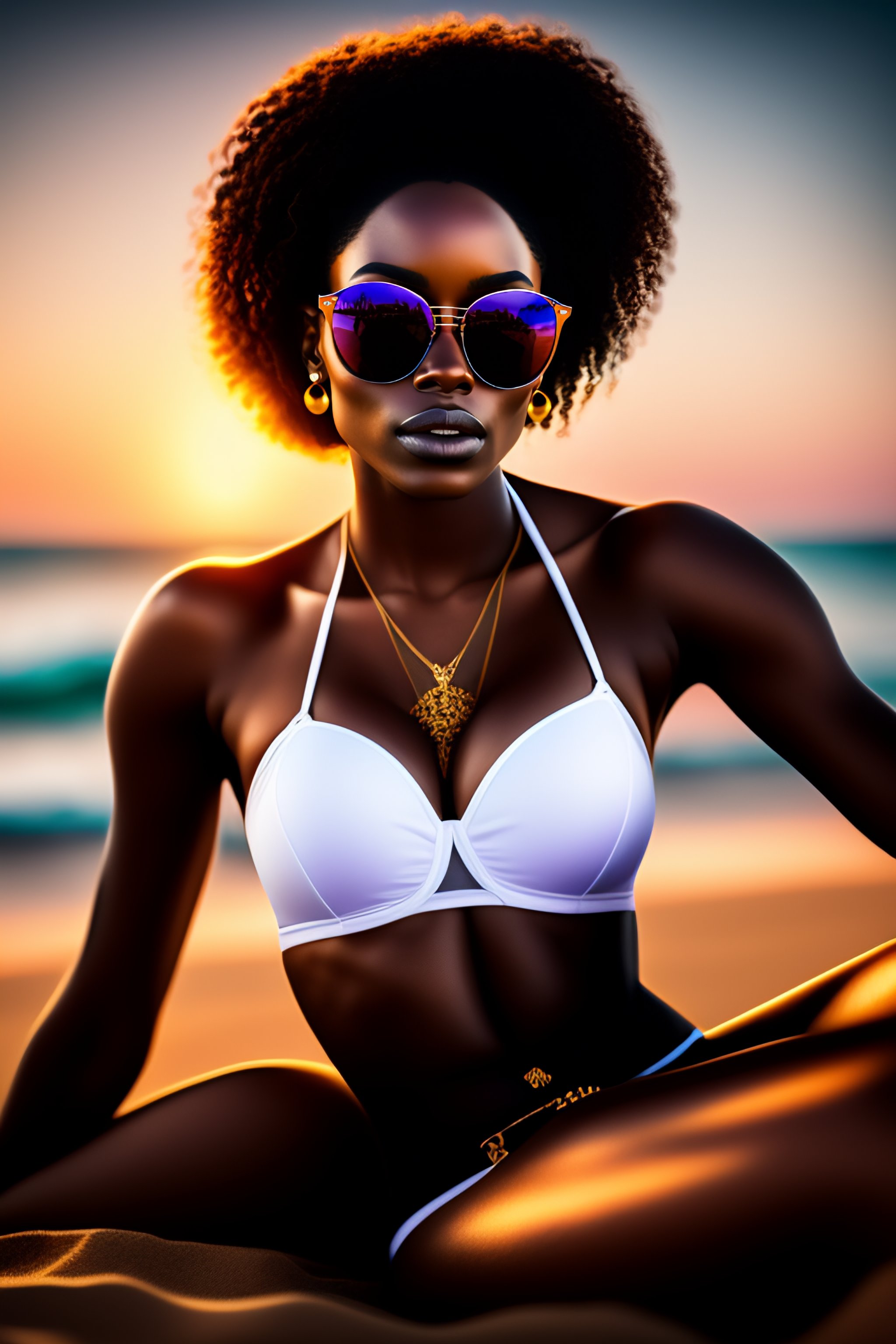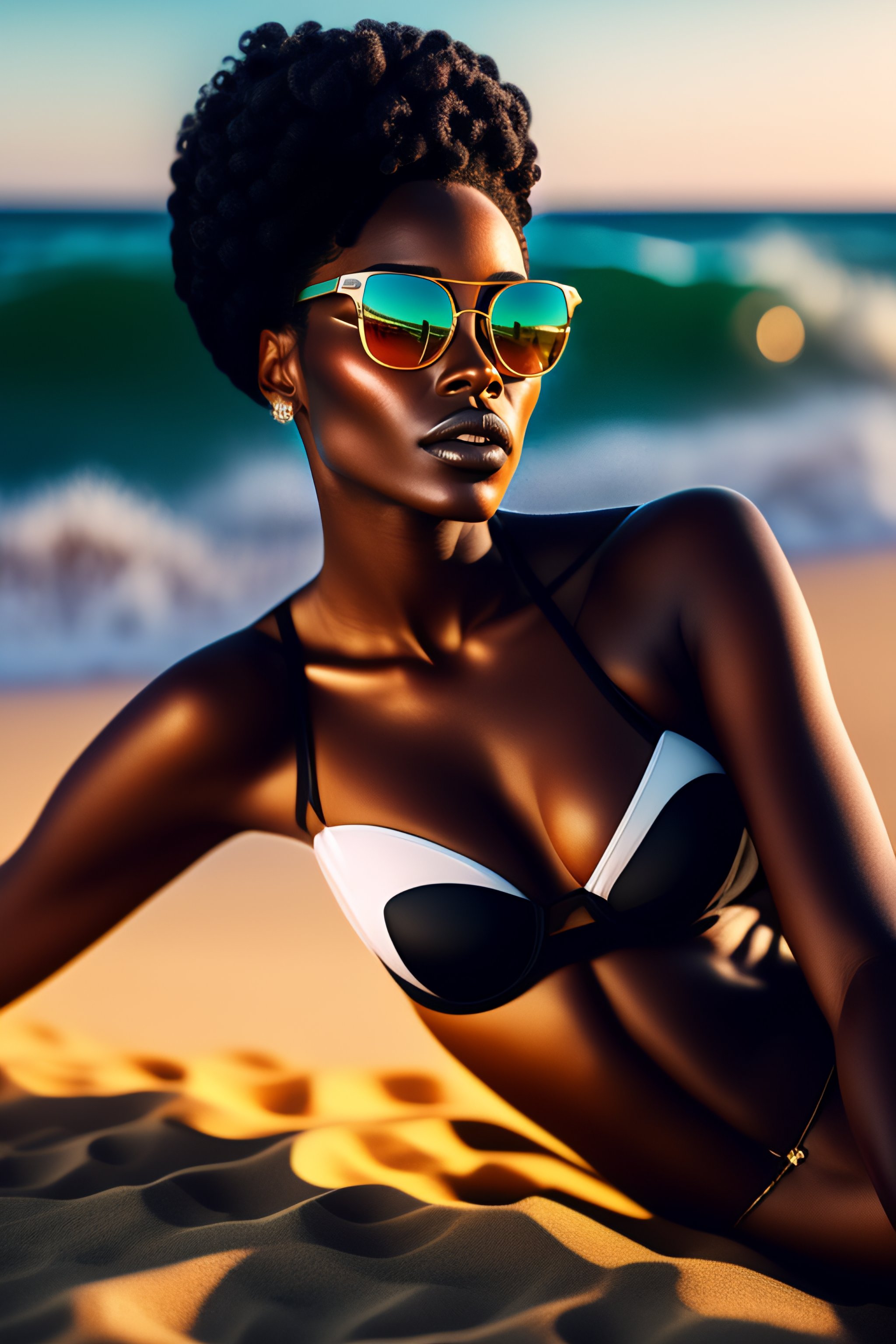 Portrait of a beautiful black woman wearing sunglasses on the beach while sitting on the sand on top of a towel, wearing a white bikini, dramatic lighting, intricate designs, ornament, hyperrealistic, ultra realistic, highly detailed, high quality 8k, hyperrealism, photorealistic, octance render, depth of field