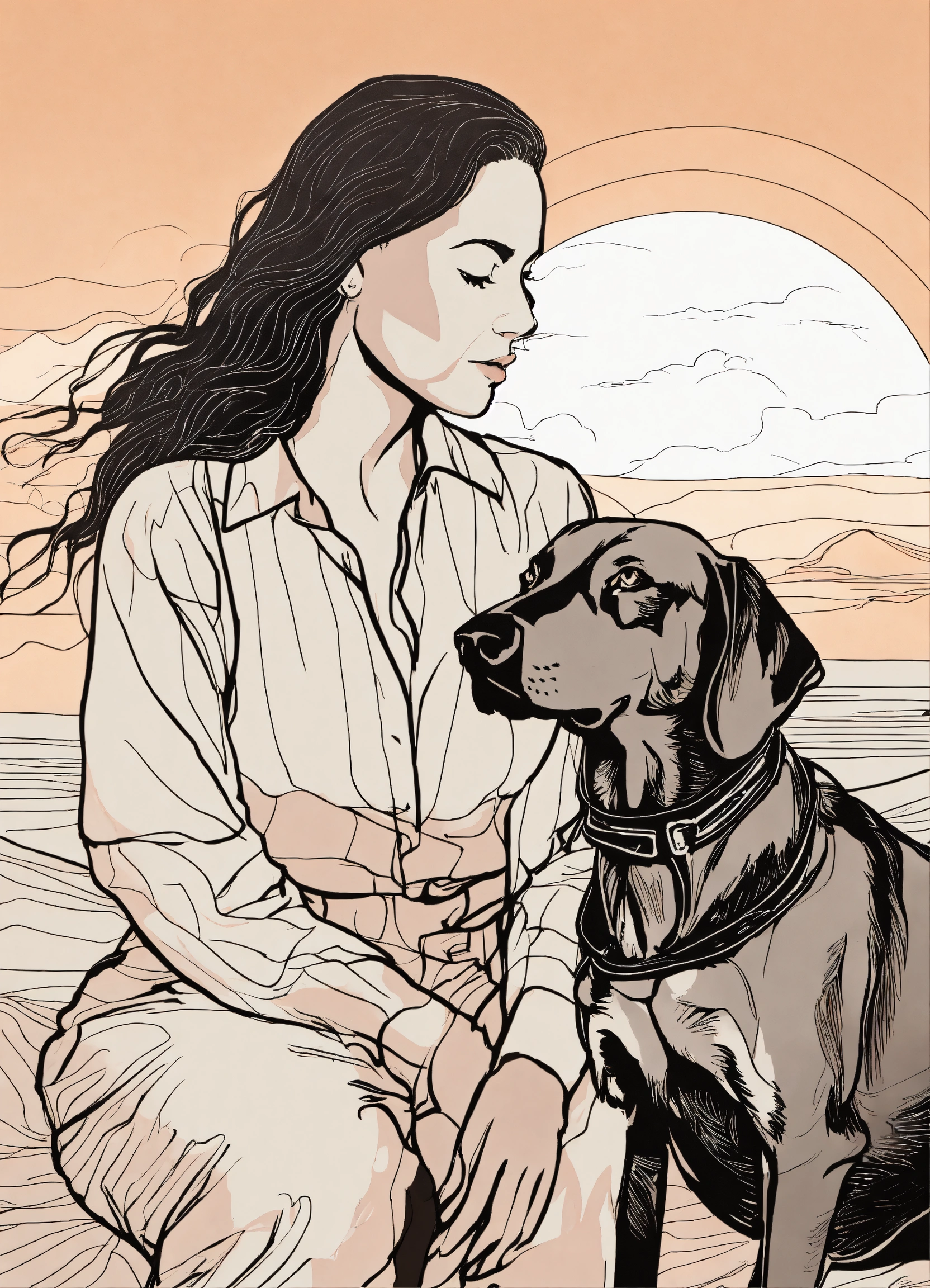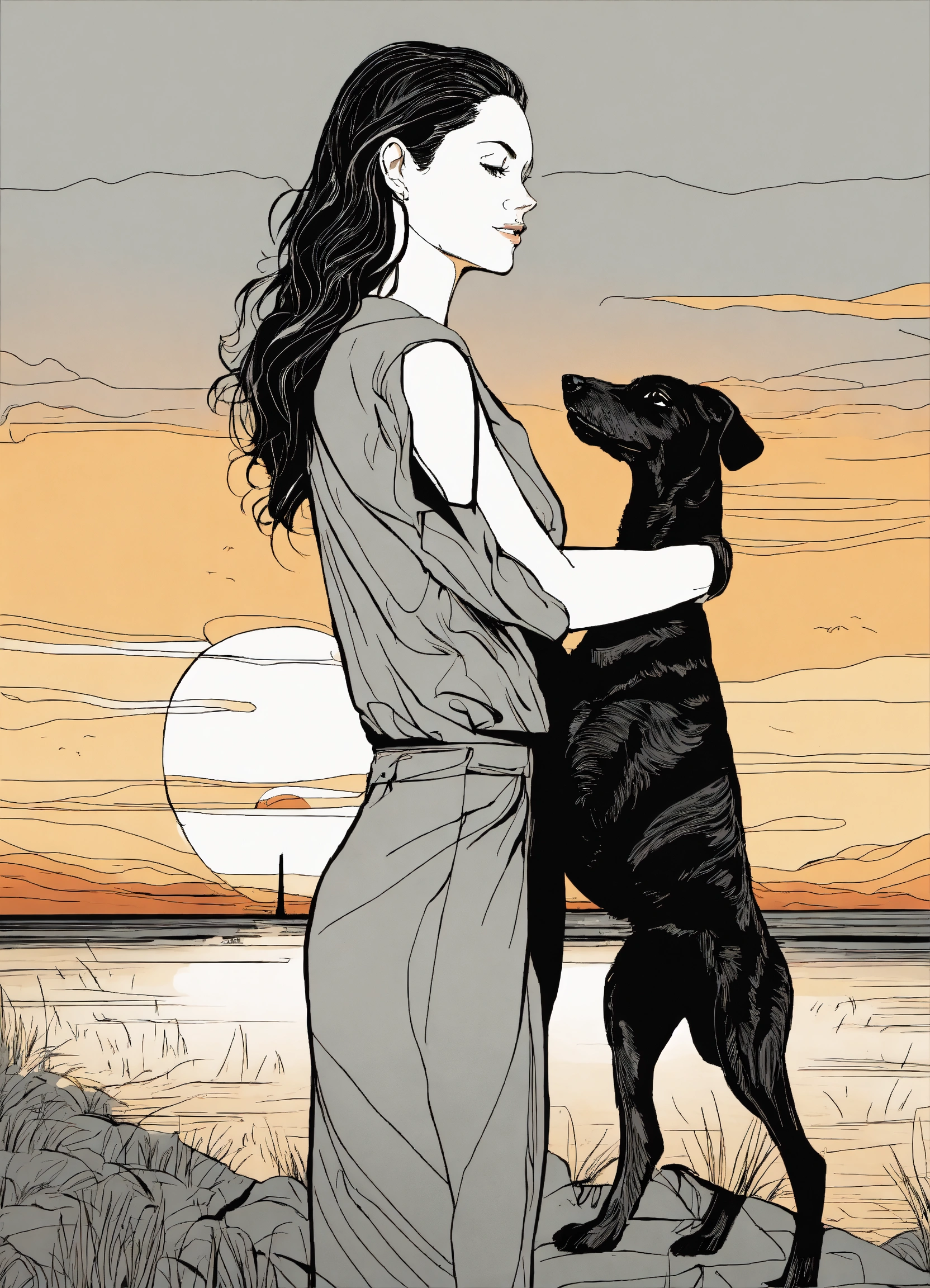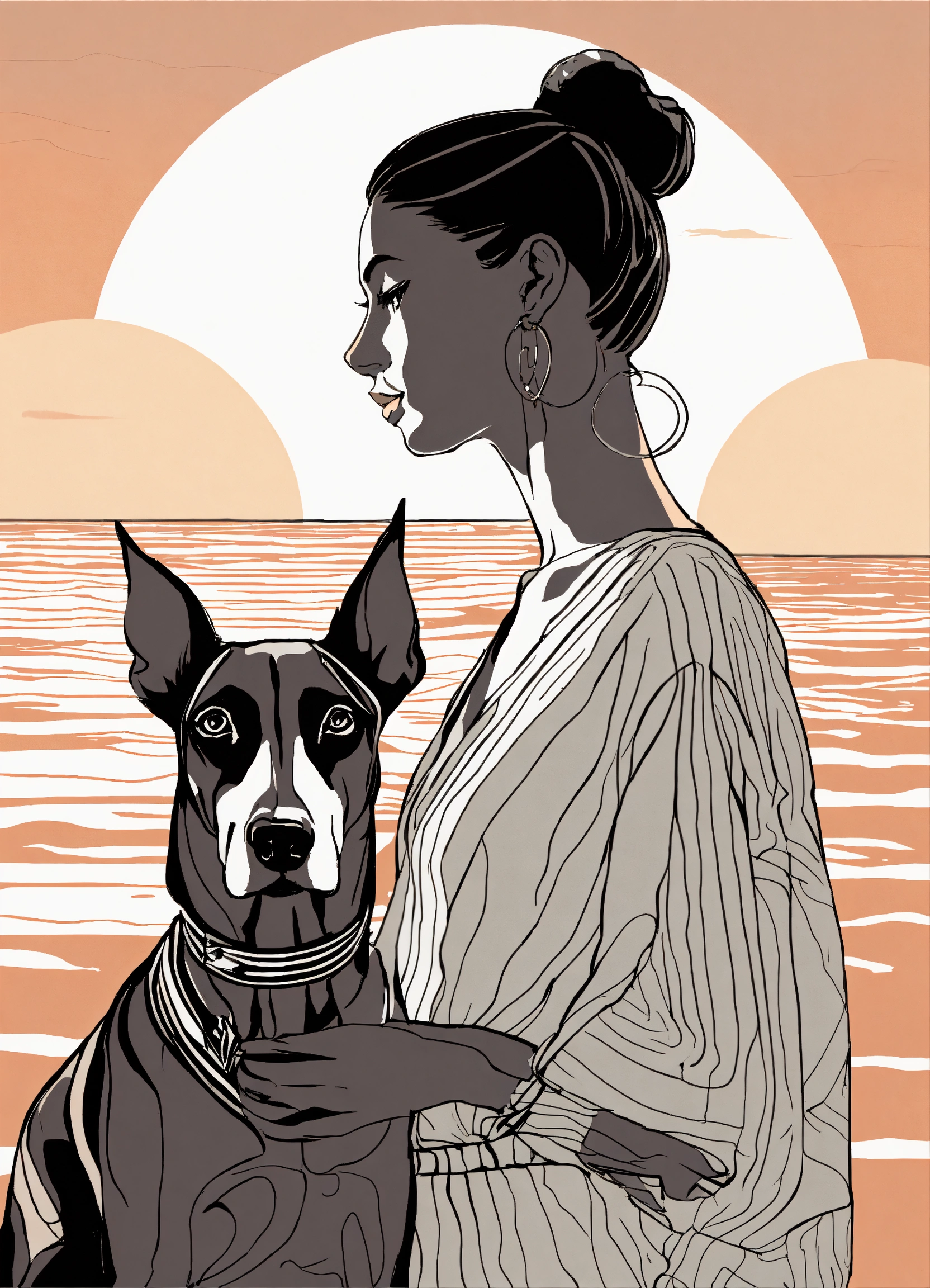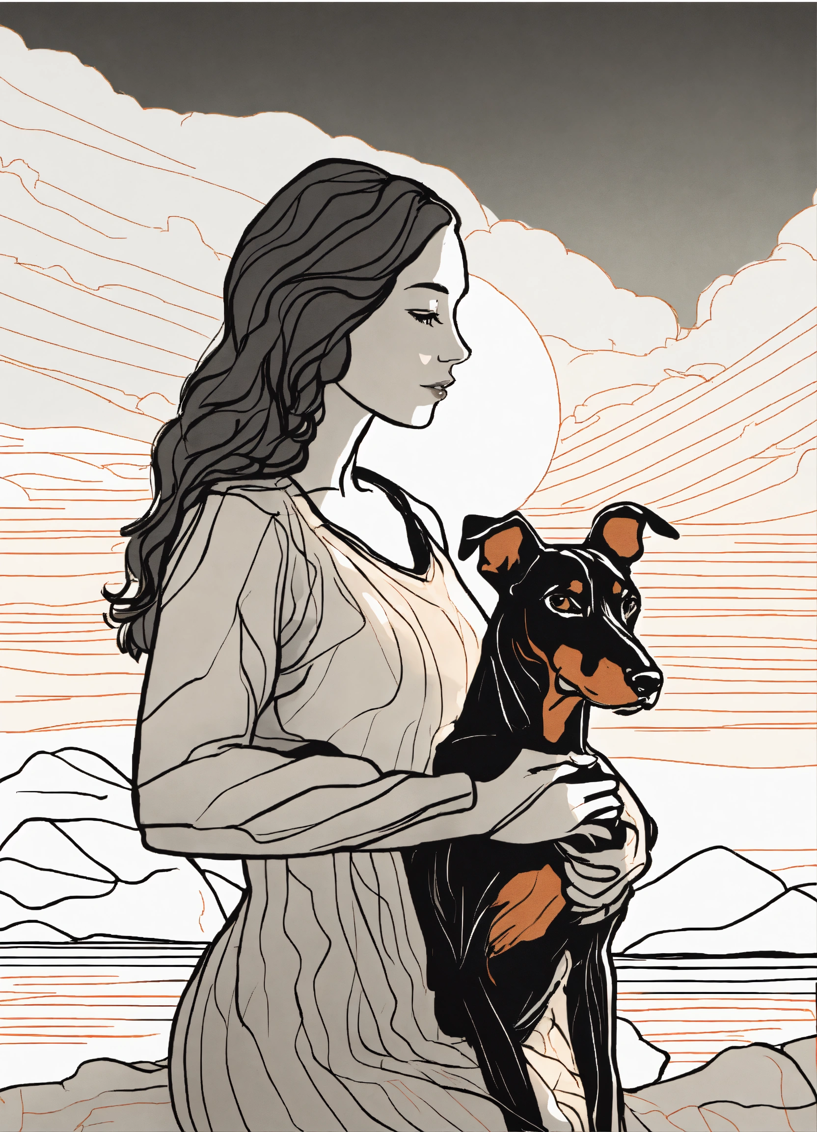 Black and white bold line drawing, woman holding doberman still in sunset, lines, white background, shoulders, upper body