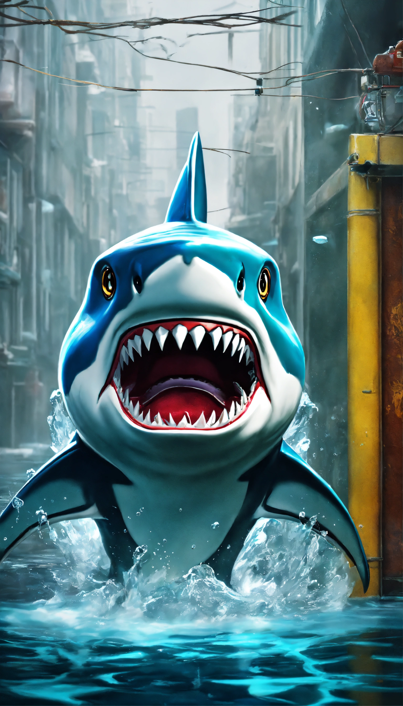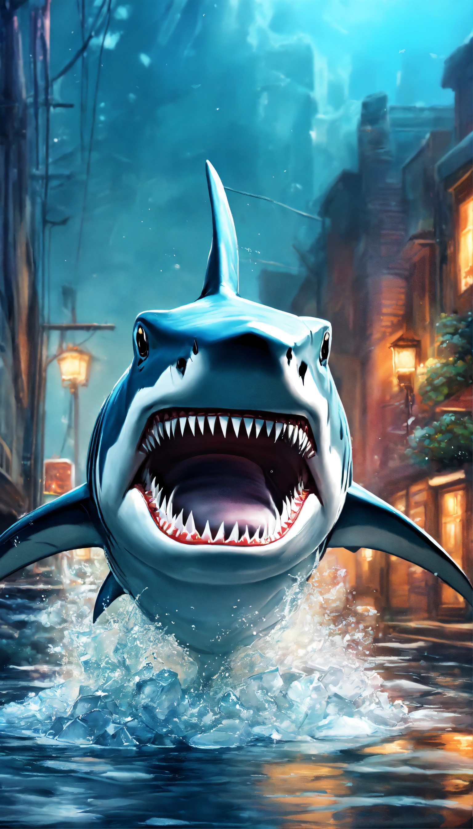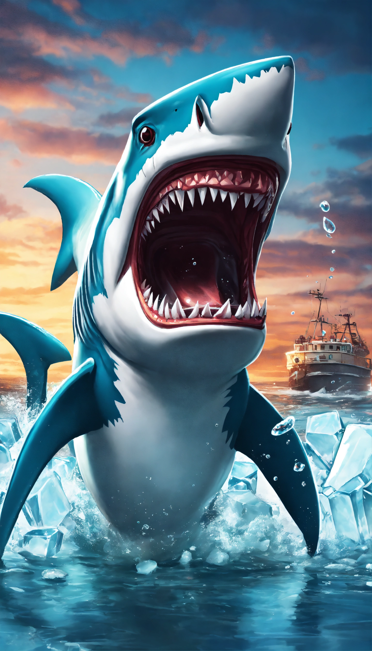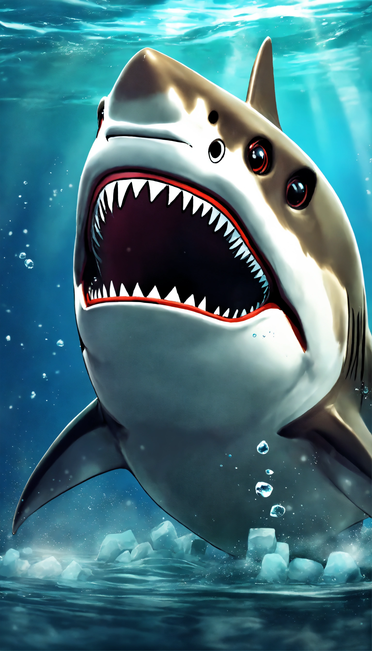 A shark standing in the water with some ice, in the style of comic figurativism, digital airbrushing, animecore, uhd image, street art characters, strong facial expression, digital art techniques