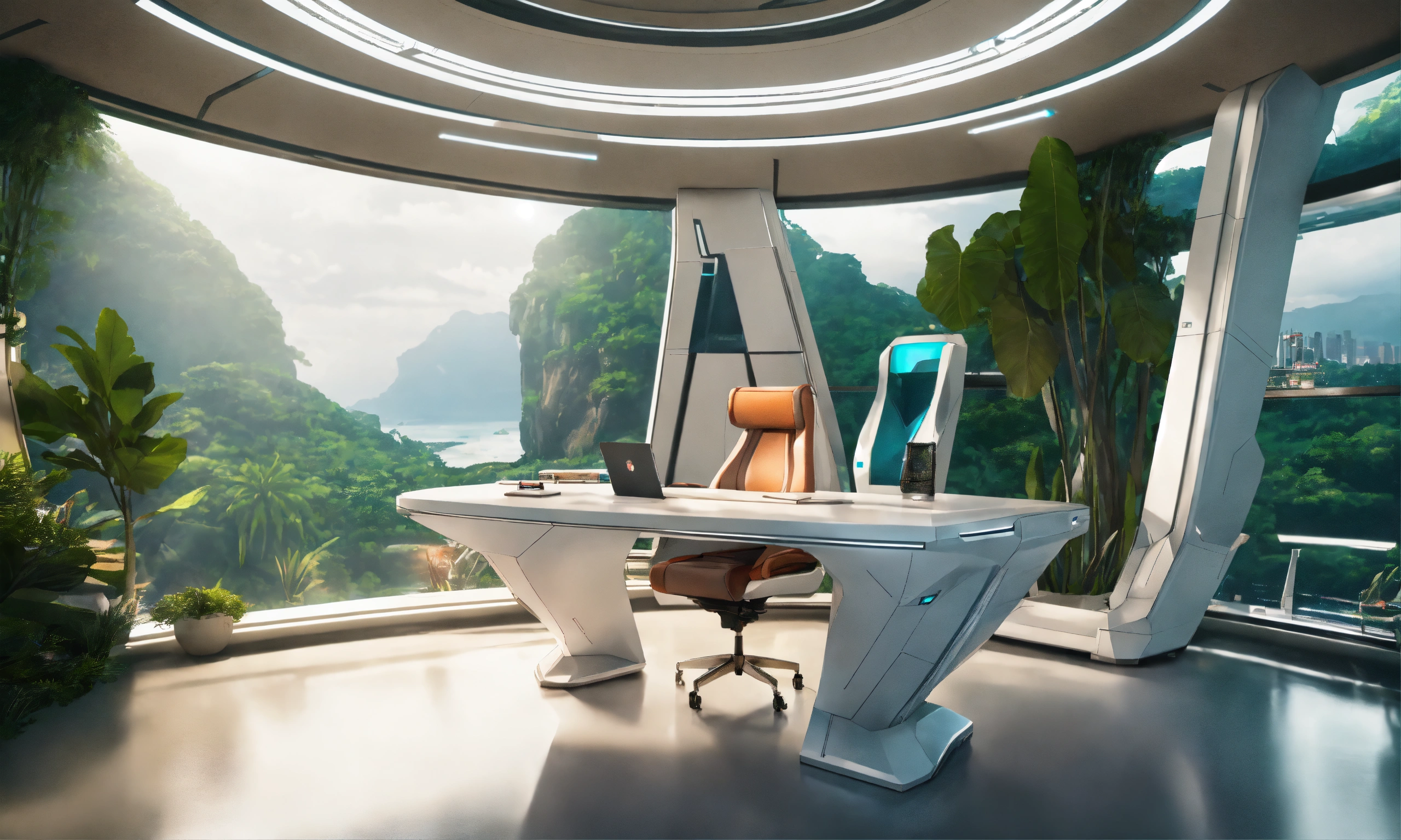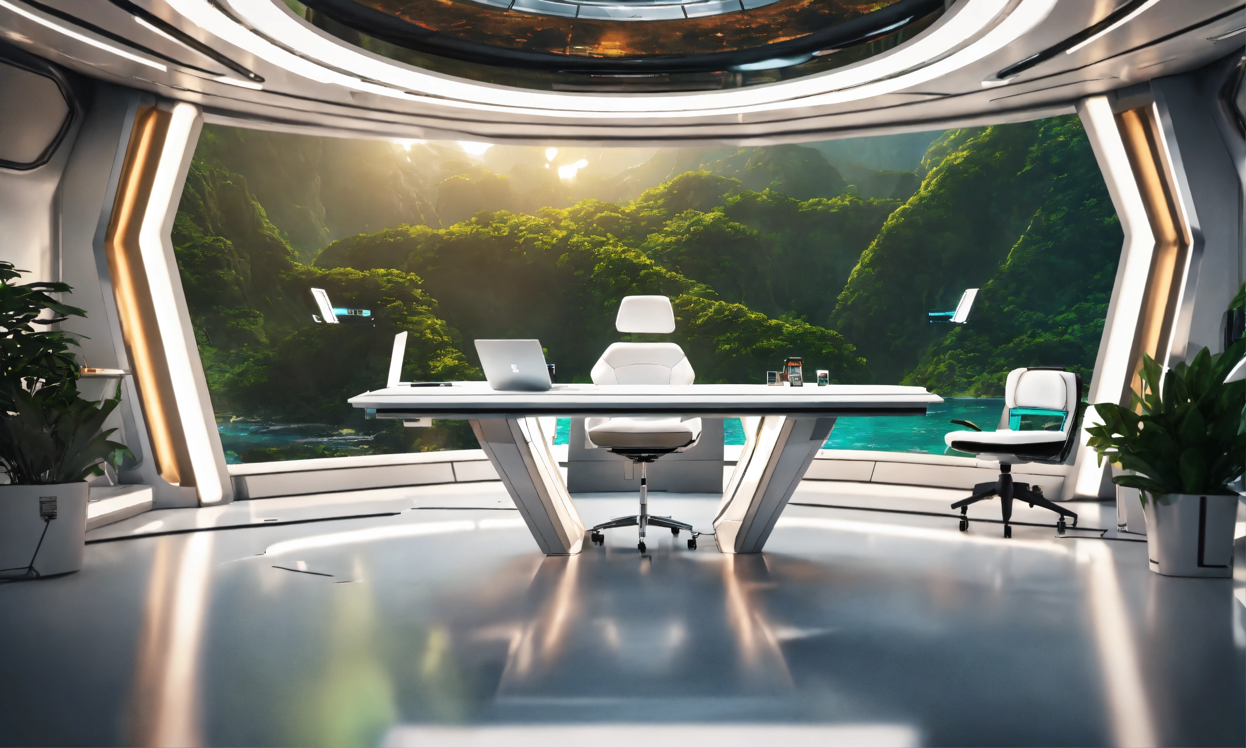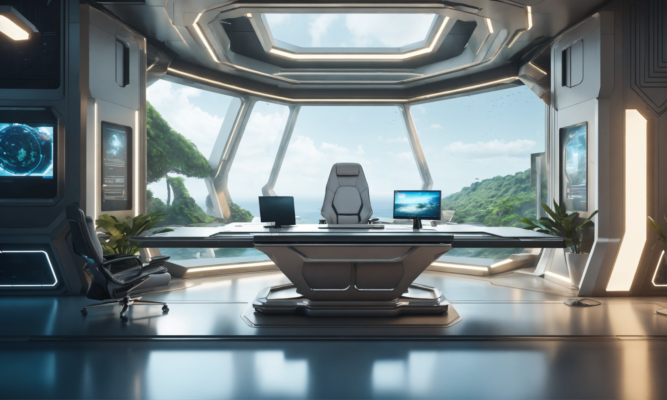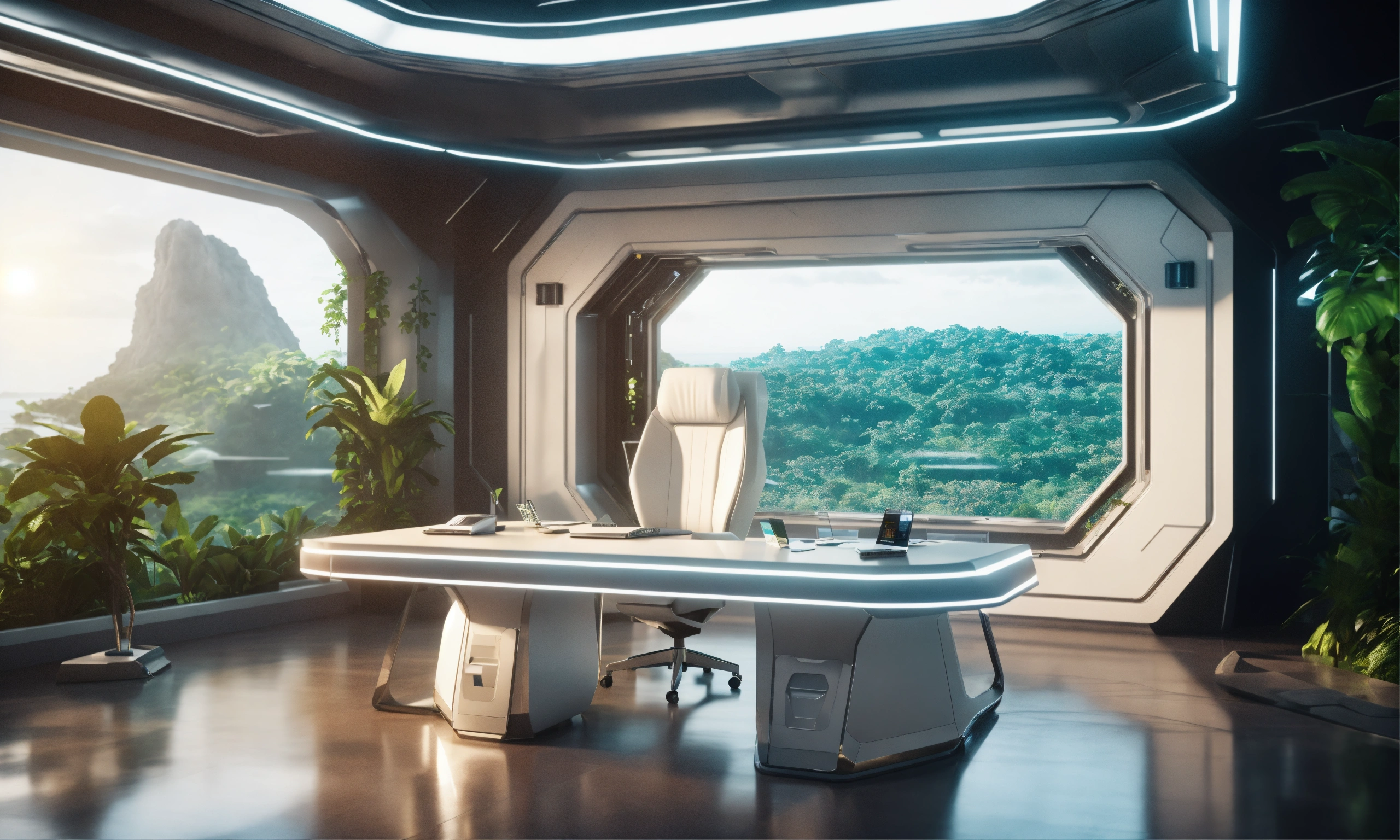 An ultrarealistic front view of a futuristic presidential office in a sci-fi station with a giant desk in the middle, and a big leather white chair, white metal walls, with advanced technology, and a rectangular window in the background with a jungle view and the sea, 4k