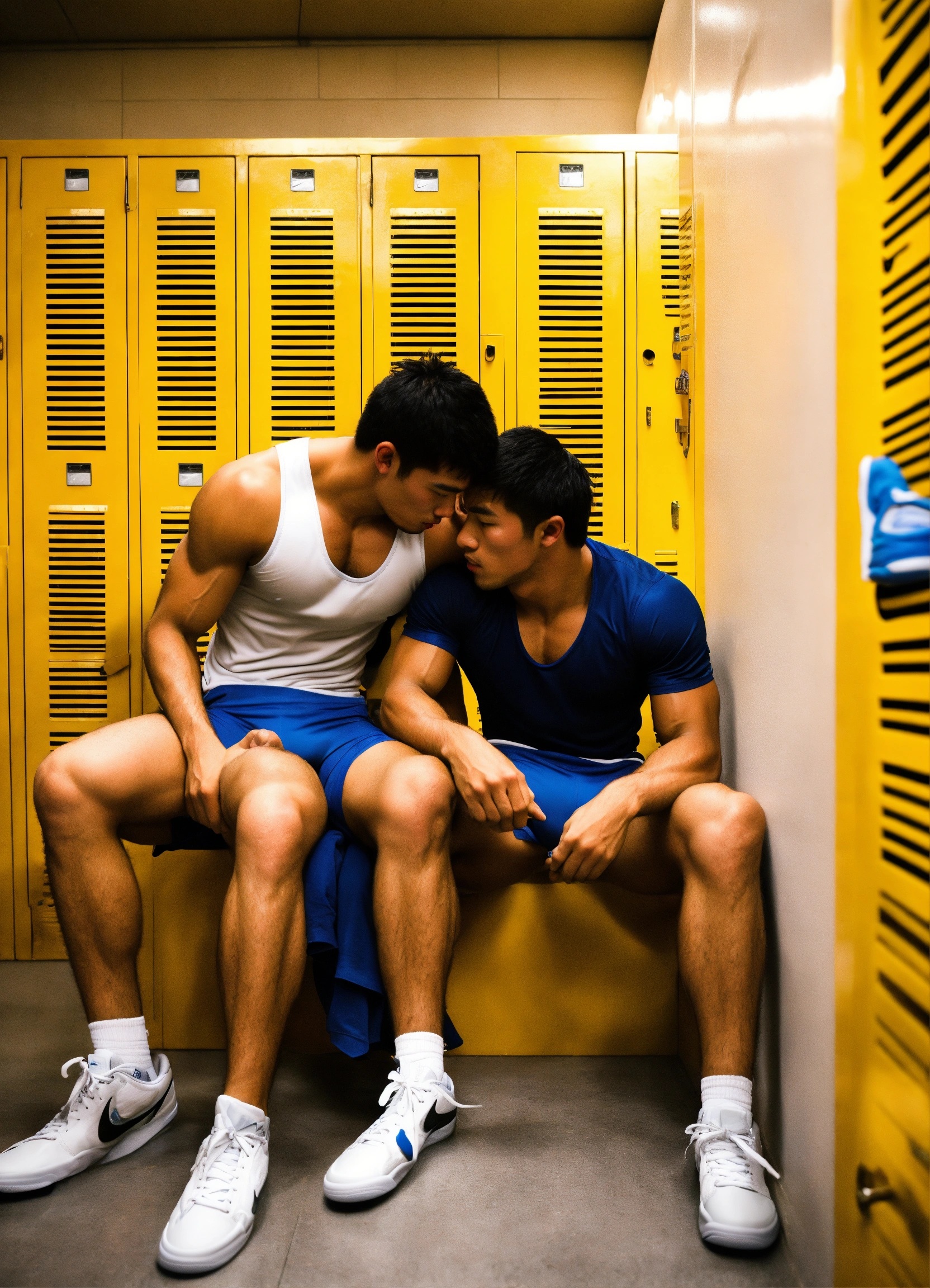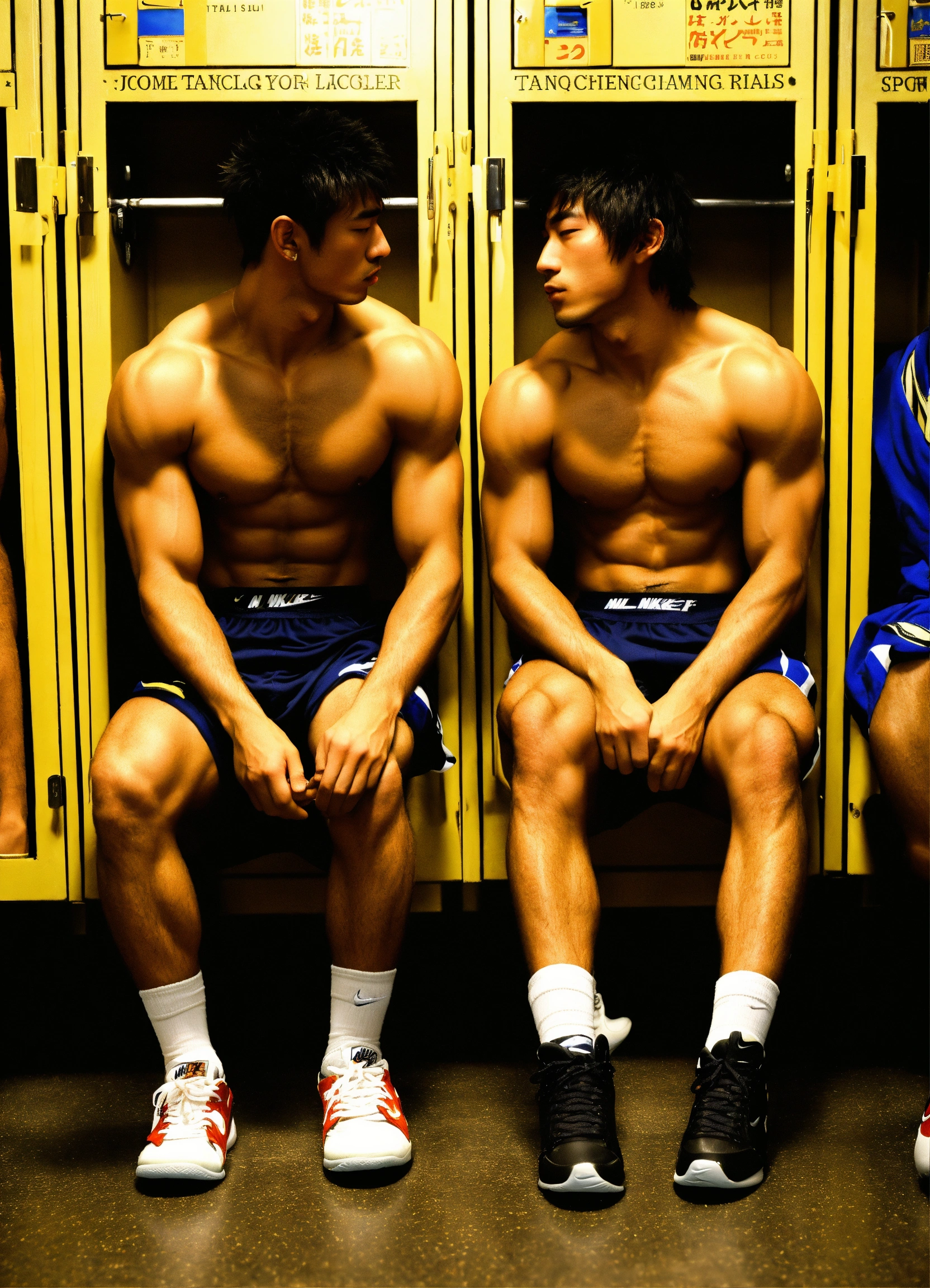 Super hairy legs, bromance, group of cool japanese fit slim sweaty sporty college handsome tanned boxer wrestlers young stud guys cuddling, smelling, holding hands, flirting, kissing, wearing nike jordans sneakers, in a locker room lockers, with big bulges, sniffing sneakers, gazing into each other