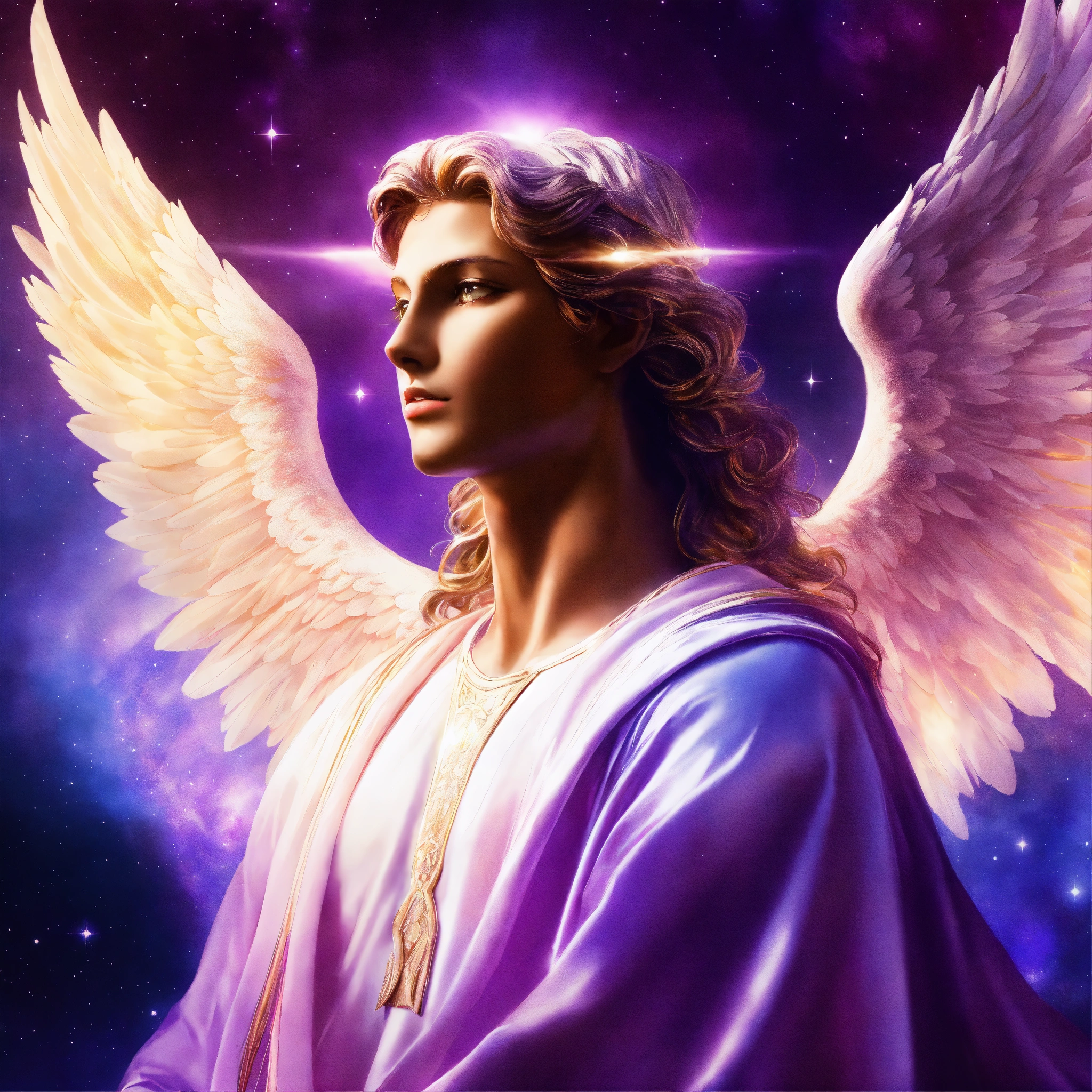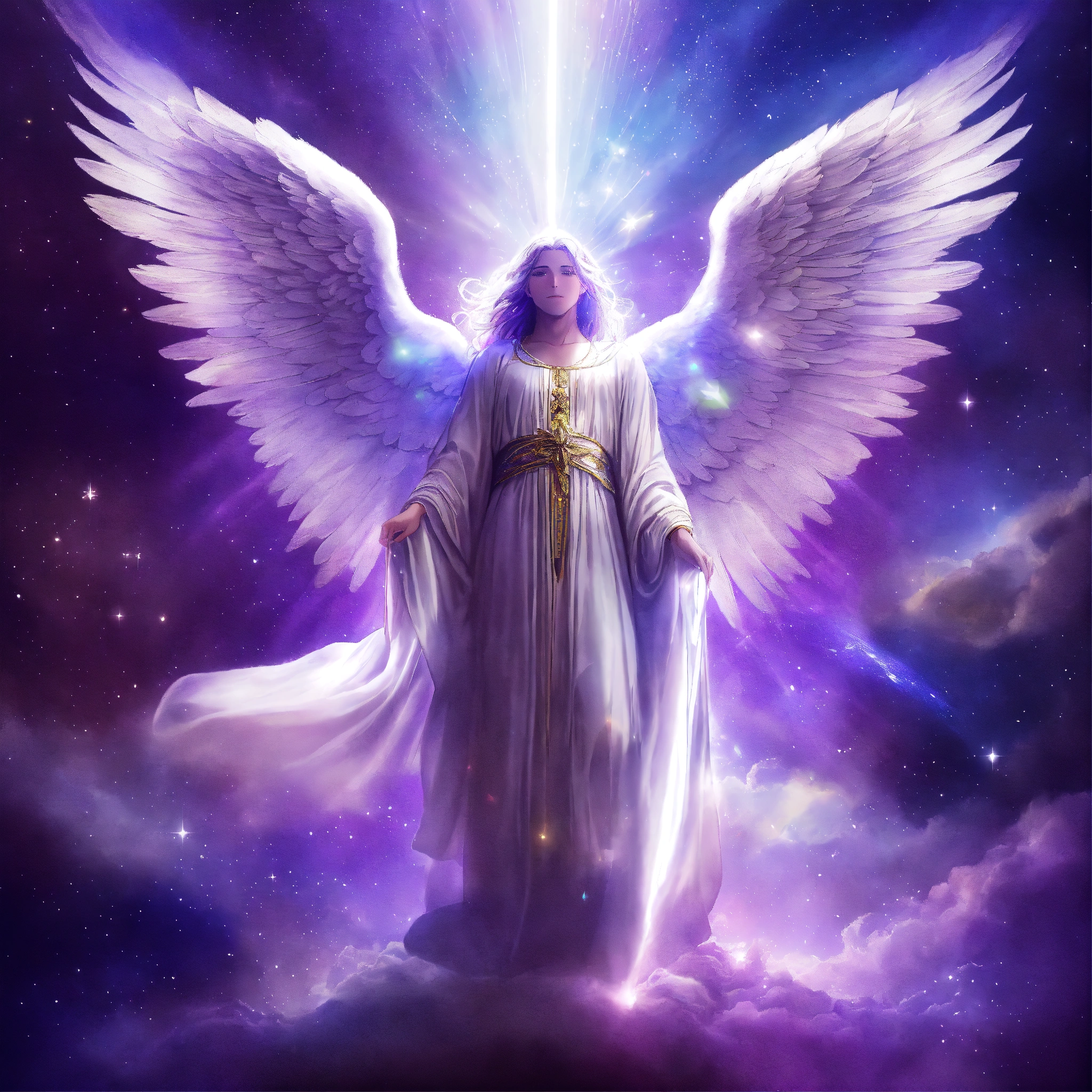 Angel moving up beautiful uplifting spiritual visionary scene with wonderful light sparkling radiant white iridescent light with incredible cosmic awakening archangel michael kindly face in radiant violet robes