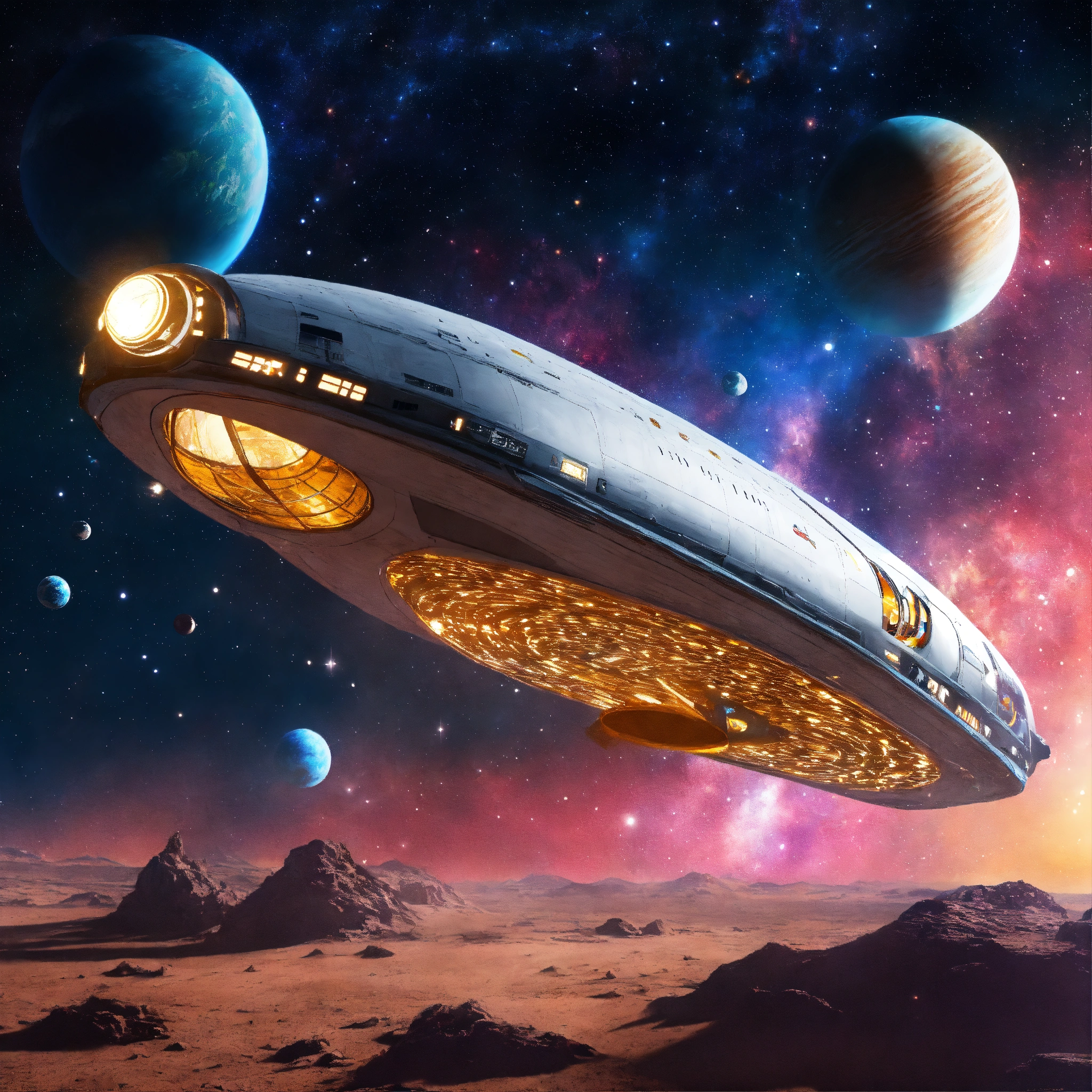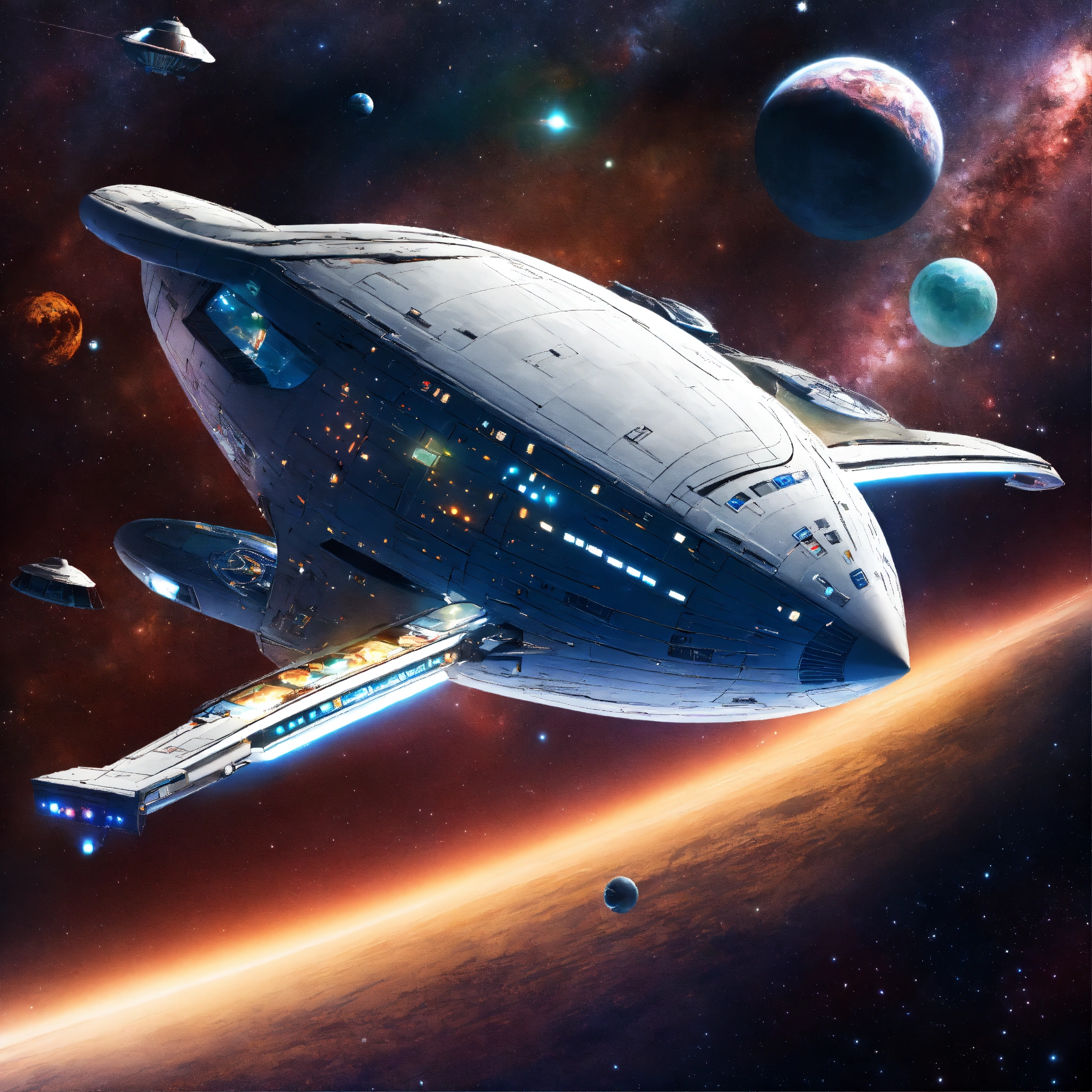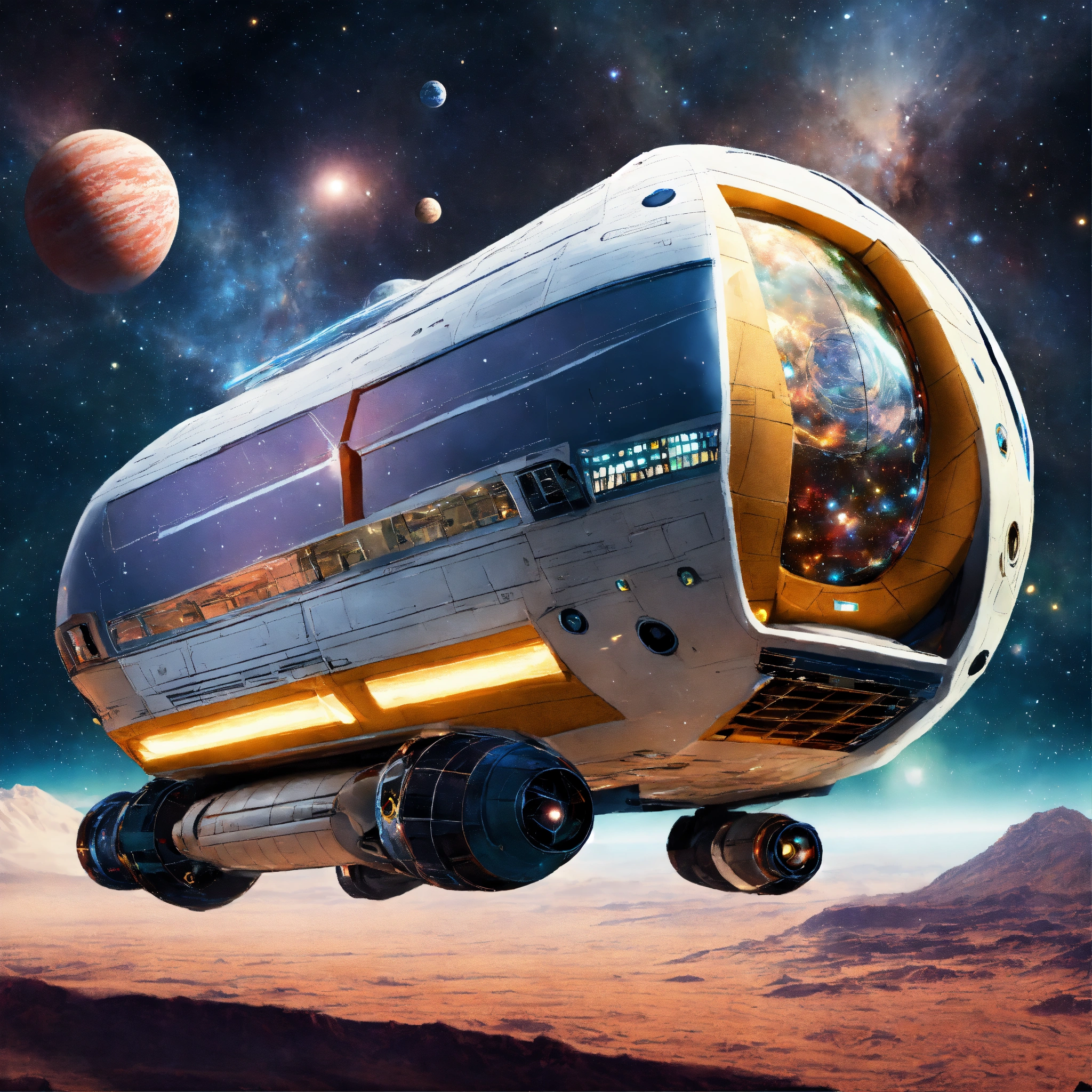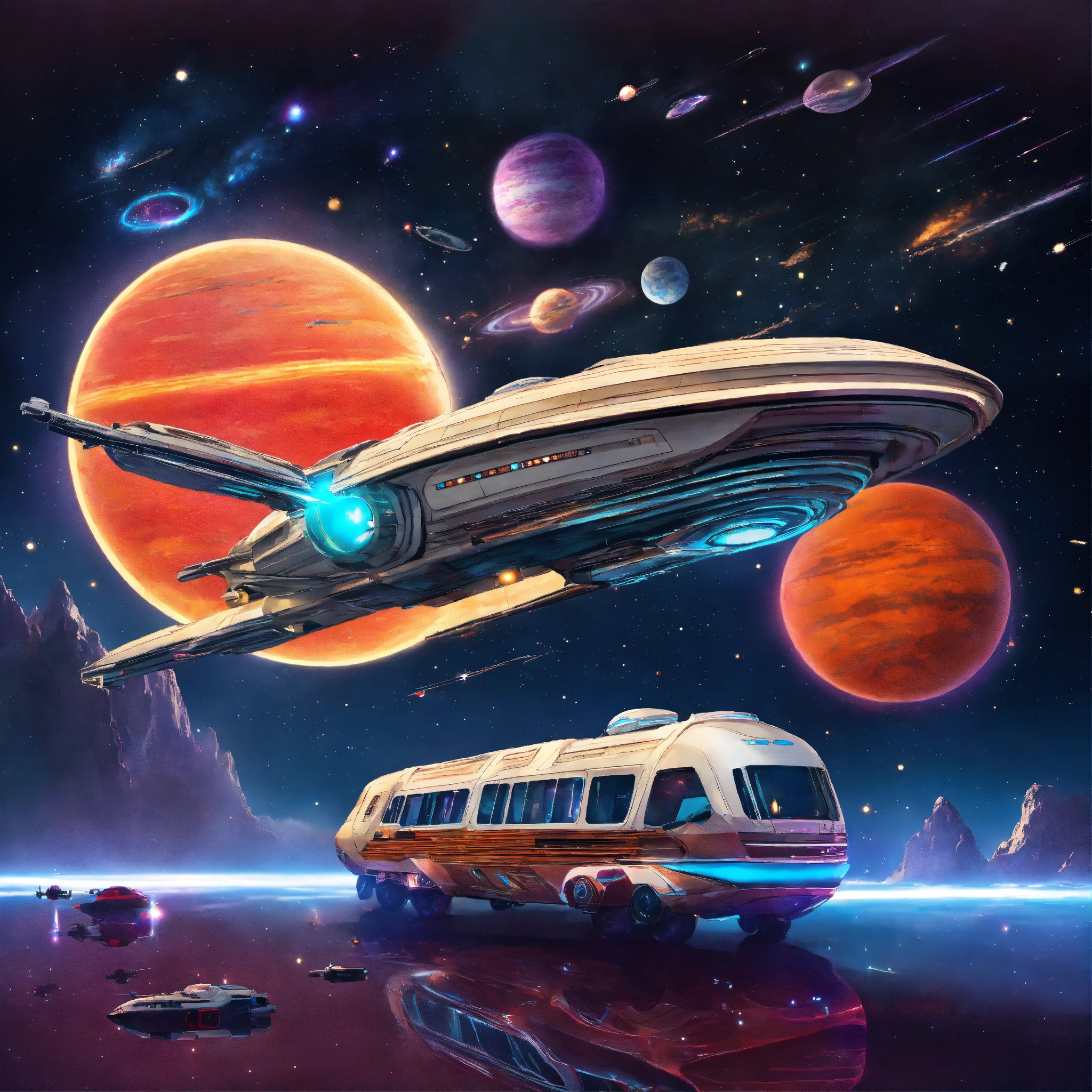 Intergalactic tour bus starship traveling through space