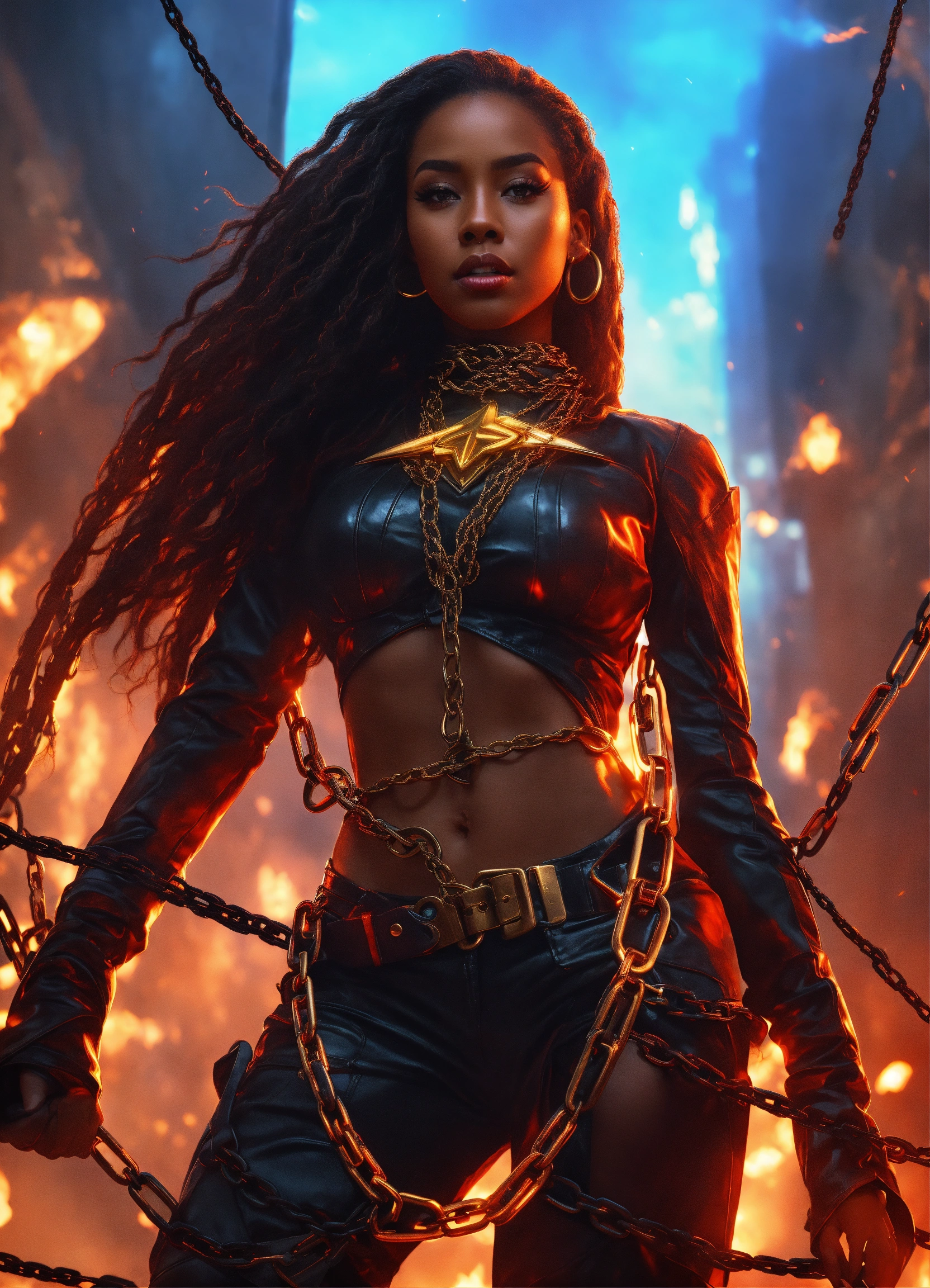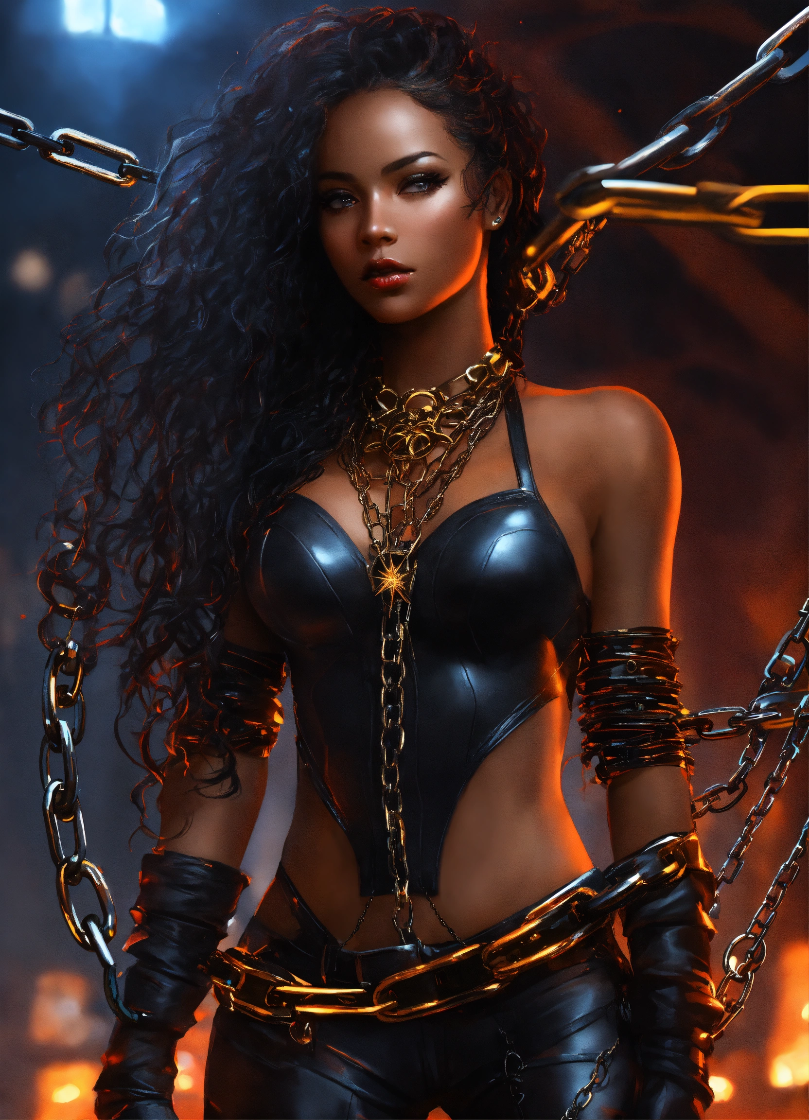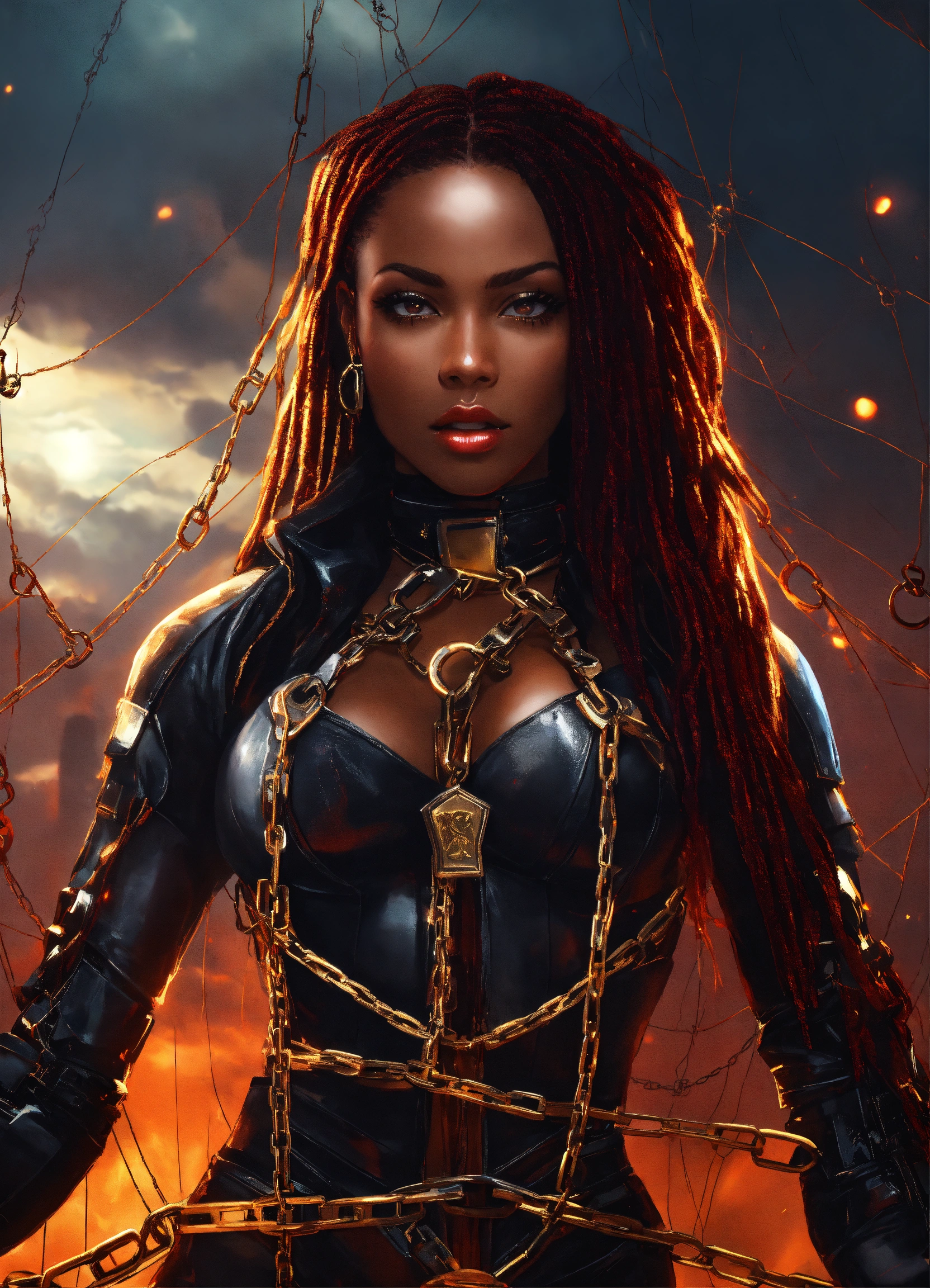 Handcuffed black futuristic warrior prisoner, chained beautiful black futuristic warrior girl dark brown skin chained to tower spiderweb of chains, beautiful perfect face, shapely hour-glass figure long flowing hair in fiery chains arms chained to her side, fully clothed wearing a black super spy stealth outfit with a gold star on her chest bound in fiery chains, hands on her hips she's floating in the sky with dark clouds and red lightning behind her, fantasy, high detail, realistic photo, high detail, digital painting, cinematic, stunning, hyper-realistic, sharp focus, high resolution 8k, insanely detailed