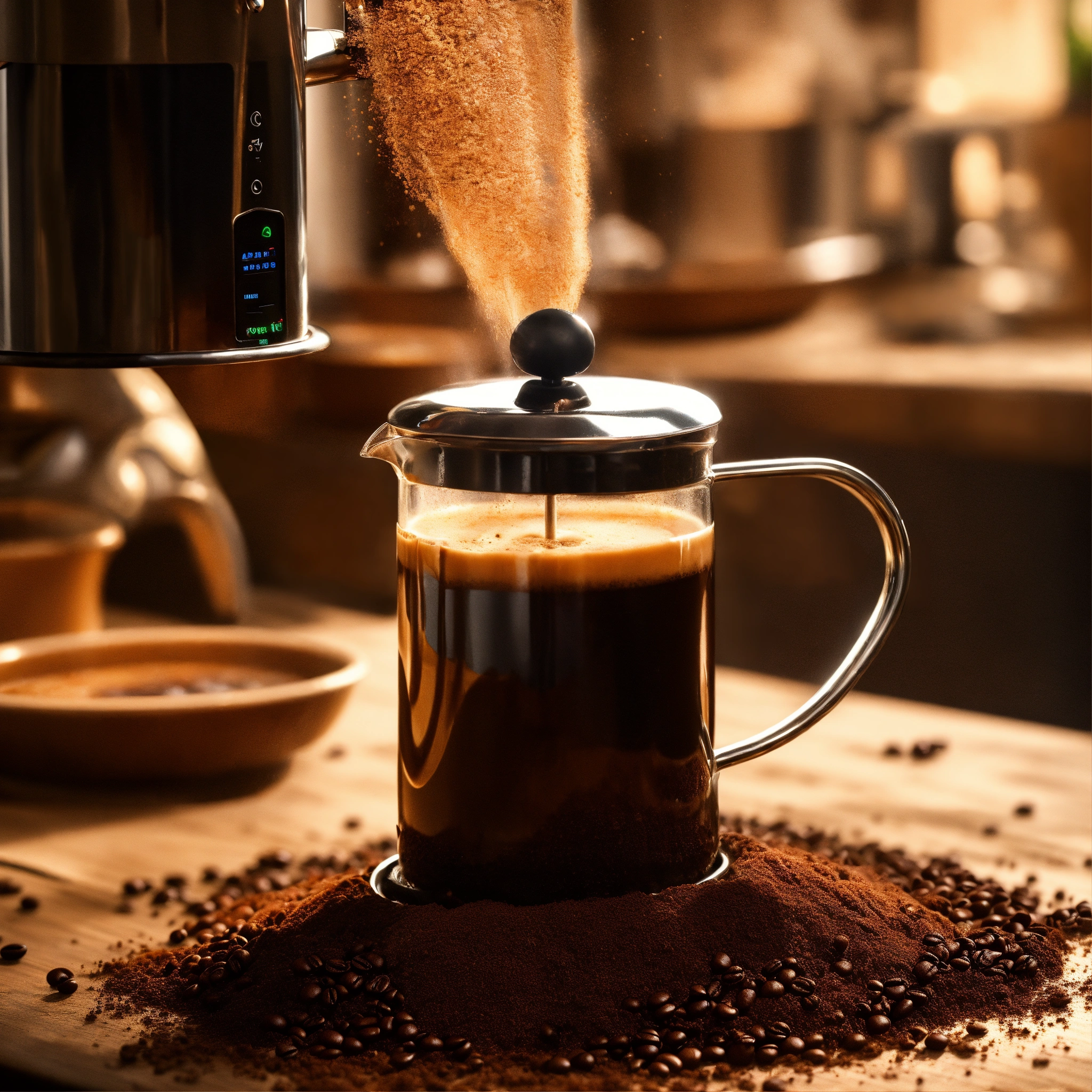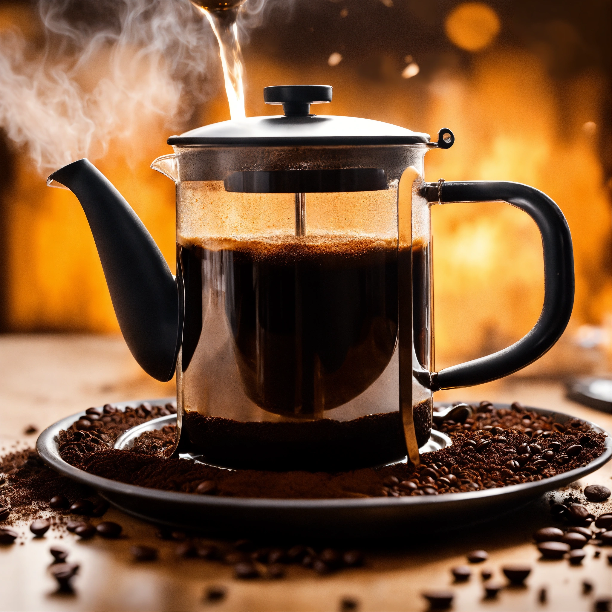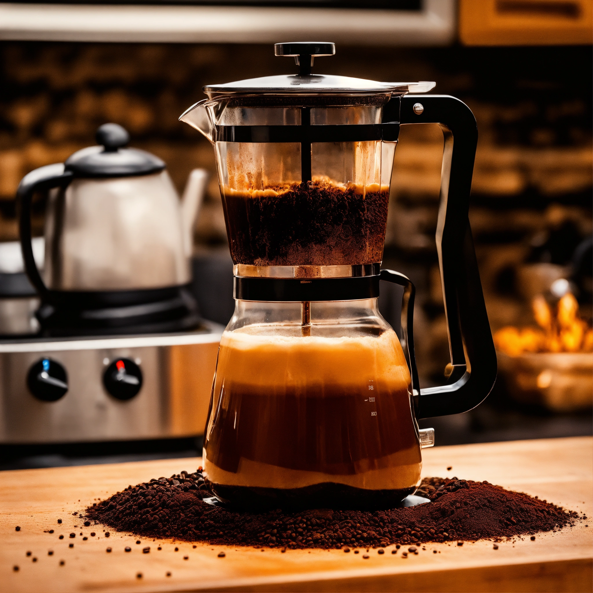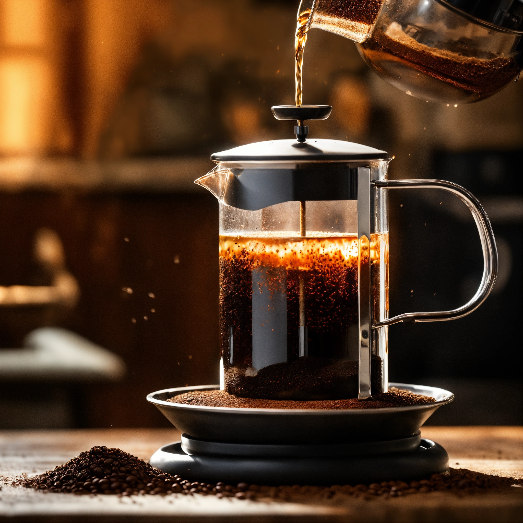 Generate a realistic image of hot water in a kettle being poured over the coffee grounds in the french press, show the saturation of the coffee grounds