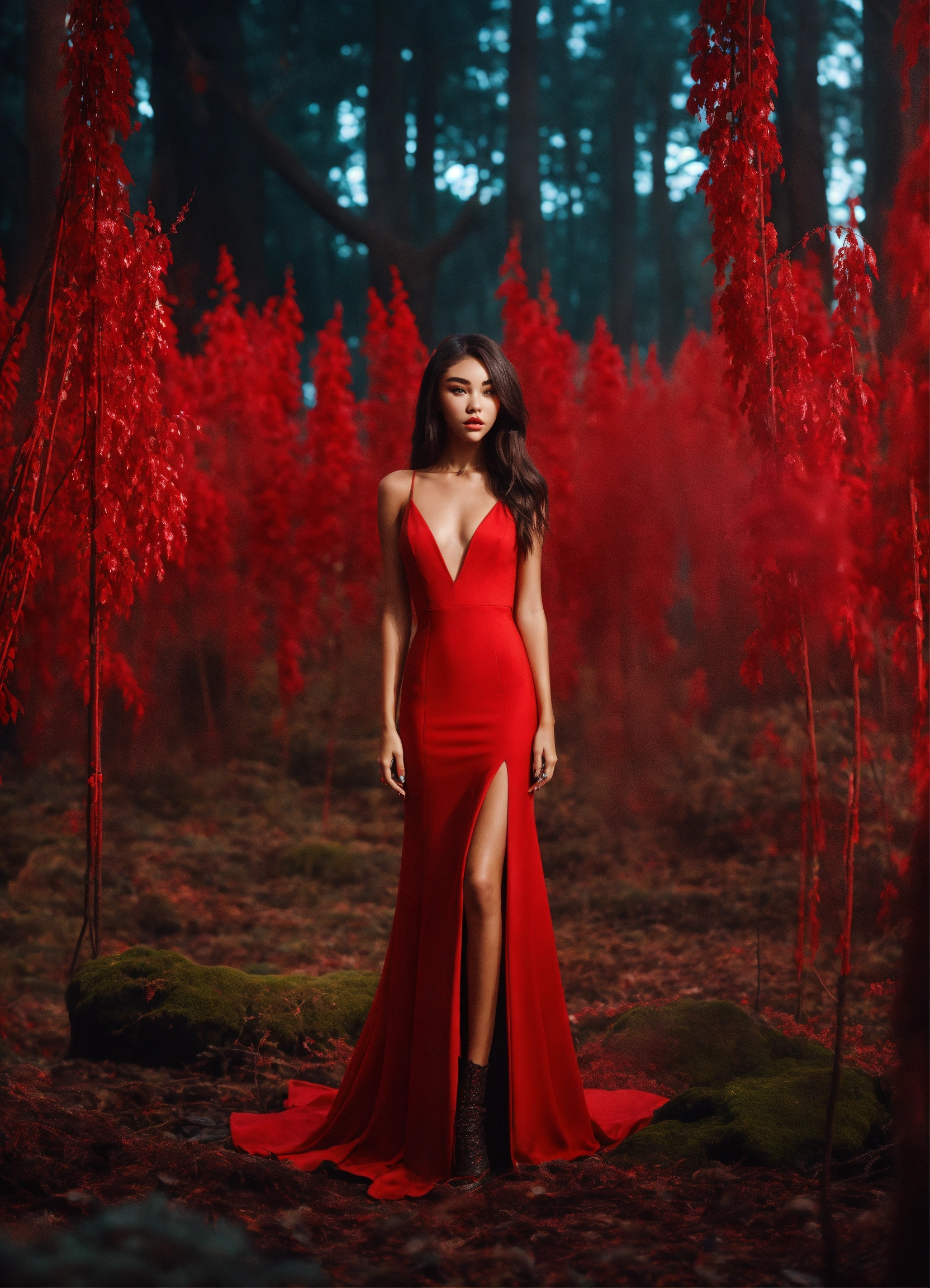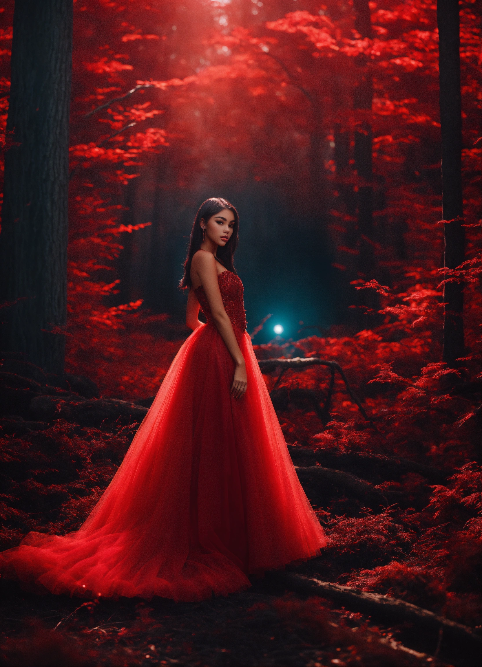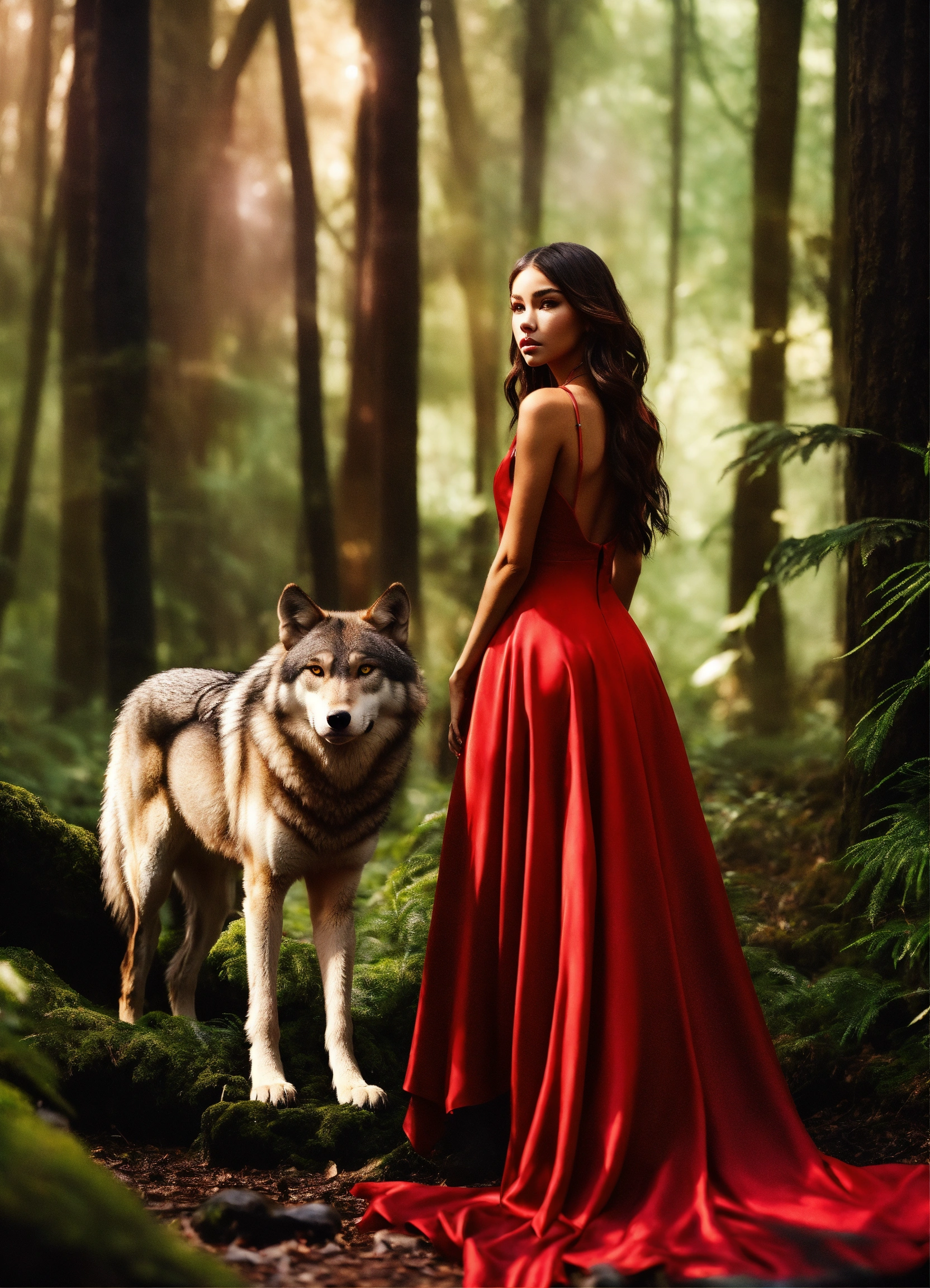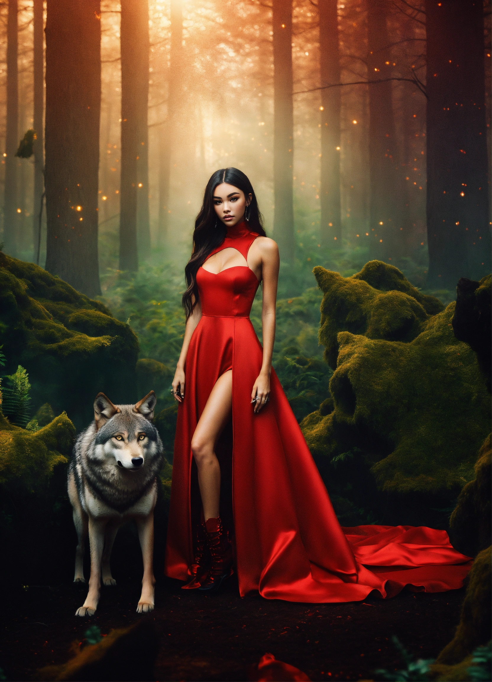 Madison beer in a beautiful red dress, in a dark futuristic alien forest. a wolf with amber eyes watching her