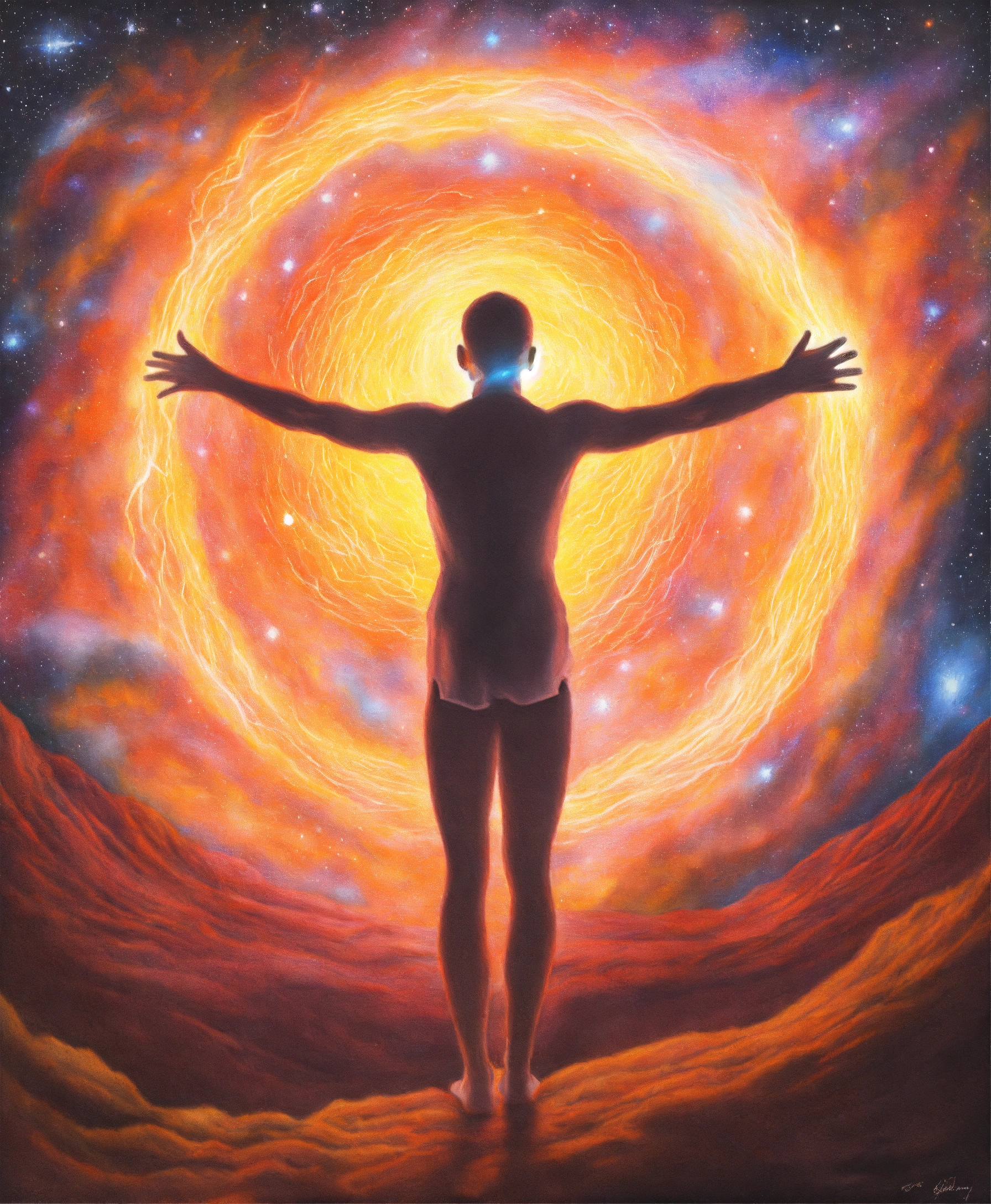 Realistic colored pencil drawing of a current of energy around a formless human silhouette of light, galaxy nature background