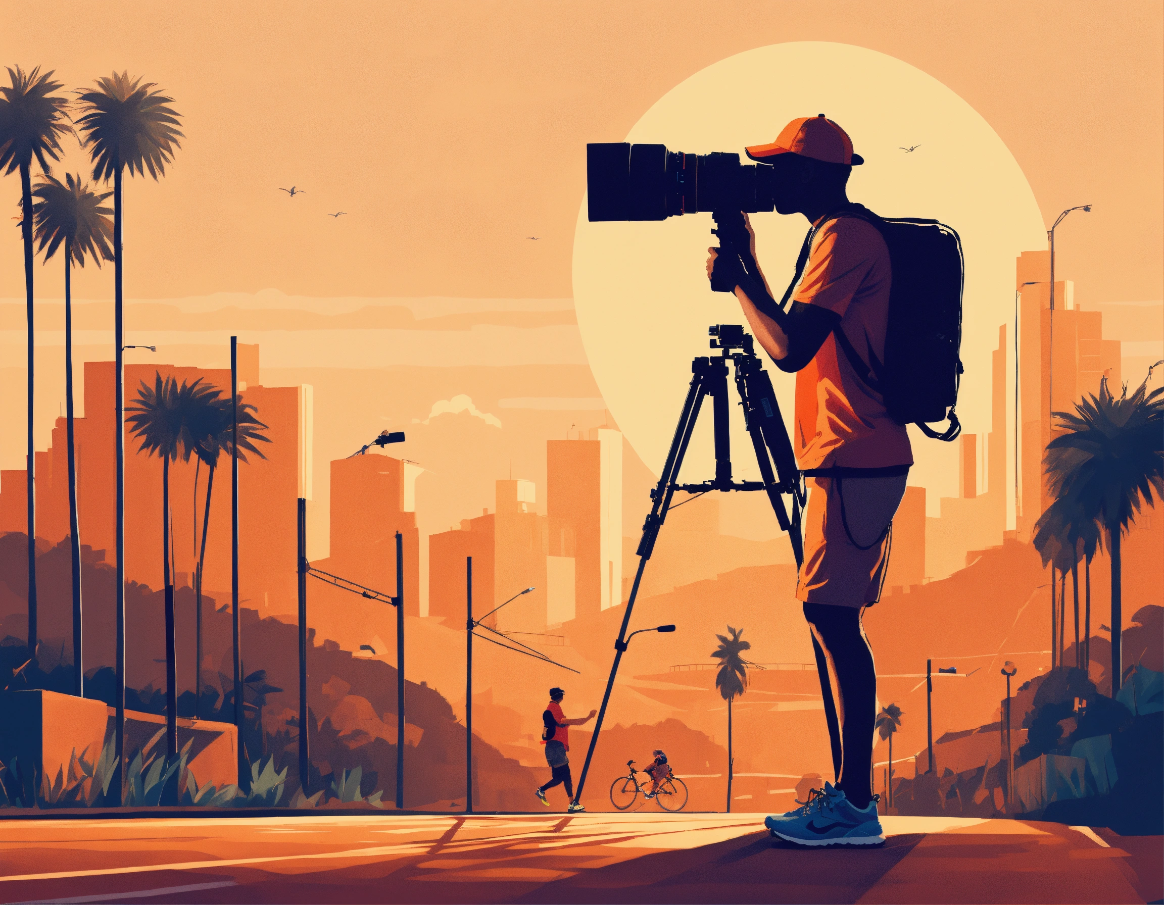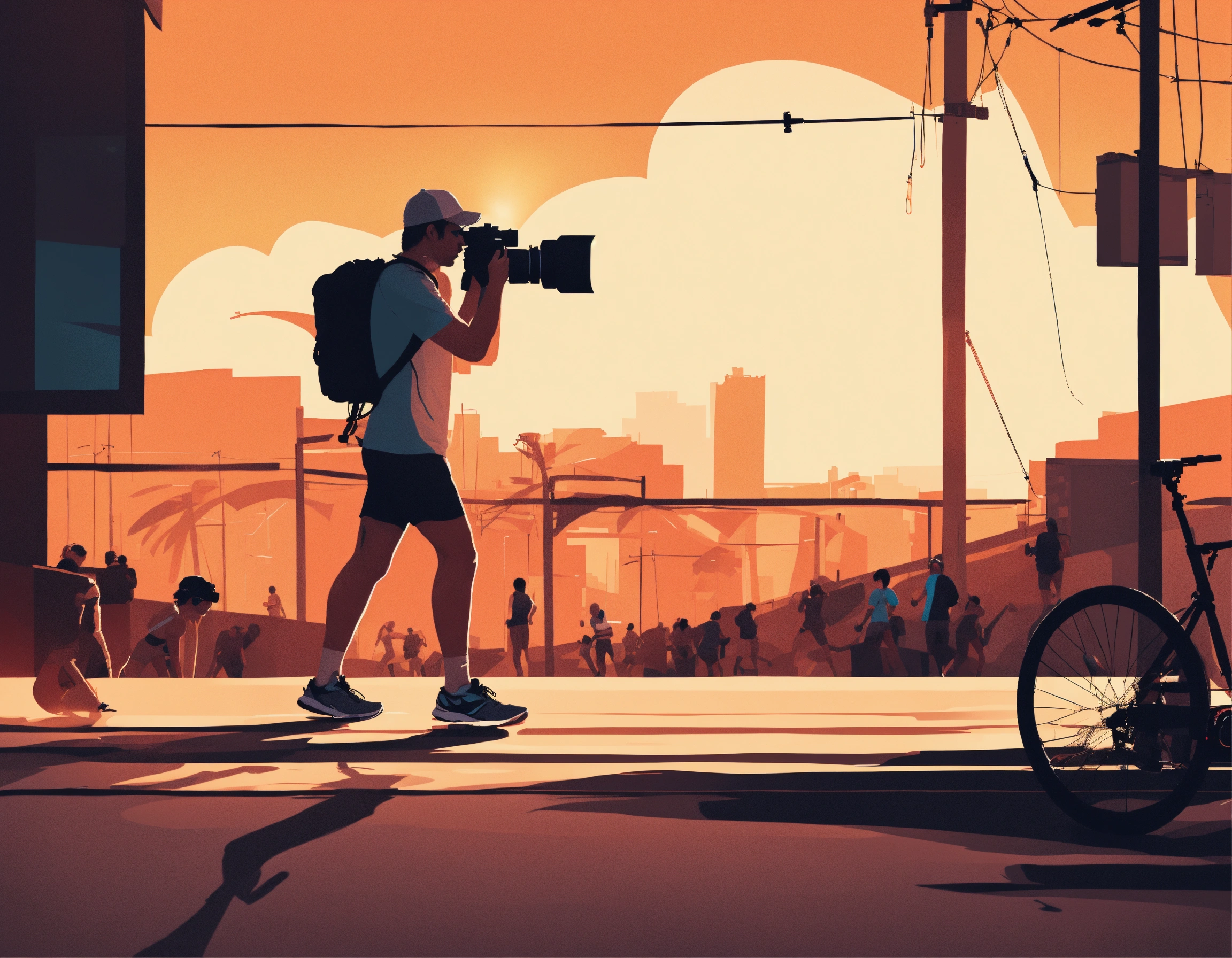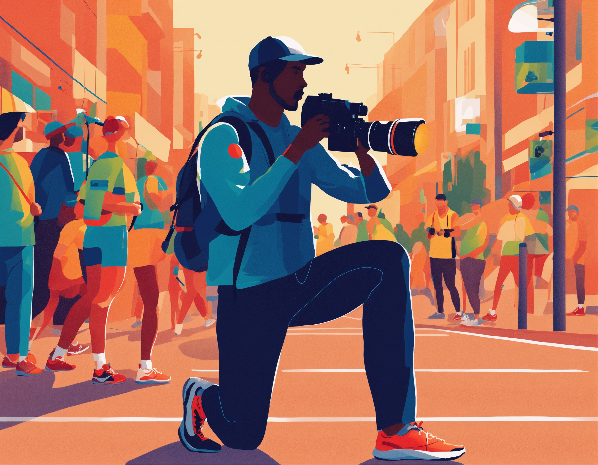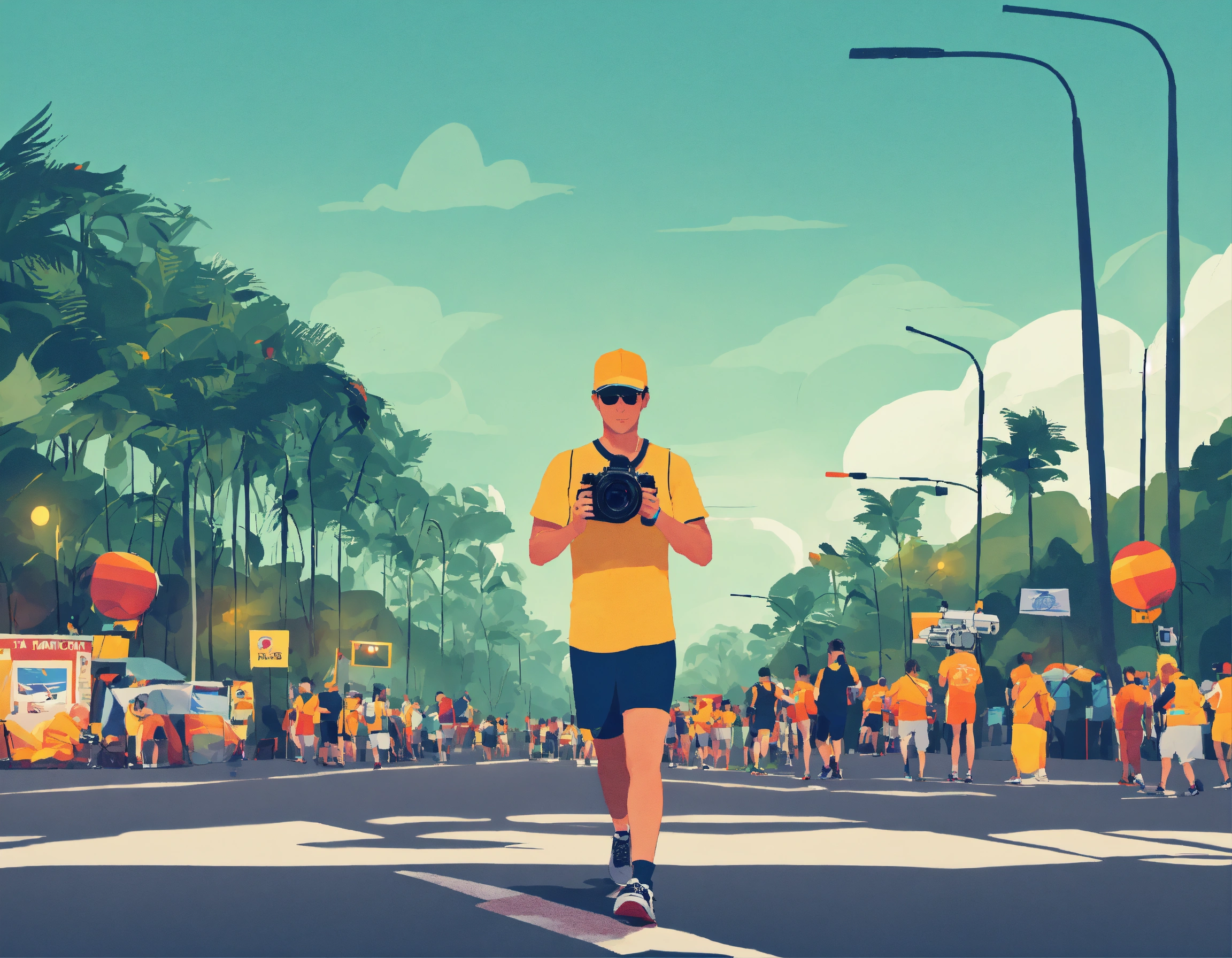 Photographer with a camera and giant telephoto lens, disproportionate lens. Minimalist illustration. Sports event photographer covering a marathon in Brazil. Photographer wearing light, summer, sports clothes, T-shirt, pants and sneakers. Cinematic, Photoshoot, Shot on 16mm Lens, Depth of Field, Blur Tilt Angle, Shutter Speed 1 /1000, F/22, White Balance, 32k, Super resolution, Pro Photo RGB, Partial Backlight, Backlight, Dramatic Light, Incandescent, Soft Light, Volumetric, Conte-Jour, Global Illumination, Screen Space Global Illumination, Scatter, Shadows, Harsh, Shimmer, Lumen reflections, Screen space reflections, Diffraction gradation, Chromatic aberration, GB offset, Sweep lines, Ambient occlusion, Anti-aliasing, FKAA, TXAA, RTX, SSAO, OpenGL-Shader's, Post Processing, Post Production, Cell Shading, Tone Mapping, CGI, VFX, SFX, incredibly detailed and intricate, hyper realistic, elegant, dynamic pose, photography, volumetric, ultra-detailed, full details scratched
