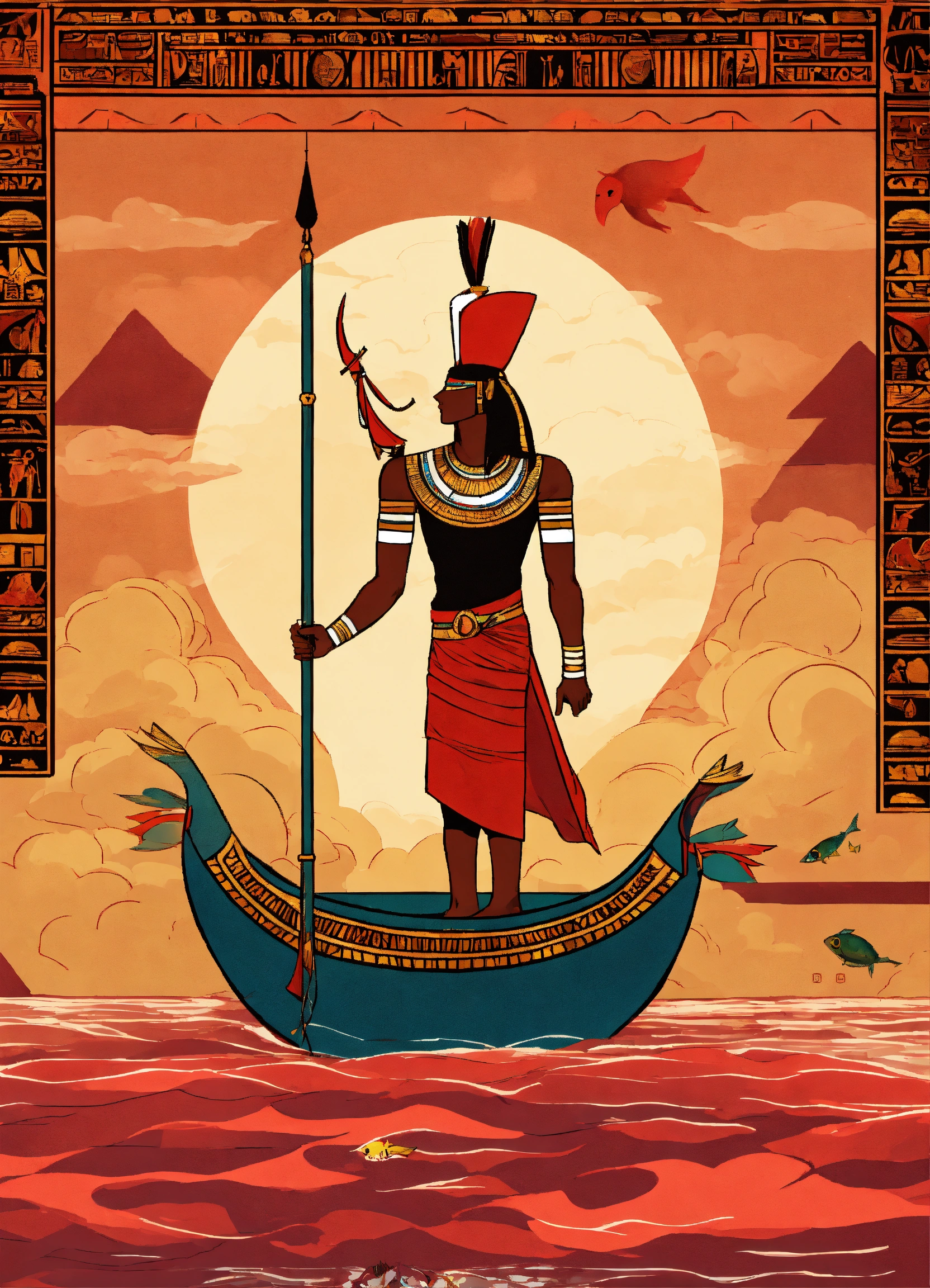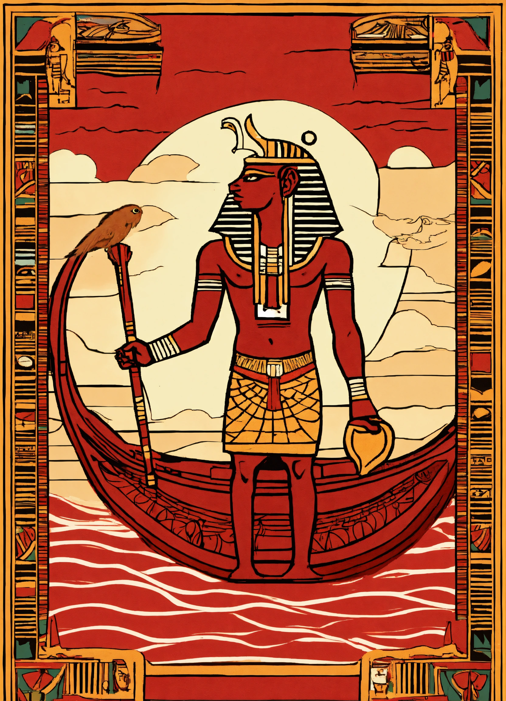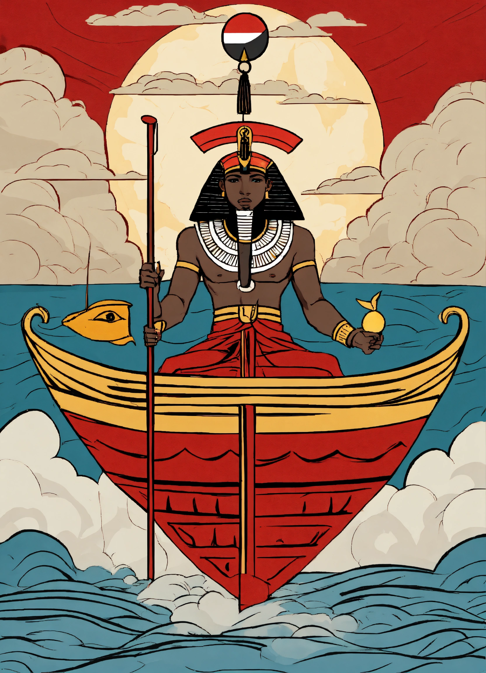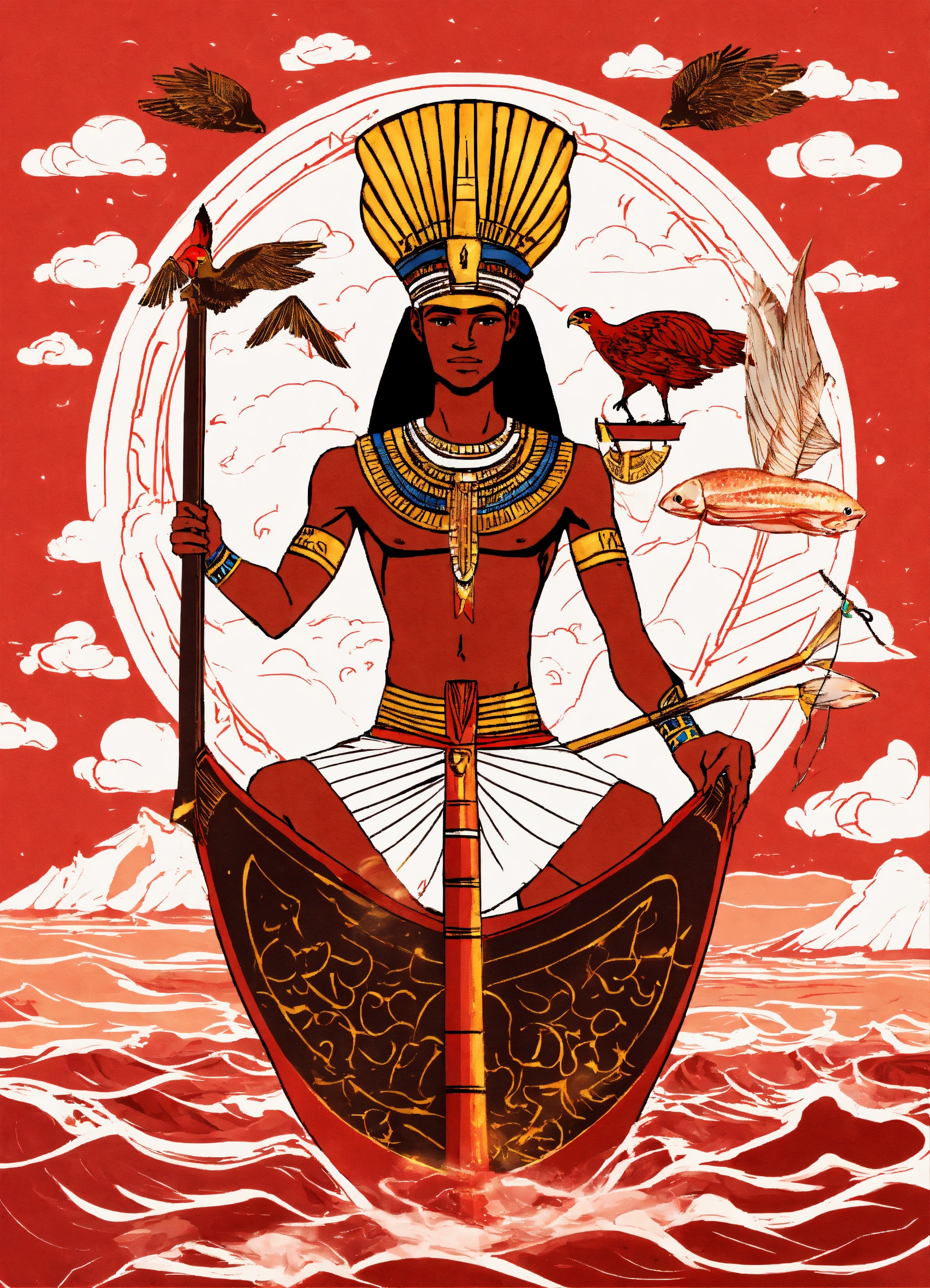 African egyptian god ra with a red falcon's head sitting in an egyptian boat wearing red and white sailing through the clouds with fish floating