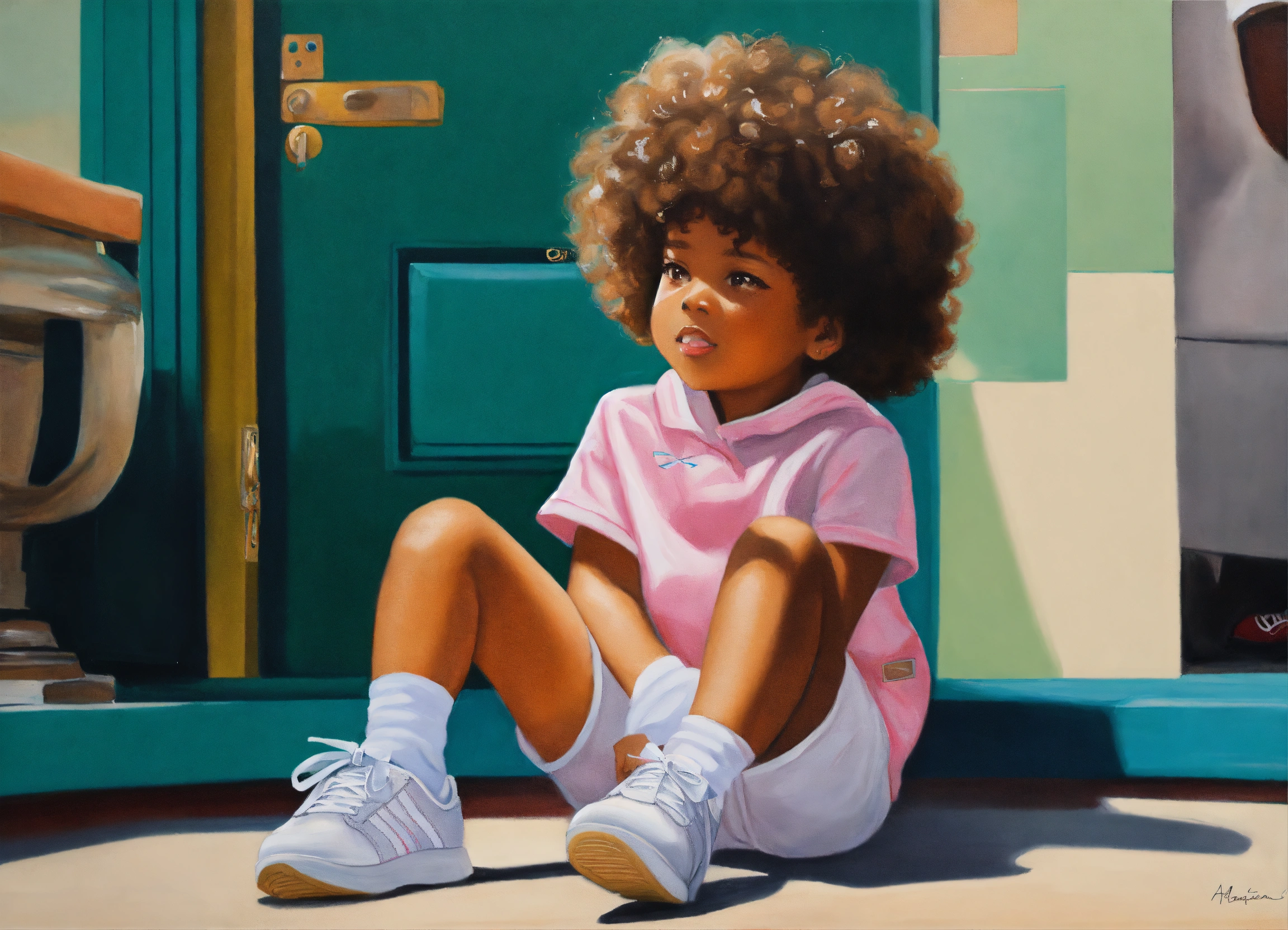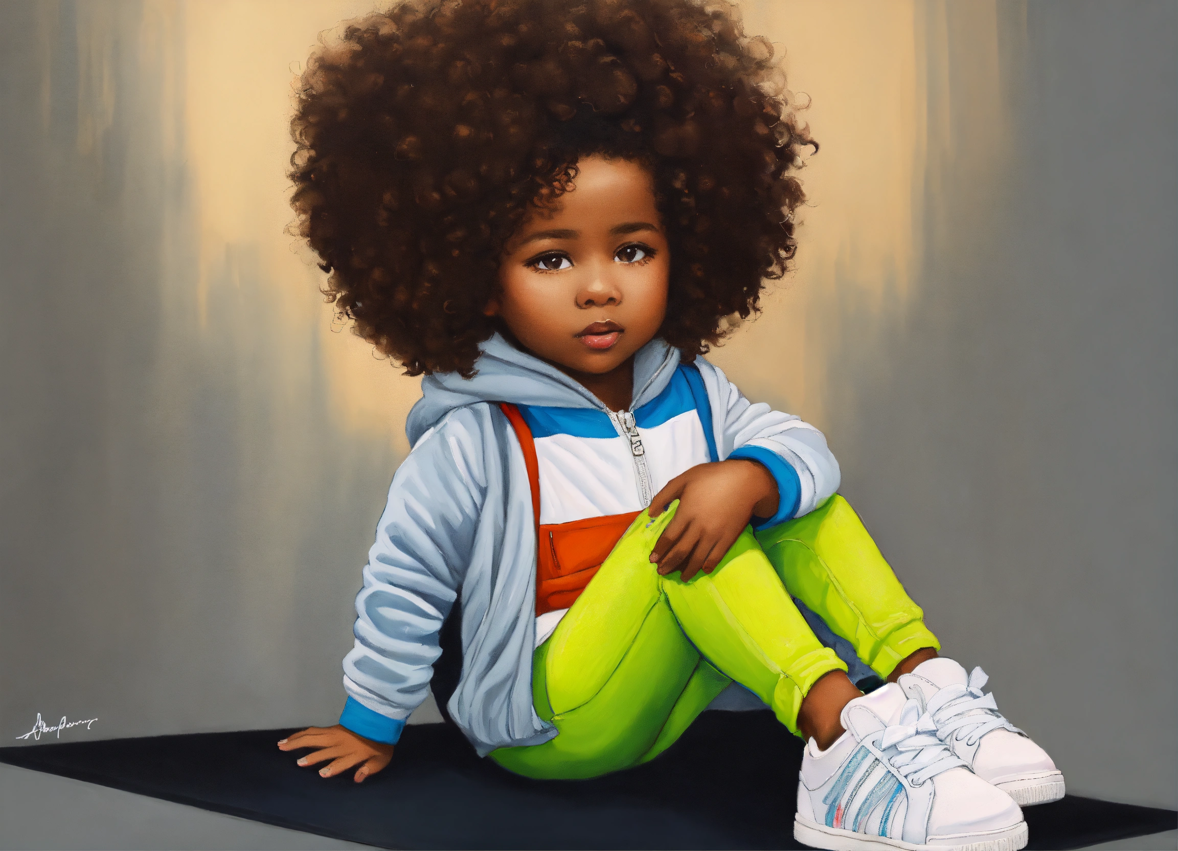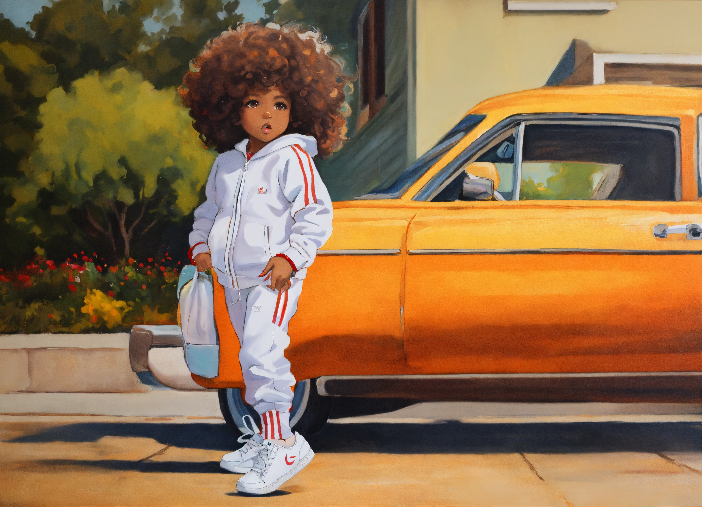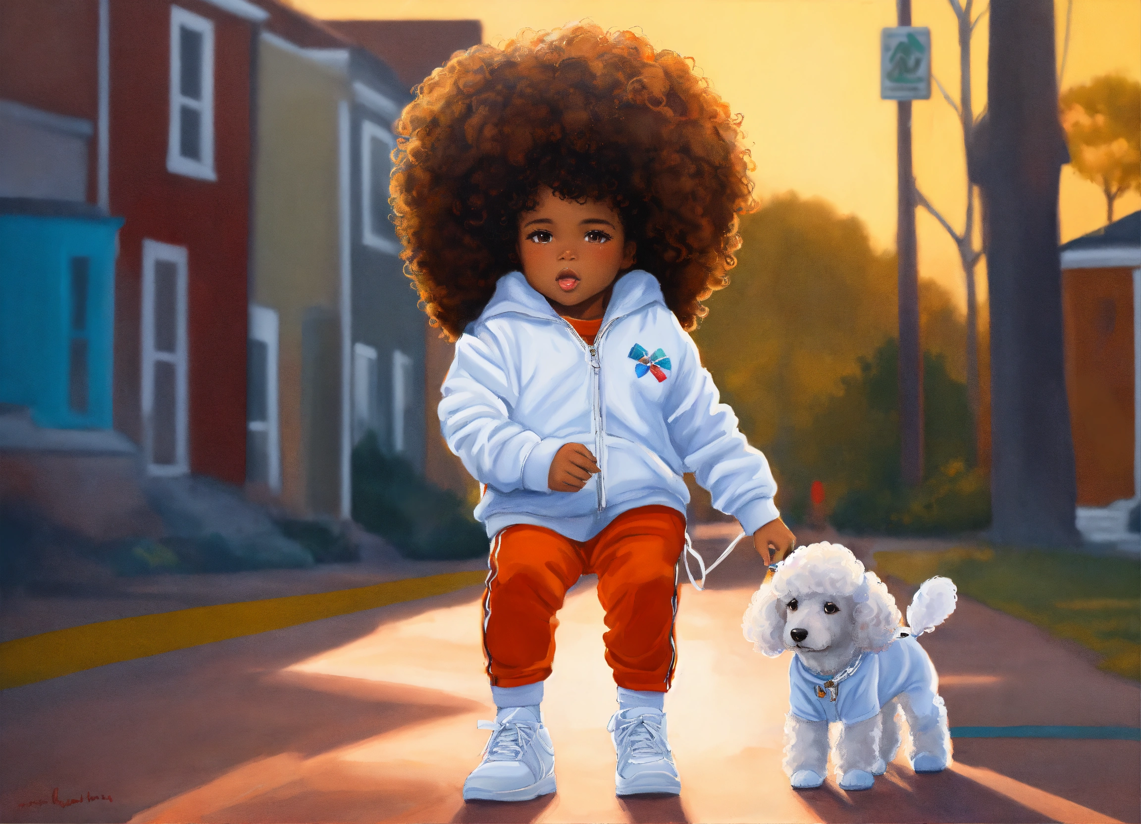 Acrylic painting, african american toddler, big soft curly afro with white bow, wearing colorblocked track suit, white tennis shoes, silver bracelet, white backpack, with a curly poodle next her