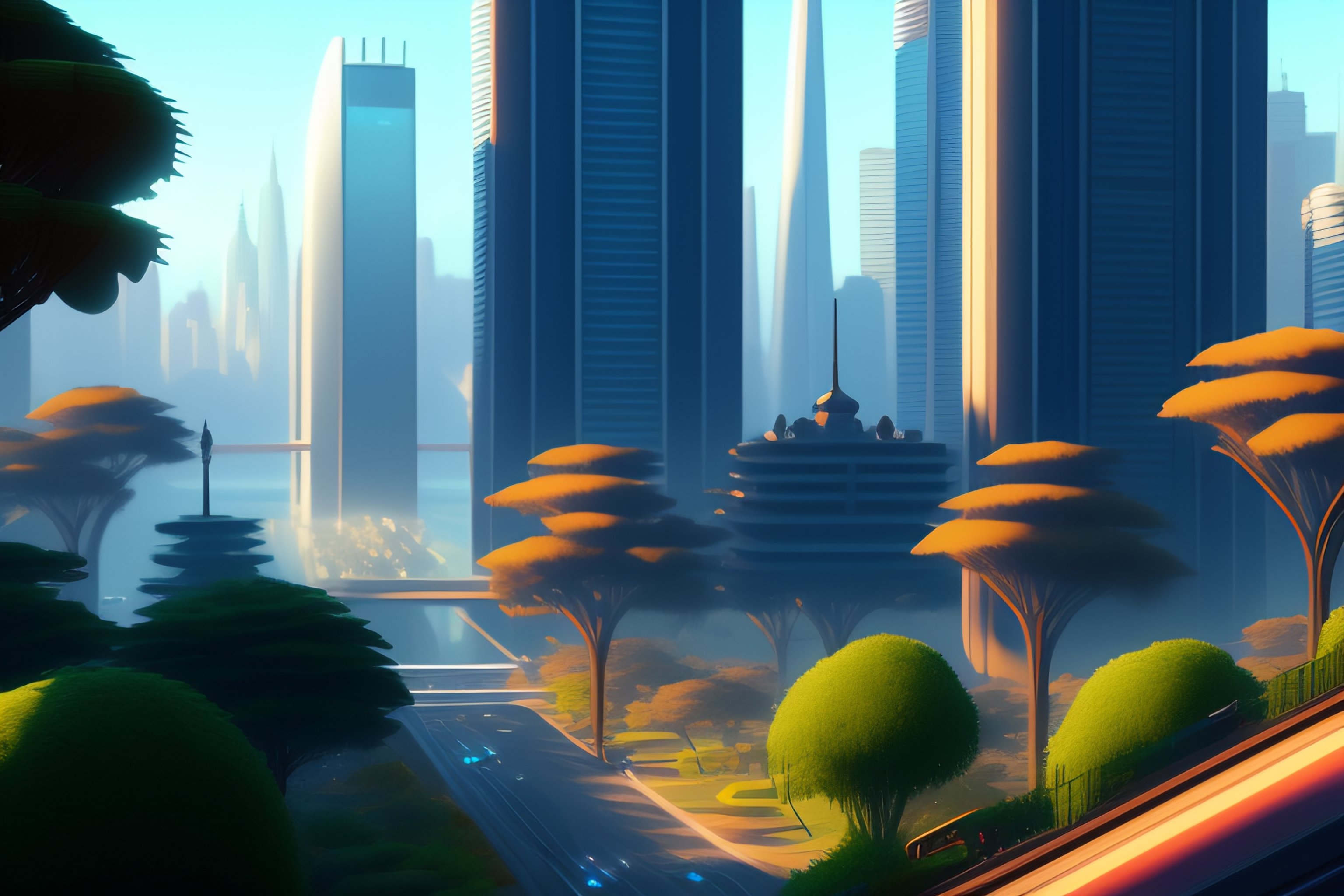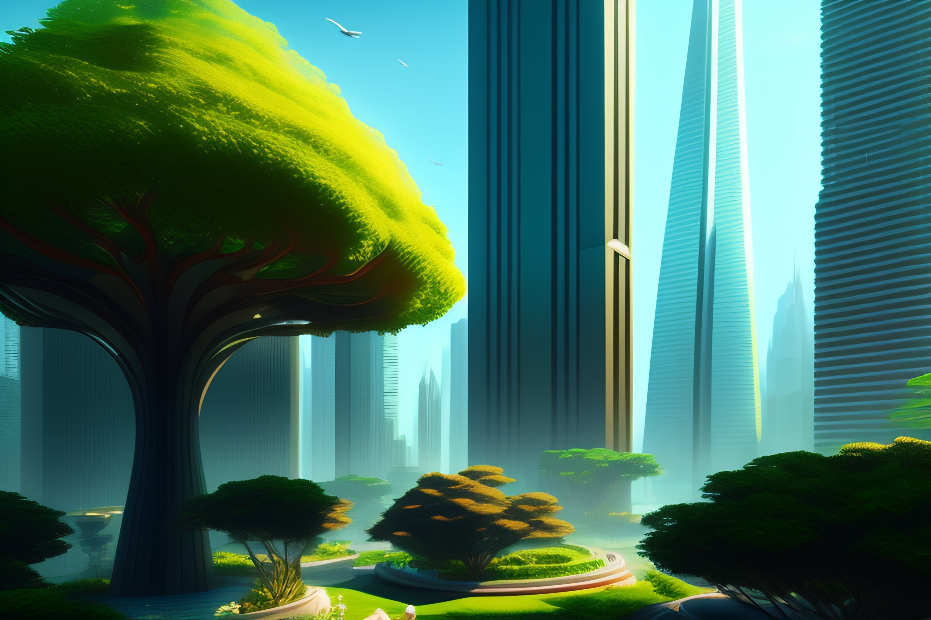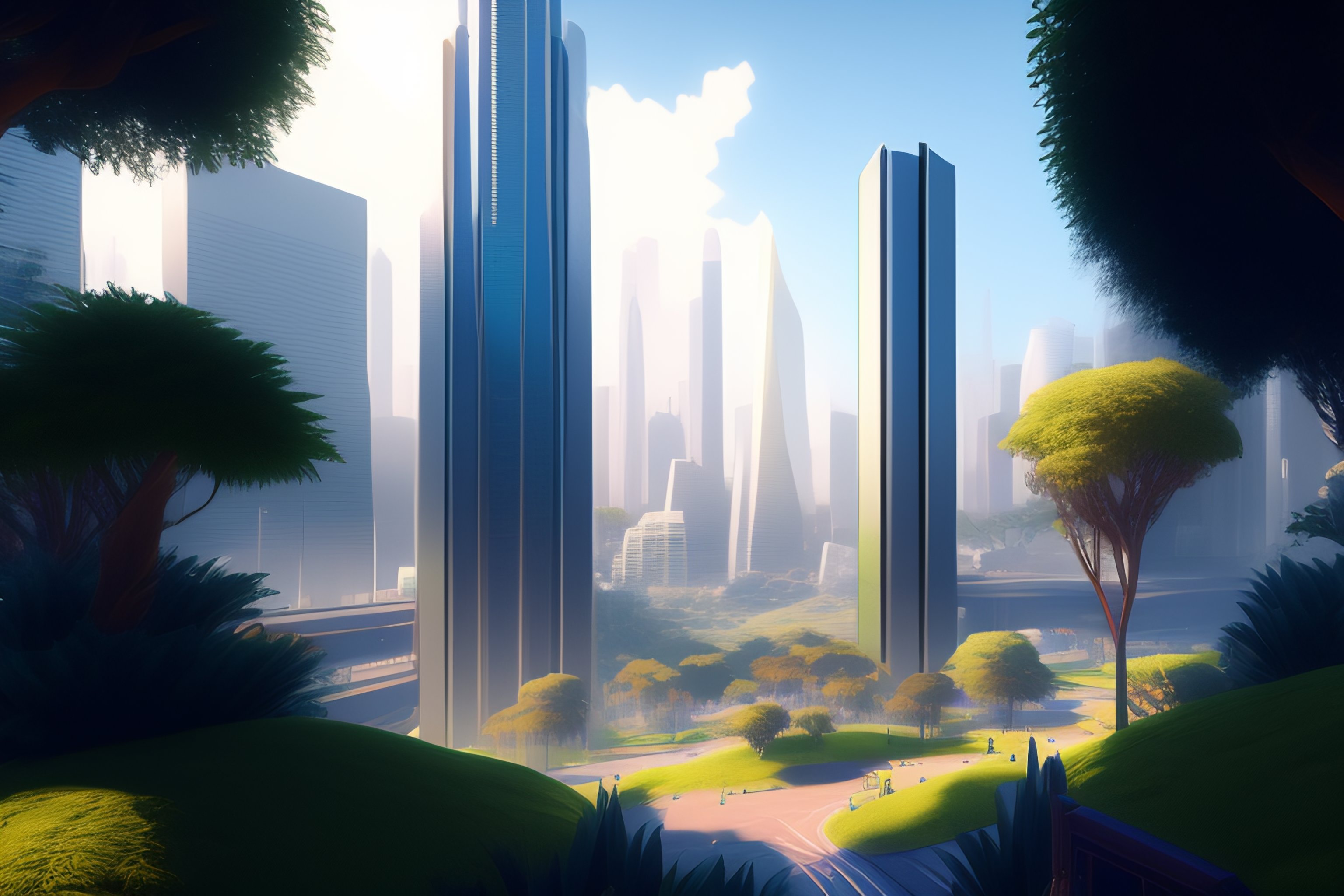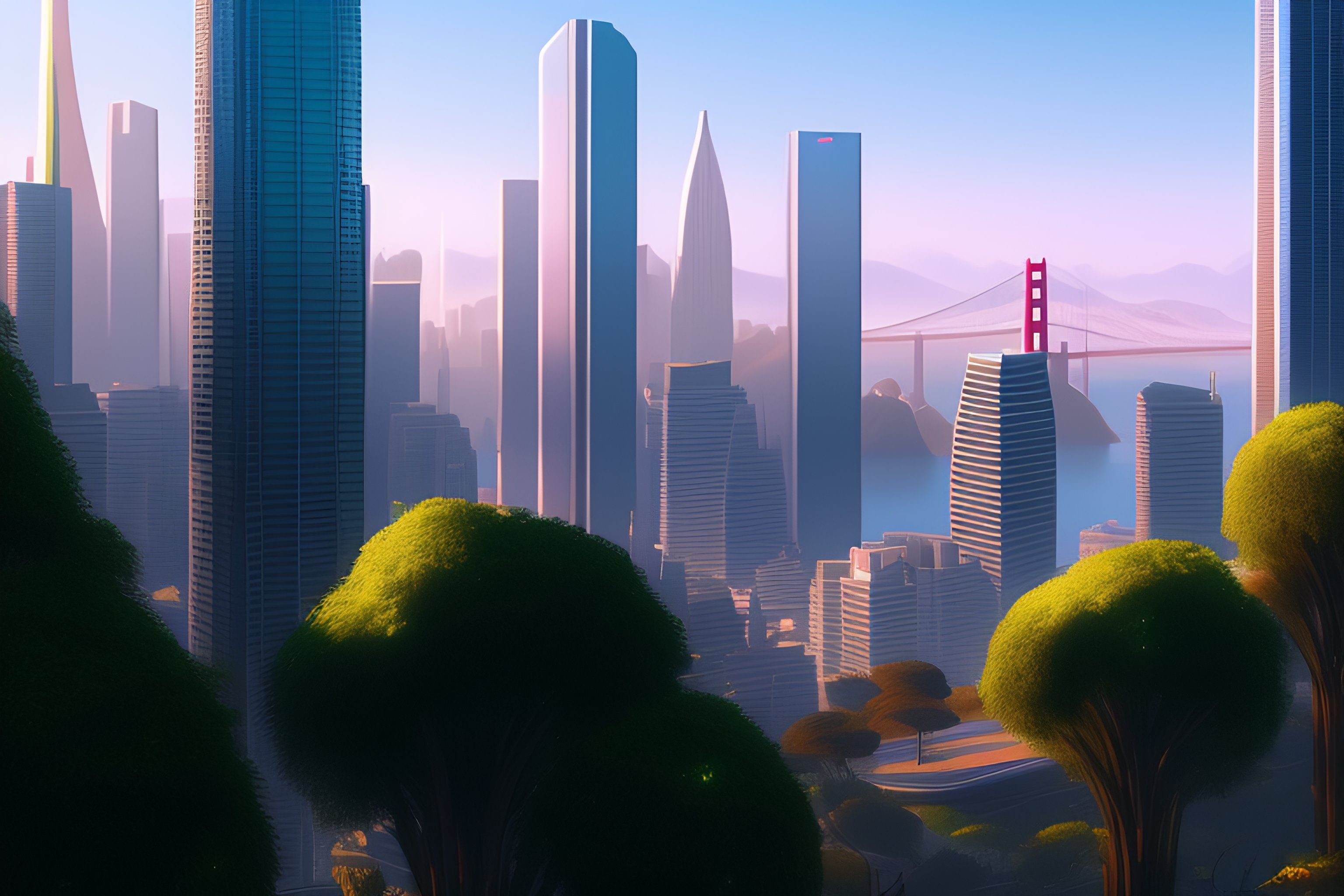 San francisco in 2050, lots of green trees everywhere, skyscrapers, intricate, highly detailed, digital painting, artstation, concept art, smooth, sharp focus, illustration, unreal engine 5, 8 k