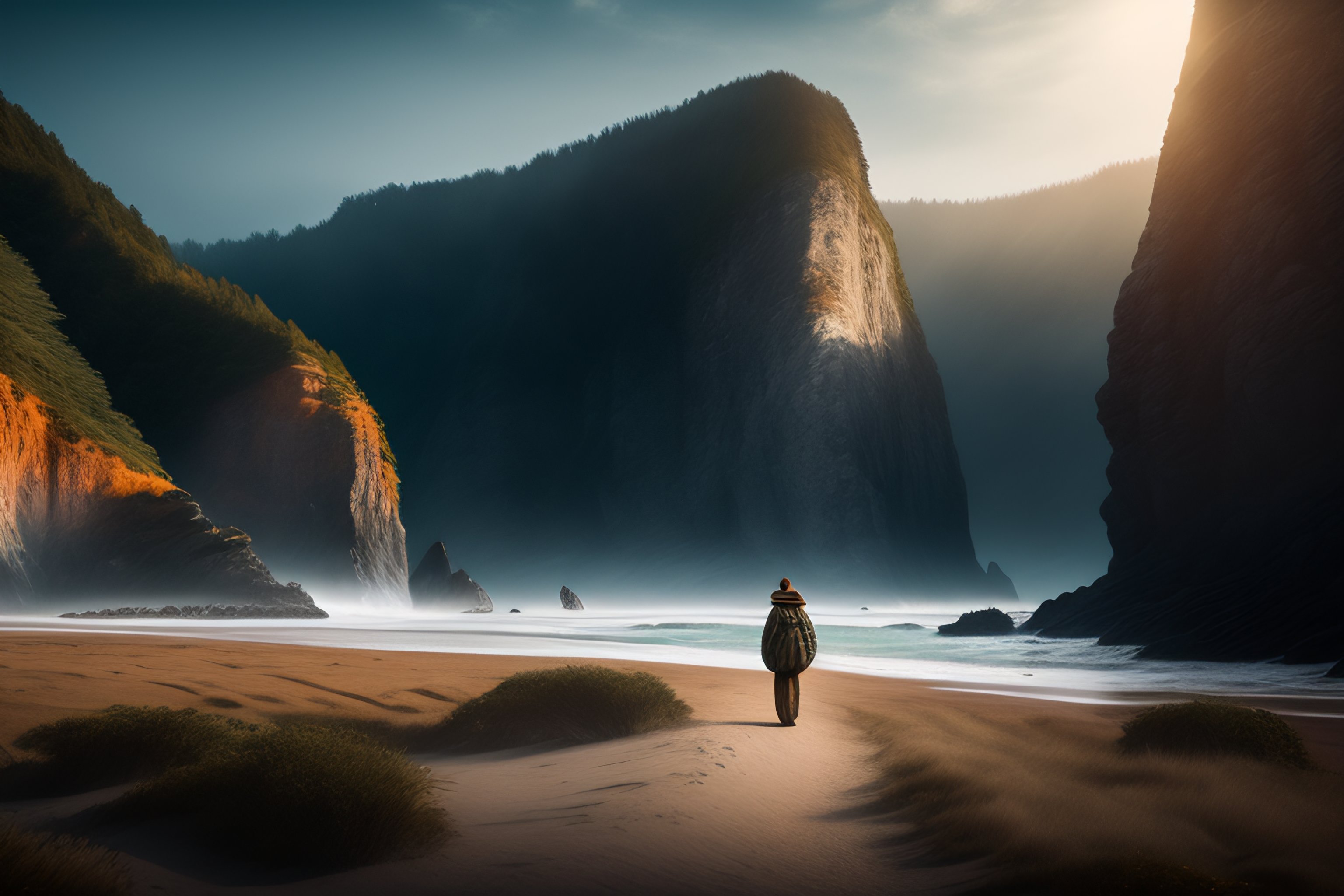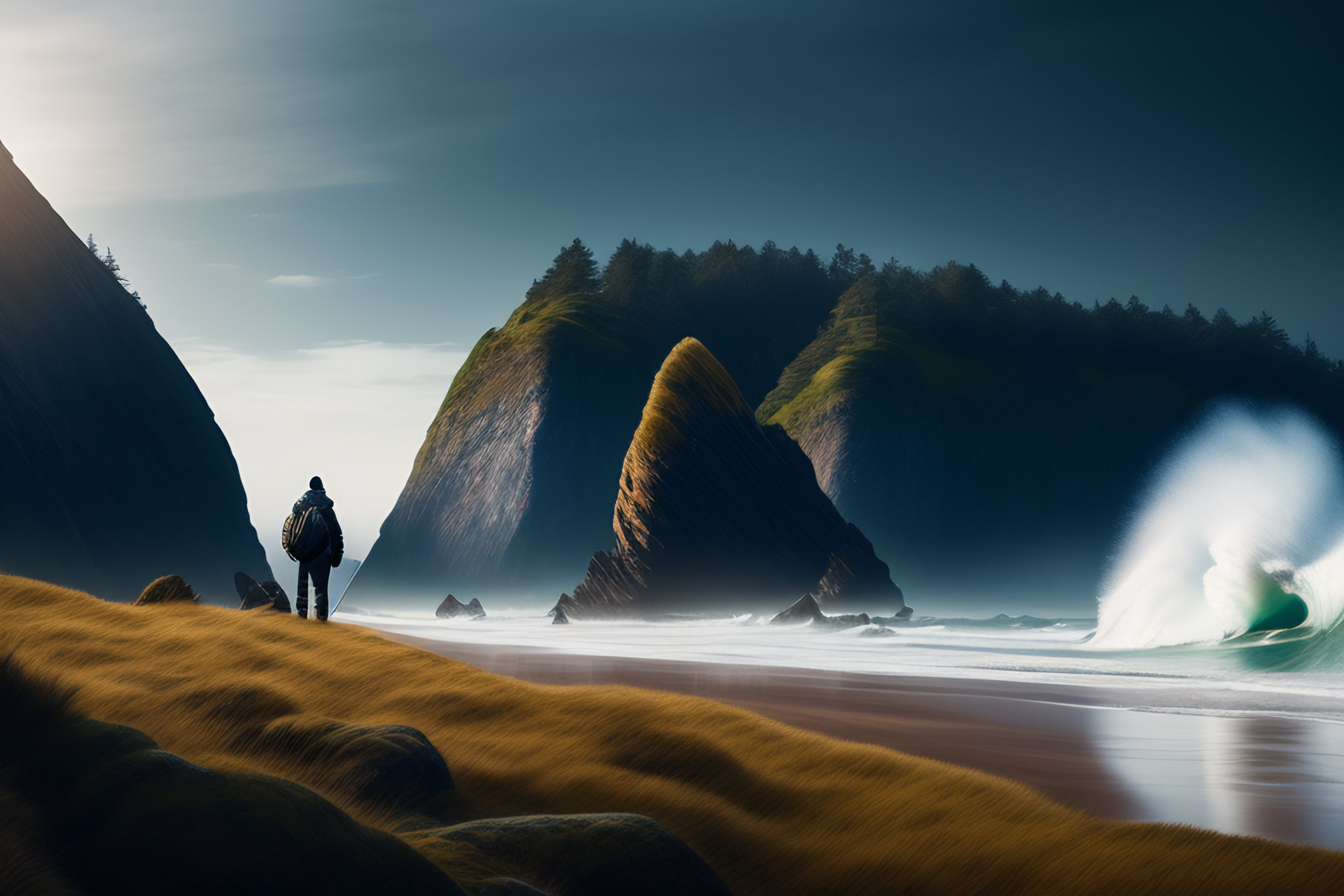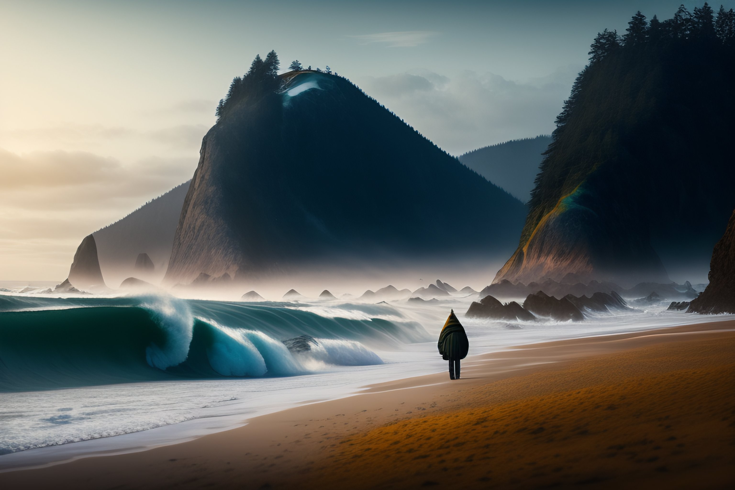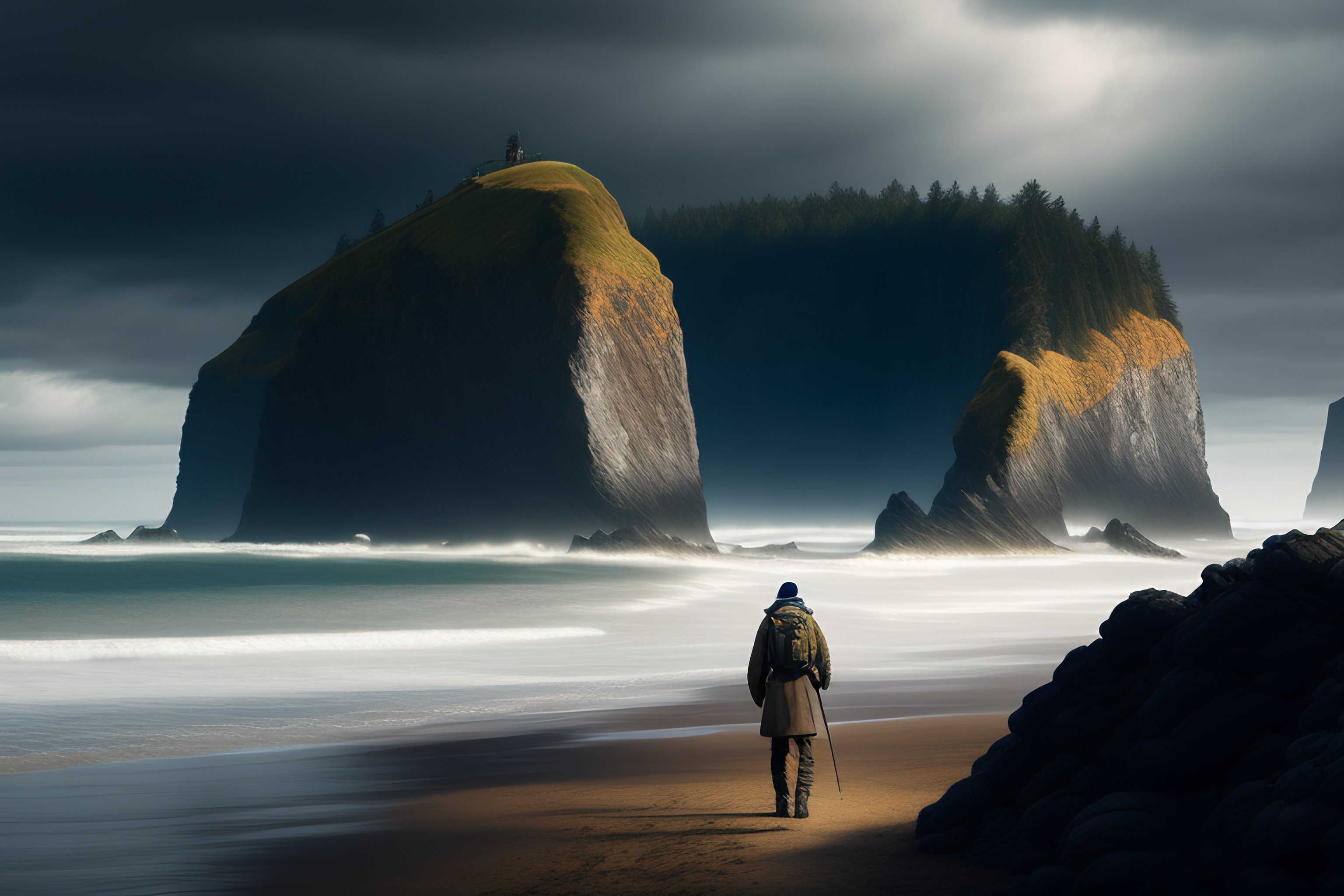 A beautiful and highly detailed matte painting of a single traveler wandering along the oregon coast, intricate details, epic scale, insanely complex, 8k, sharp focus, hyperrealism, very realistic, canvas, trending on arstatoin, cinematic lighting, by caspar friedrich, greg rutowski, james gurney, zeen chin, hans dahl, theodor kittelsen, hermann hendrich, national geographic, konstantin yakovlevich kryzhitsky