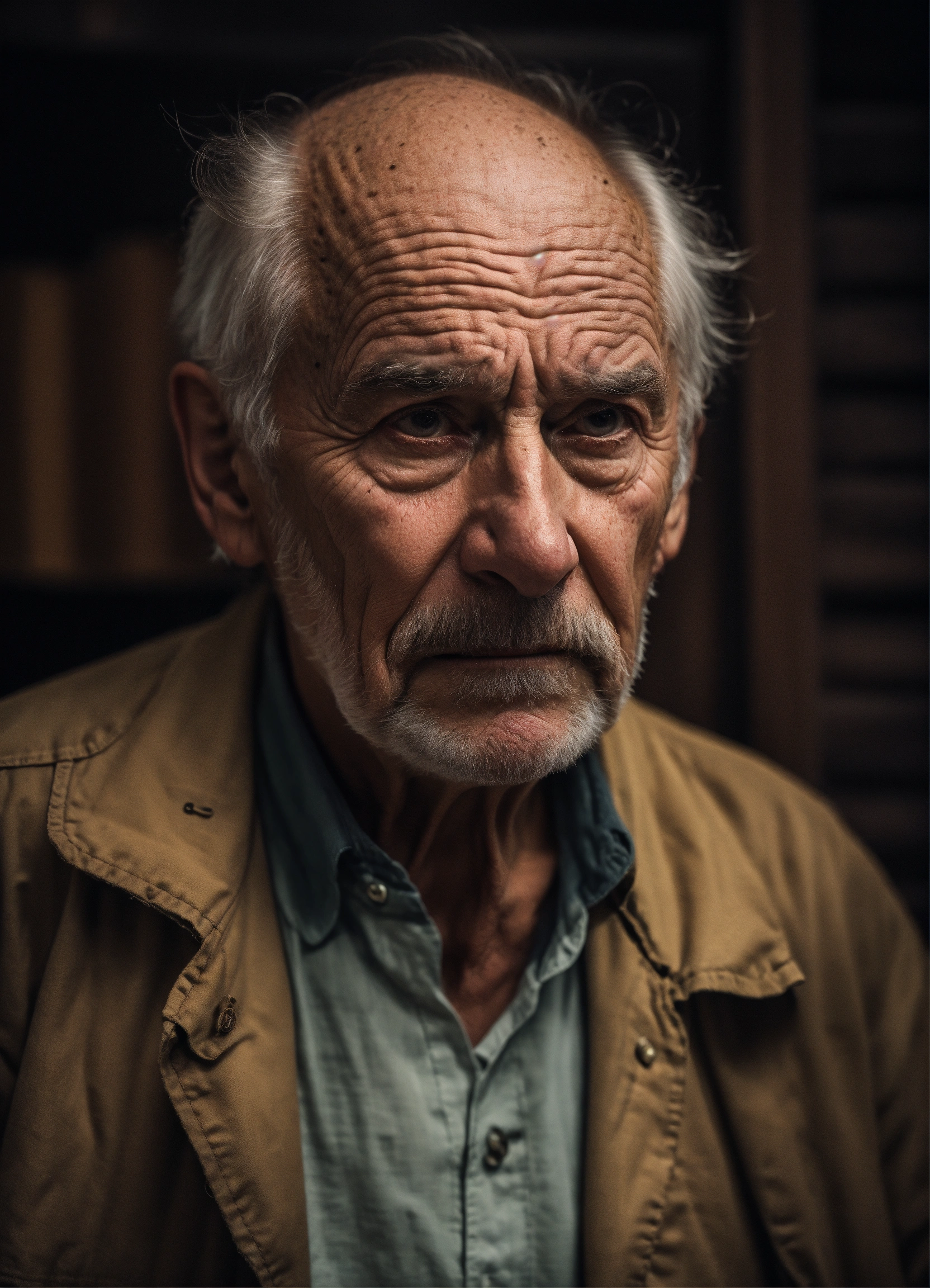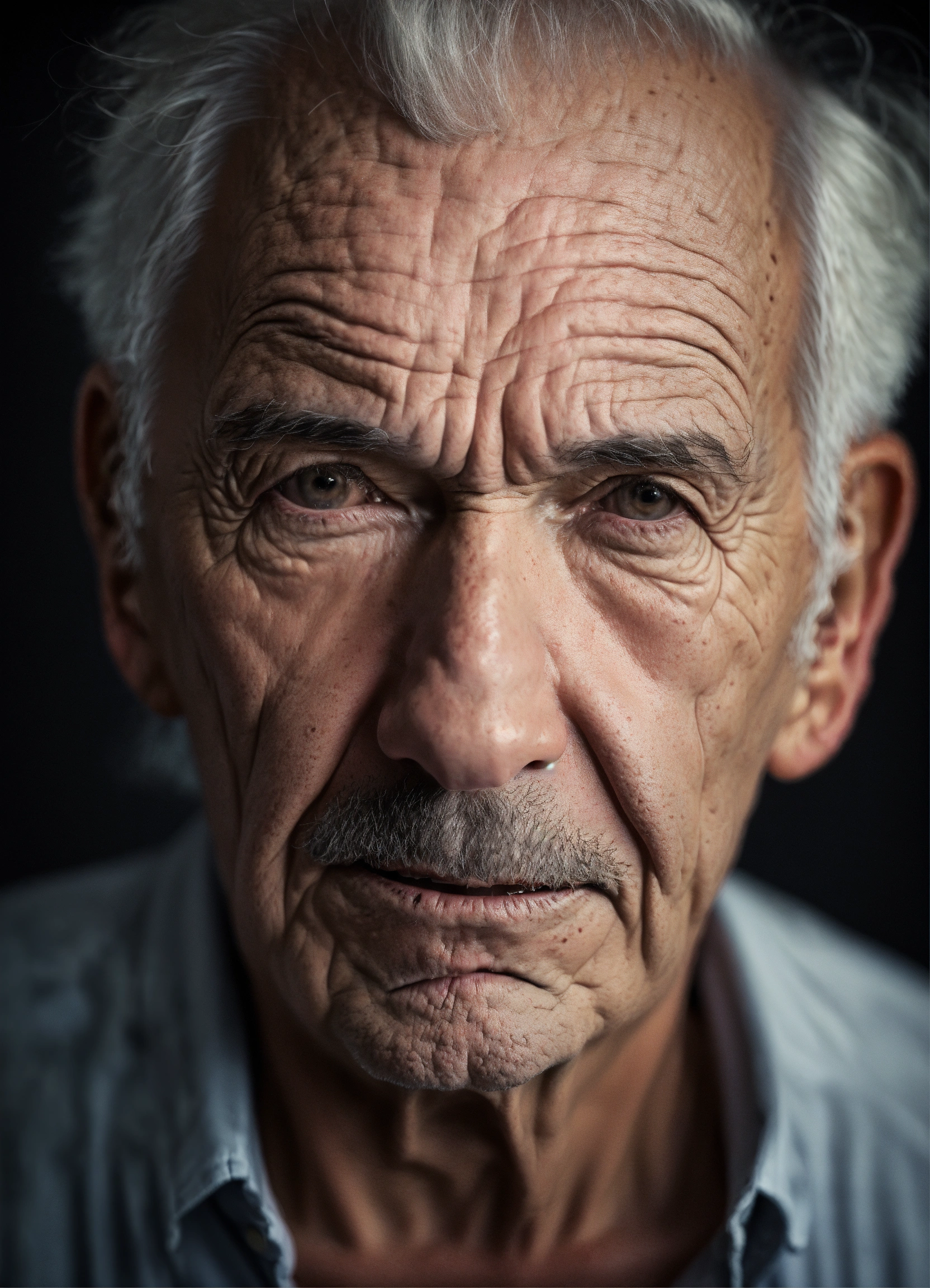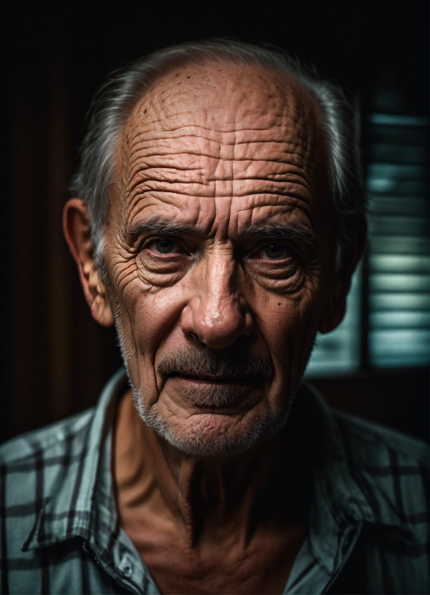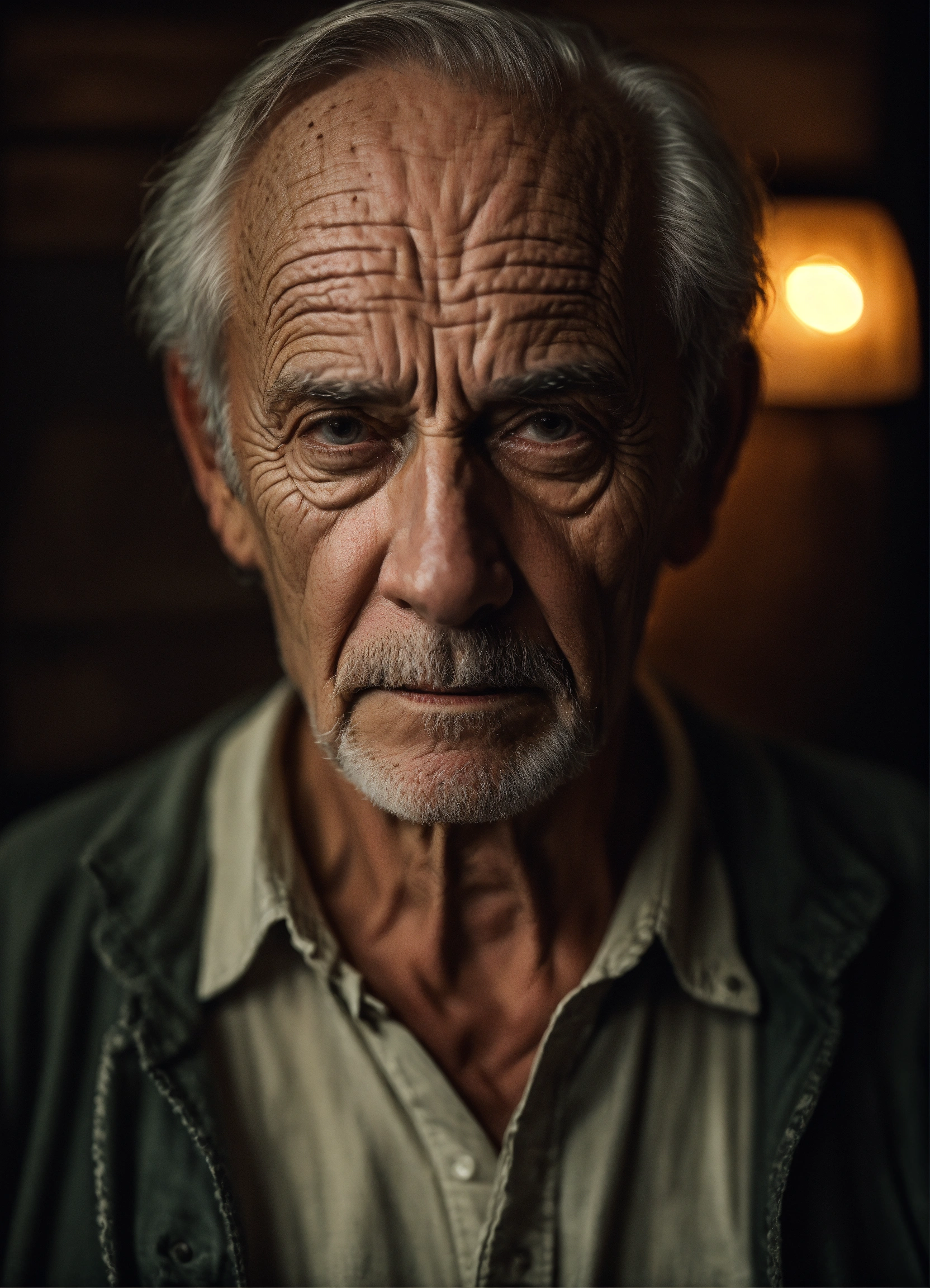 Portrait old scary american man, thinning hair, with wrinkles and dark circles telling a story, dark room background