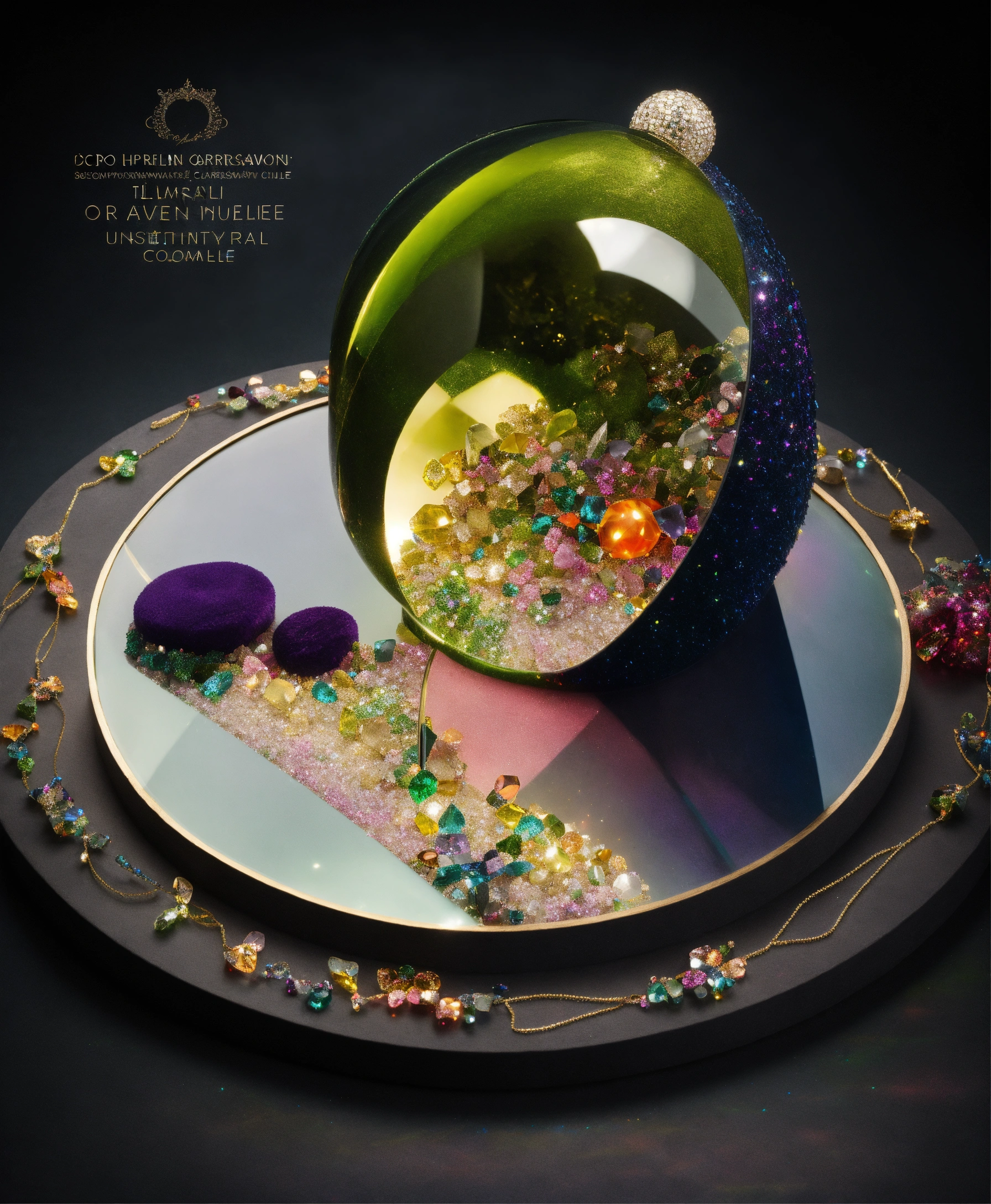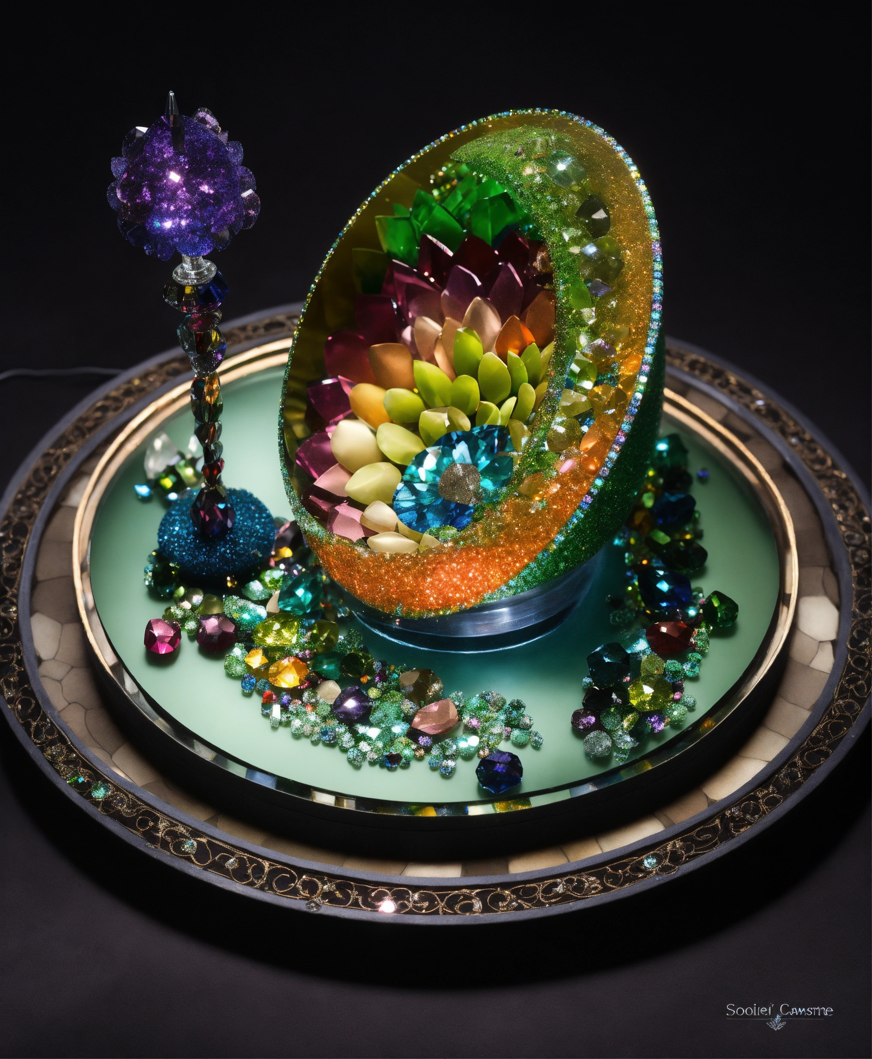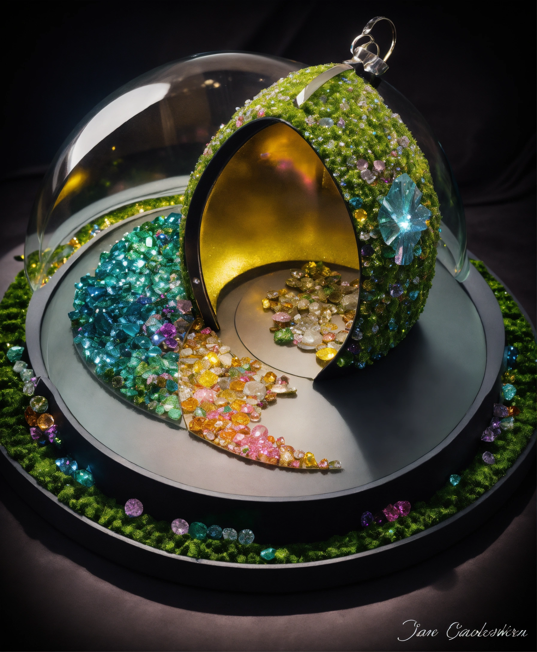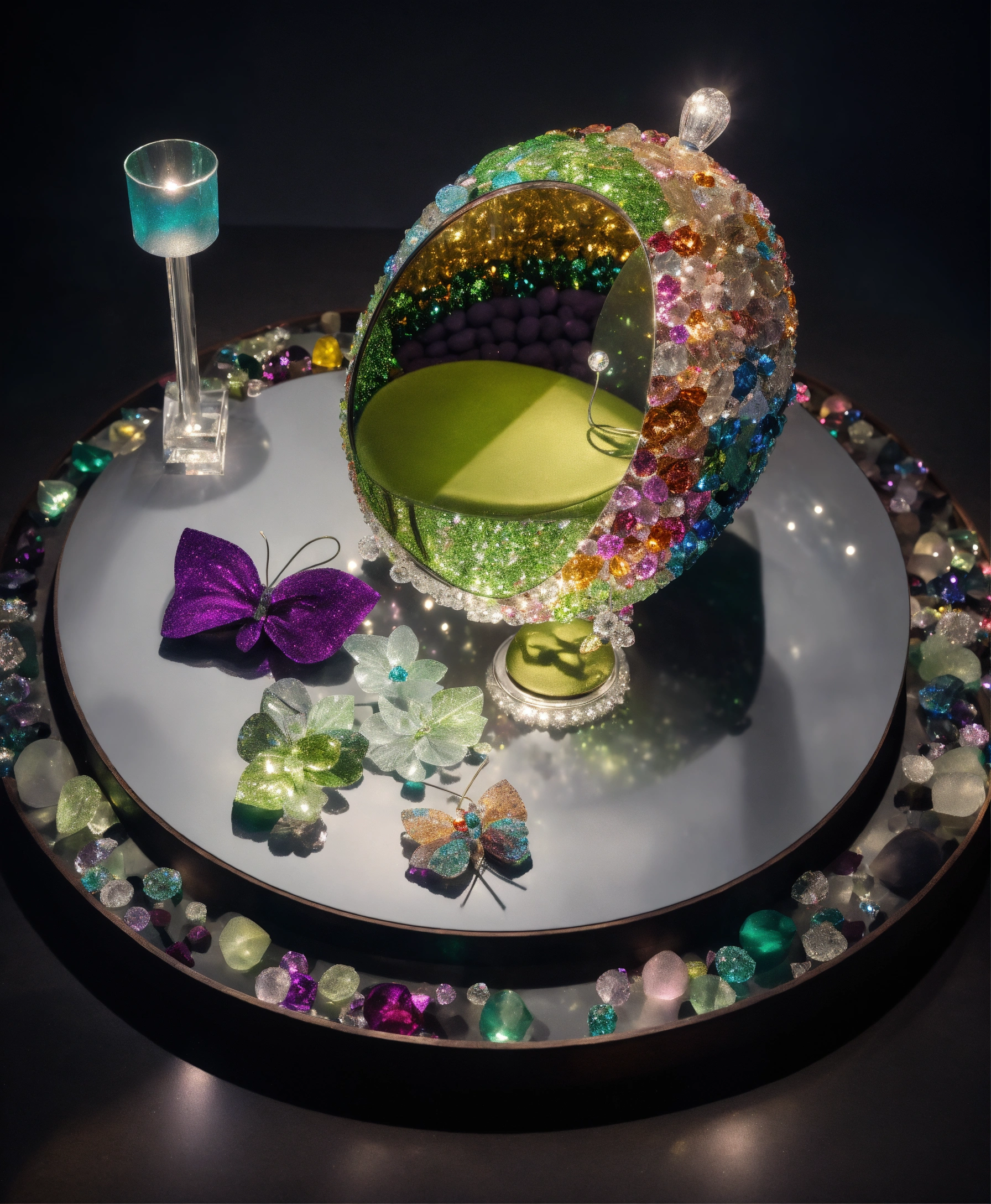 Strass swarovski, tim burton house, herbe verte en laine, lampe sous cloche en verre, socle rond, rendu 3d complexe hyper réaliste, ultra détaillé, details colorés, base en bois, design, color scheme, iridescent, pastel color, textured, intricate, 3d, highly detailed, deco style, laine cardée, brillant, soie, velour, organza, fourrure, strass swarovski