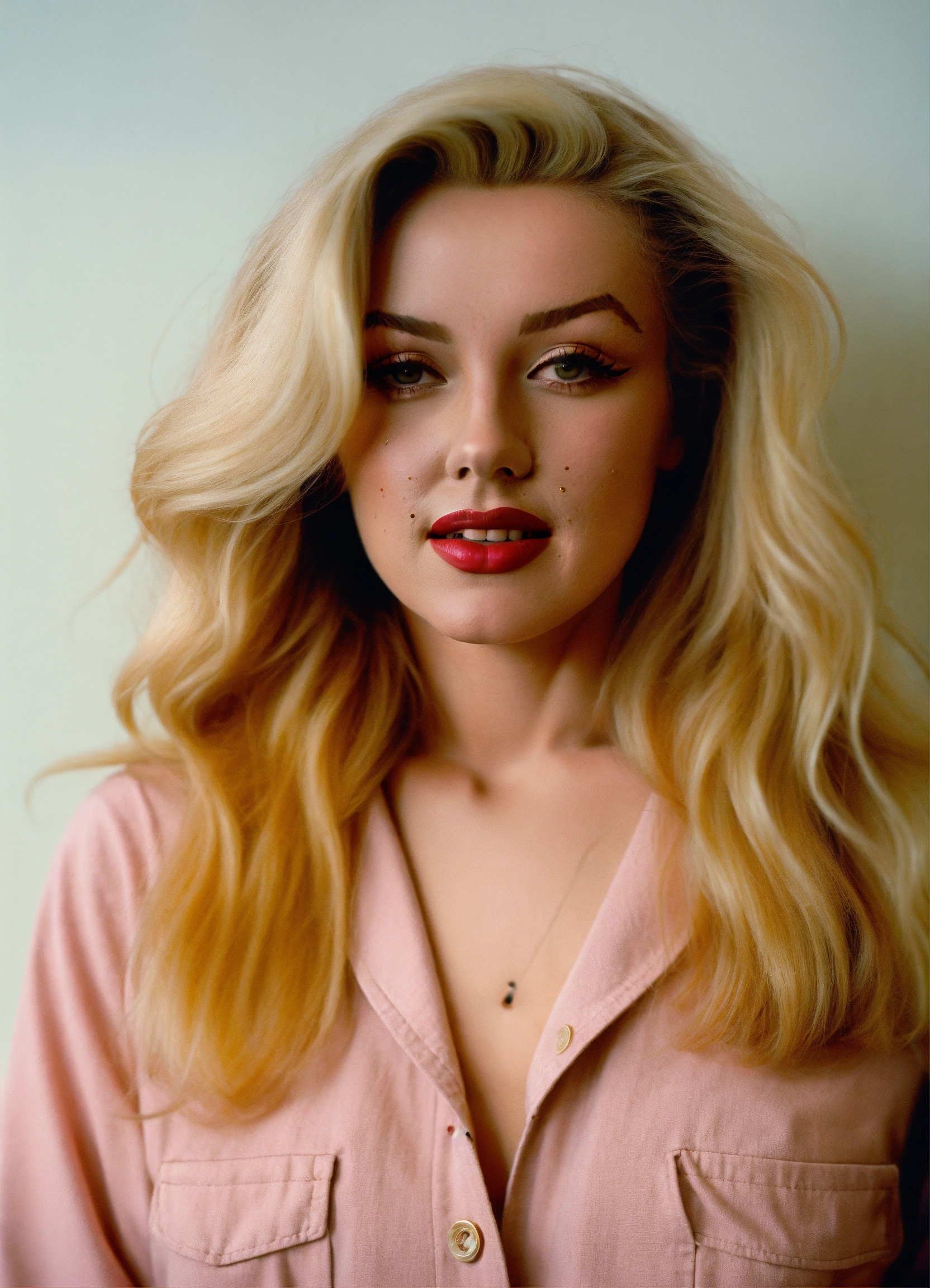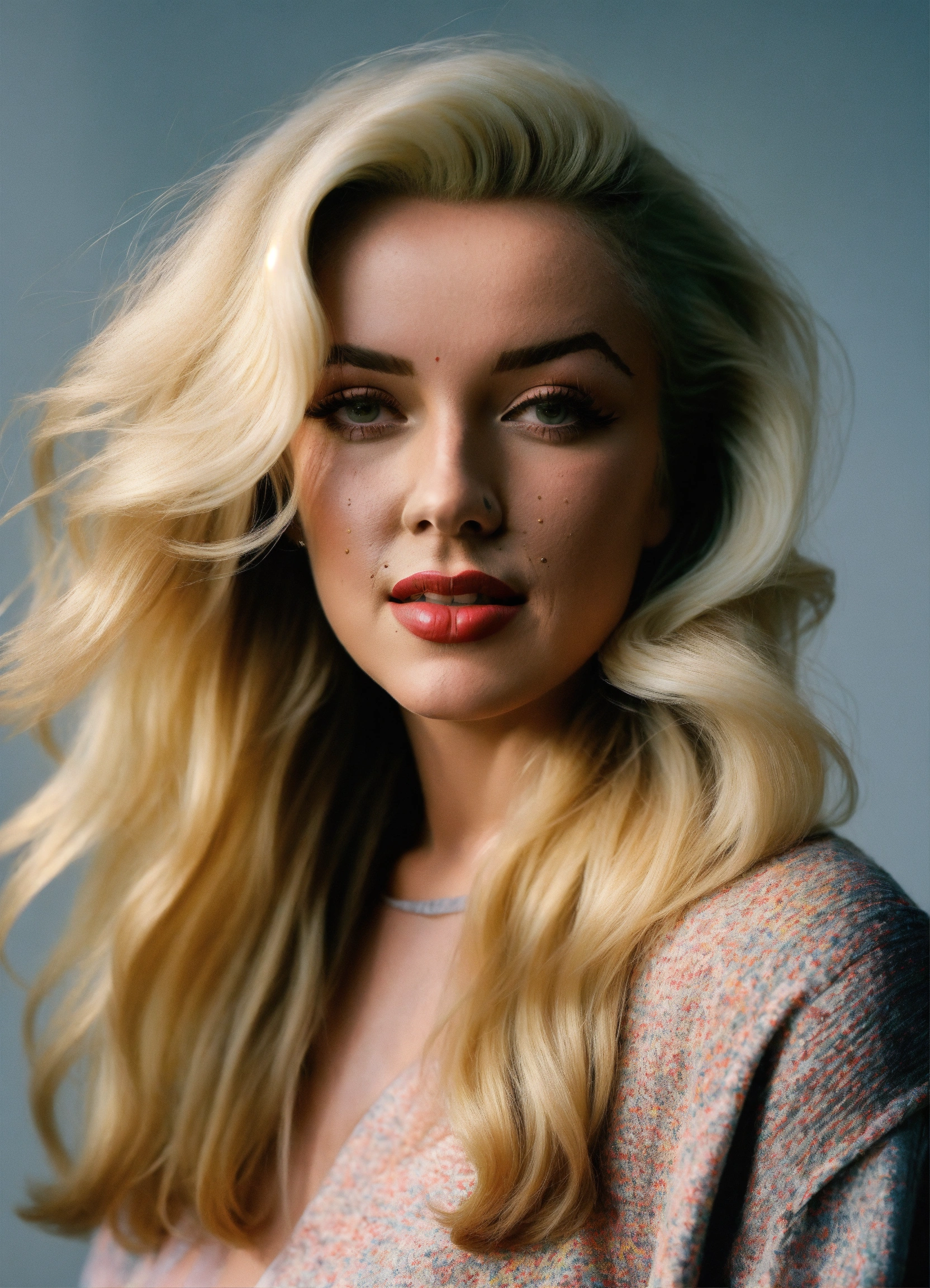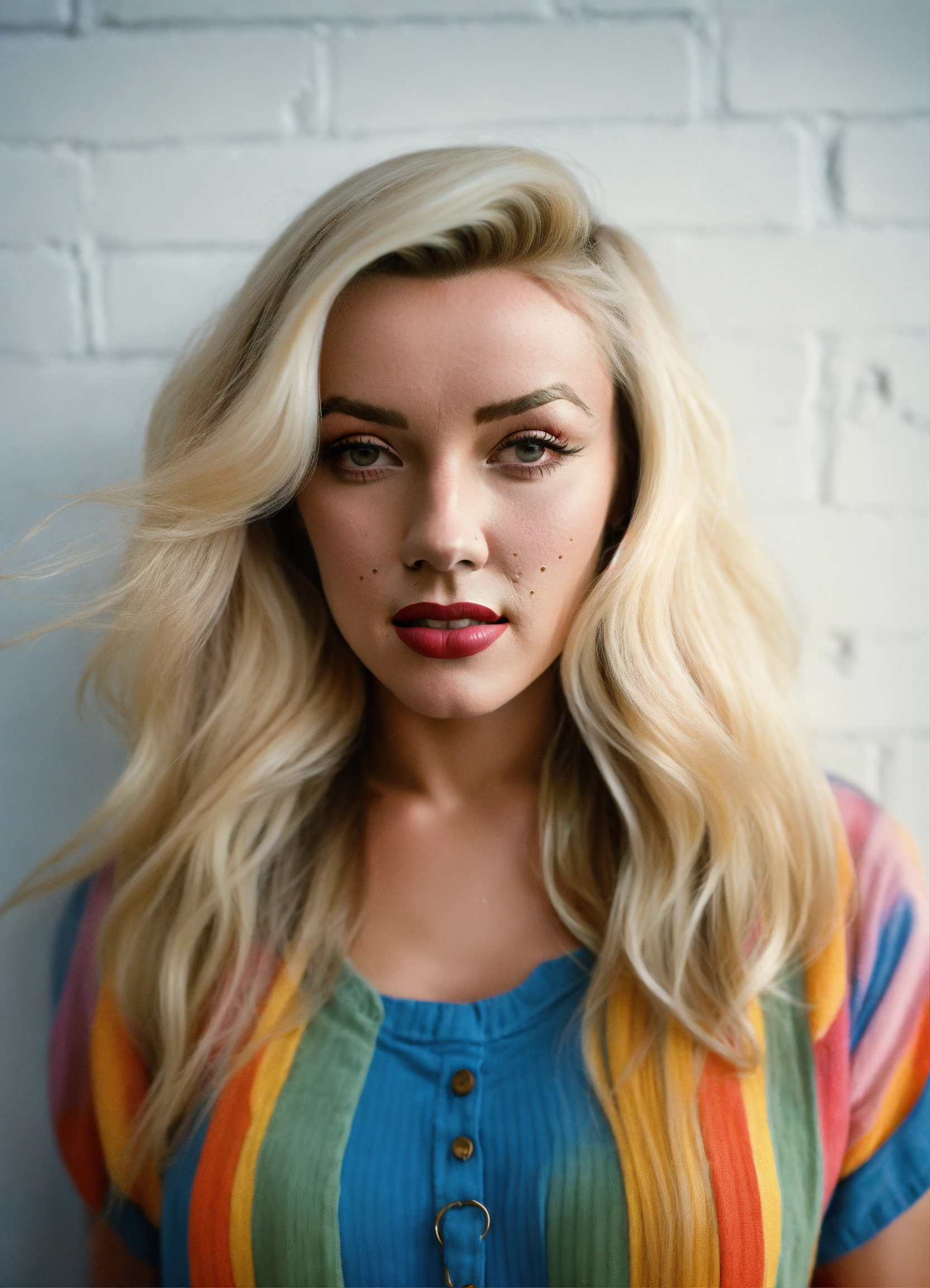 Portrait of marilyn monroe with ((long blond straight hair)) standing in front of a plain white wall, wearing casual clothes, fall vibes, blushed, looking at the camera, colorful scene, midshot, focus on face, professional photography, ultra sharp focus, tetradic colors