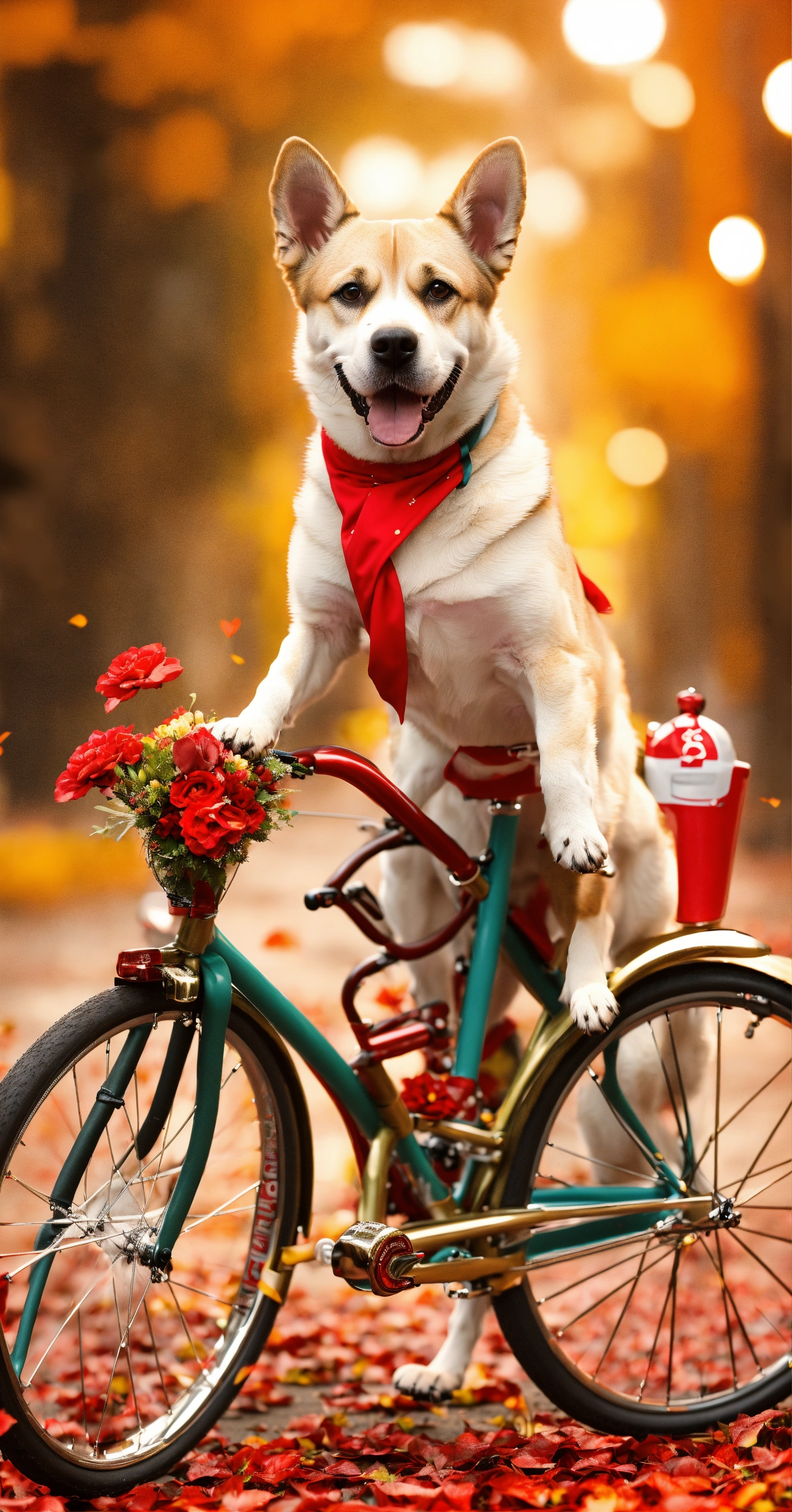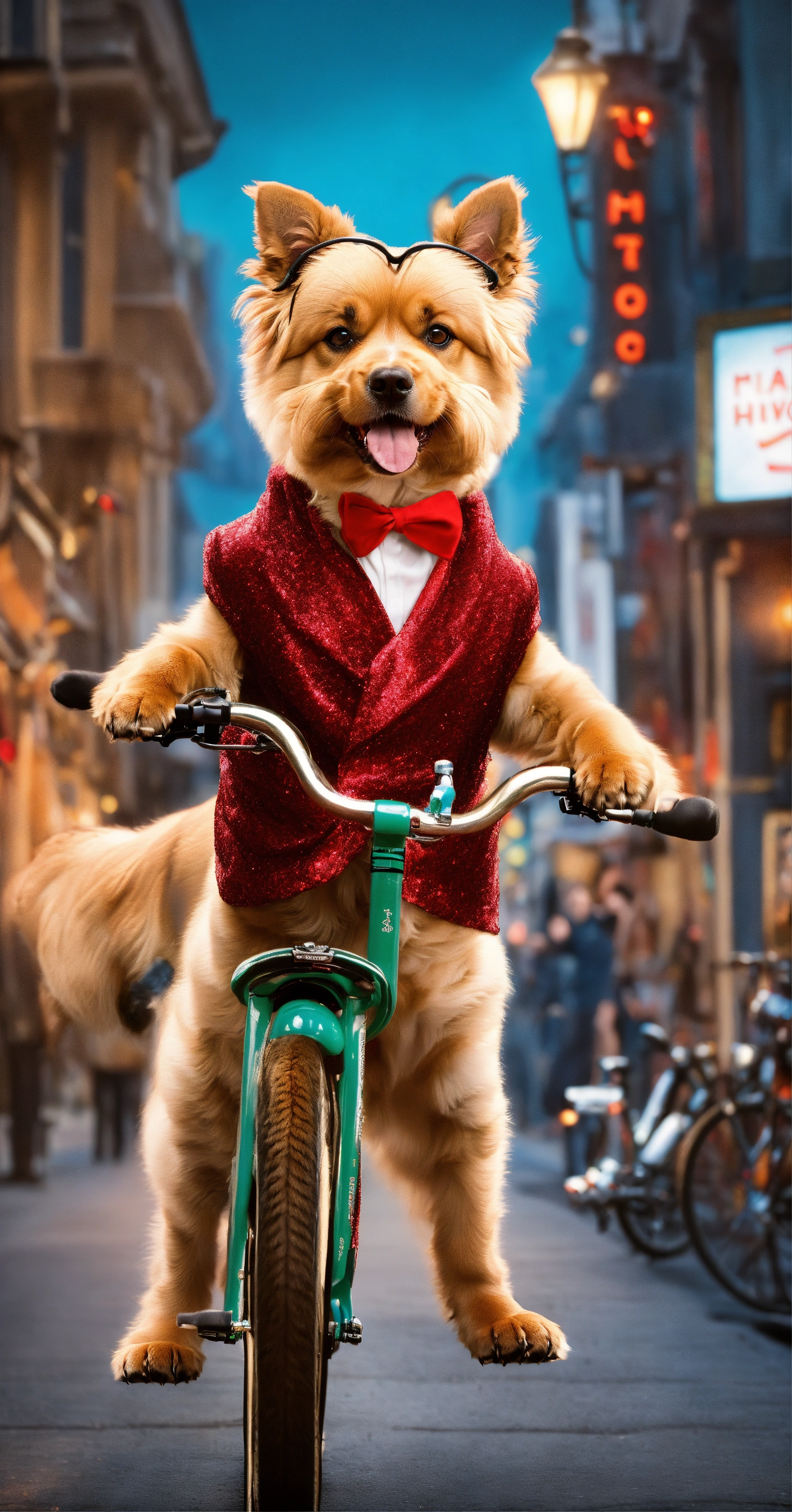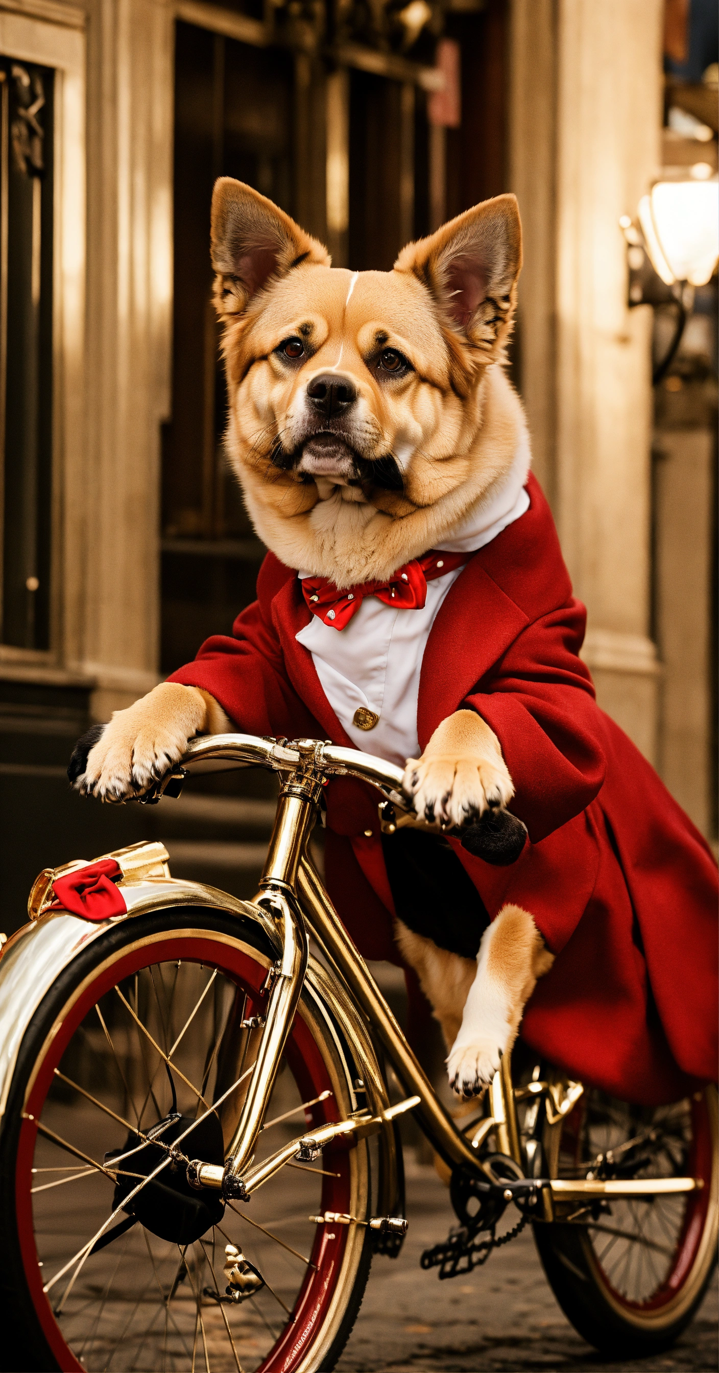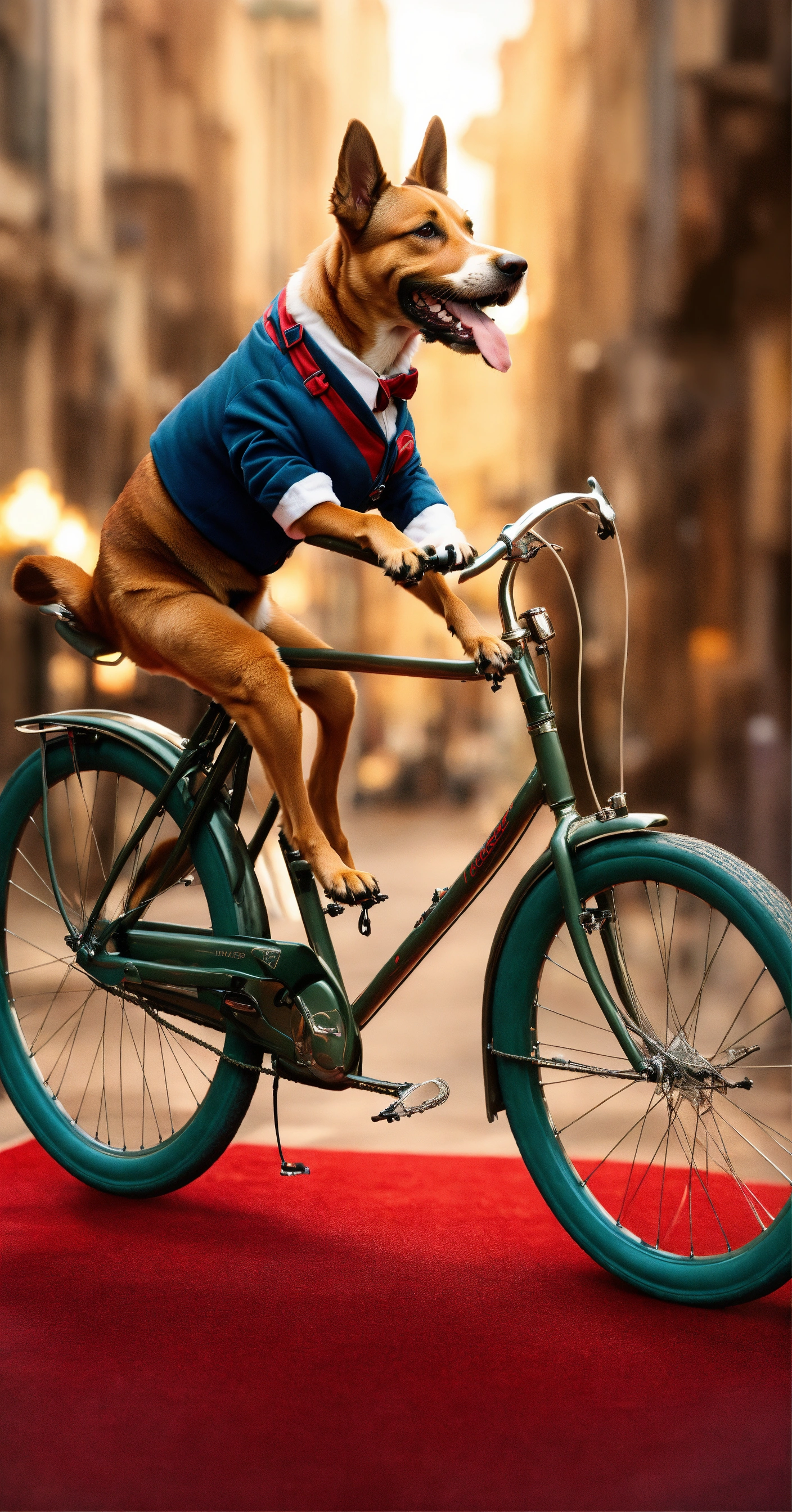 Create an image of a dog on a bicycle as a hollywood movie star, dressed in glamorous attire with a tiny red carpet leading to the bike.