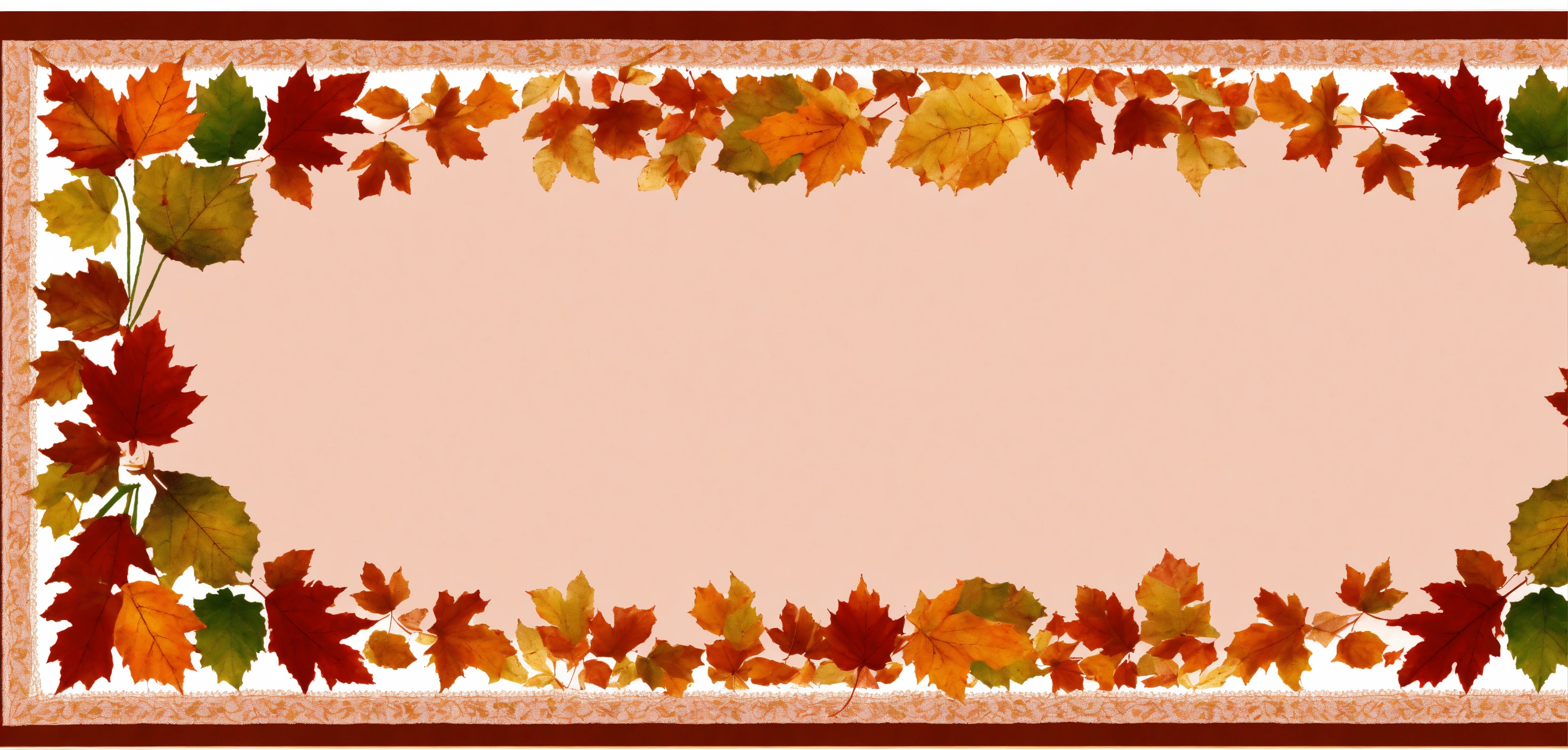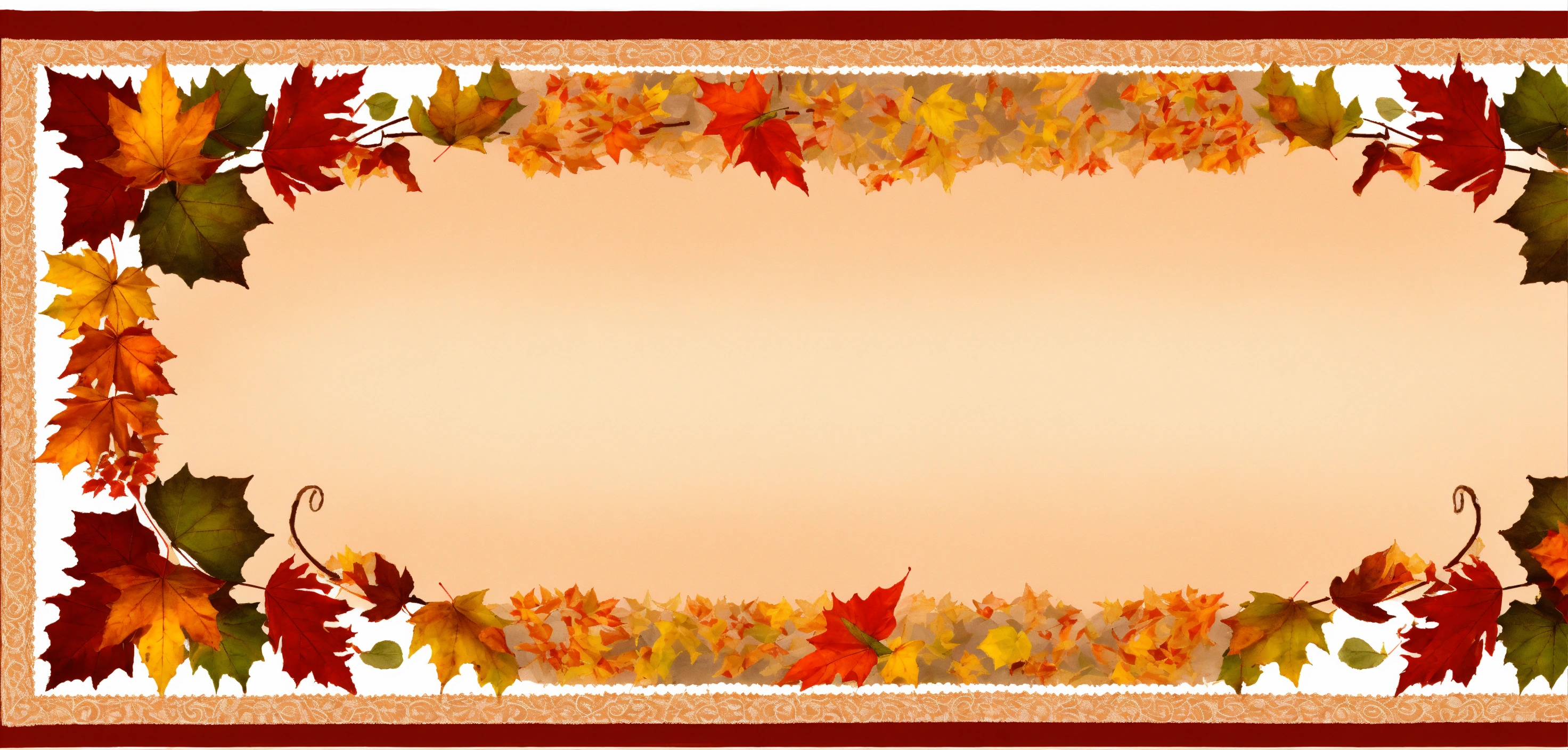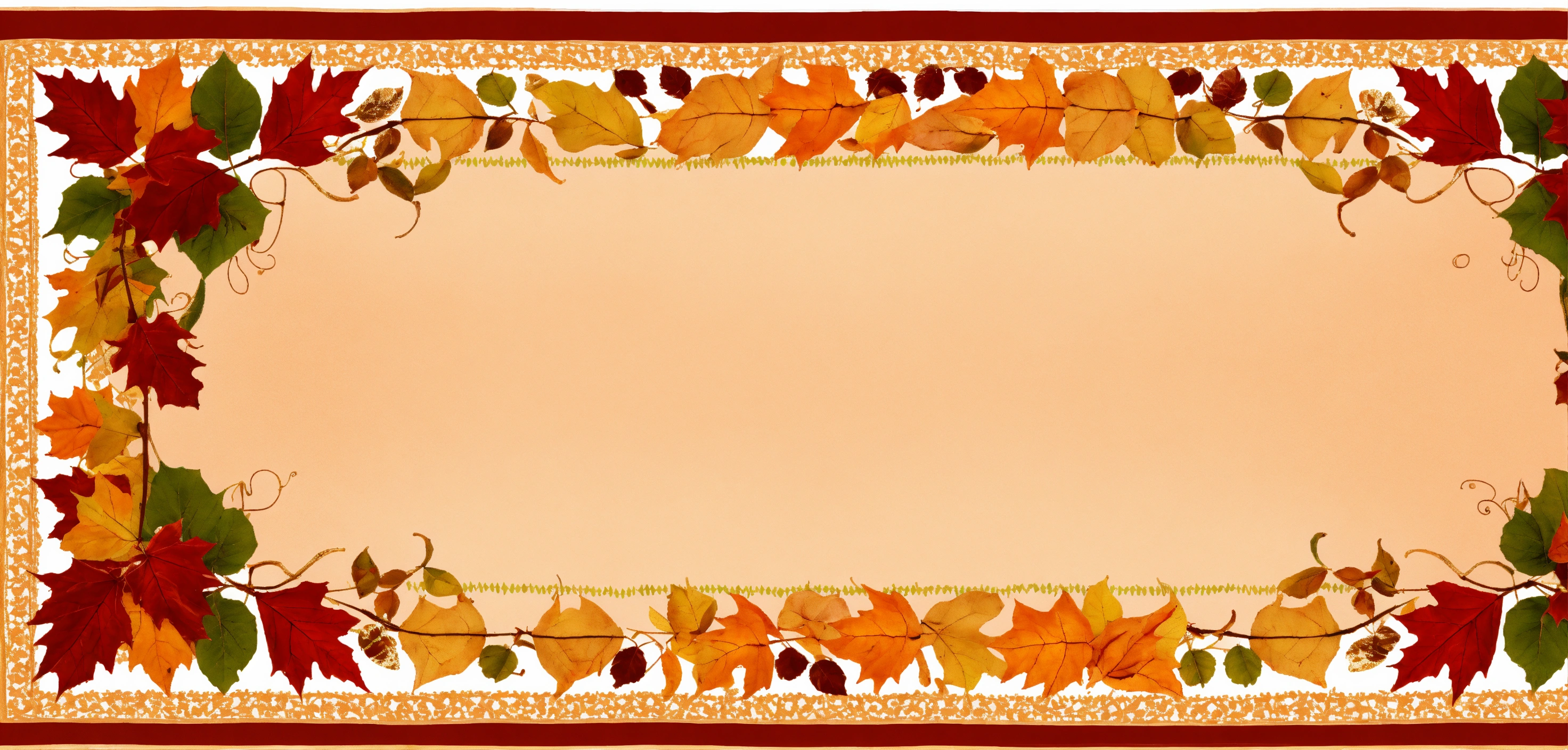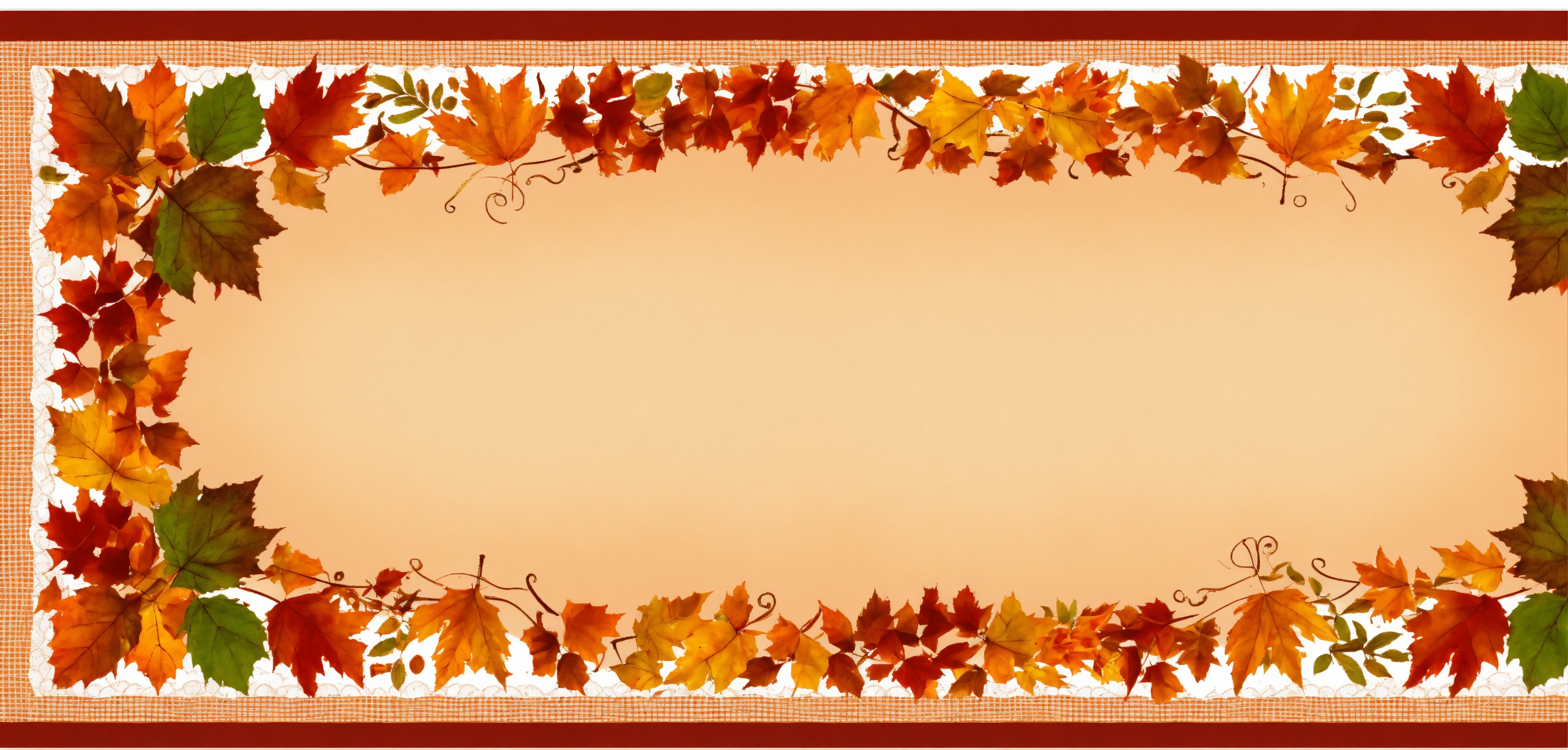 Illustrate an oblong tablecloth with an oblong center panel with a tan lacy design. draw 2 pretty borders. border 2 is filled with many small orange, red, and gold autumn leaves. orange and brown, gingham border lined with a pretty scrolling design. border 1 is a combination of autumn colors. symmetry on all sides. green and orange, gold, and red.