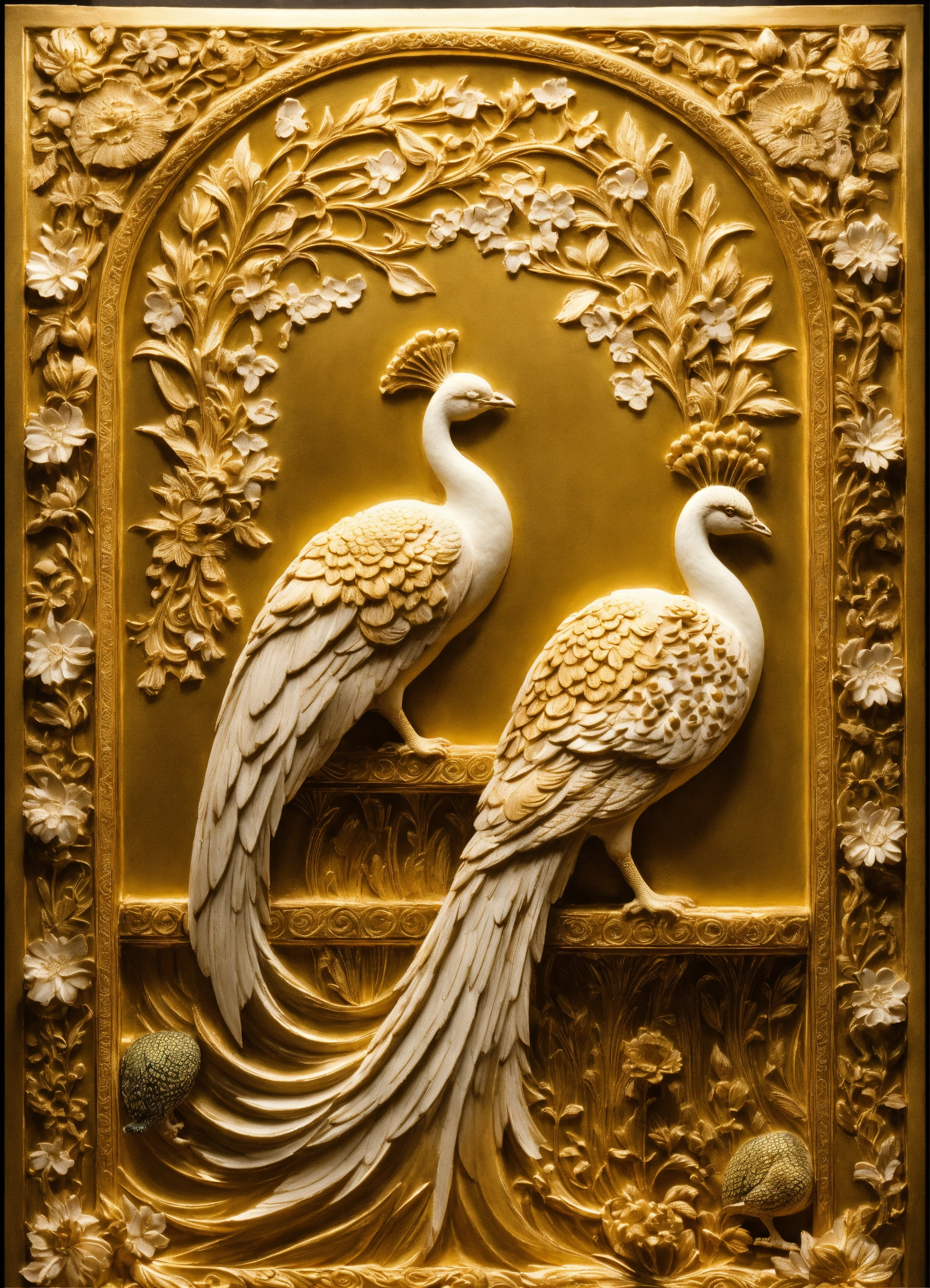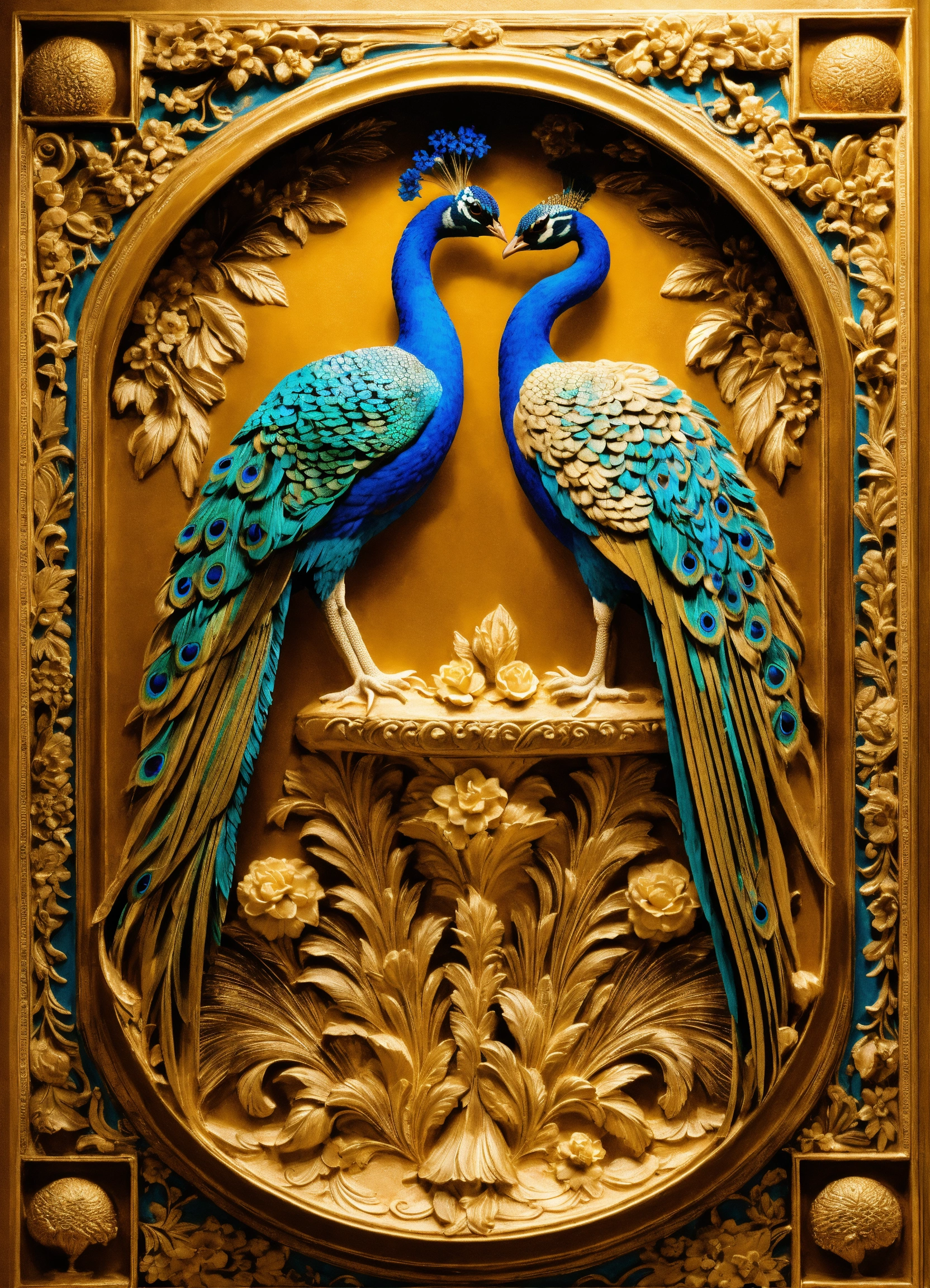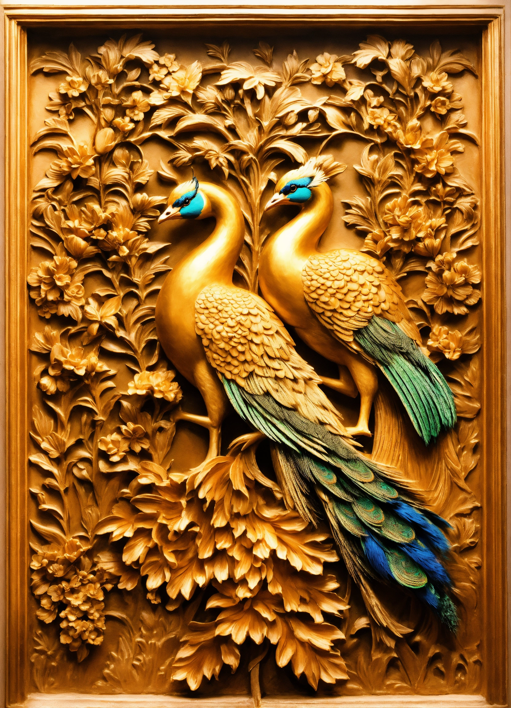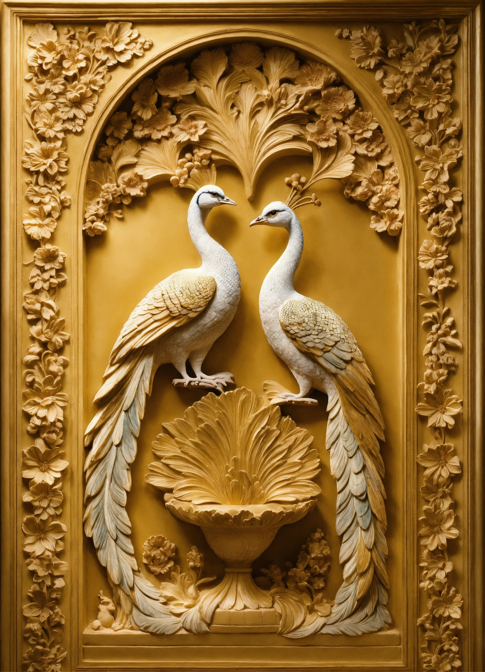 Similar, relief, plaster, 4k, volume, high detail, sculpture, plants, the background is white, smooth, gypsum, bas-relief, center, decorative pattern, classical ornament, motif, symmetry, flowers, buds, blooming buds, highly detailed volumetric plaster work, exotic flowers, bas-relief of flowers, painting, beautiful composition, peacock with an open tail, a pair of peacocks, female and male, love, peacocks in love, the golden ratio, the big picture, the open tail is beautiful https//lexica.art/prompt/2e12efa7-6d40-4435-a2c8-755f63555e81