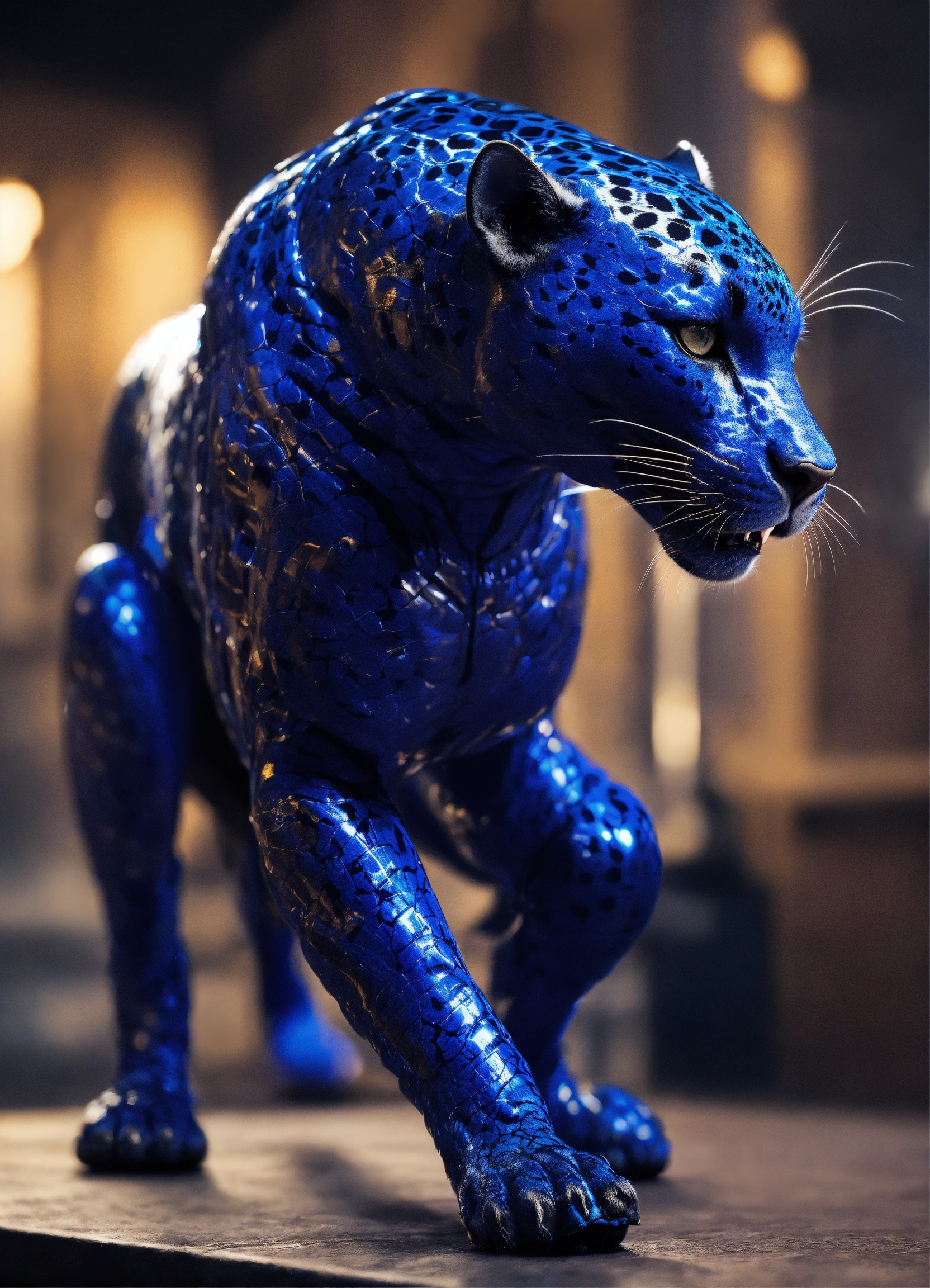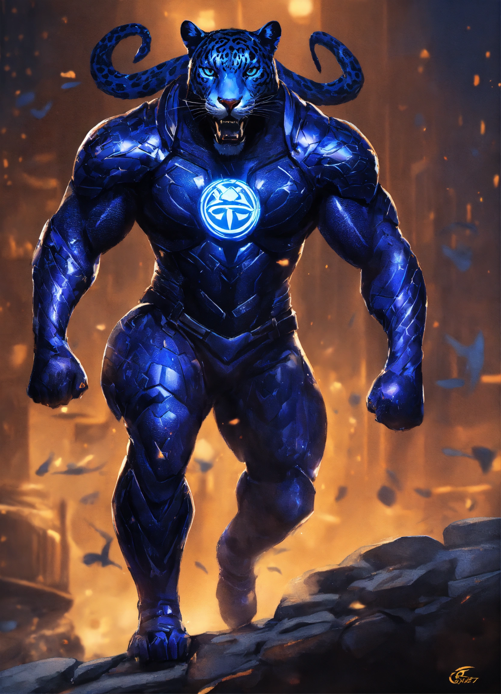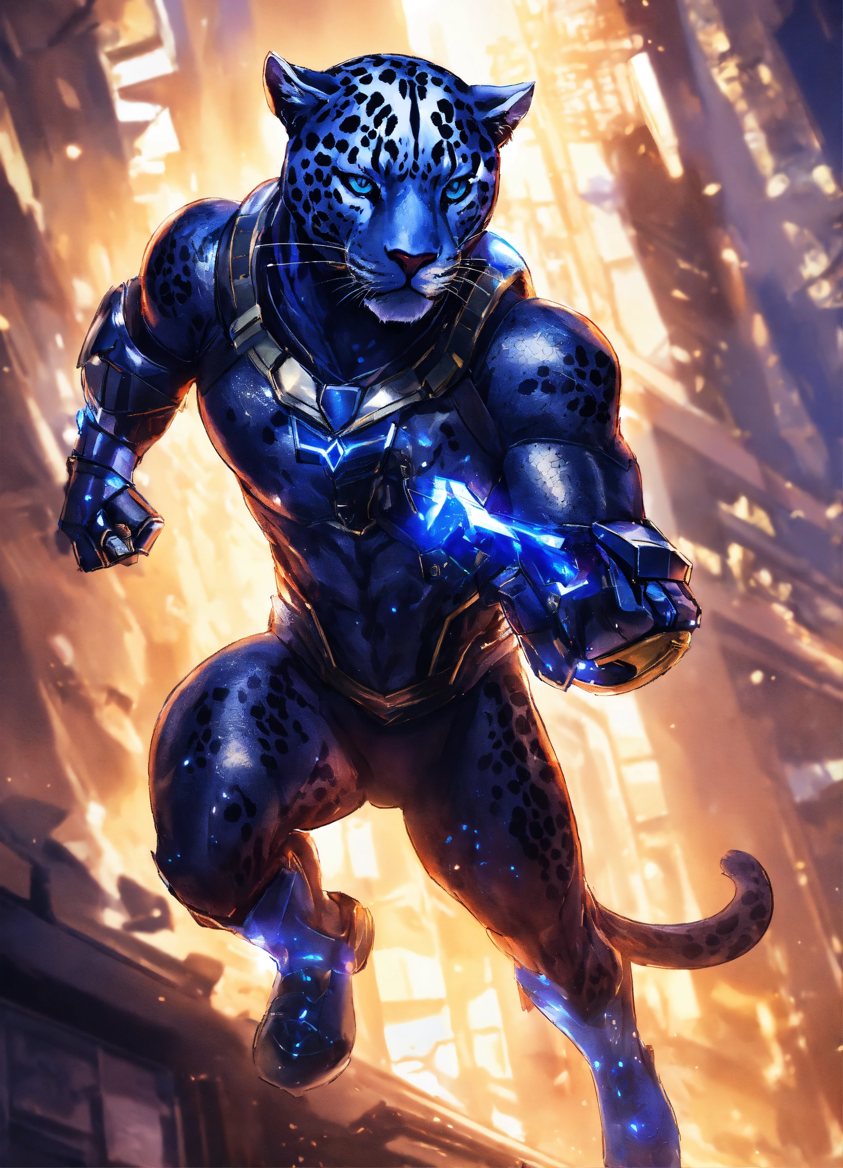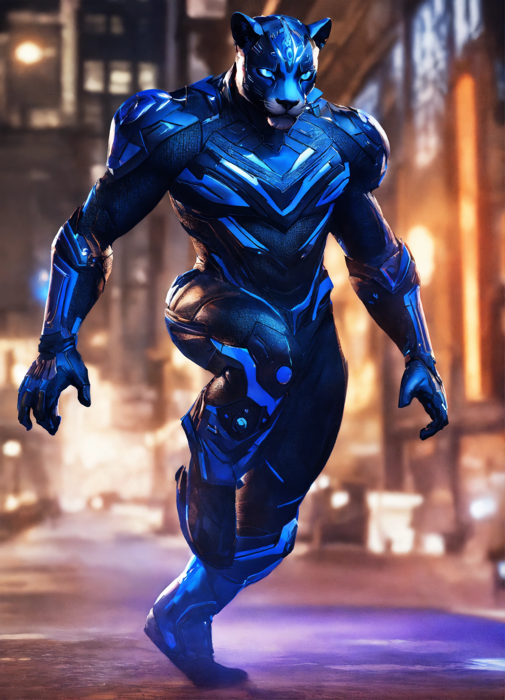 Realistic illustration art, ink, night jaguar's superpowers are, enhanced physical prowess, advanced ai technology, superhuman senses, superhuman senses, acrobatics and martial arts, night jaguar's costume vibranium suit, is a sleek and technologically advanced outfit, featuring the dark, cobalt blue hues of the jaguar with periwinkle accents. his emblem is a fierce jaguar head, symbolizing his connection to the animal kingdom and his role as a protector --ar 916 --v5.2 --seed 77767