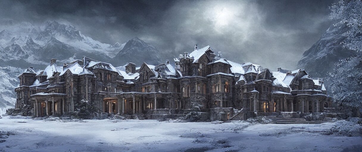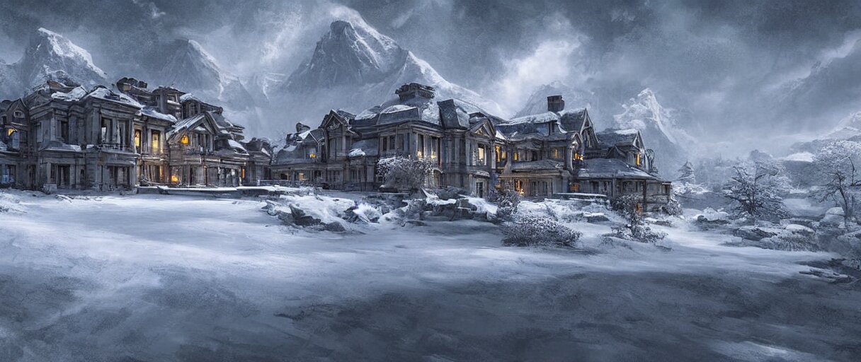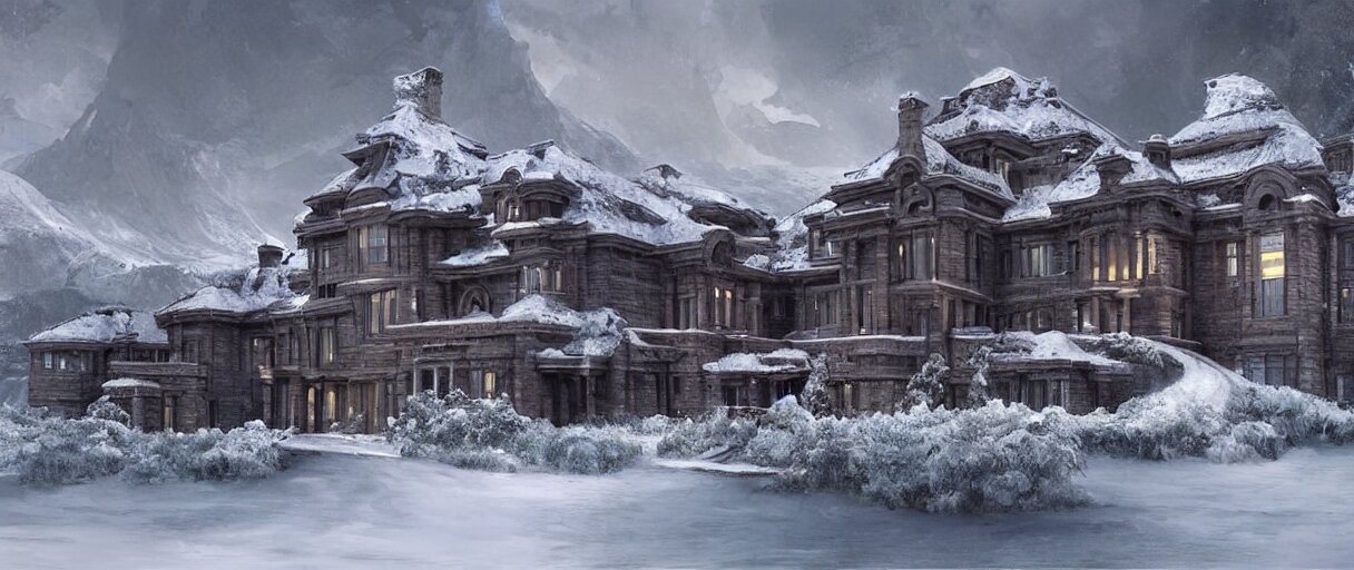 “sci-fi concept art of a mansion in the snow. canadian countryside. mountains. lake. hills. matte painting, realistic, high detail, 4k”