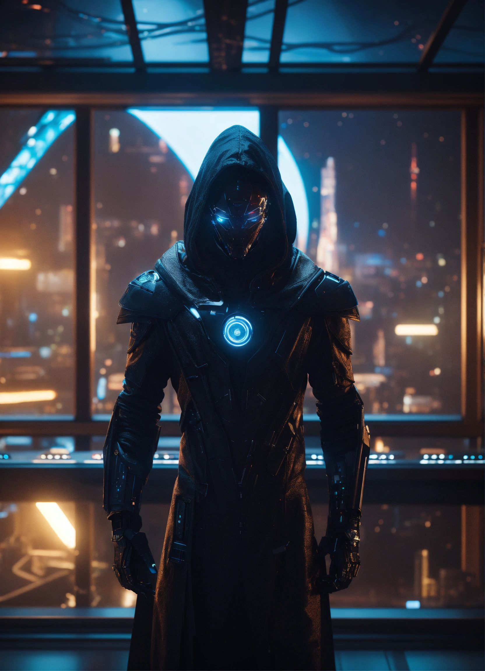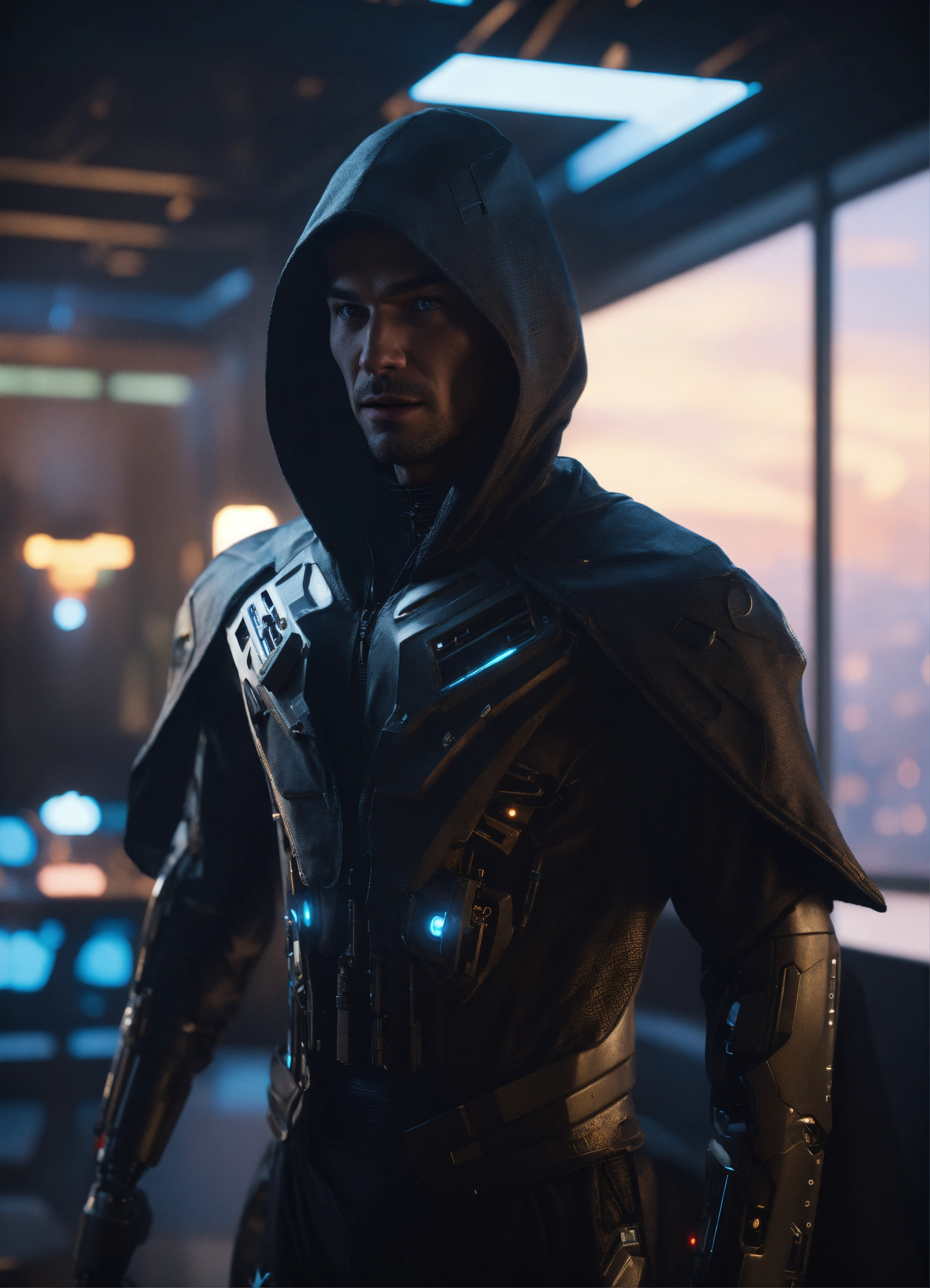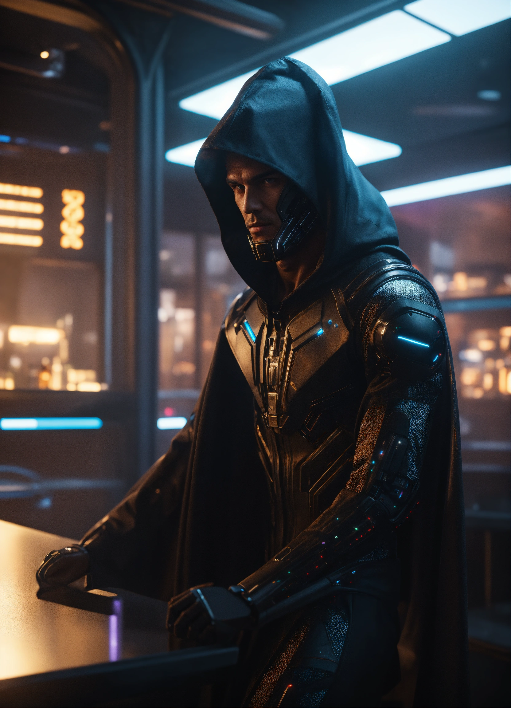 Male alien mutant half cyborg wearing a hood, wearing a futuristic black clothing and cape, by a window in a futuristic space port bar, 8k, unreal engine