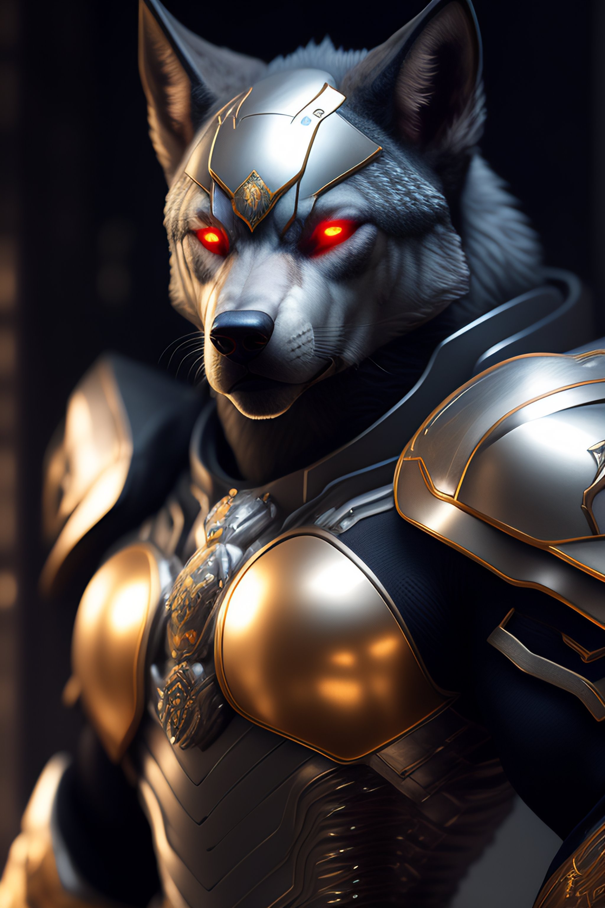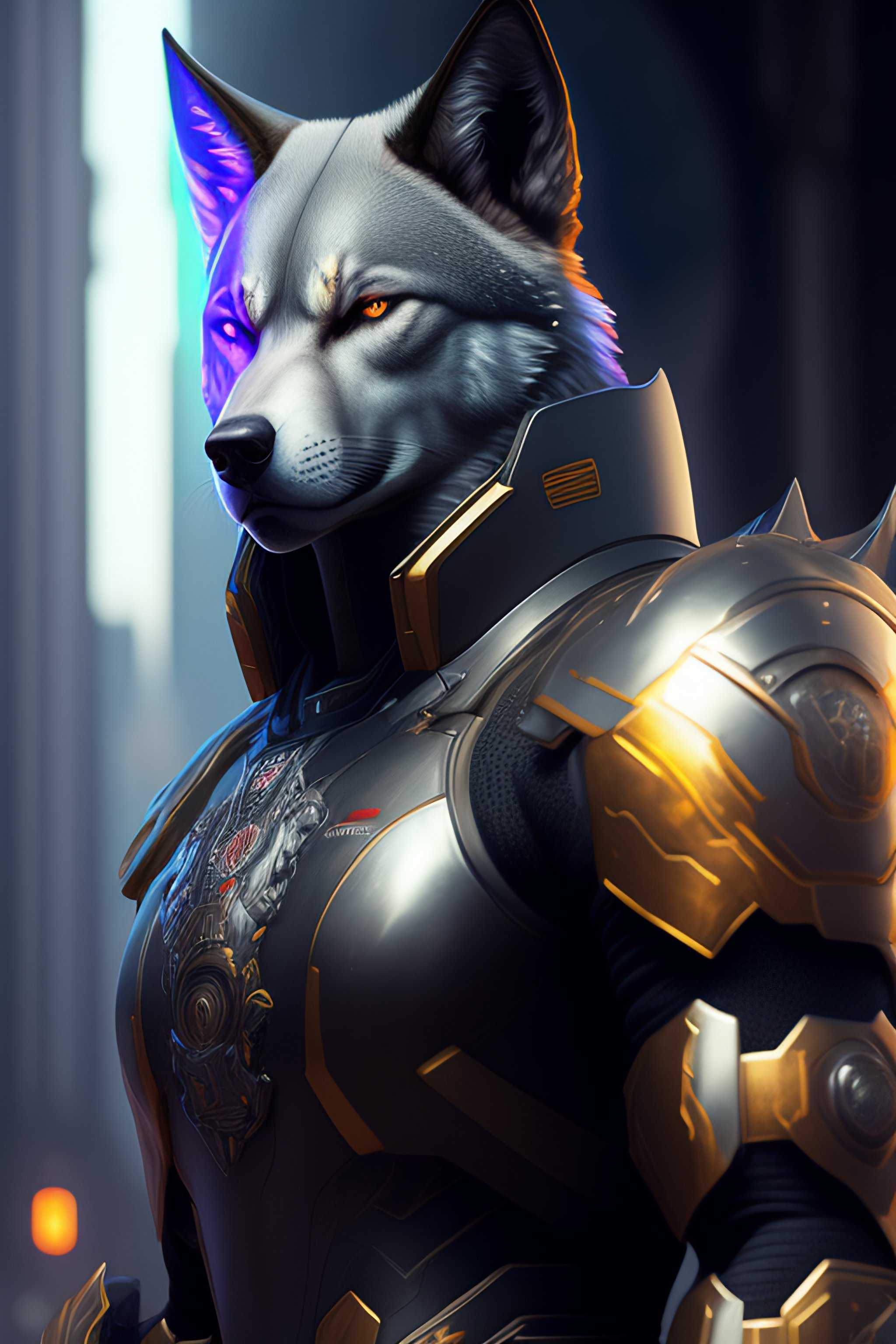 Portrait painting of a cybernetic grey werewolf with power armor, ultra realistic, cyberpunk, concept art, intricate details, eerie, highly detailed, photorealistic, octane render, 8 k, unreal engine. art by artgerm and greg rutkowski and alphonse mucha