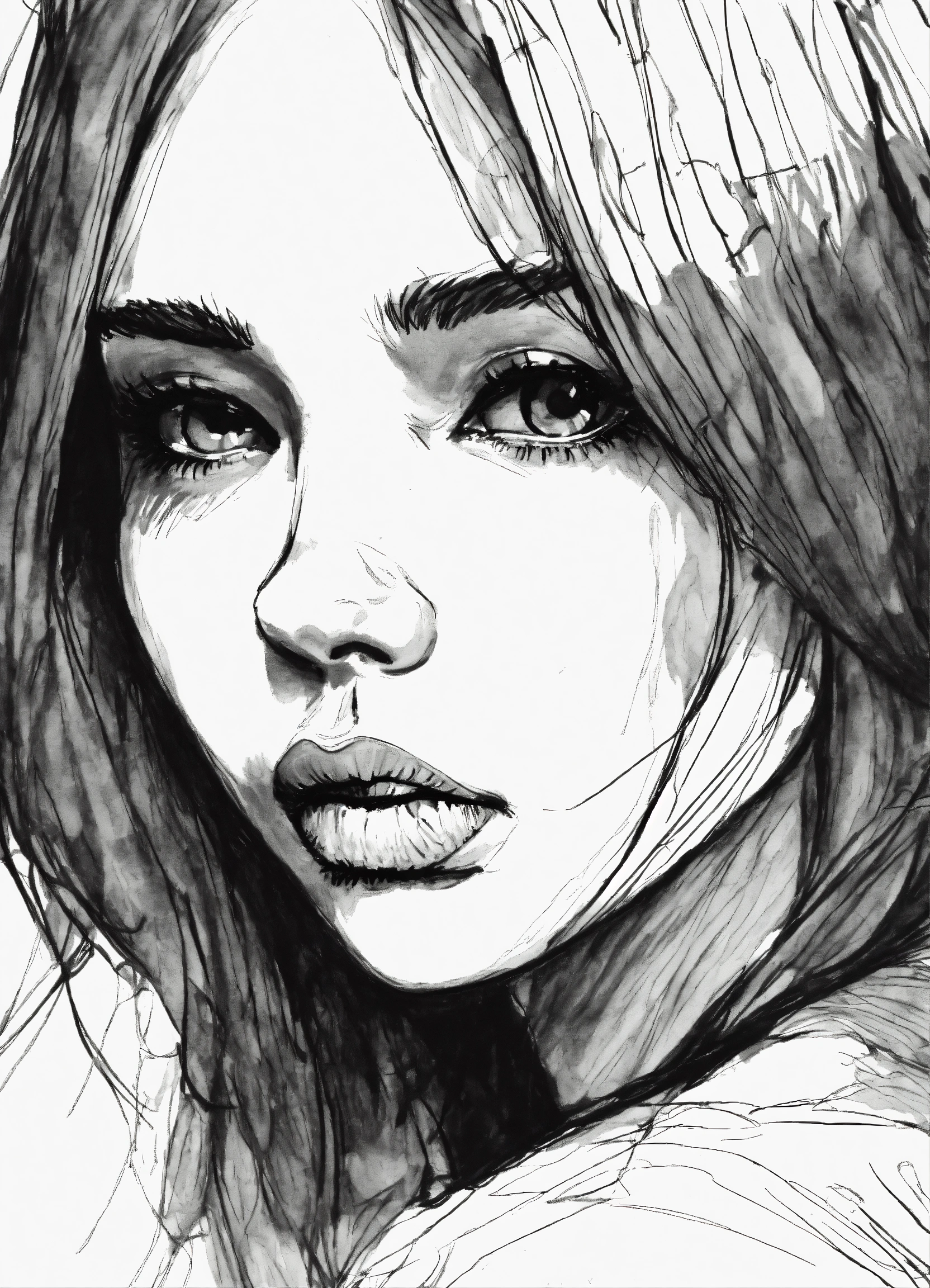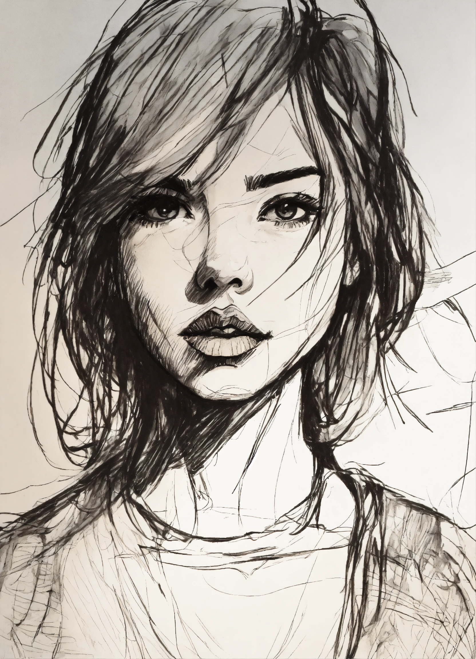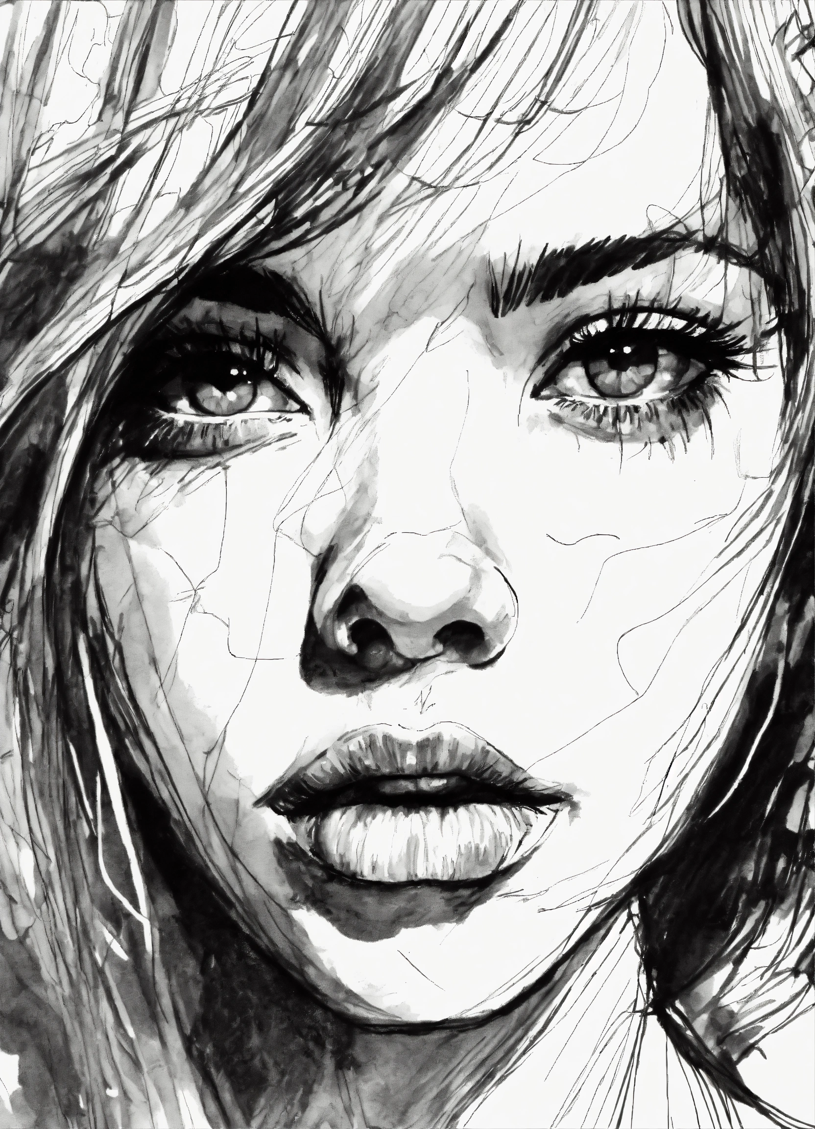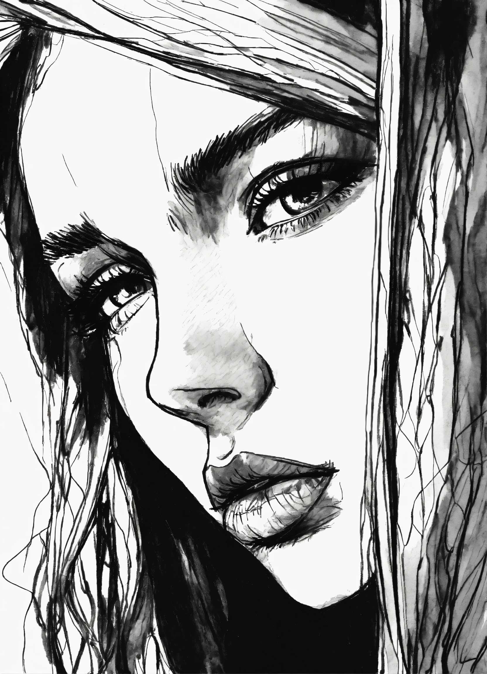 Scratchy pen strokes, blind contour, fisheye perspective closeup, beautiful girl, s face in darkness, stark hatch shaded sketchy scribbly, ink, strong angular shapes, woodcut shading, pen strokes, pouty lips, hungry eyes, minimalist realistic, anime proportions, distorted perspective