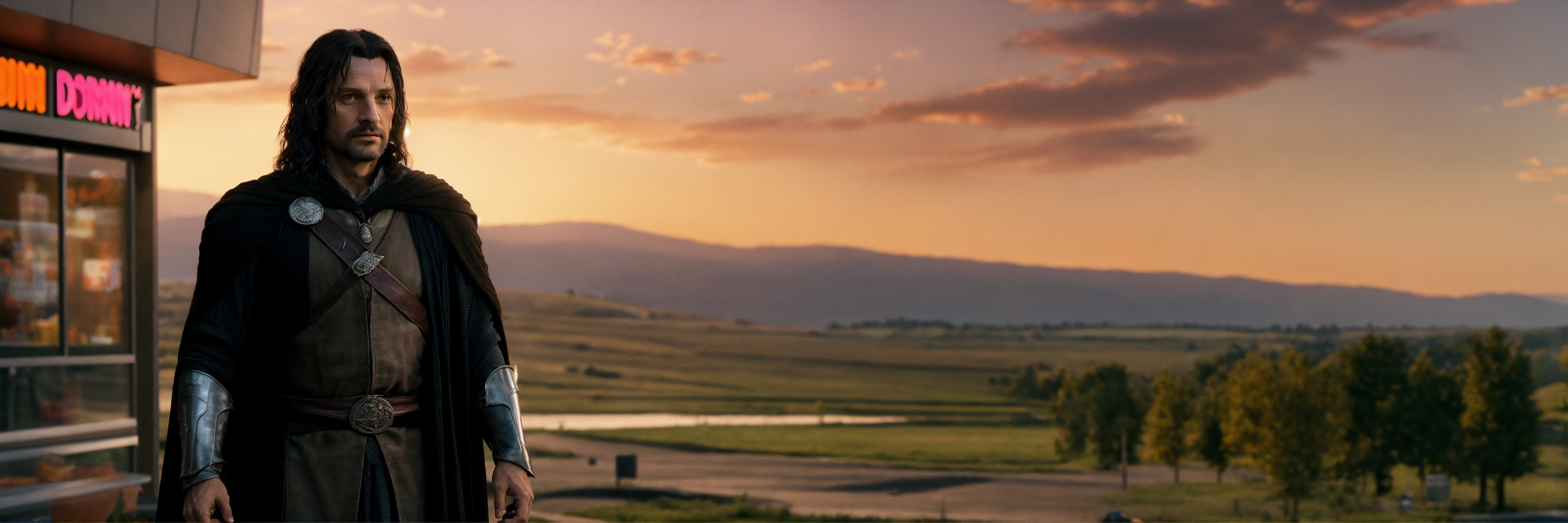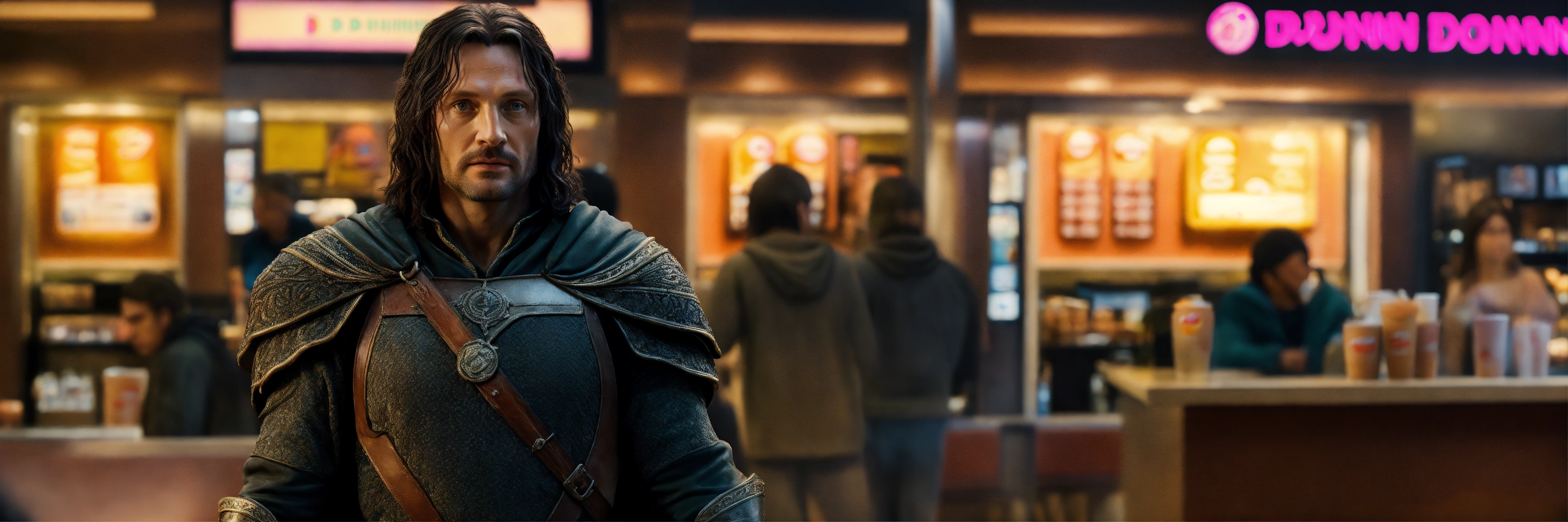 Aragorn at dunkin donuts, full body portrait, real picture, intricate details, depth of field, canon eos 5d mark iv, raw photo, 8k uhd, film grain, unreal engine 5, ray tracing