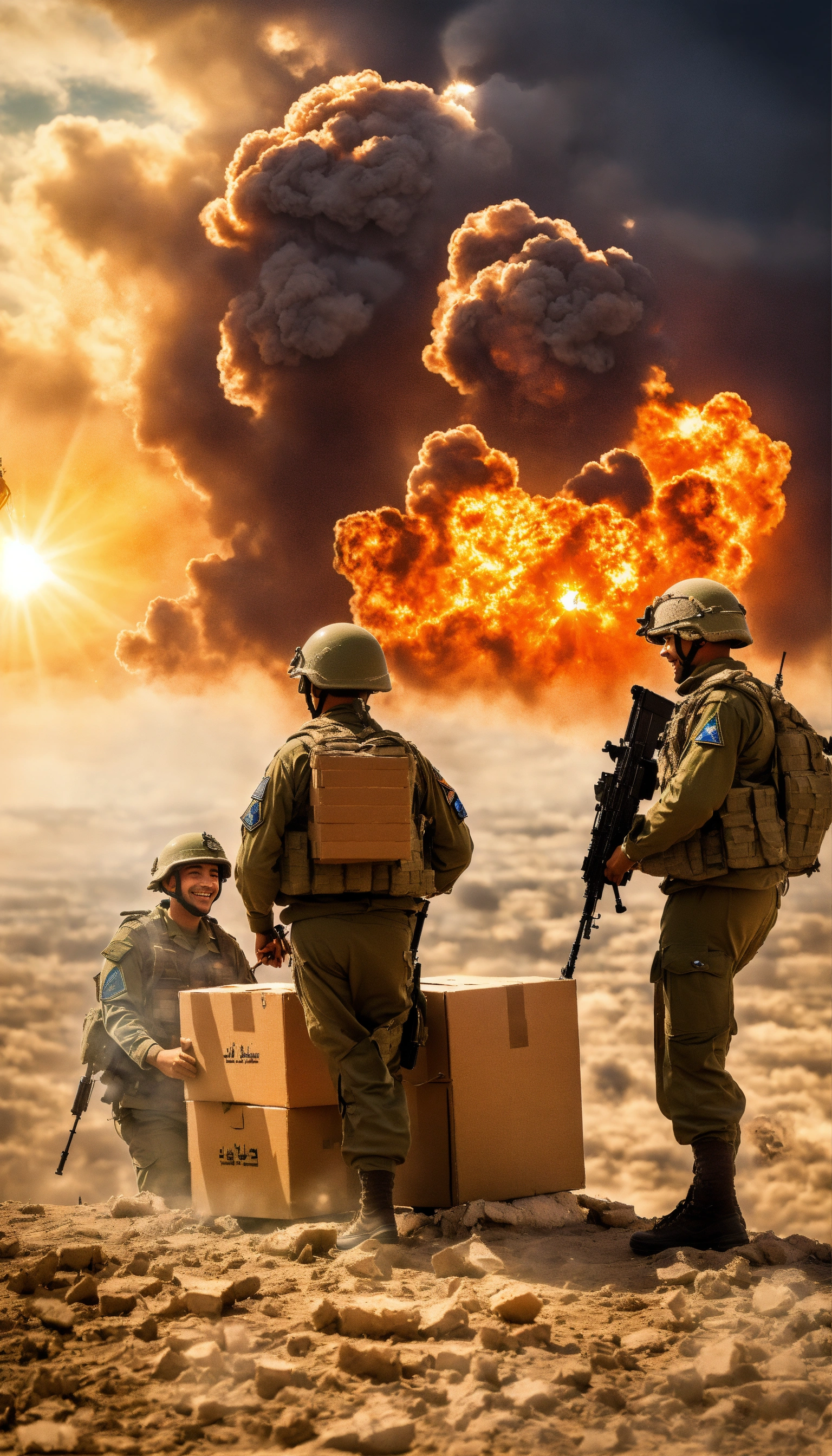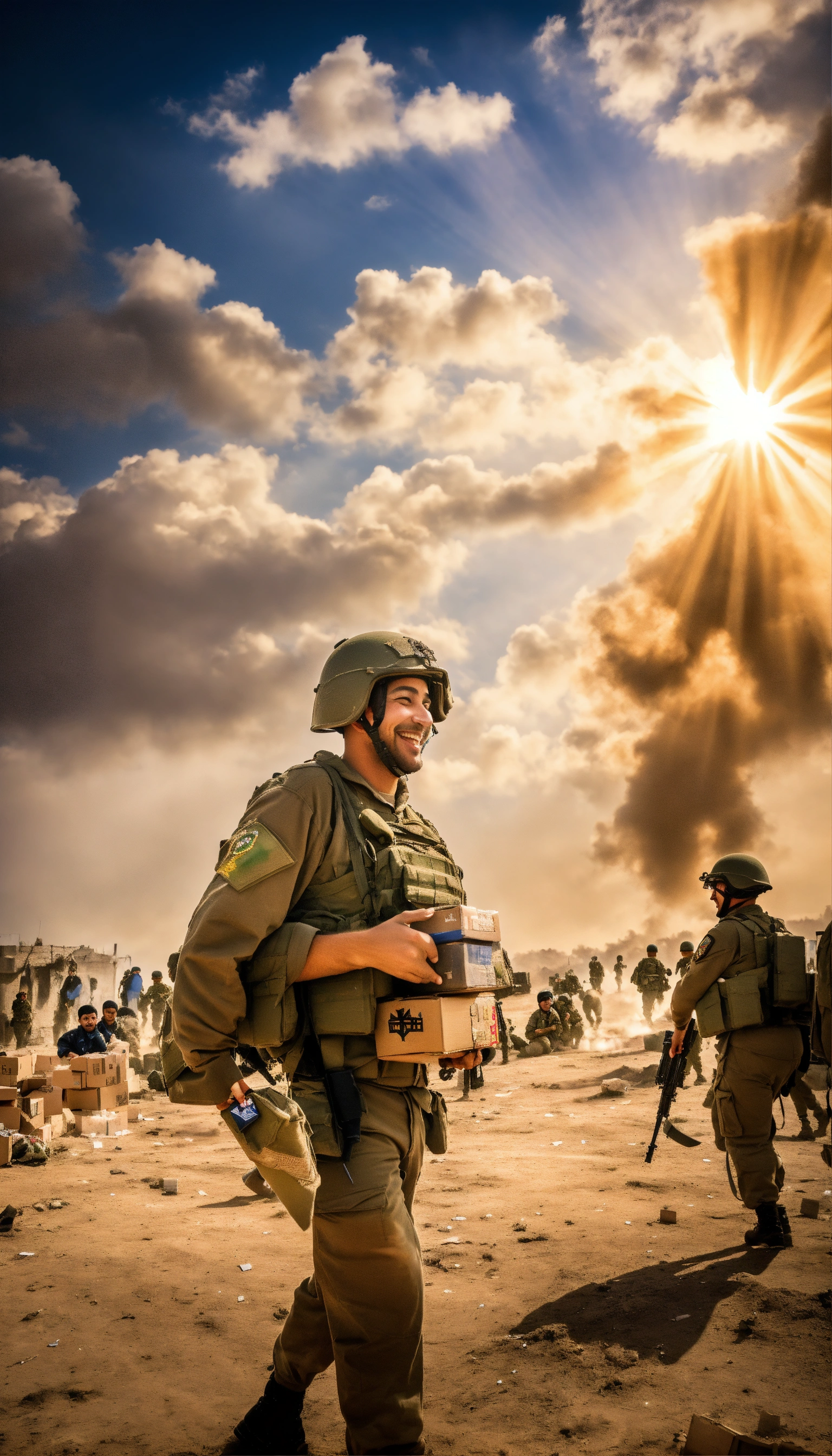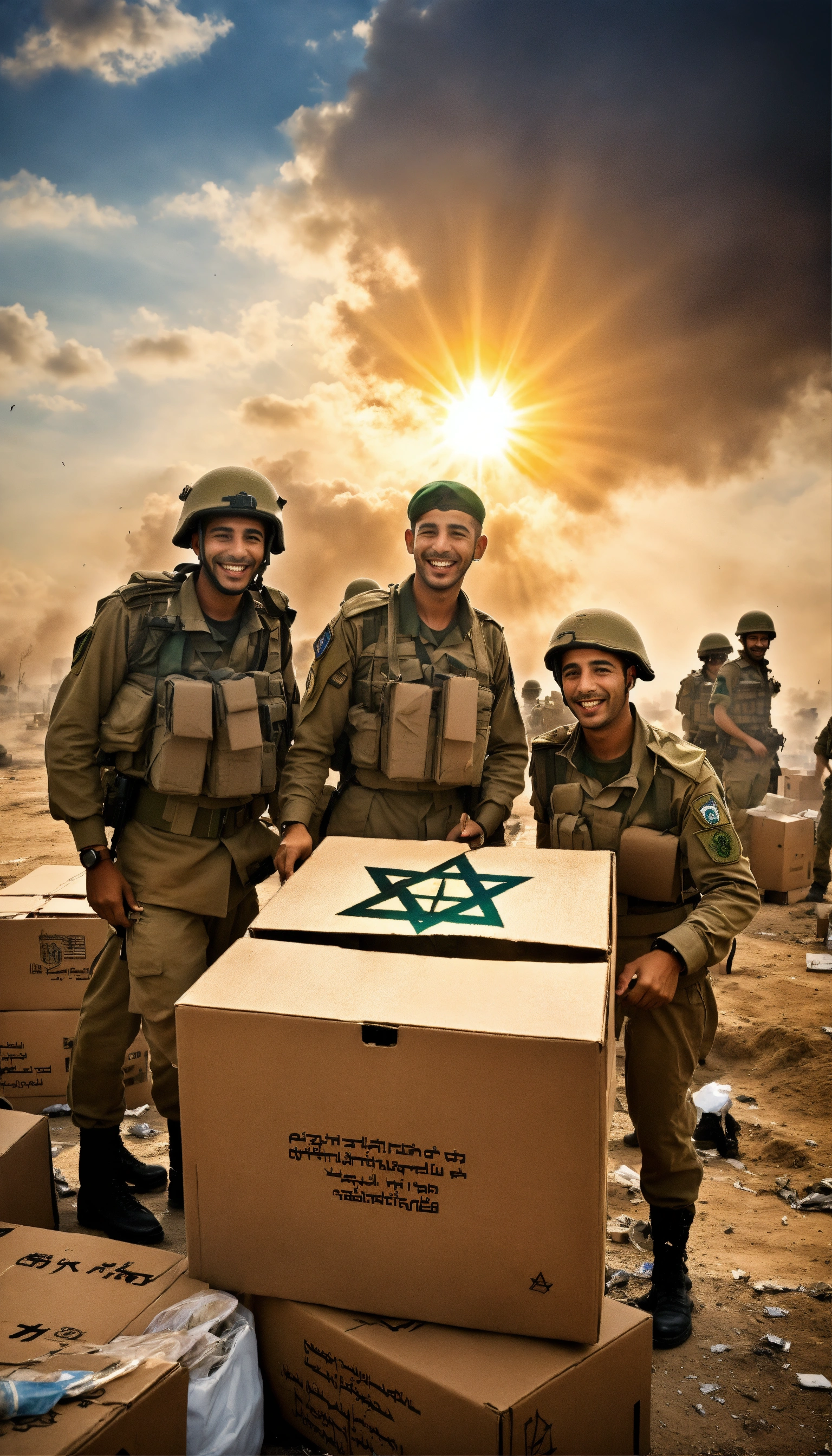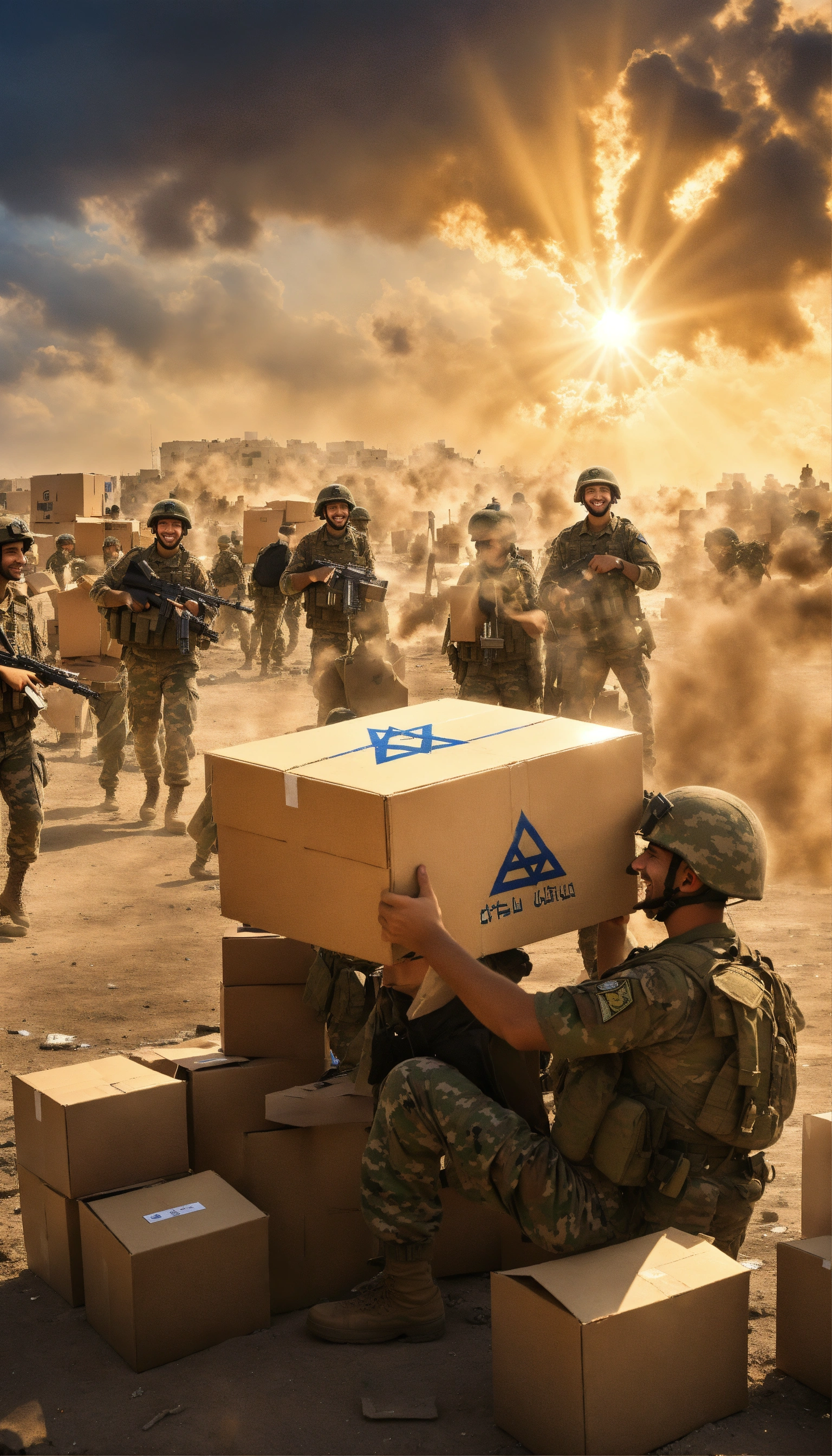 Israel at war in gaza, soldiers in uniform receive boxes of donations from israeli citizens, smiling happy and optimistic, a dramatic image, a background of war with the star of david symbol in the sky in the middle of the clouds and a ray of sunlight passing through it, colors of war, a very high quality image