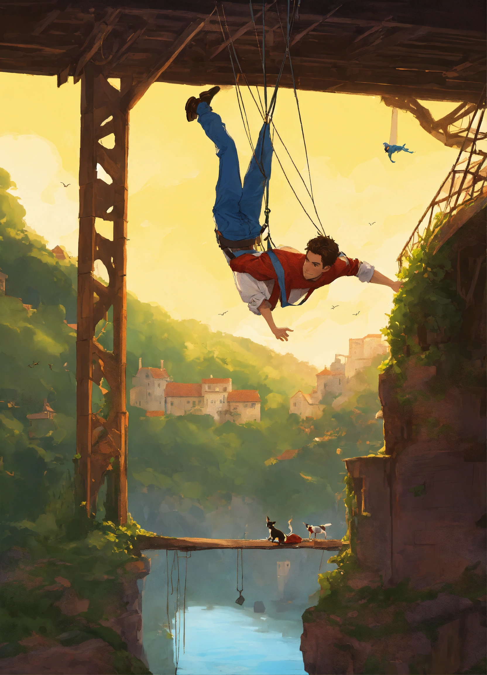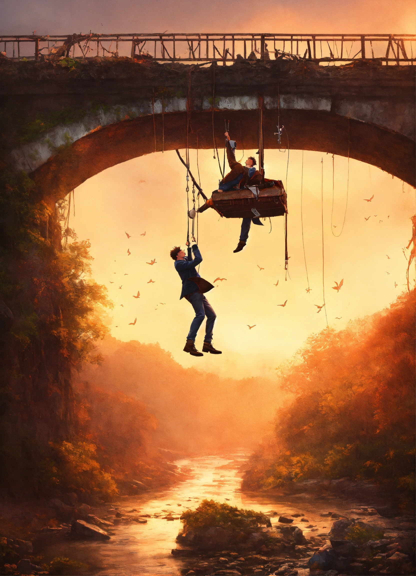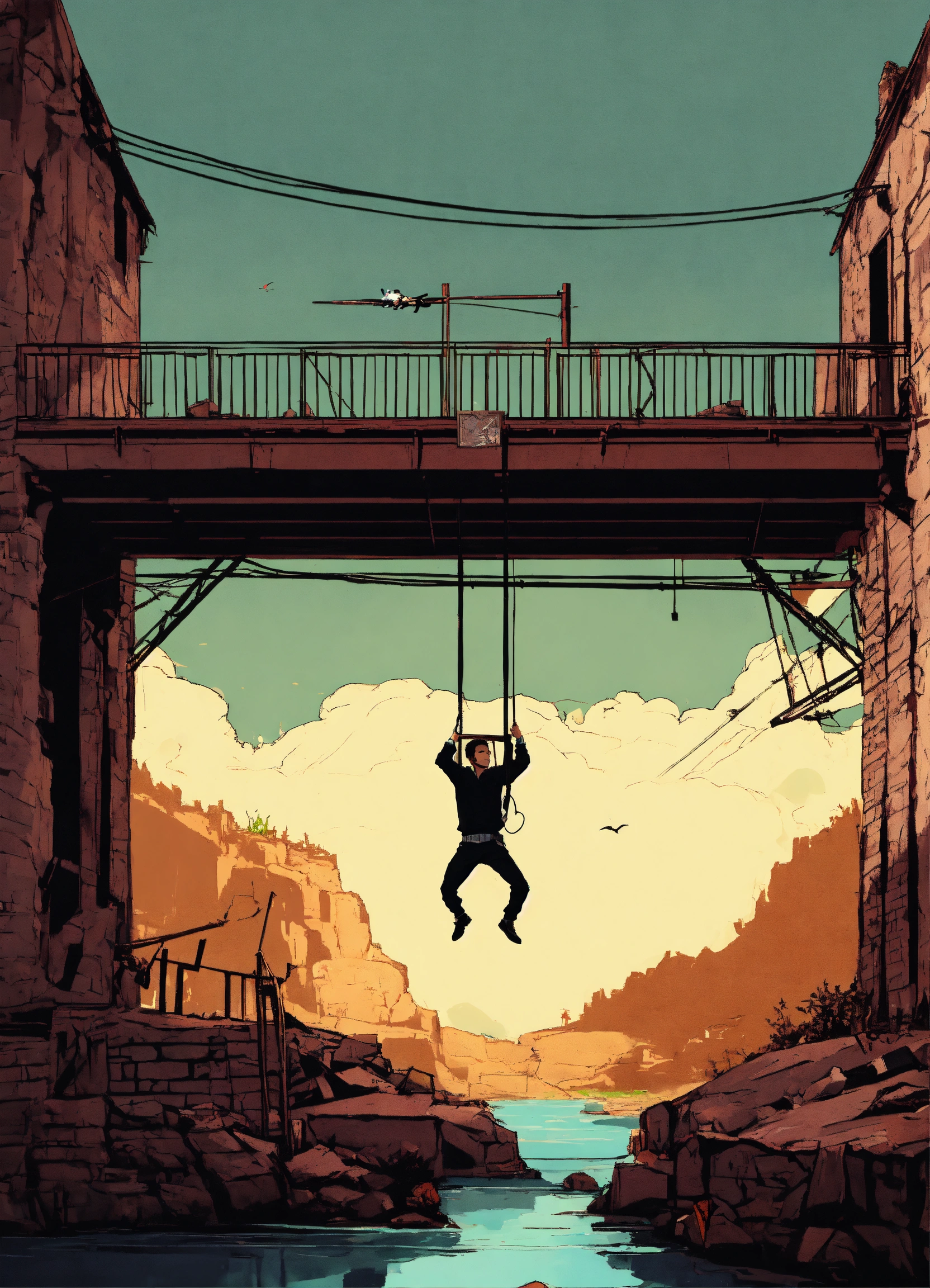 One single man hanging from a ruined bridge