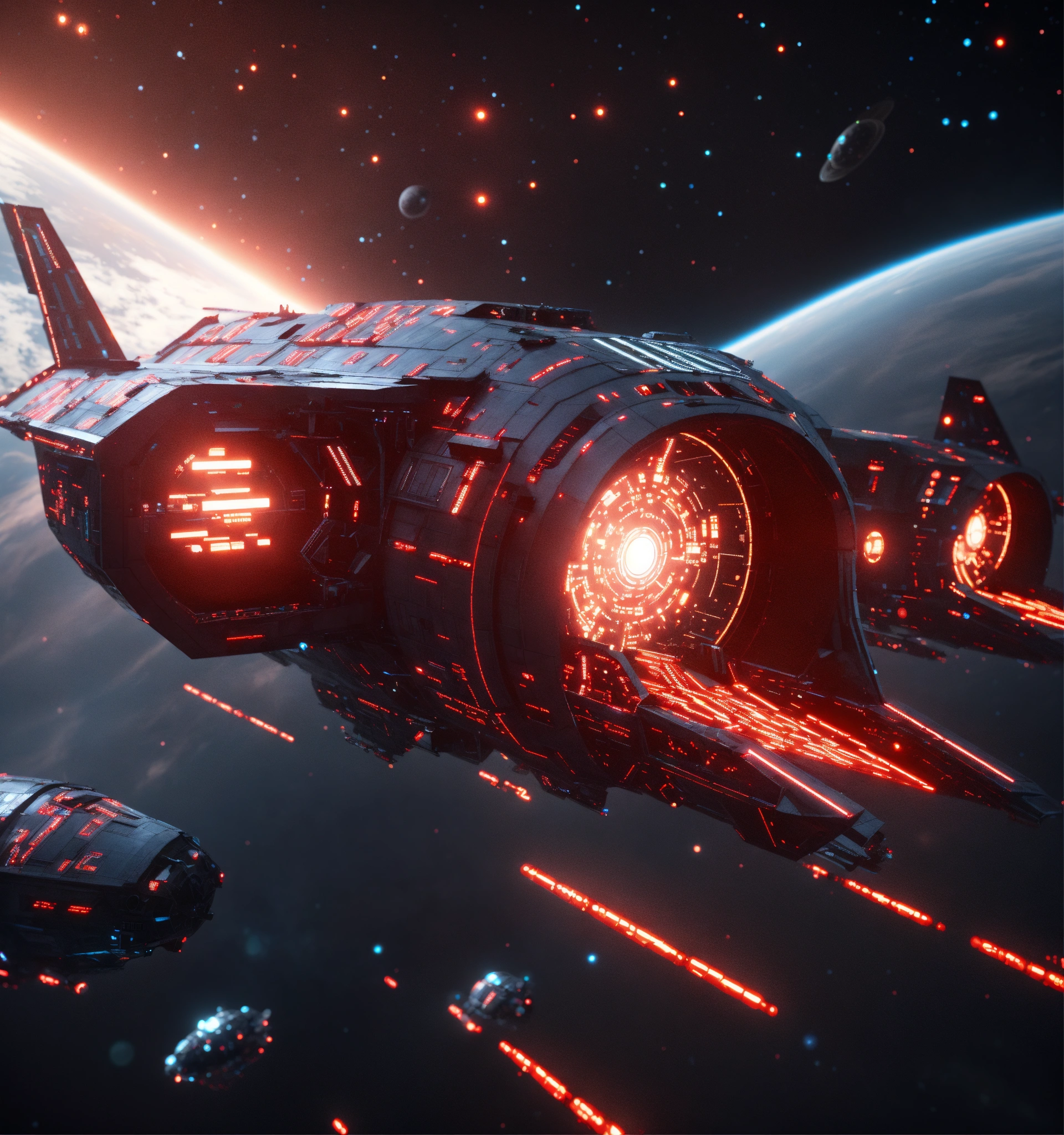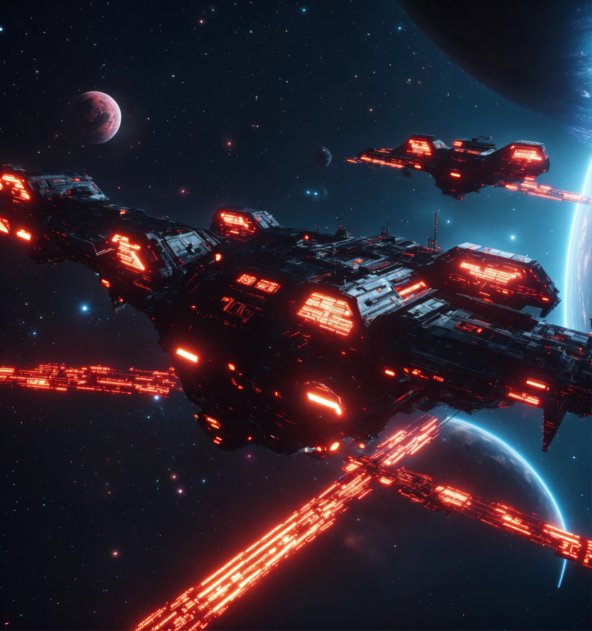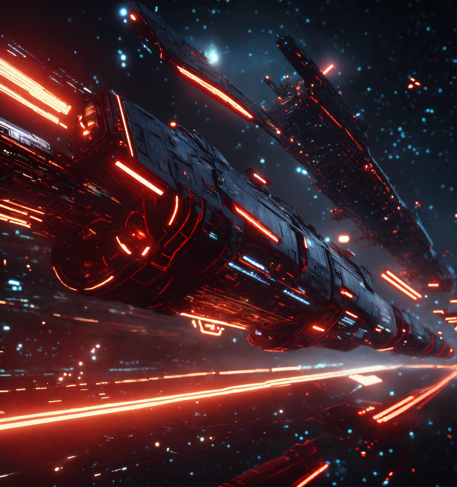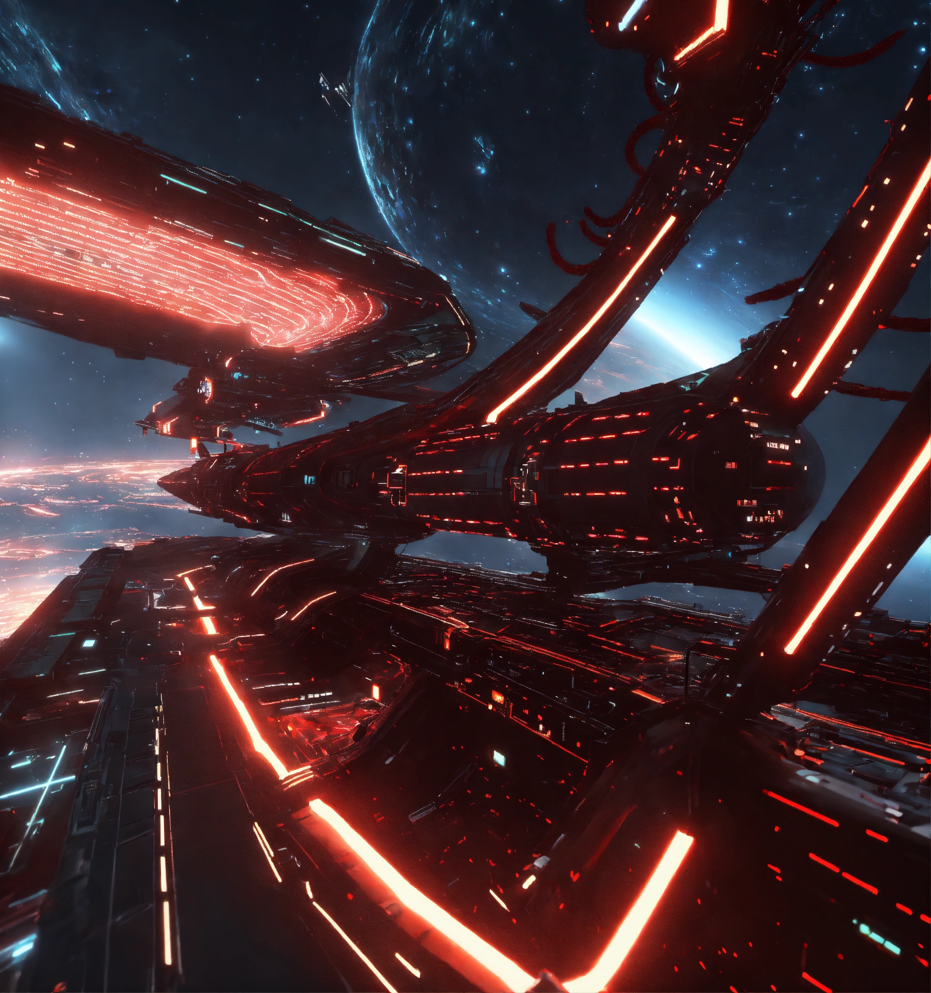 Zoom out on fleet of long black organic worm like space ships with glowing red circuitry and markings, appear in deep space from hyperspace, realistic, 8k, tron, unreal engine
