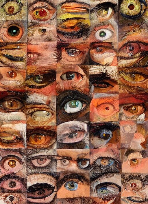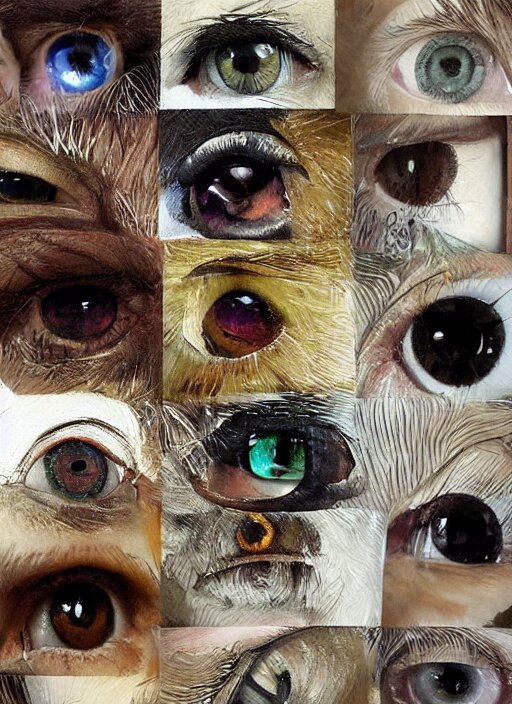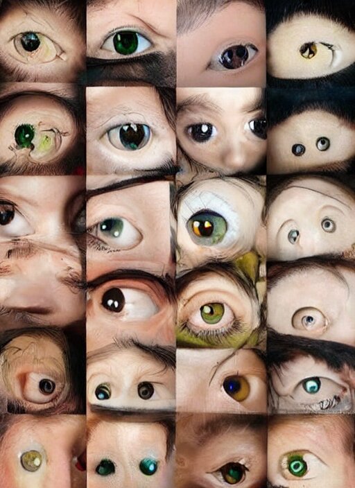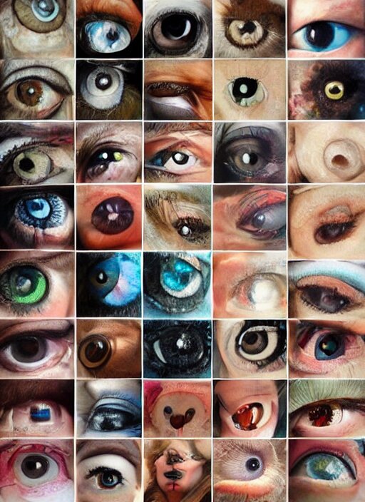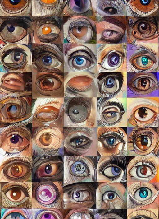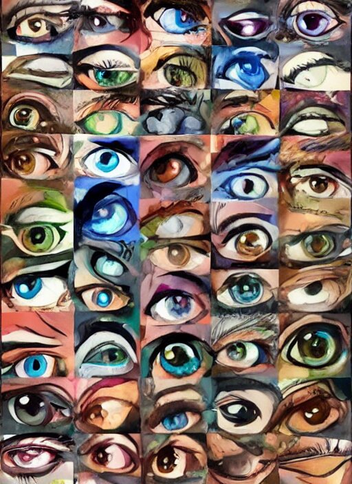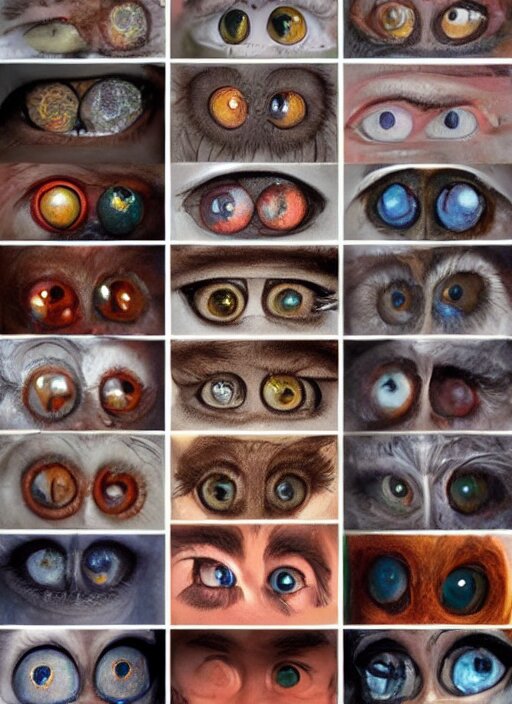 Diverse eyes!, dot pupils, round pupil, happy human eyes, round iris, advanced art, art styles mix, from wikipedia, grid of styles, various eye shapes