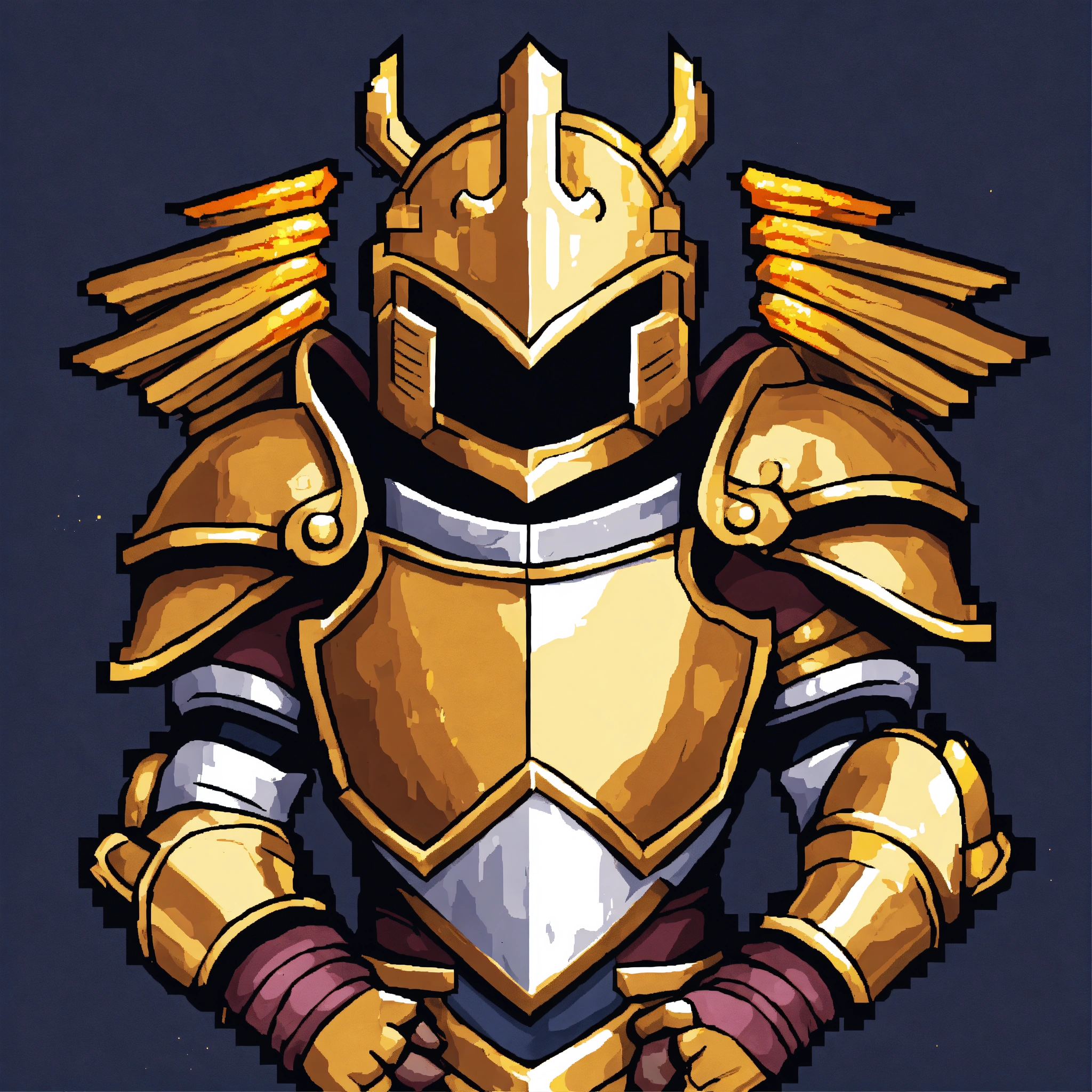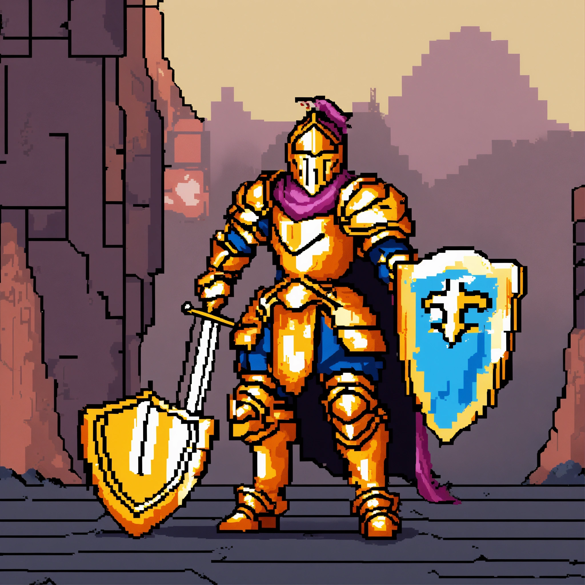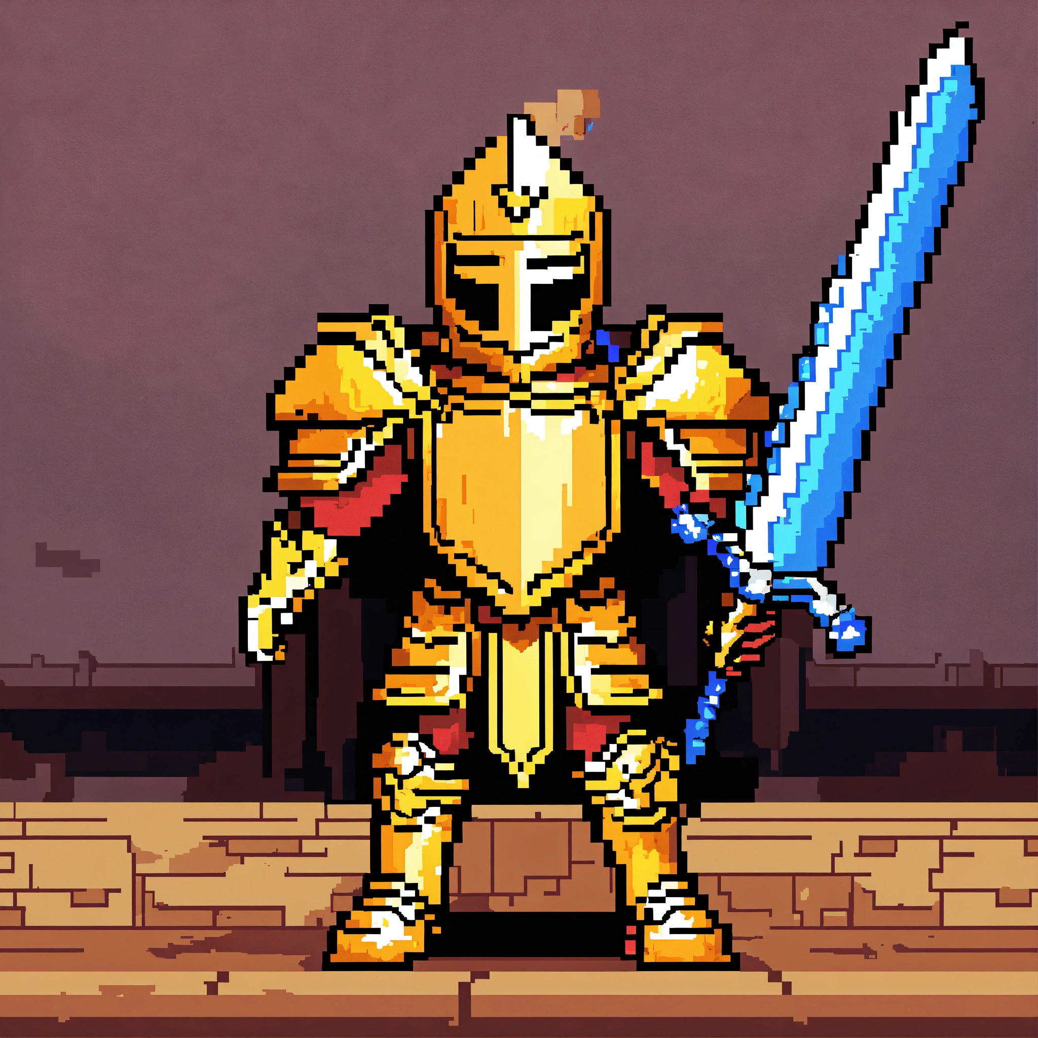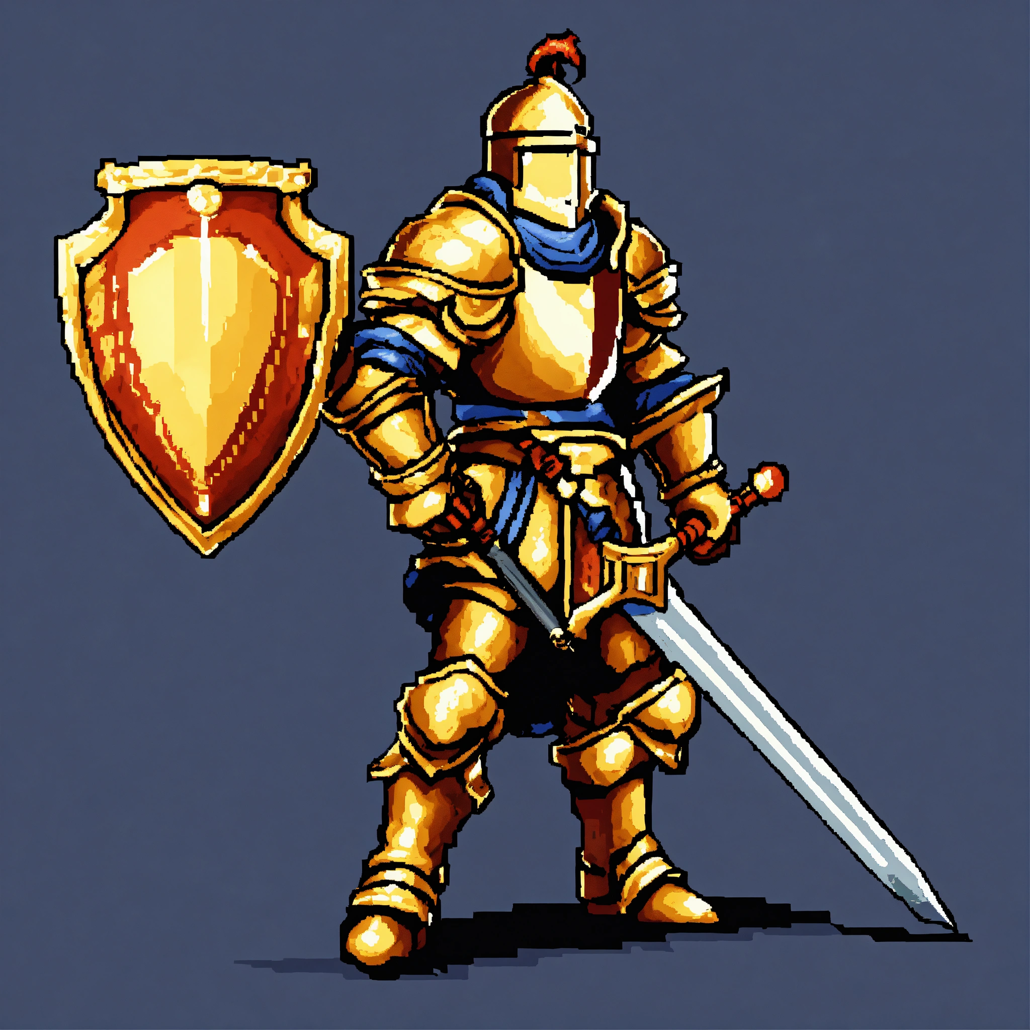 Pixel art, jrpg, sprite, knight, 16-bit, super nintendo, broadsword, shield, golden armor, grin, smile