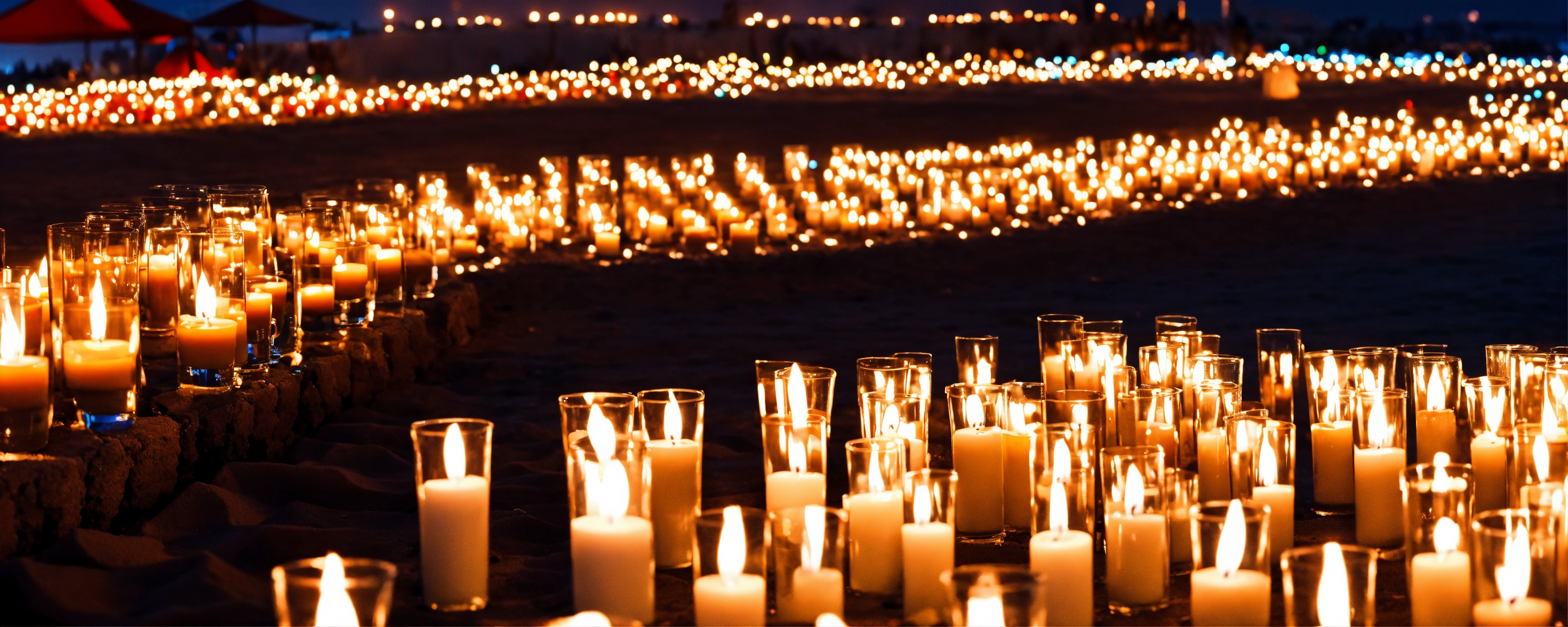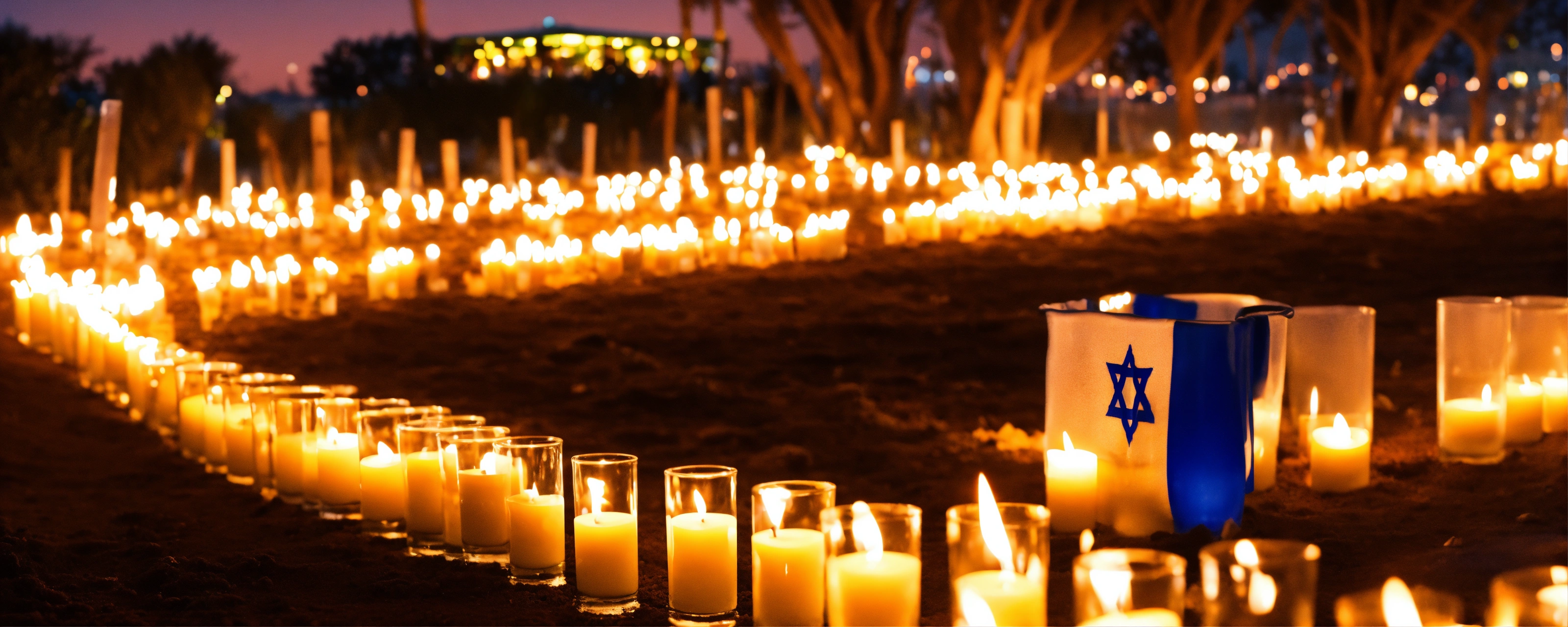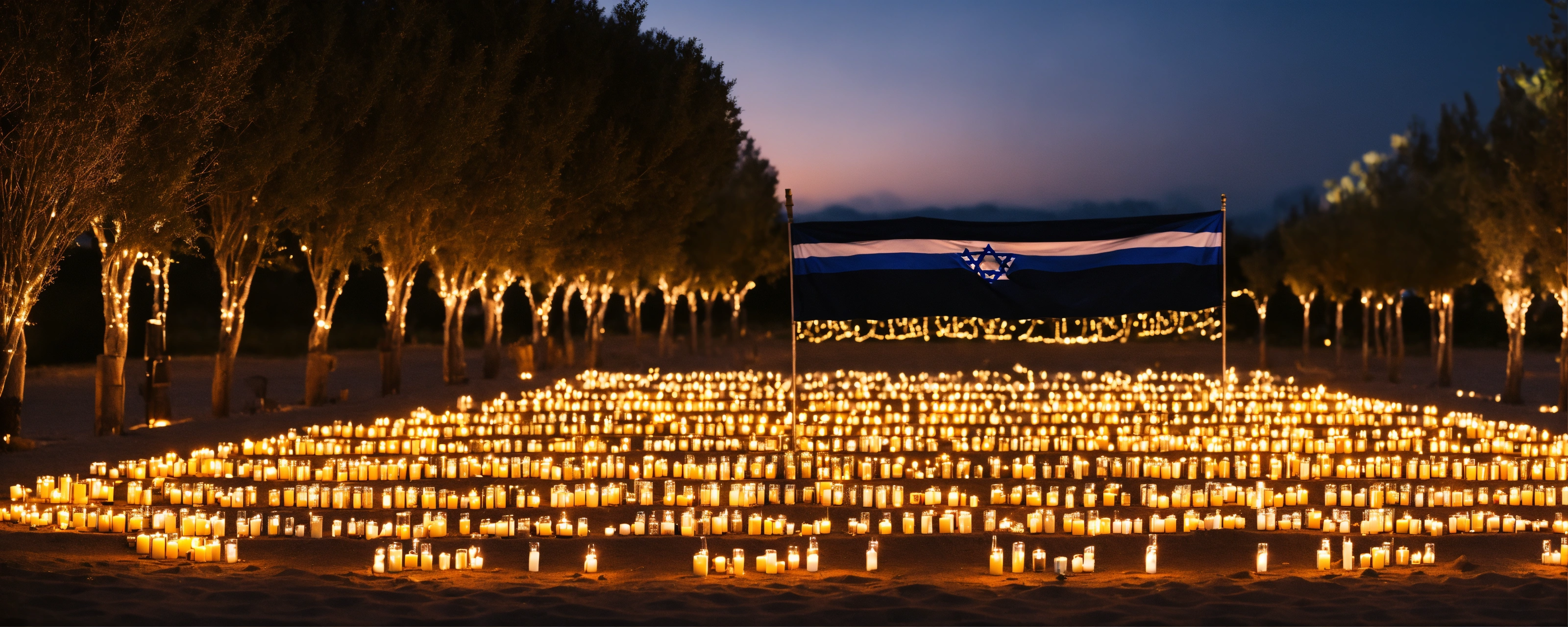 Create for me a realistic 8k image of a night lit by hundreds of candles in glass cups and the israeli flag spread on the ground
