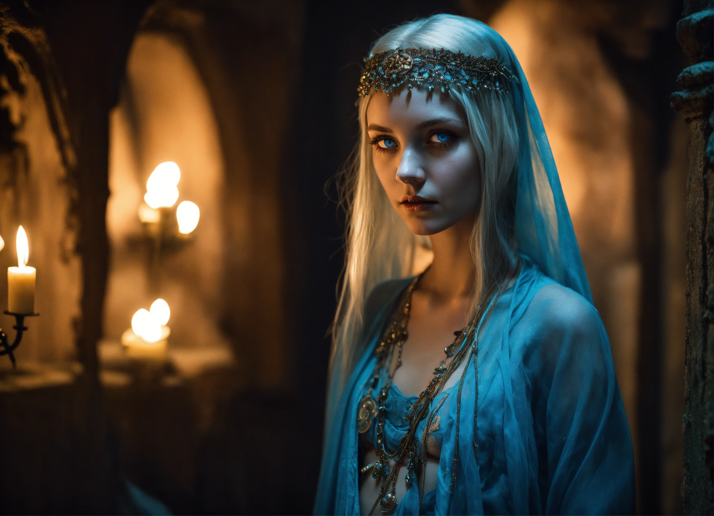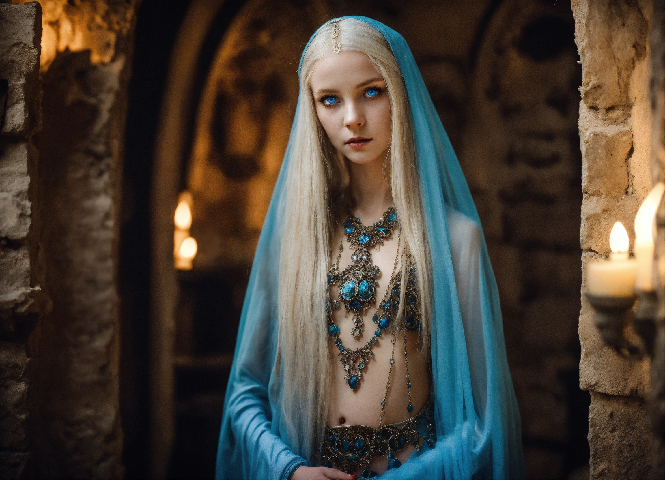 Body portrait of a very childish deadly pale extremely slim twelve year old female child, she is a necromancer with waist long silverwhite hair and glowing blue eyes, small bust size, lasciviously clothing of a face-veiled belly dancer, sichtbares höschen, very flat belly, belly button, extremely skinny, extremely slim body, emaciated body, completely emaciated, extremly narrow face, alabaster skin, pale as a corpse, slim face, innocent looking, lasciviously in a gloomy crypt, kindlich, unschuldig, lasciviously, intimate, childlike, graceful, wispy, glowing blue eyes, ghostly, dead, evil, demonic, undead, darkness, grotesque, mysterious, dark, cold ambient lighting, extremely detailed, fantasy, medieval setting