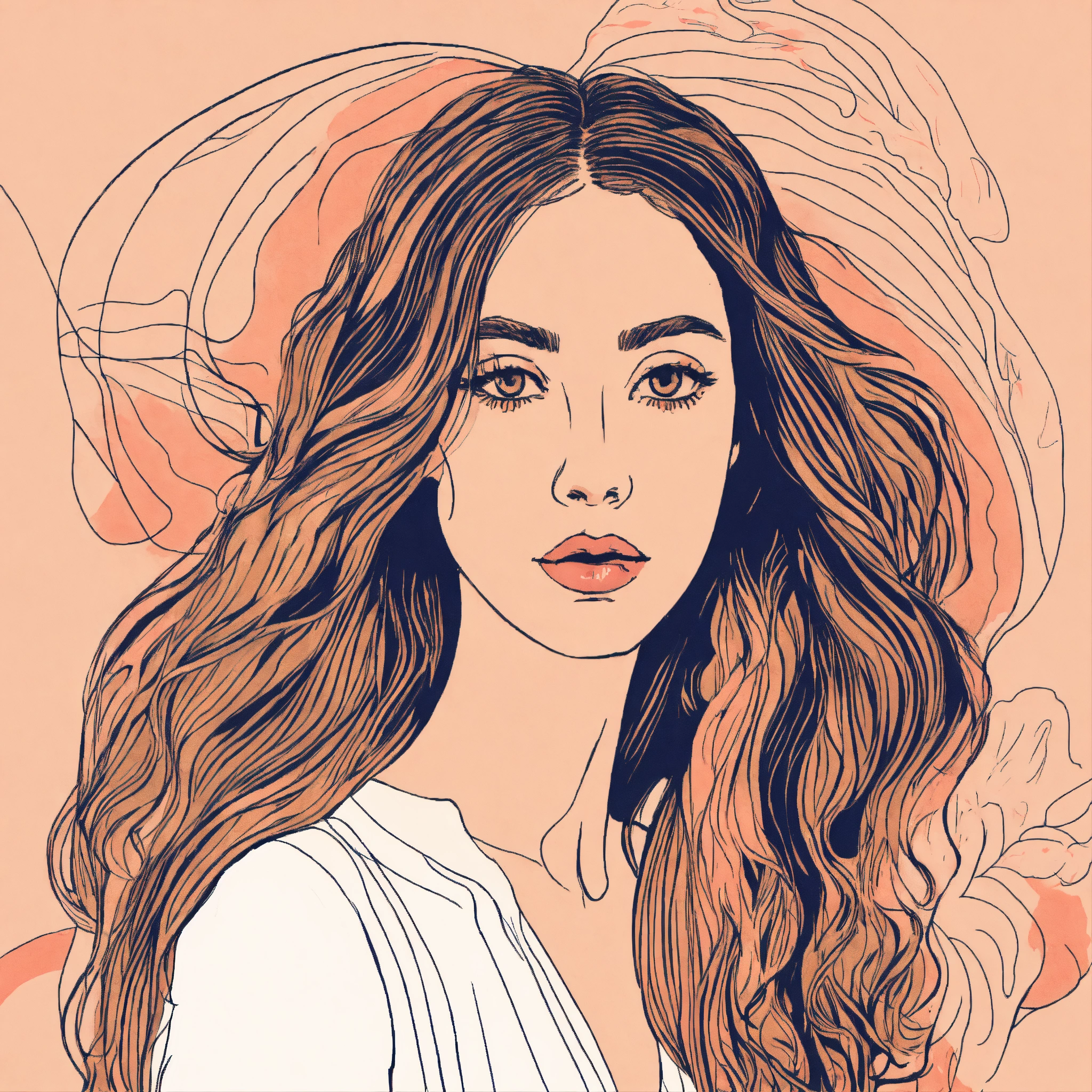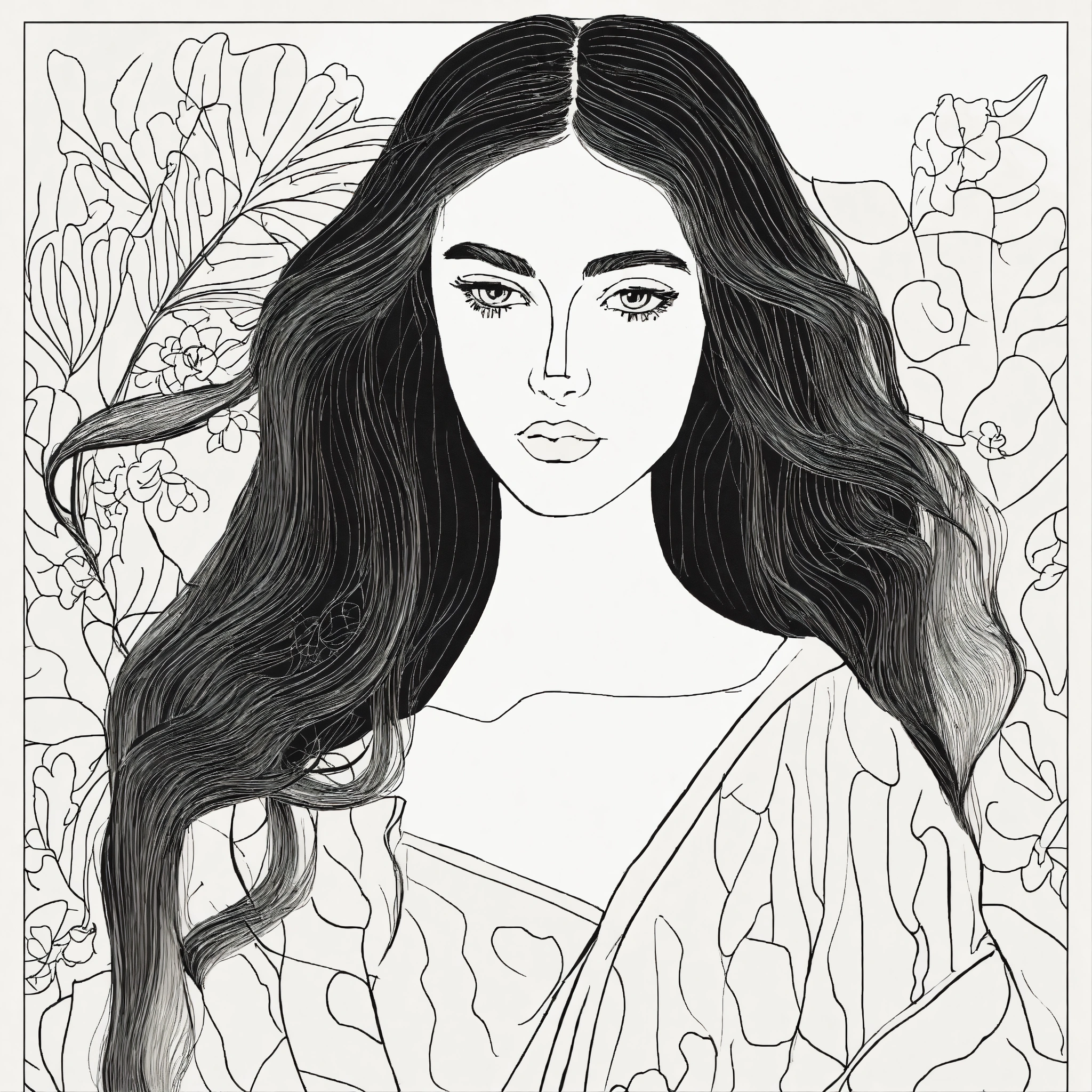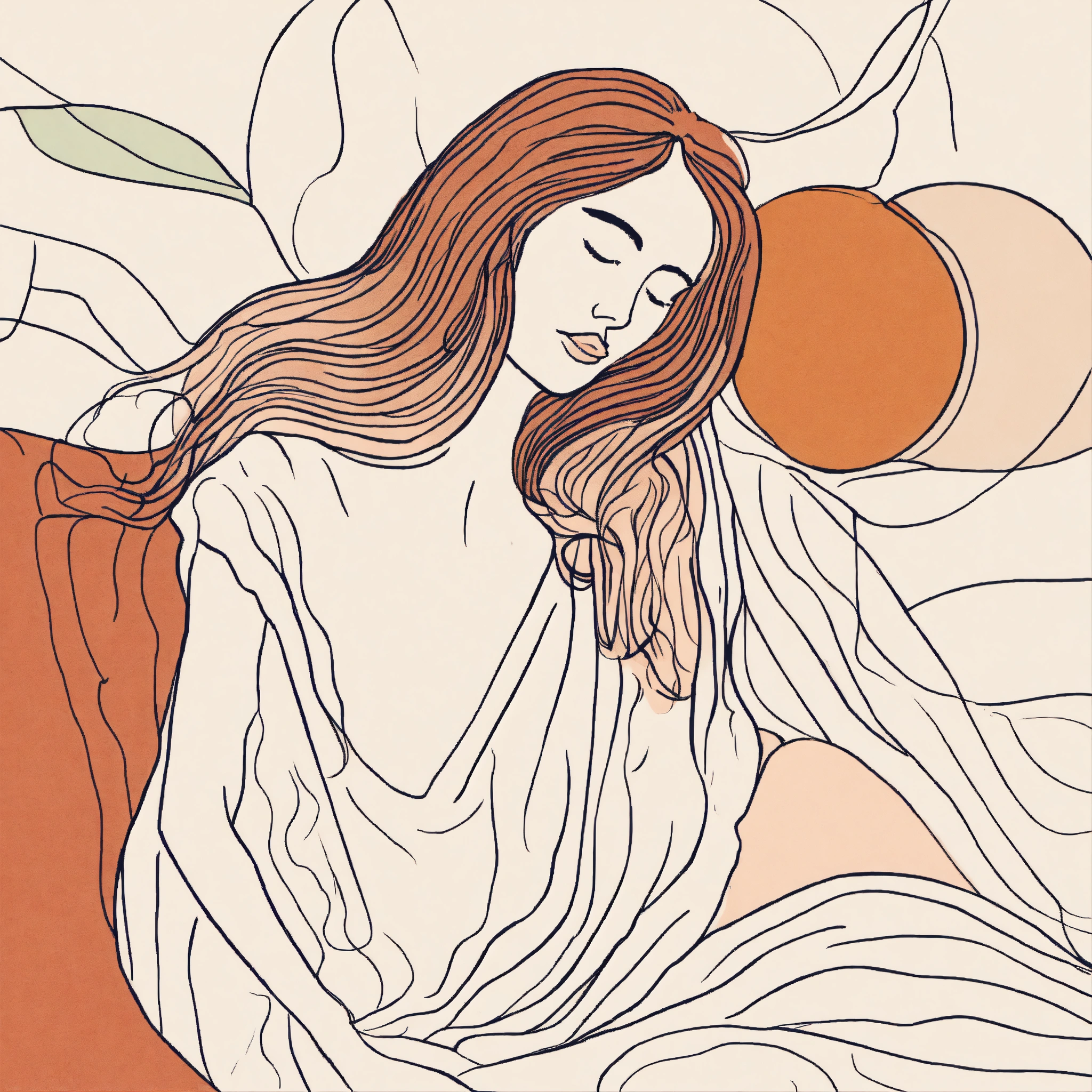 Female line drawing with long flowy hair in the style of matisse