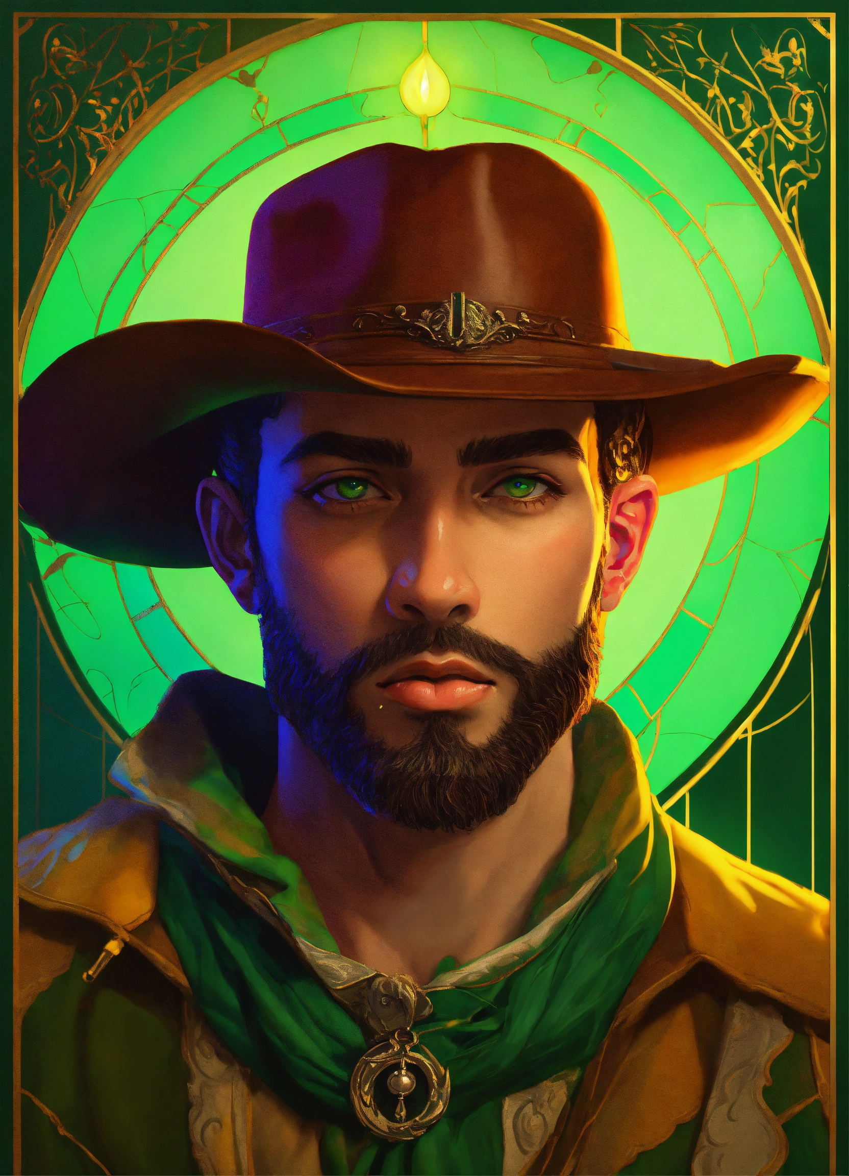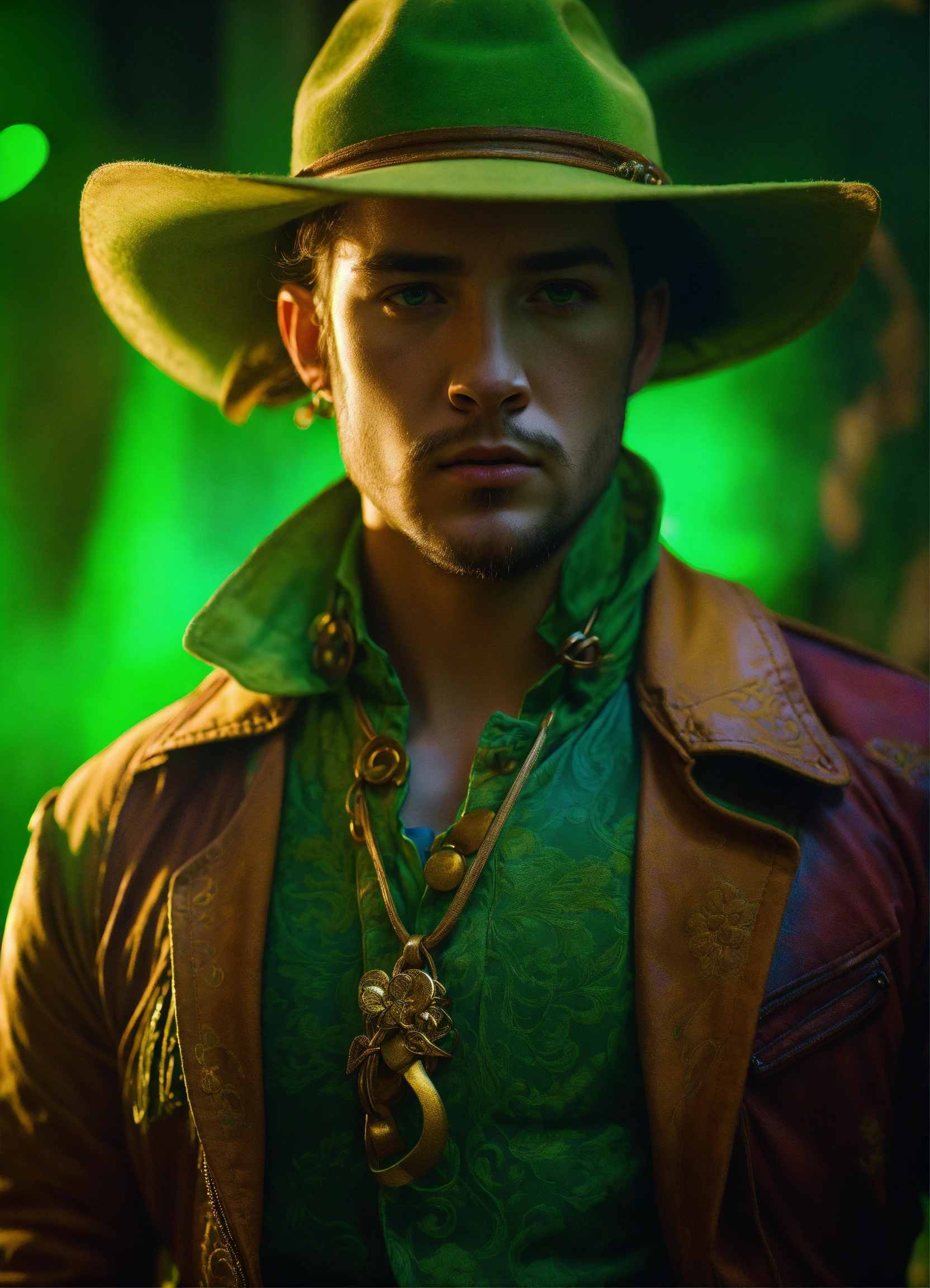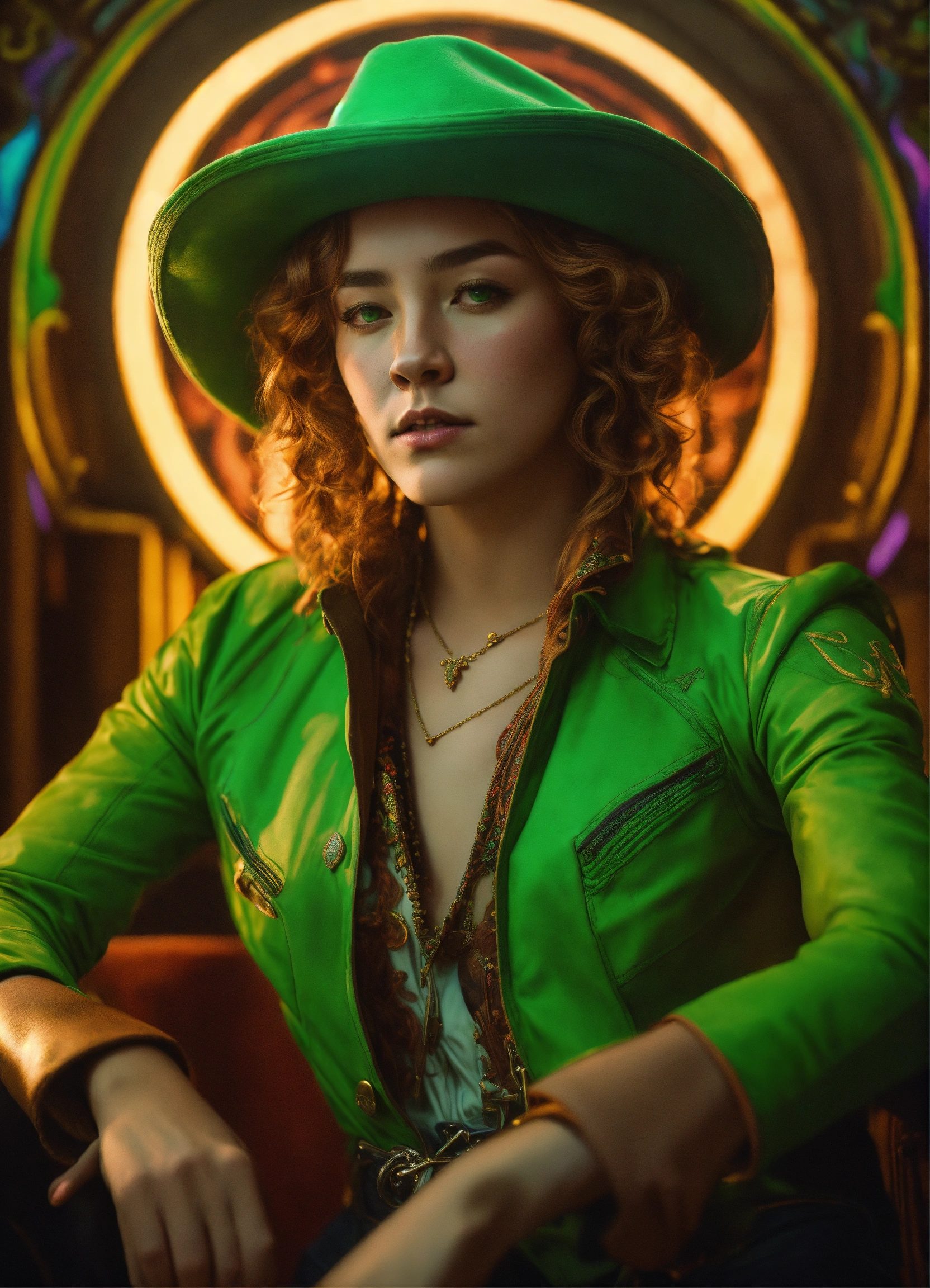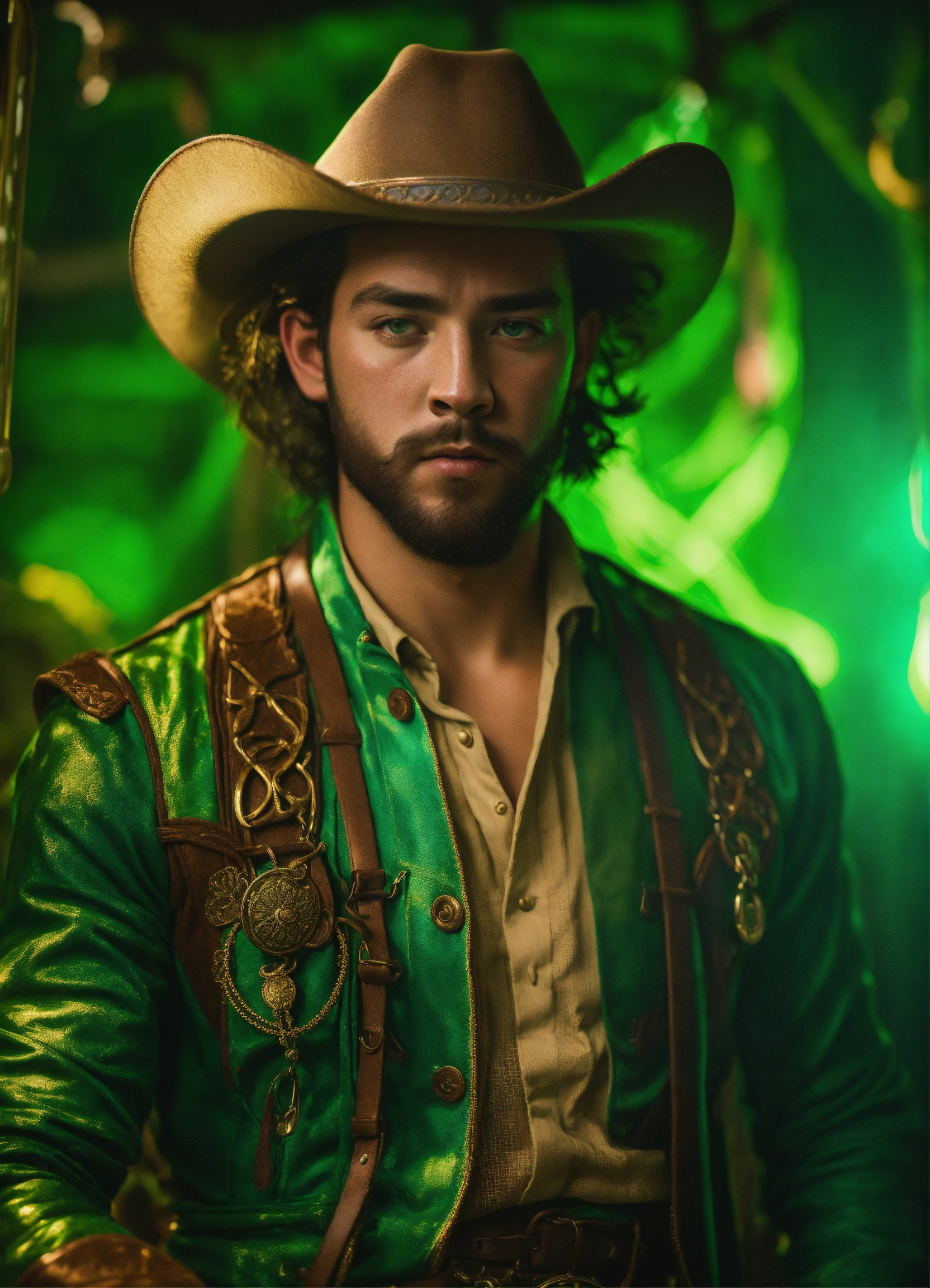 Aries, ethereal, art nouveau, flexography, cow-boy shot, rigging, detailed, props, multicoloured colors, green academia, accent lighting, realistic skin tones, dramatic chiaroscuro lighting, portrait photography, 4k