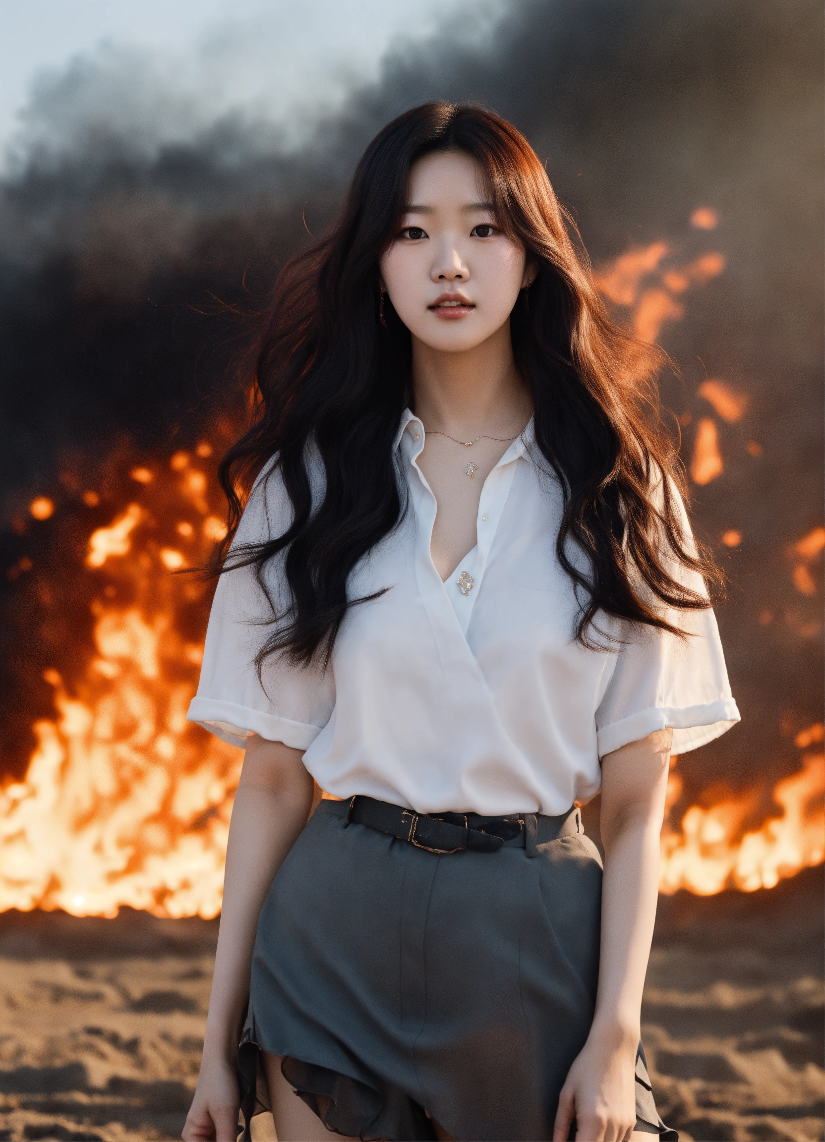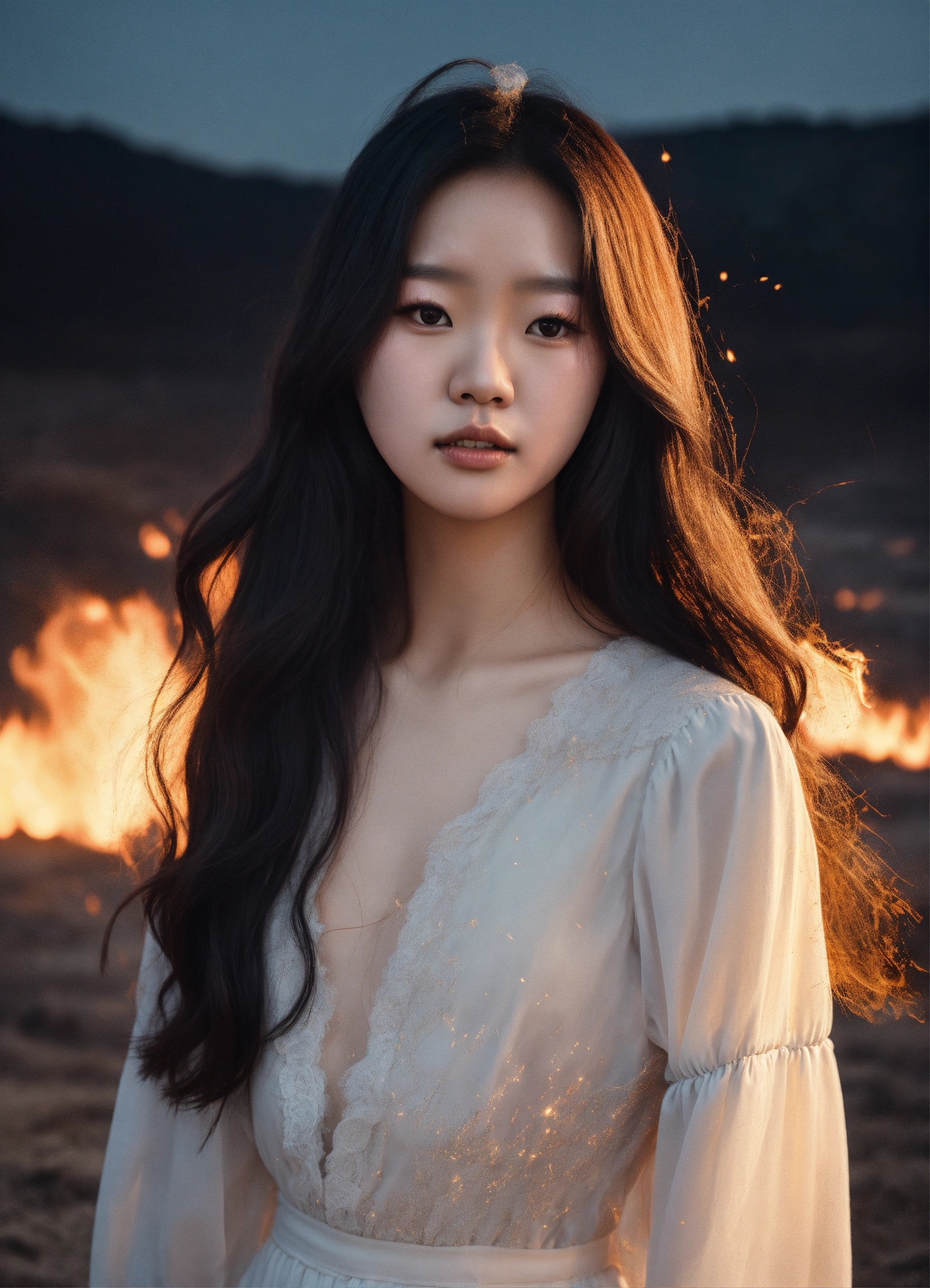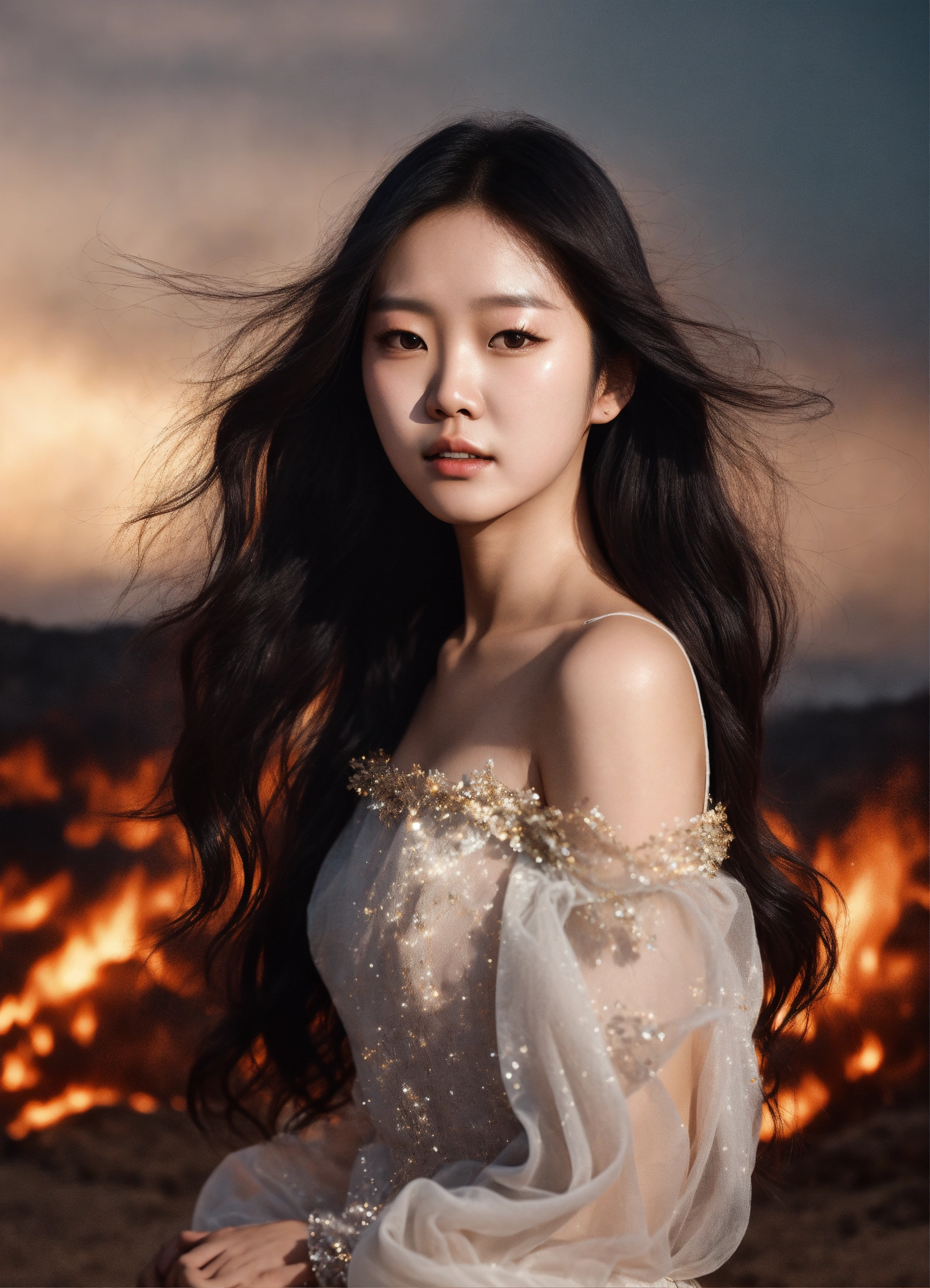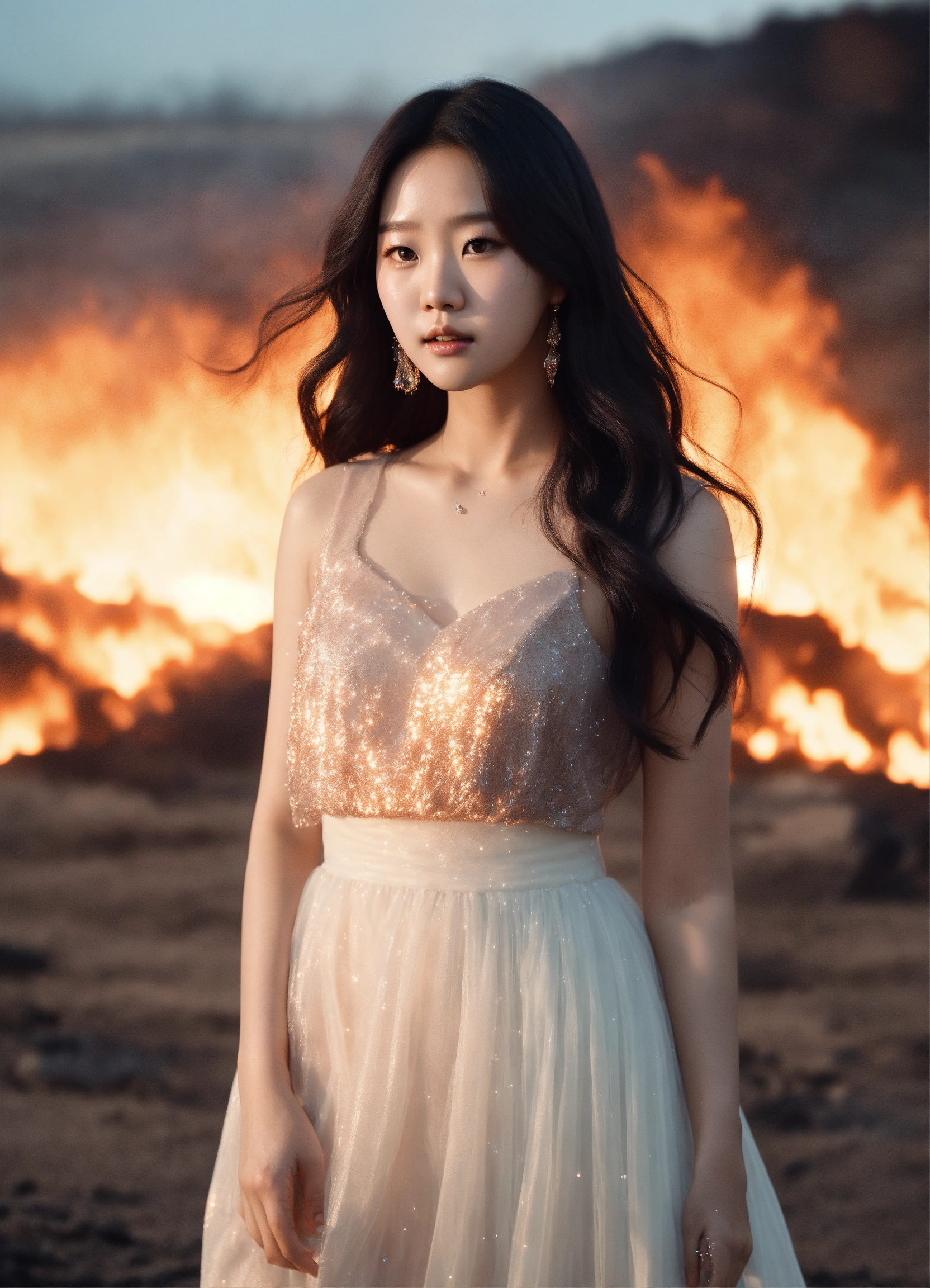 Yang wonyoung with long wavy dark hair, sparkling white light, half-turned, standing in a wasteland of fire and shadows, realistic. photoshoot