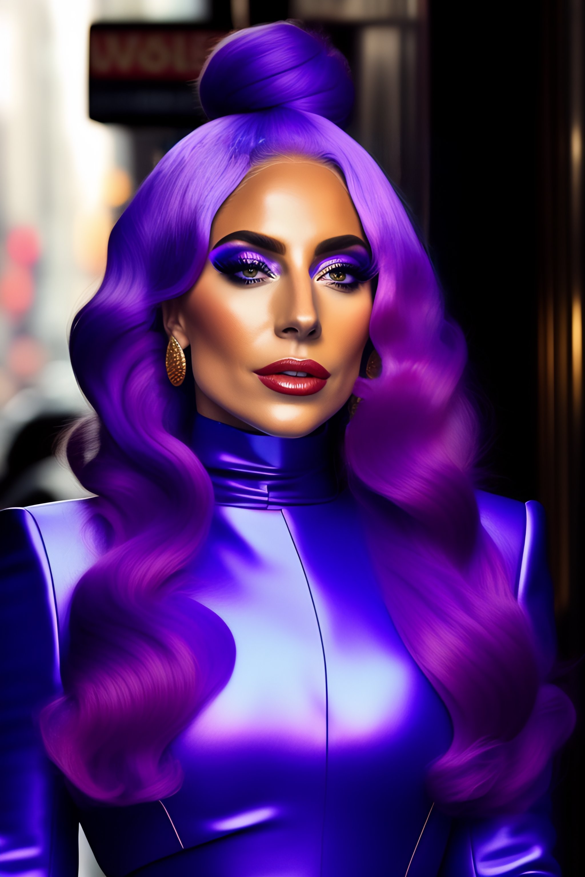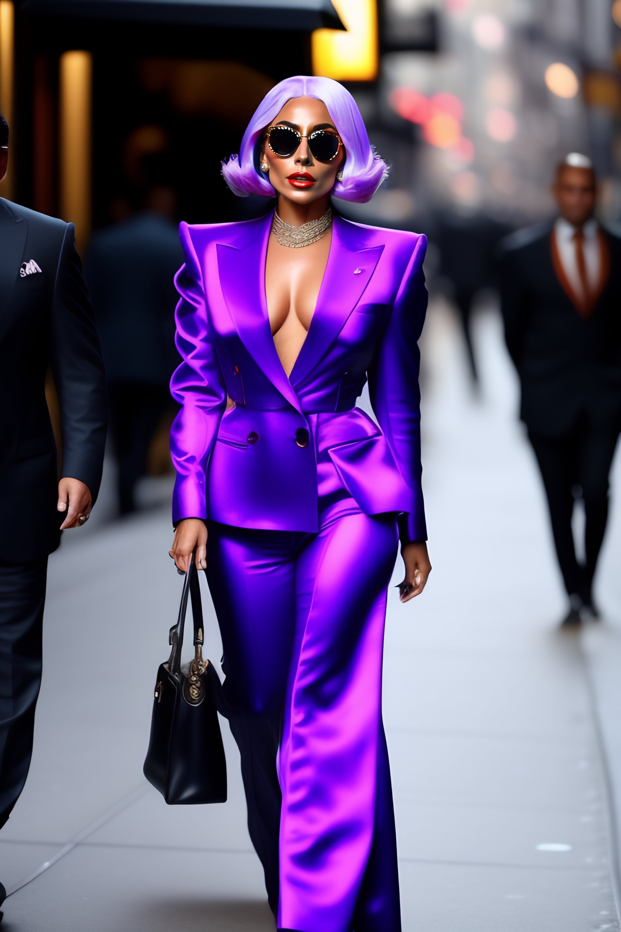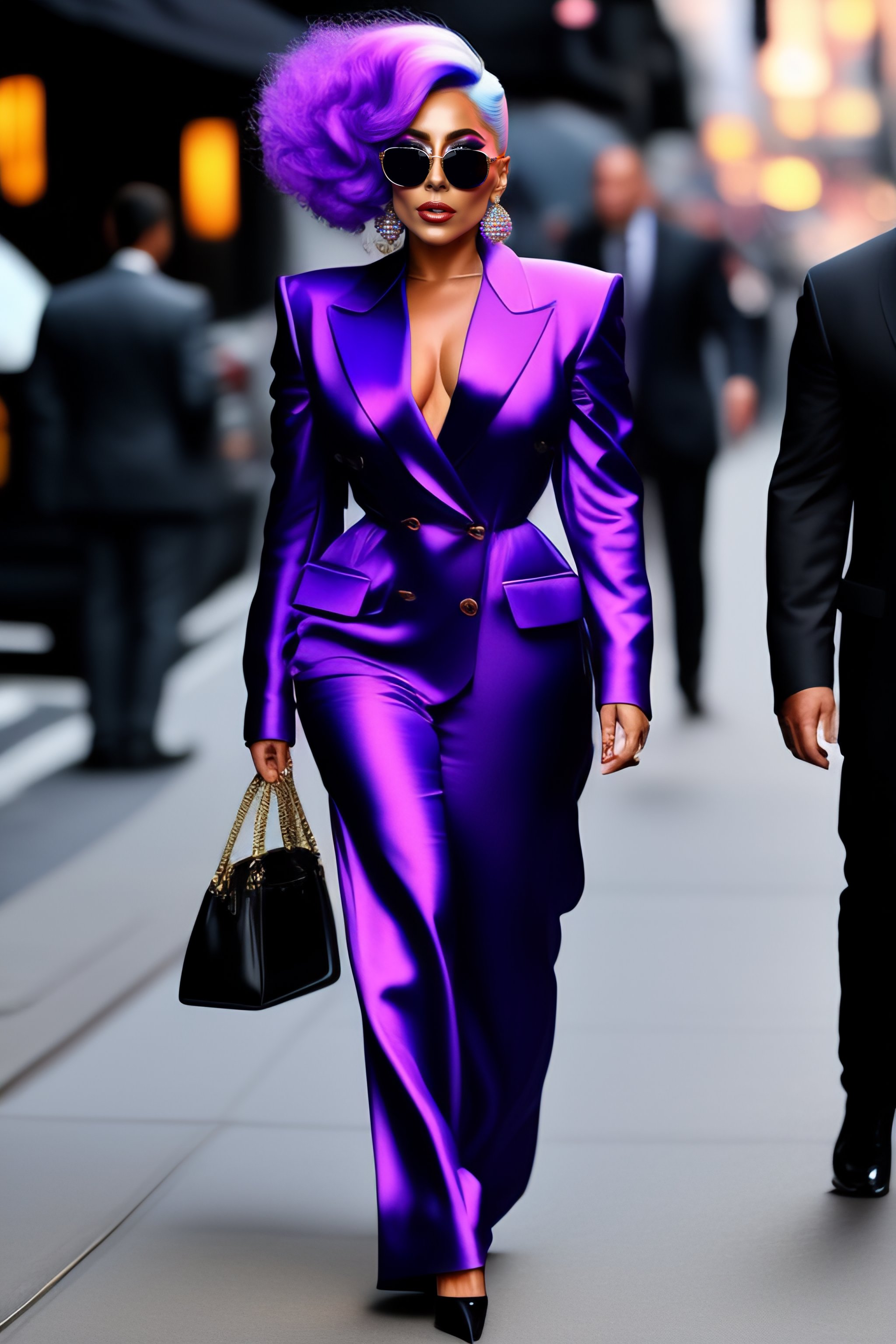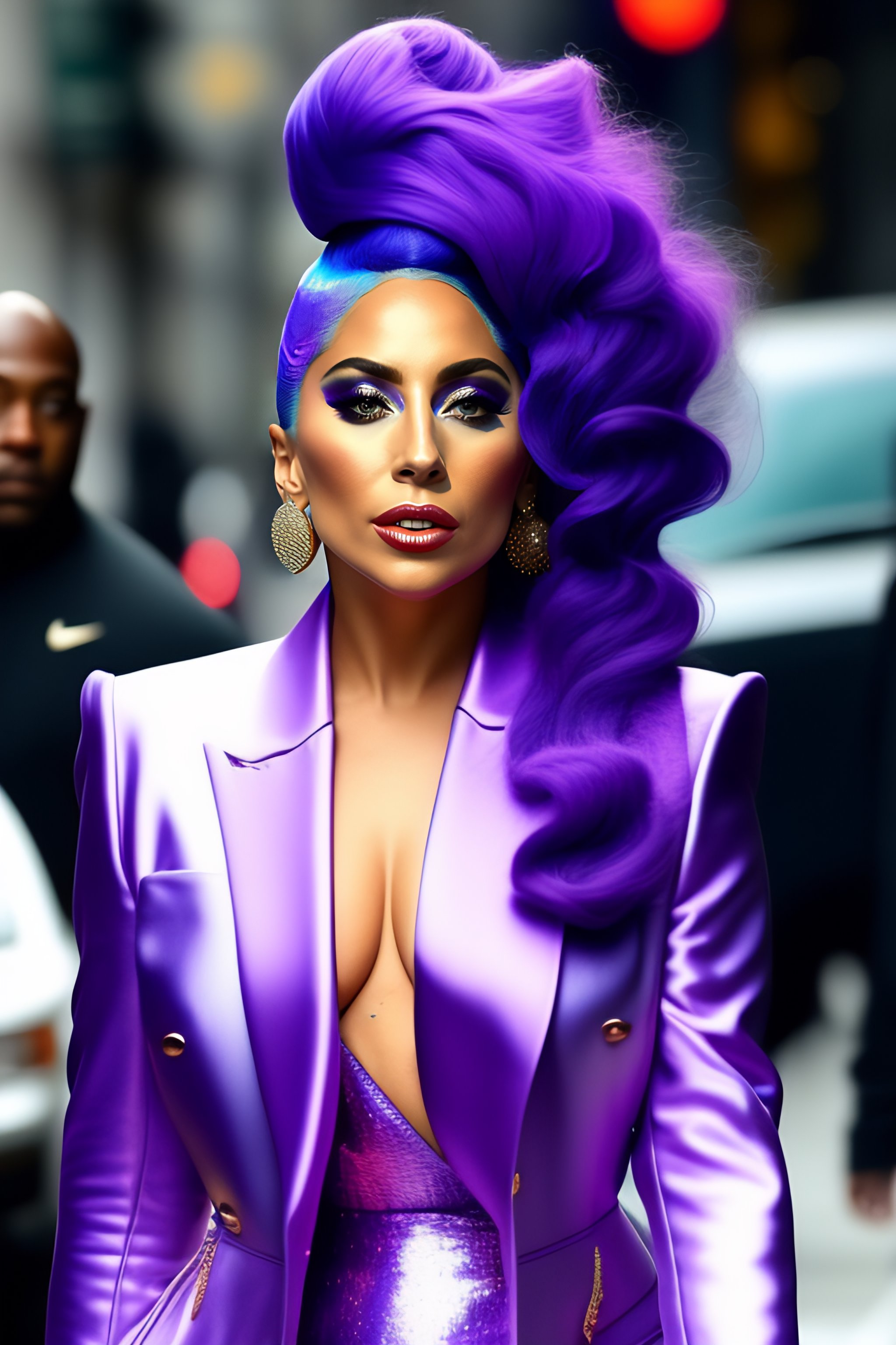 Lady gaga walking down the street in new york city with purple hair and