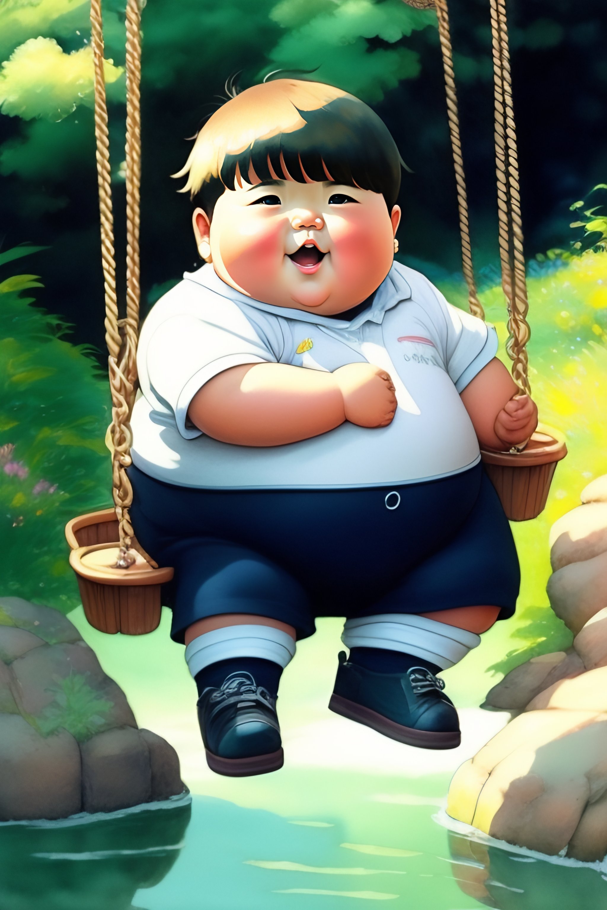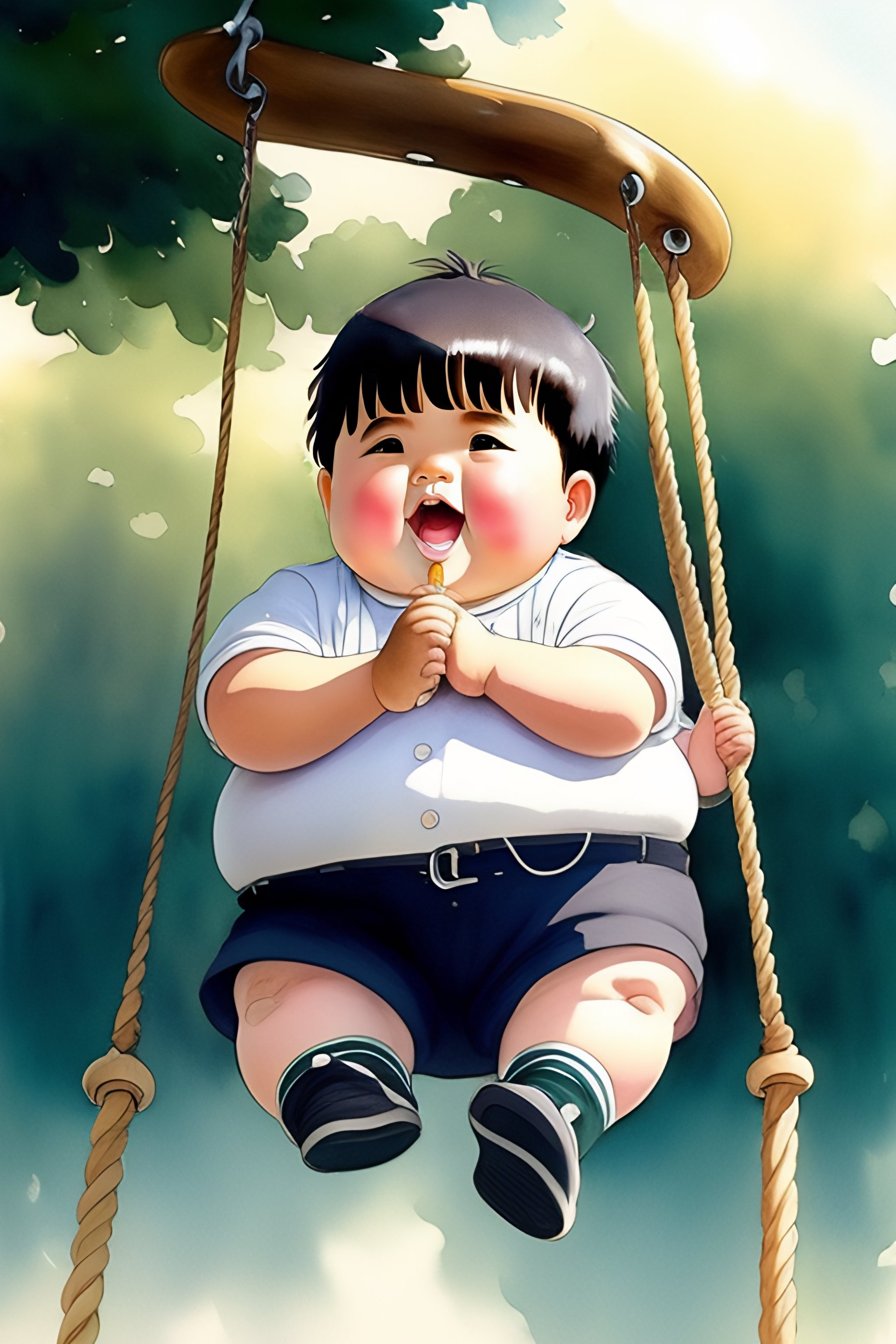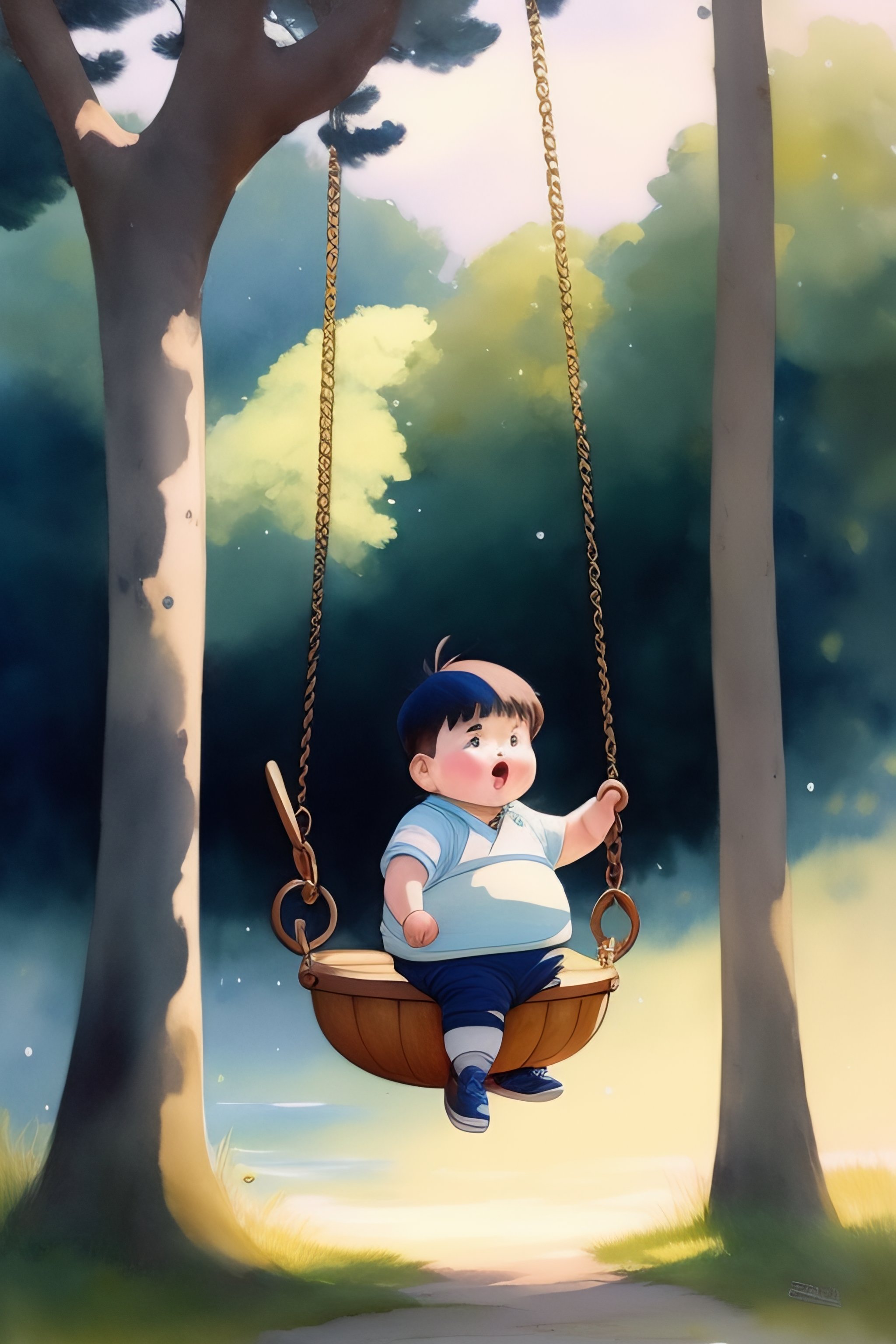 A hand drawn water color studio ghibli art of a chubby funny chubby cute jubilant boy with a bowl cut swing happily on a swing but a disaster is going on in the background, greg rutkowski, dramatic
