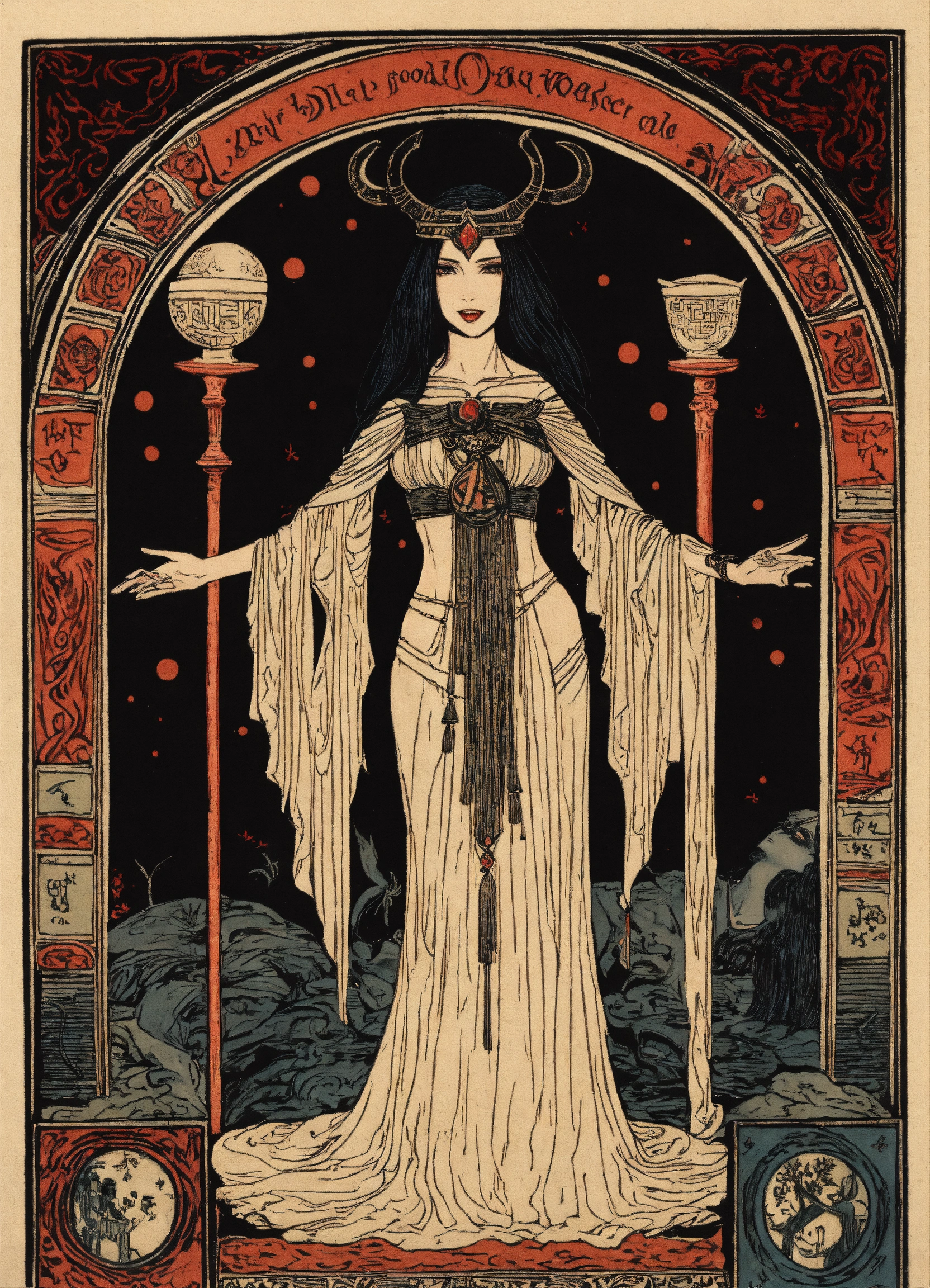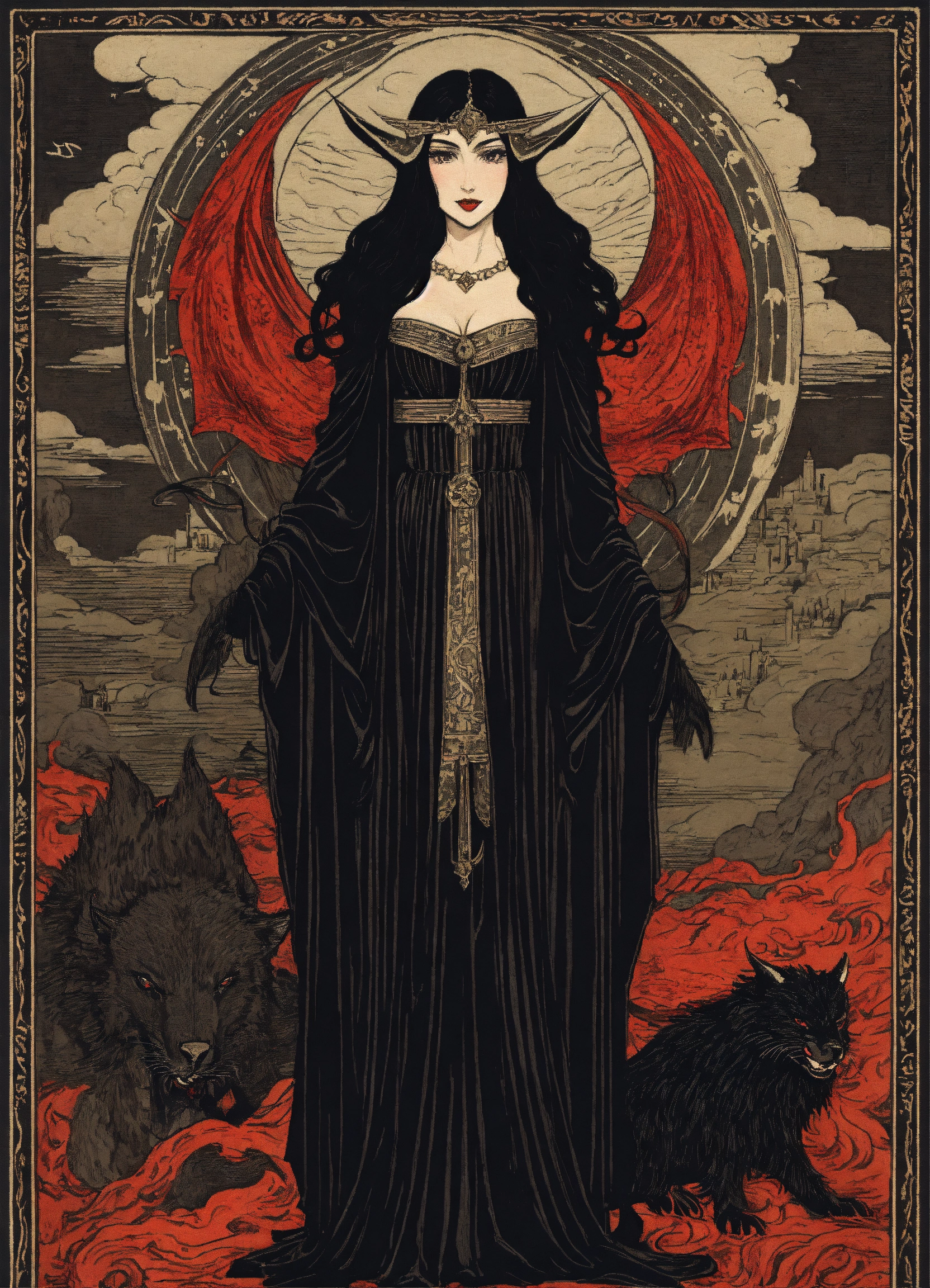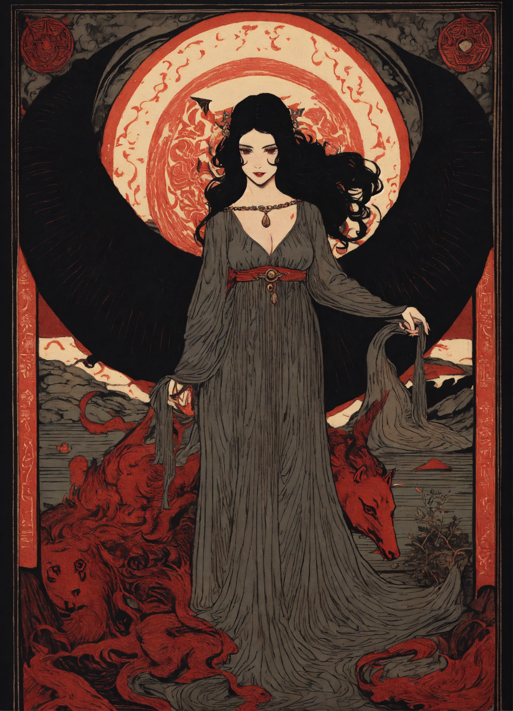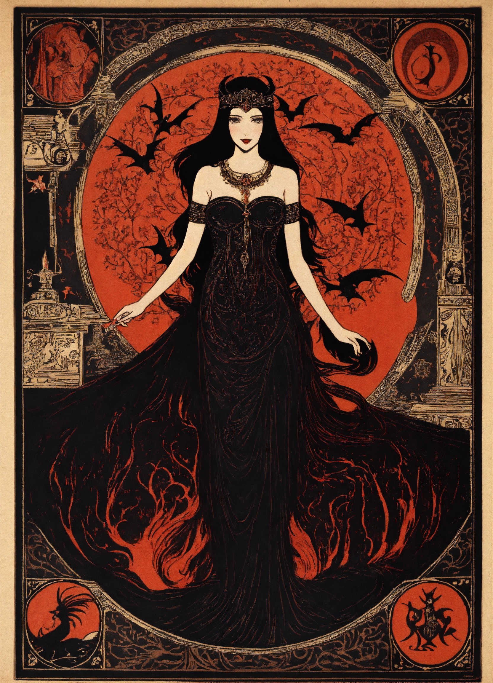 Woodblock print, medieval book illustration, godess lilith mother of monsters, female vampire, black straight black hair, evil, long black dress, ishtar, tarot card, dark eyes