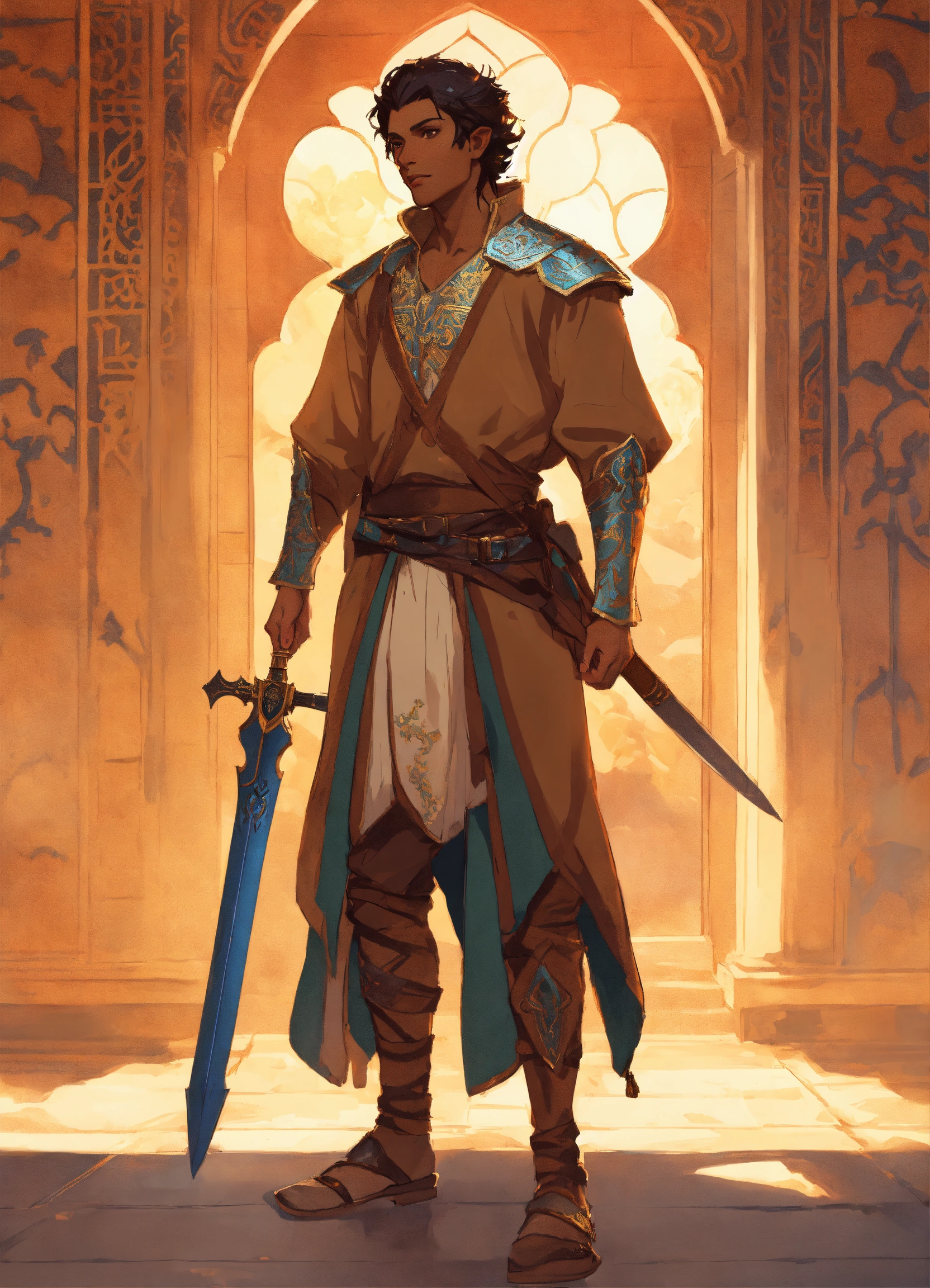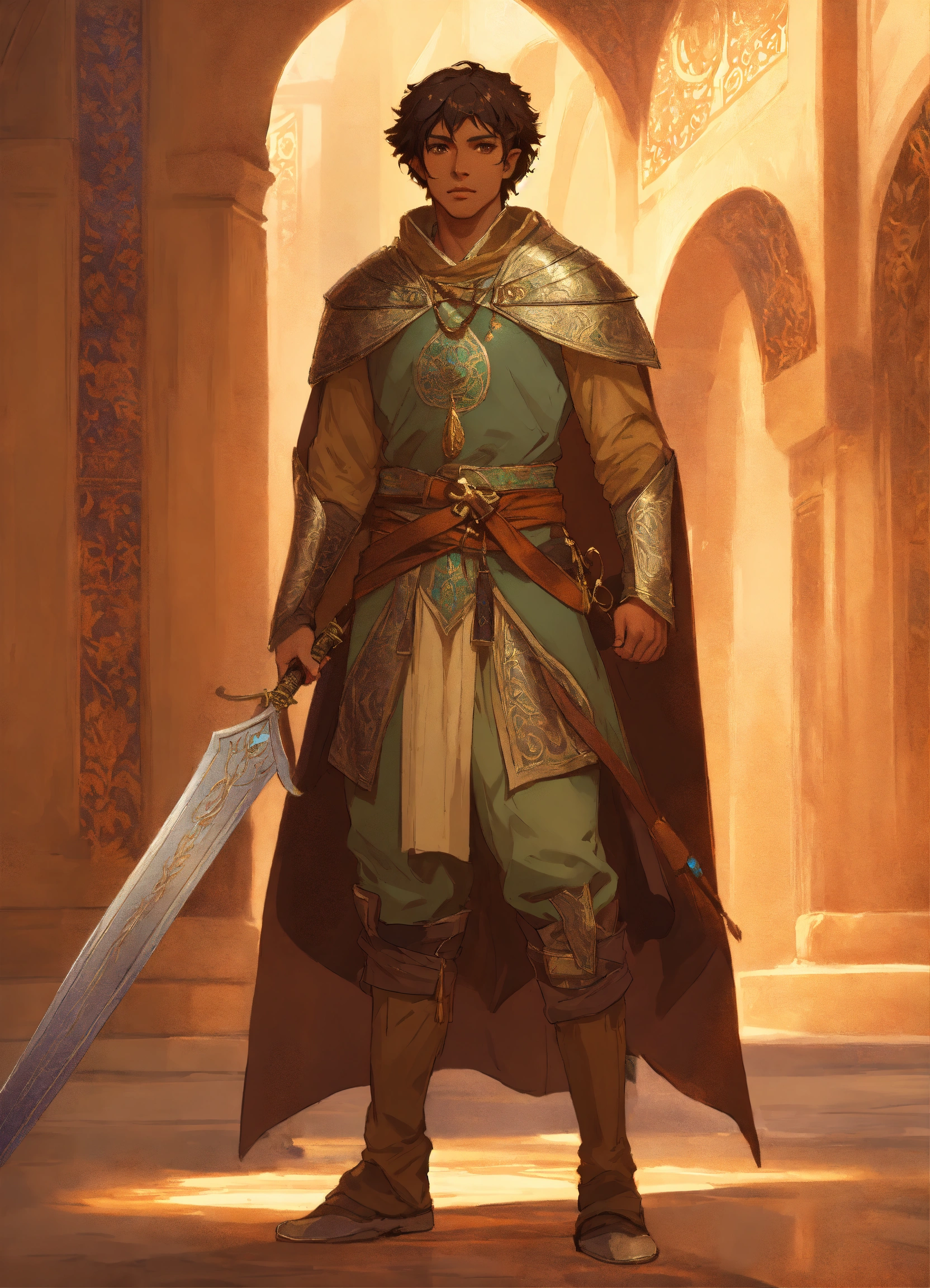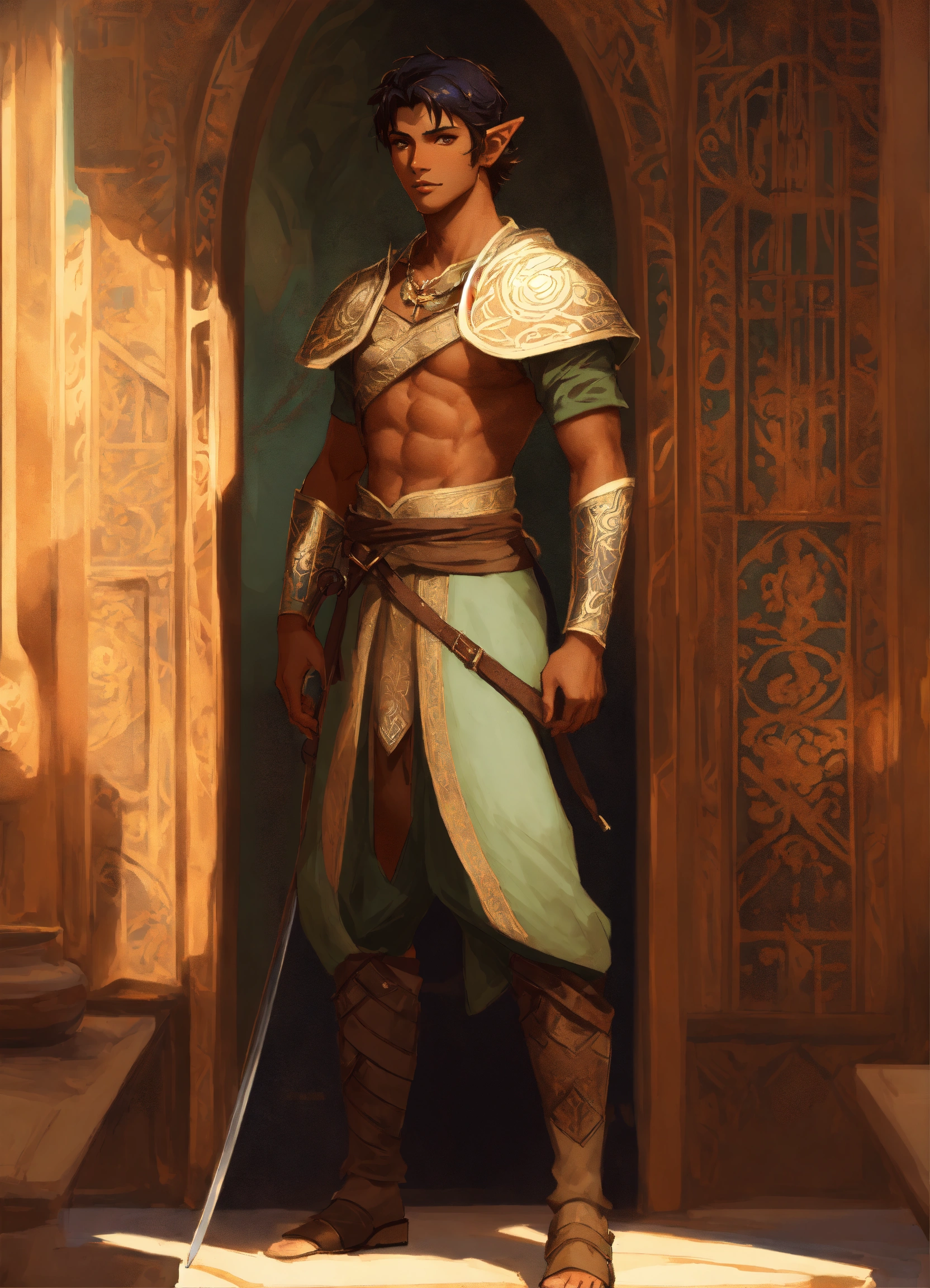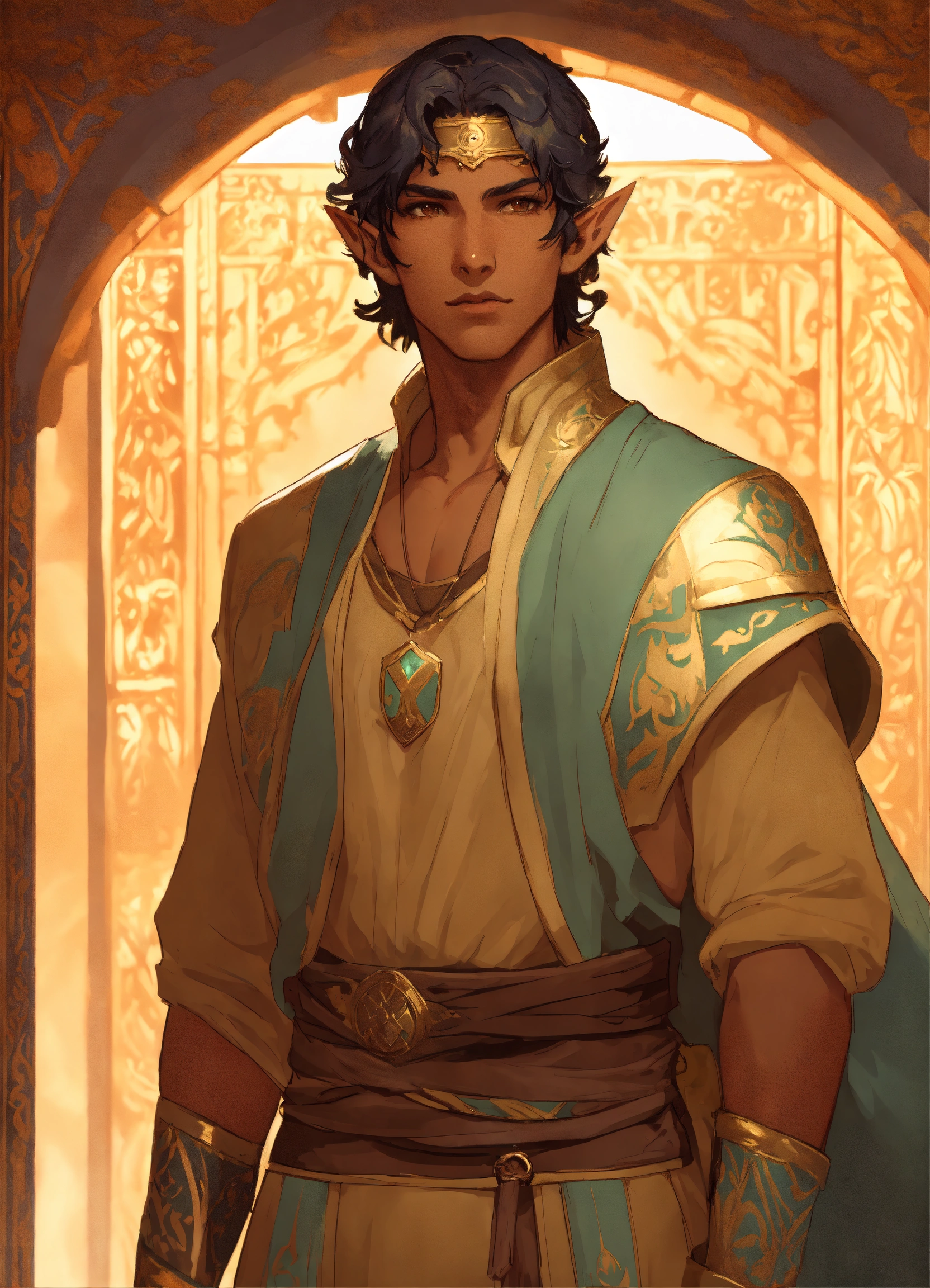 Elf male with dark tan skin based on timurid warrior, brown eyes, high cheekbones, toned, turkish, samarkand, greg rutkowski, makoto shinkai, alphonse mucha, stylized, full body