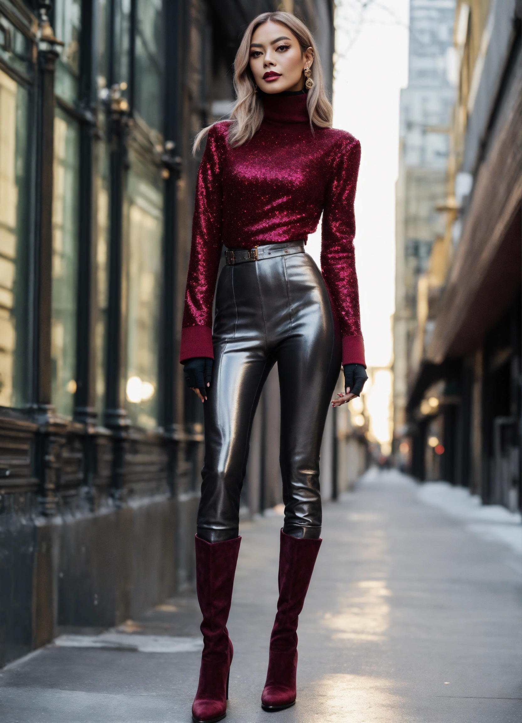 Jiu glamorous sparkly maroon and charcoal versace style full outfit with high boots
