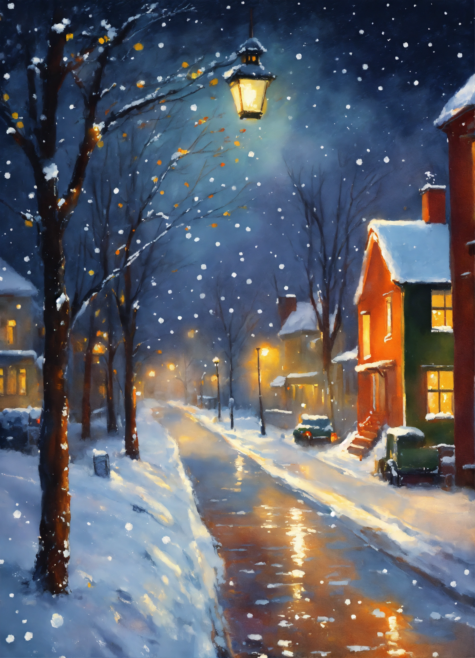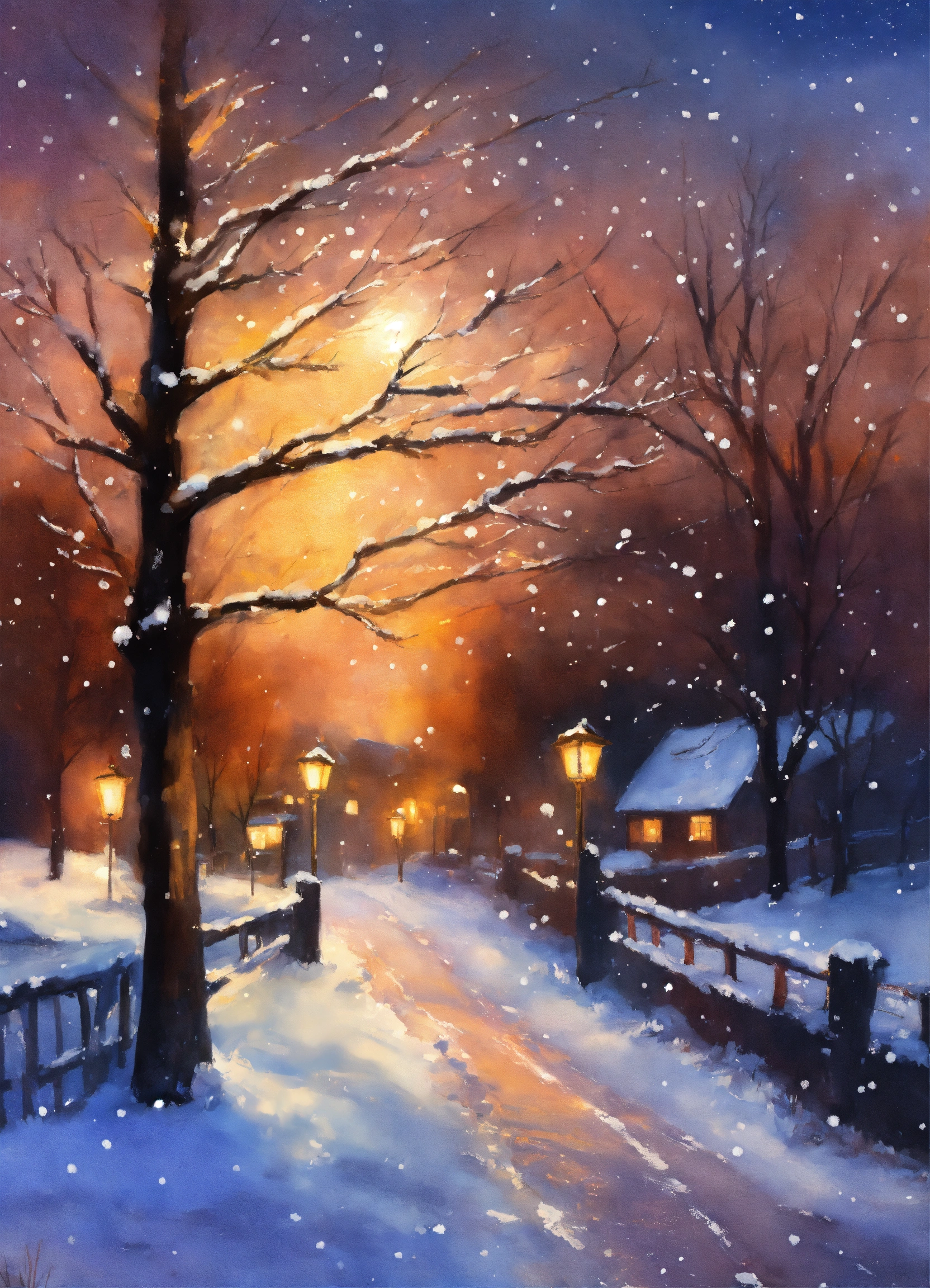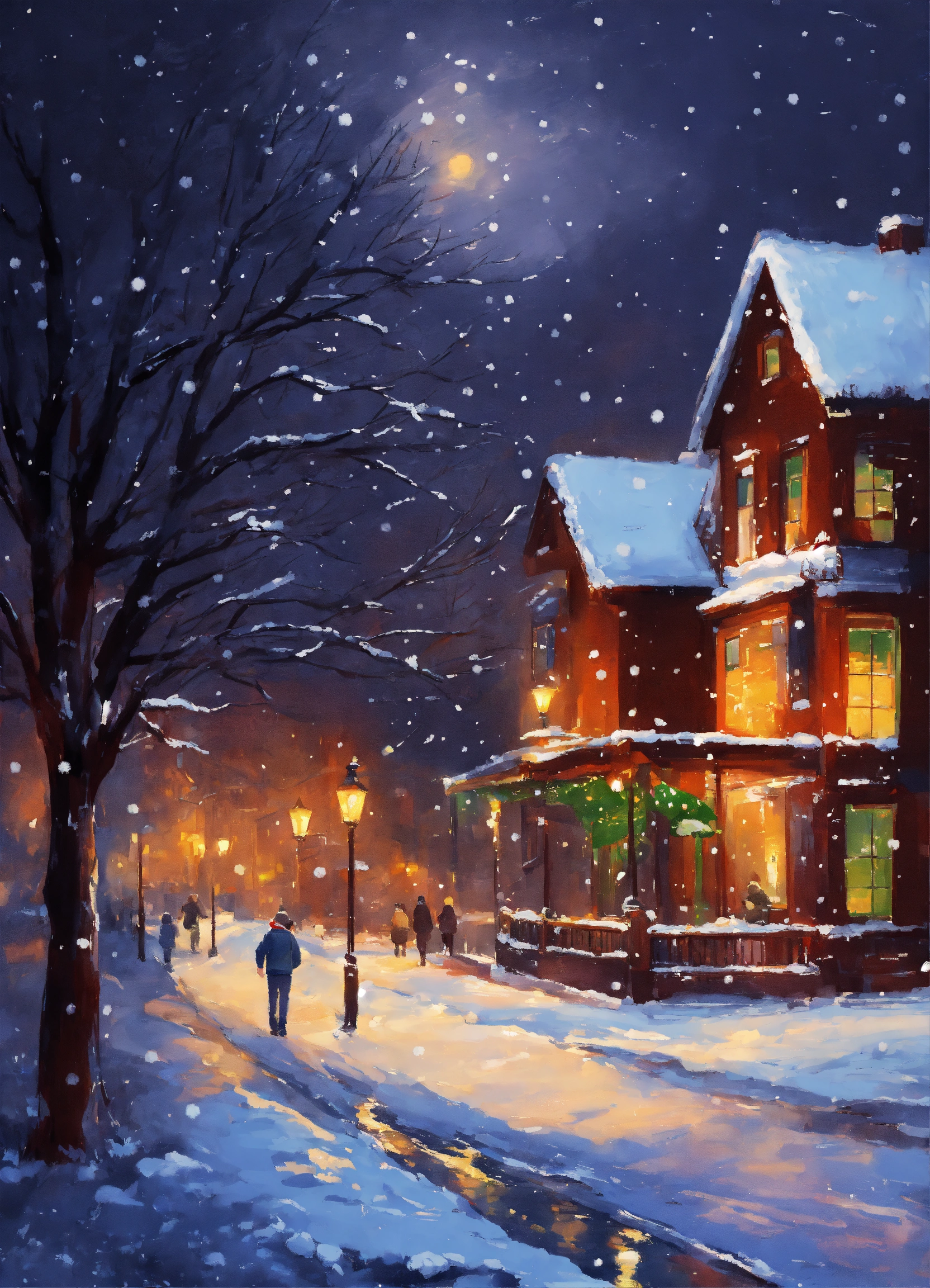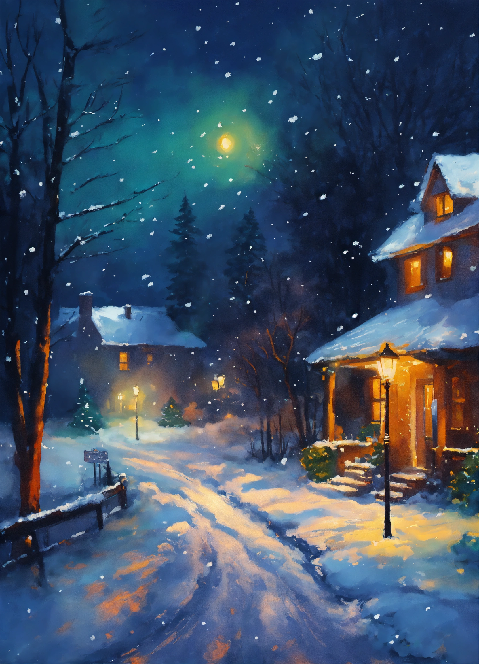 Tee shirt design snowy midnight scene in winter. impressionist style