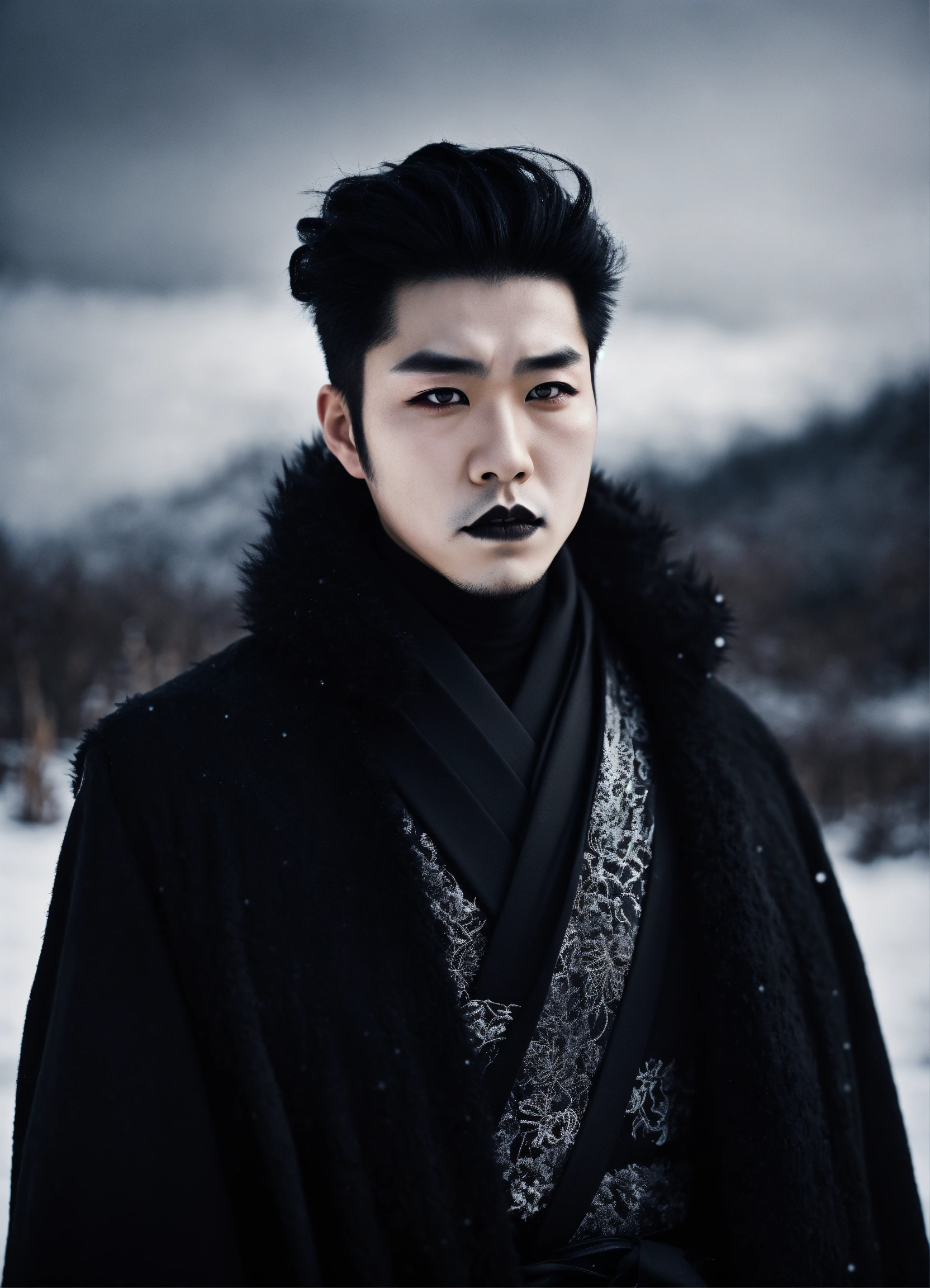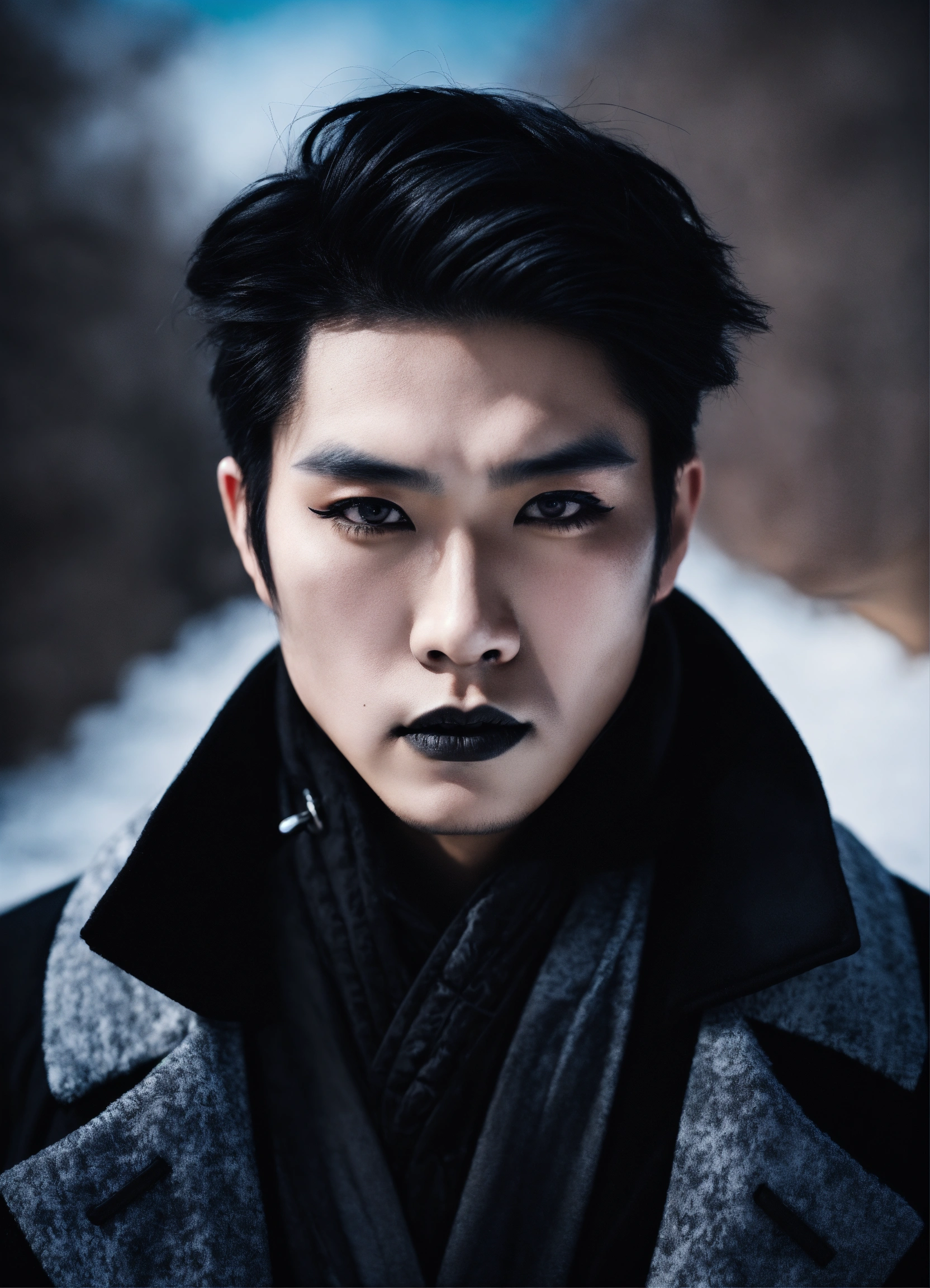 High contrast portrait of a japanese man, gothic beauty, white painted face, dark lips, dramatic black eyeliner, serious look, winter landscape